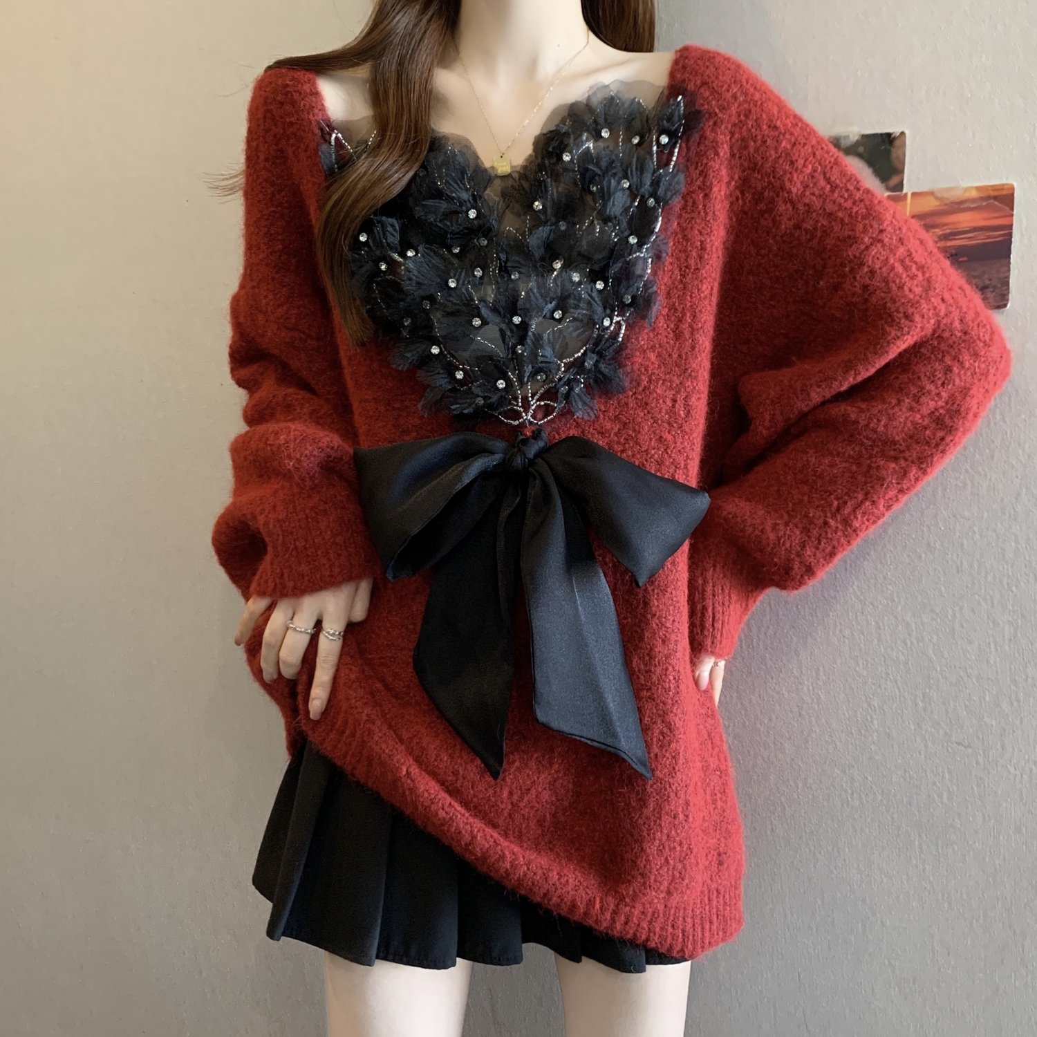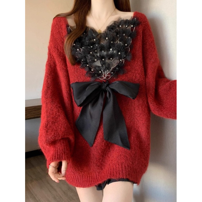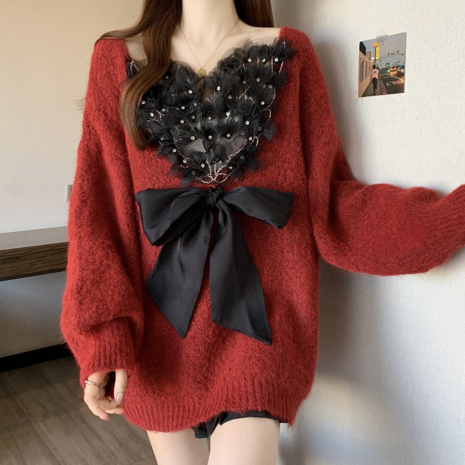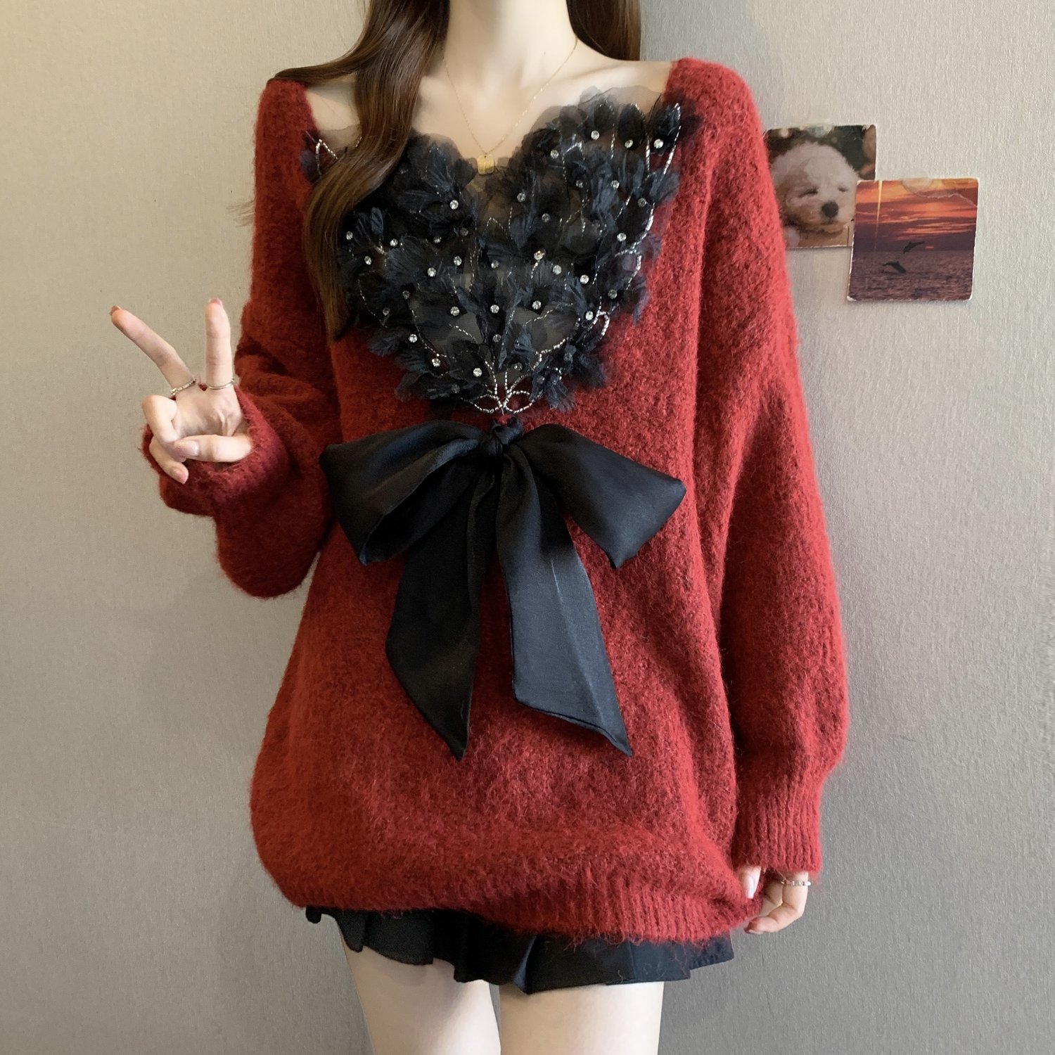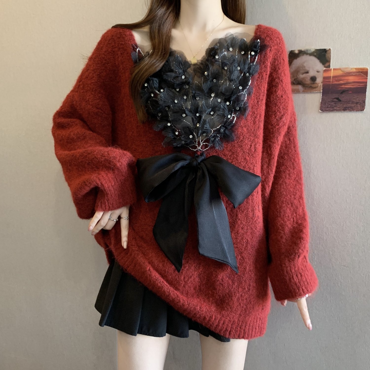酒紅色洋氣V領正肩毛衣女2025冬新款大碼胖mm立體花朵蝴蝶結上衣