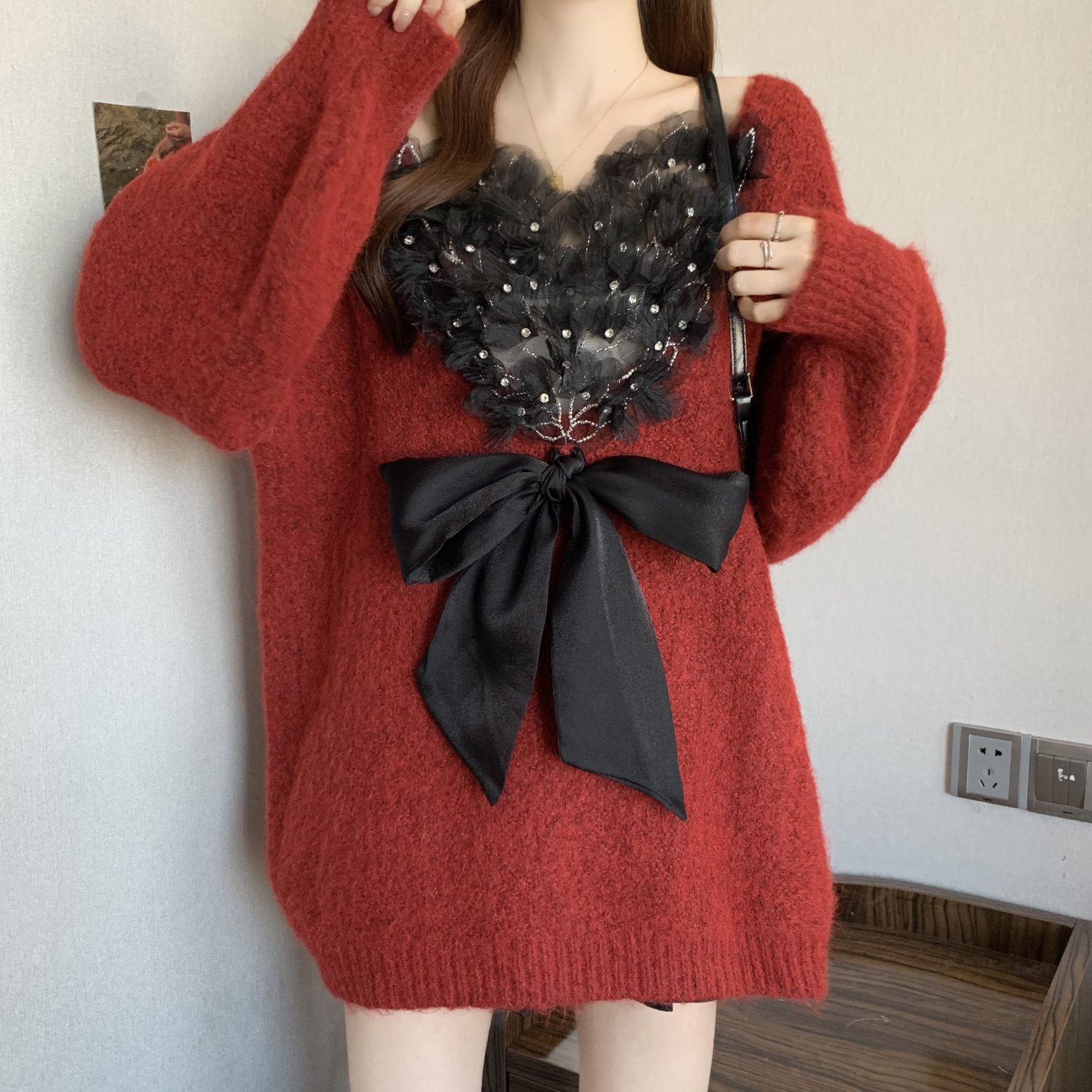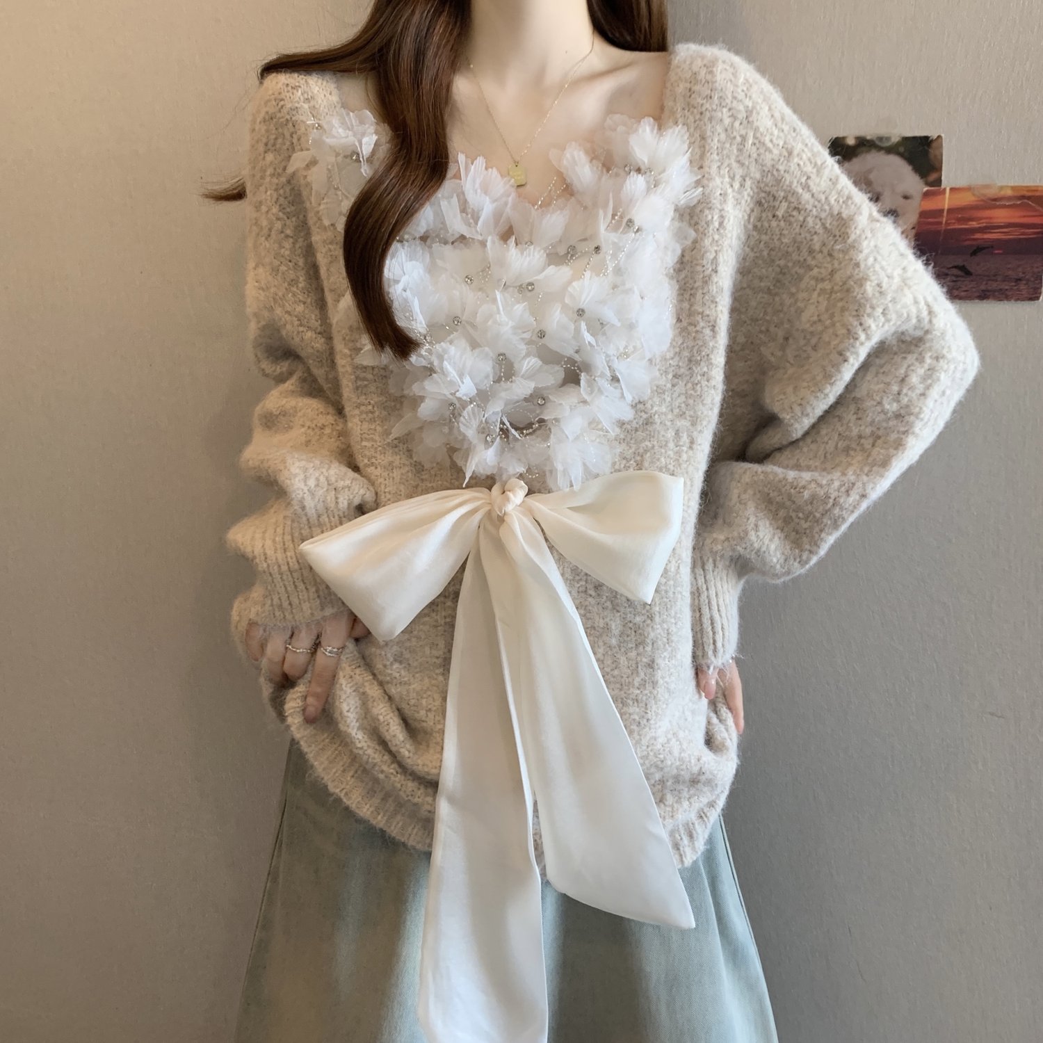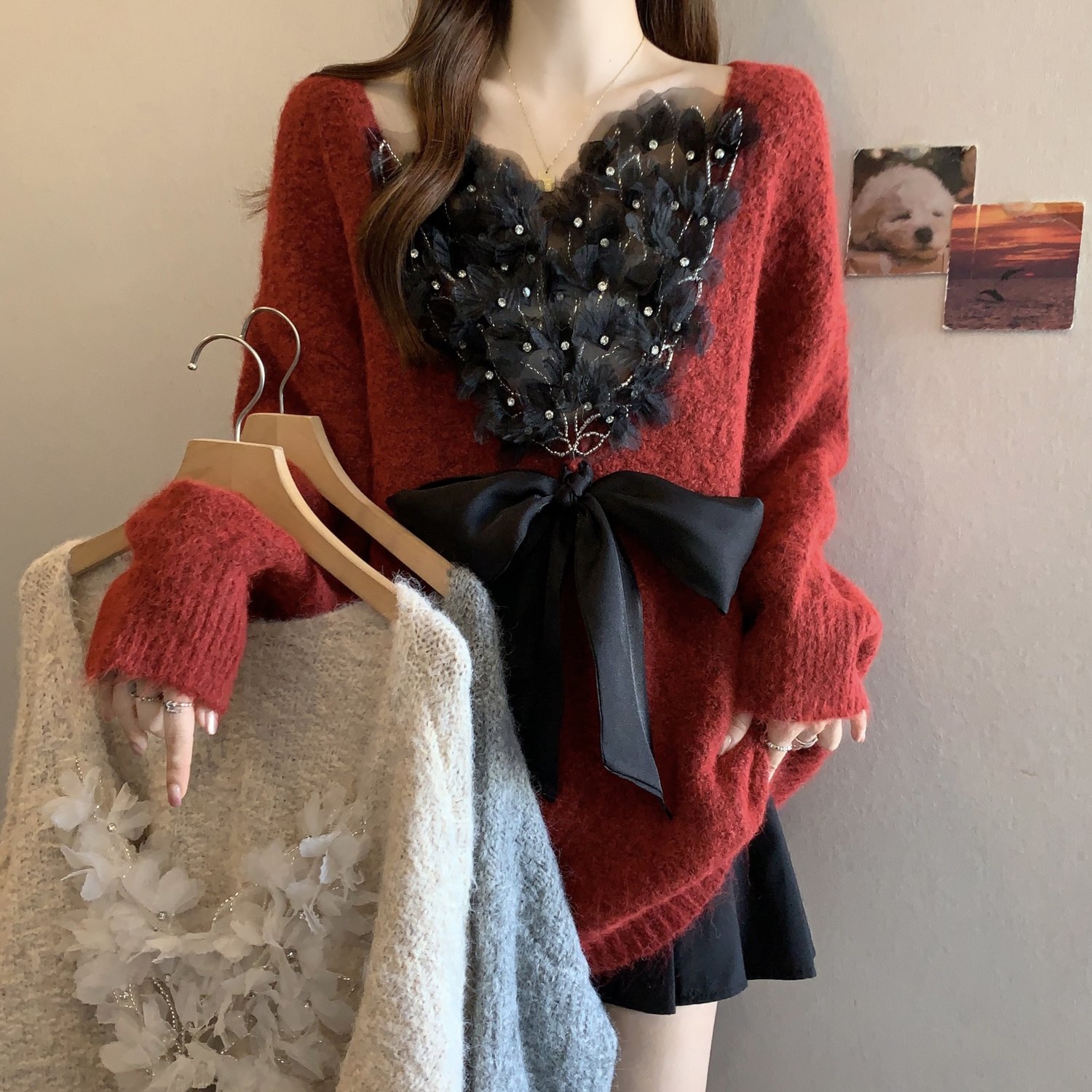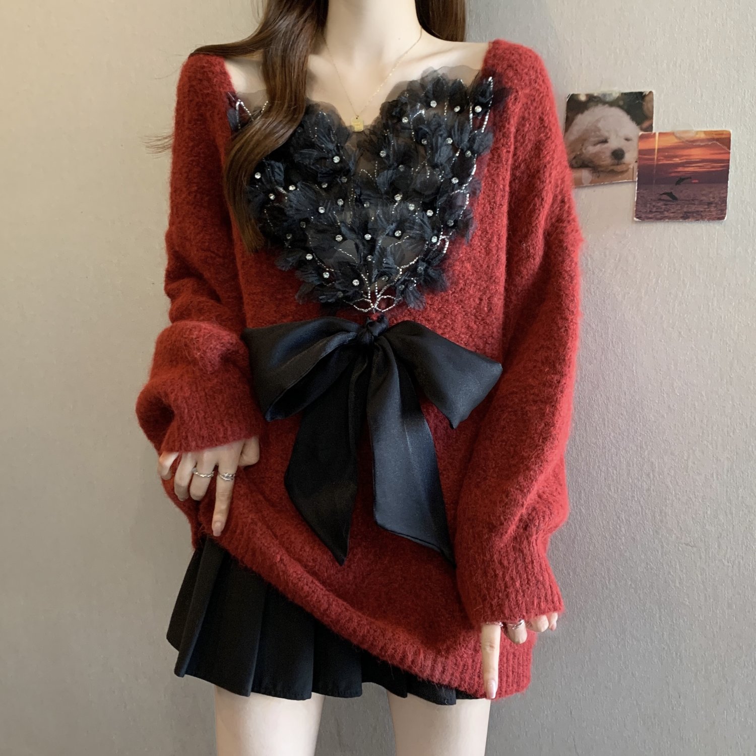 酒紅色洋氣V領正肩毛衣女2025冬新款大碼胖mm立體花朵蝴蝶結上衣