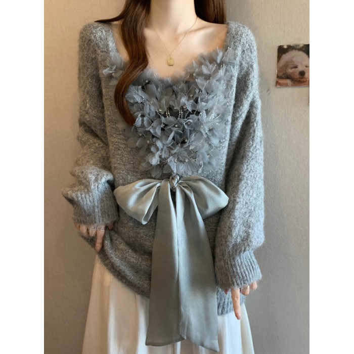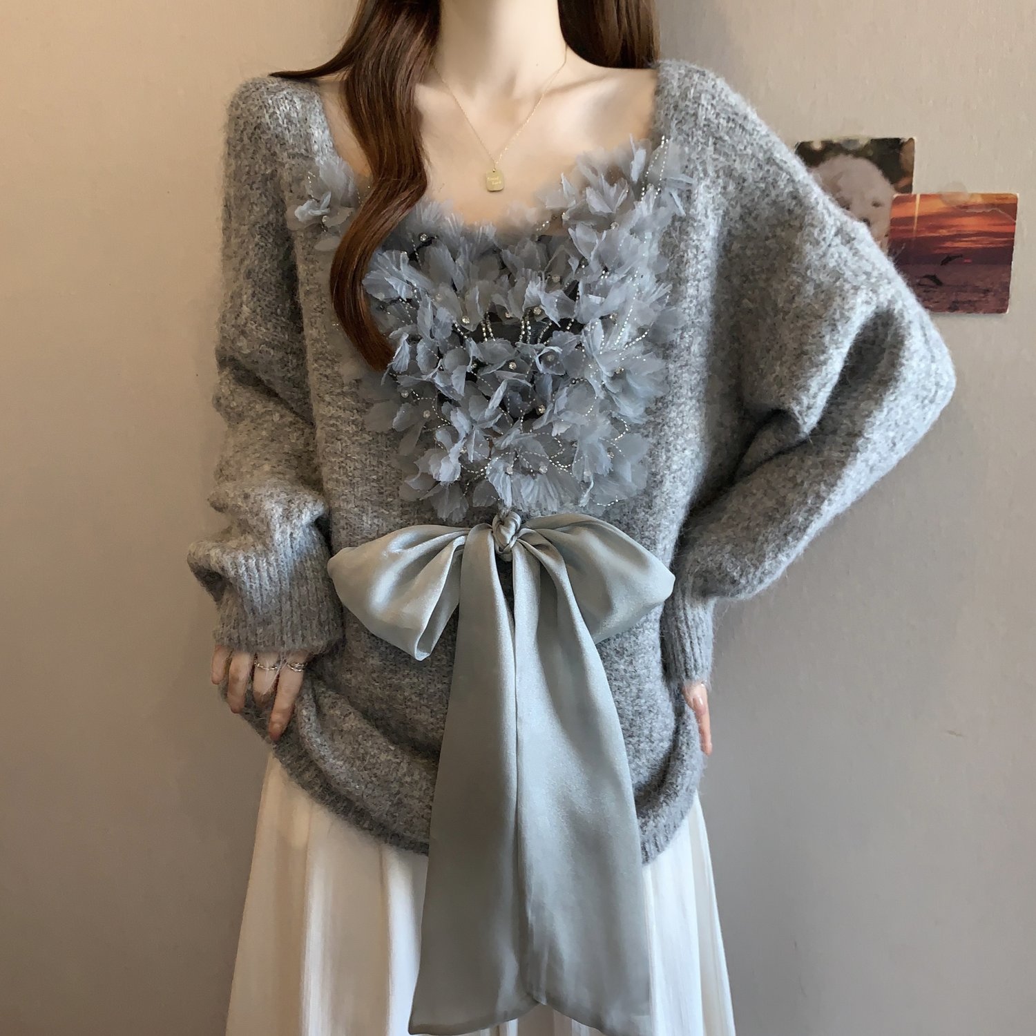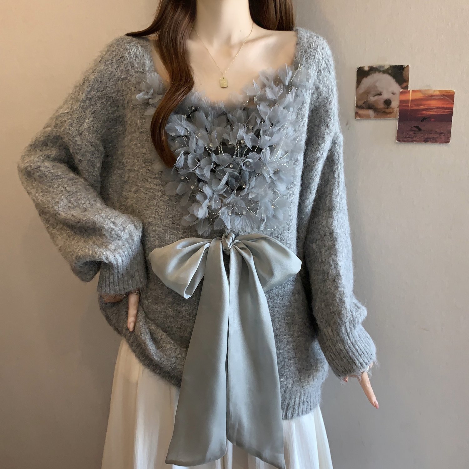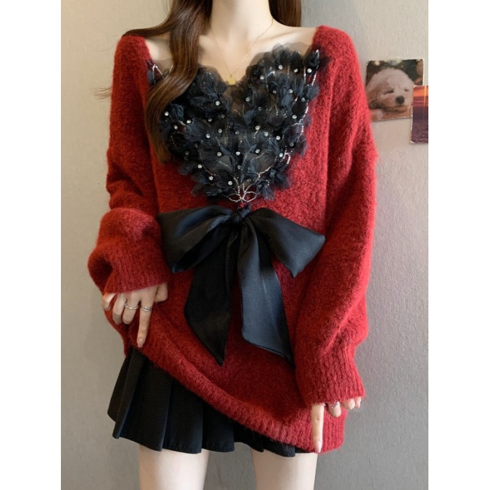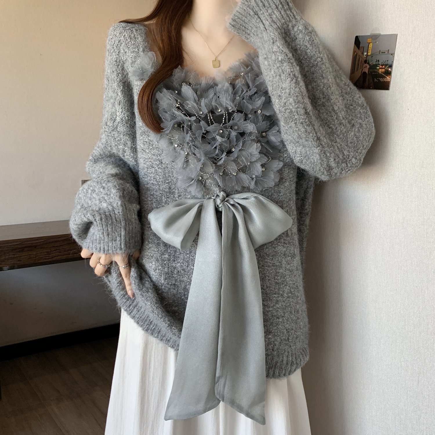 酒紅色洋氣V領正肩毛衣女2025冬新款大碼胖mm立體花朵蝴蝶結上衣