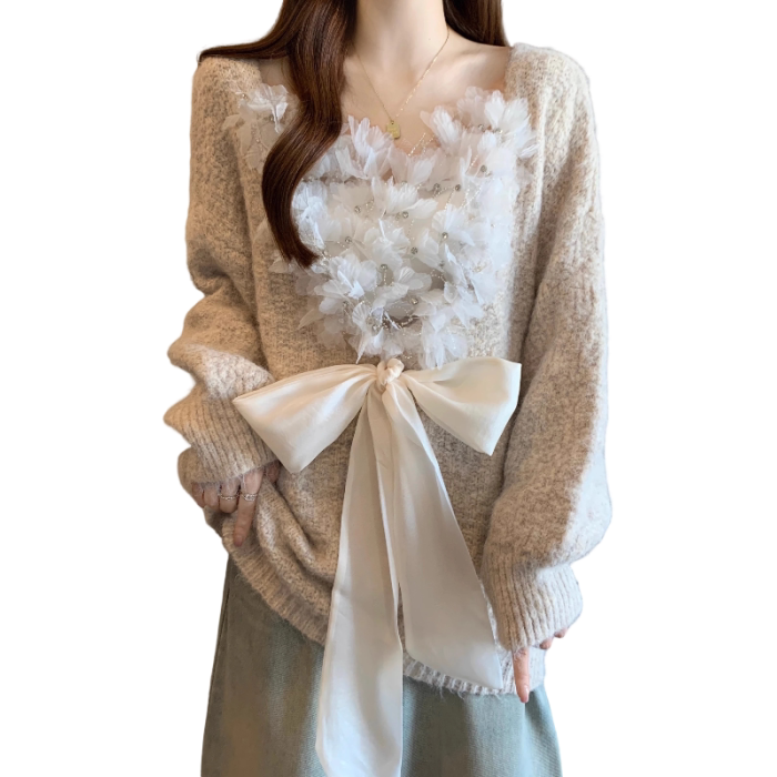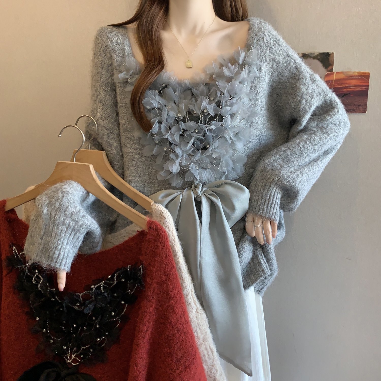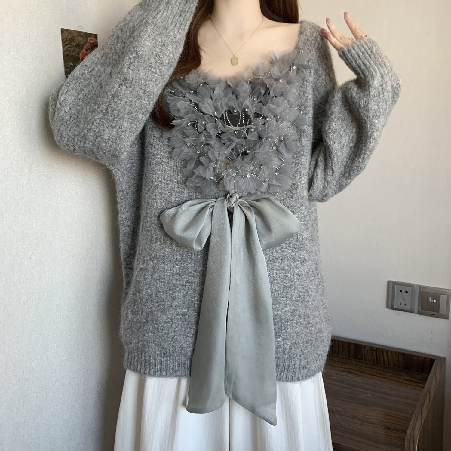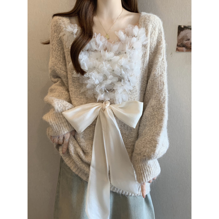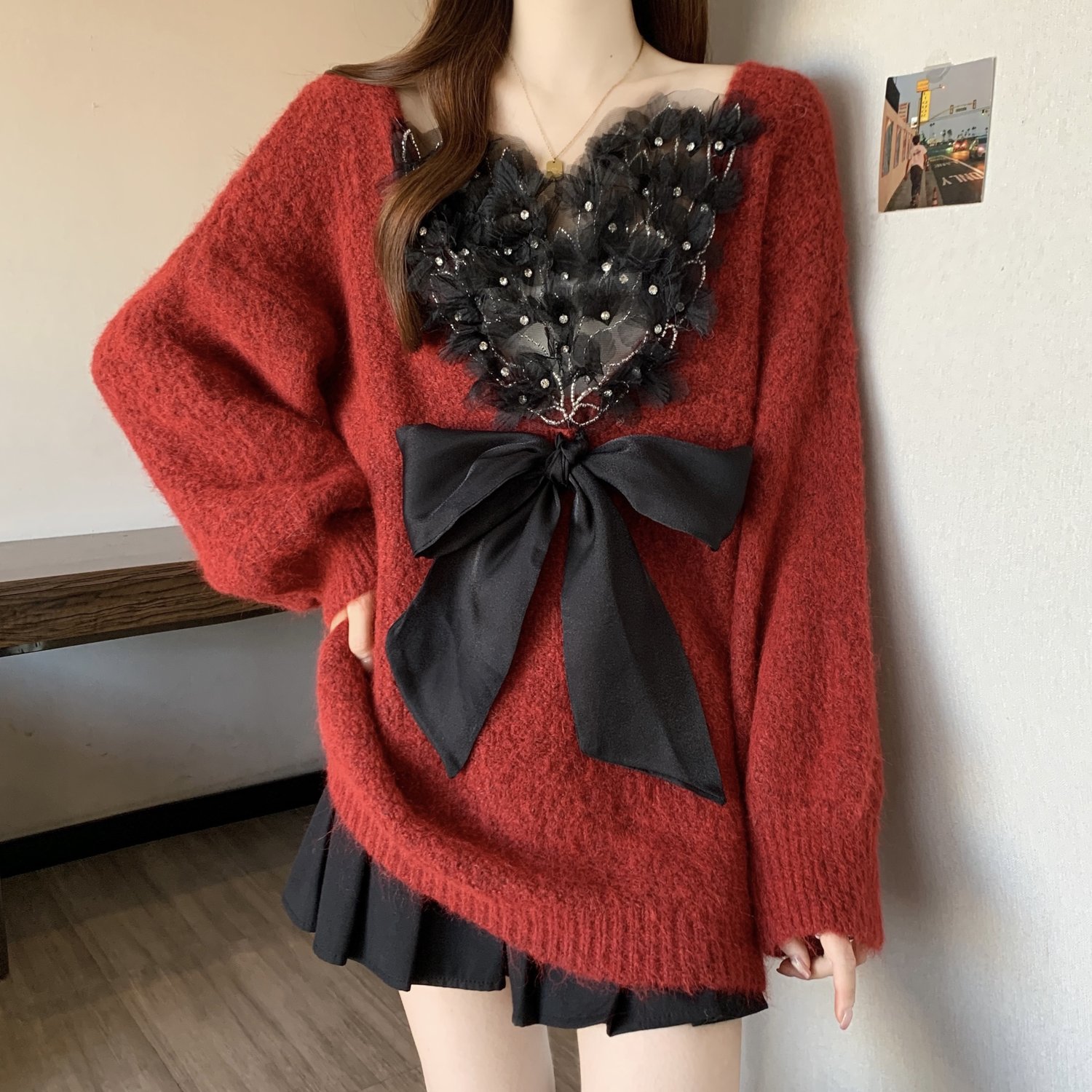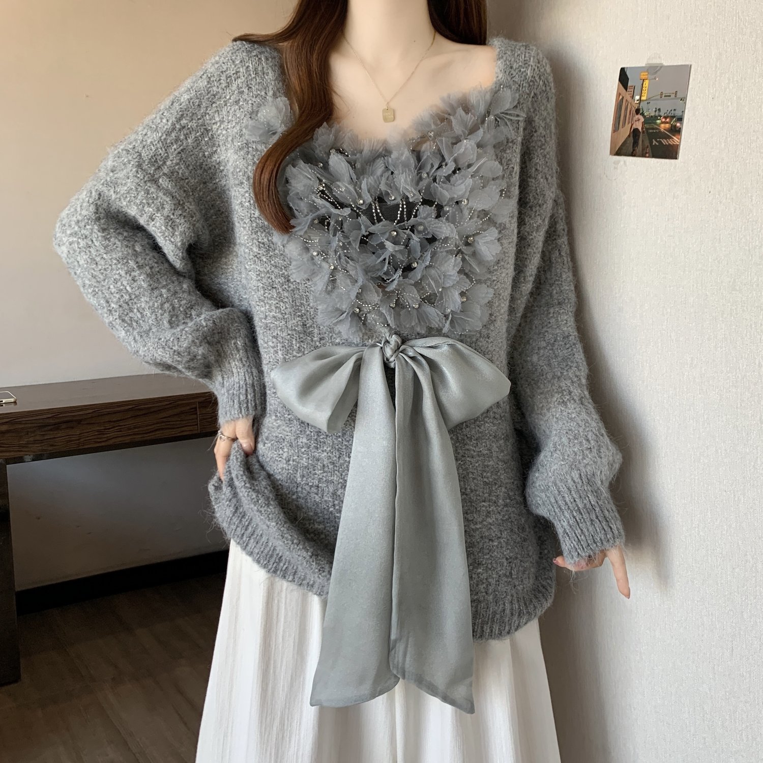 酒紅色洋氣V領正肩毛衣女2025冬新款大碼胖mm立體花朵蝴蝶結上衣