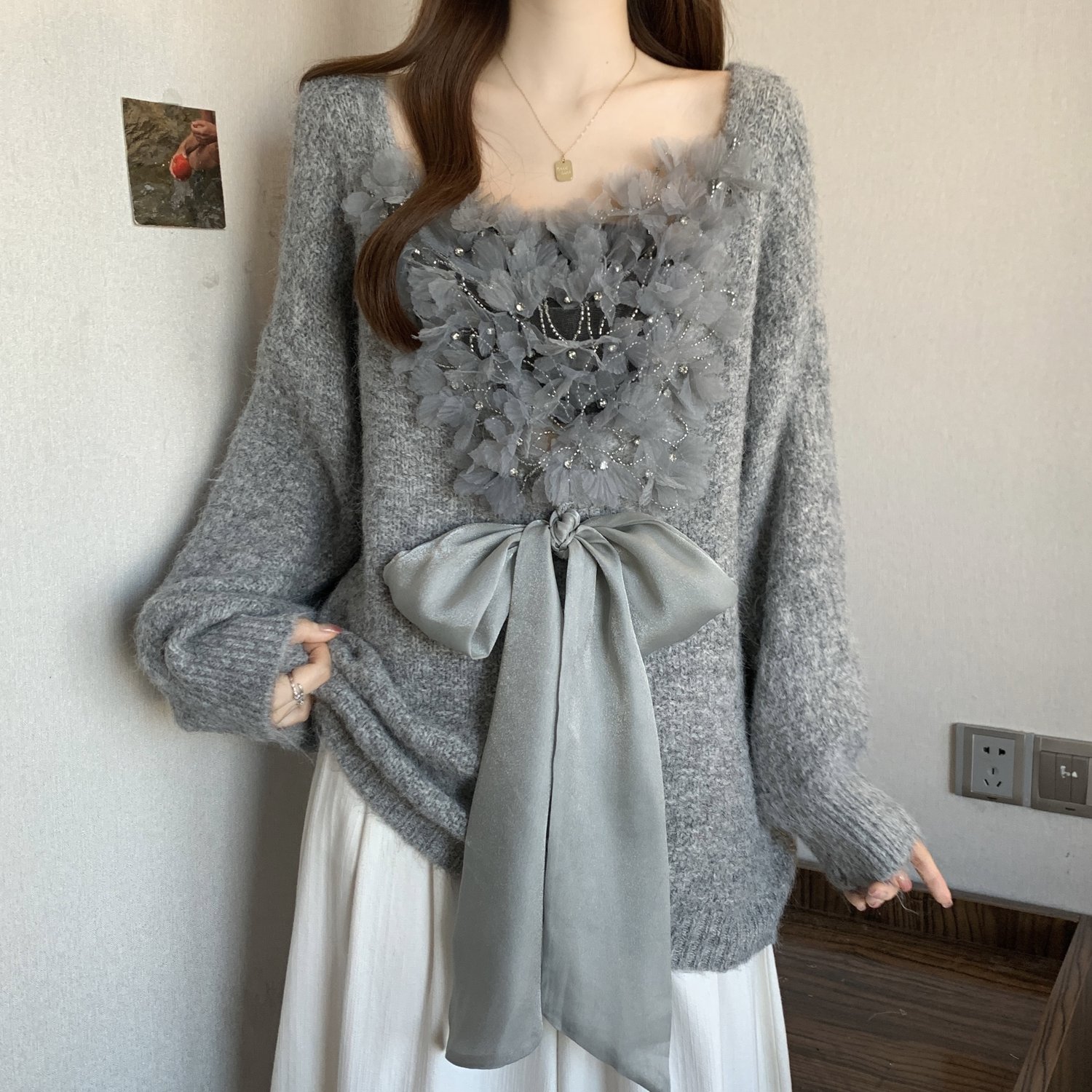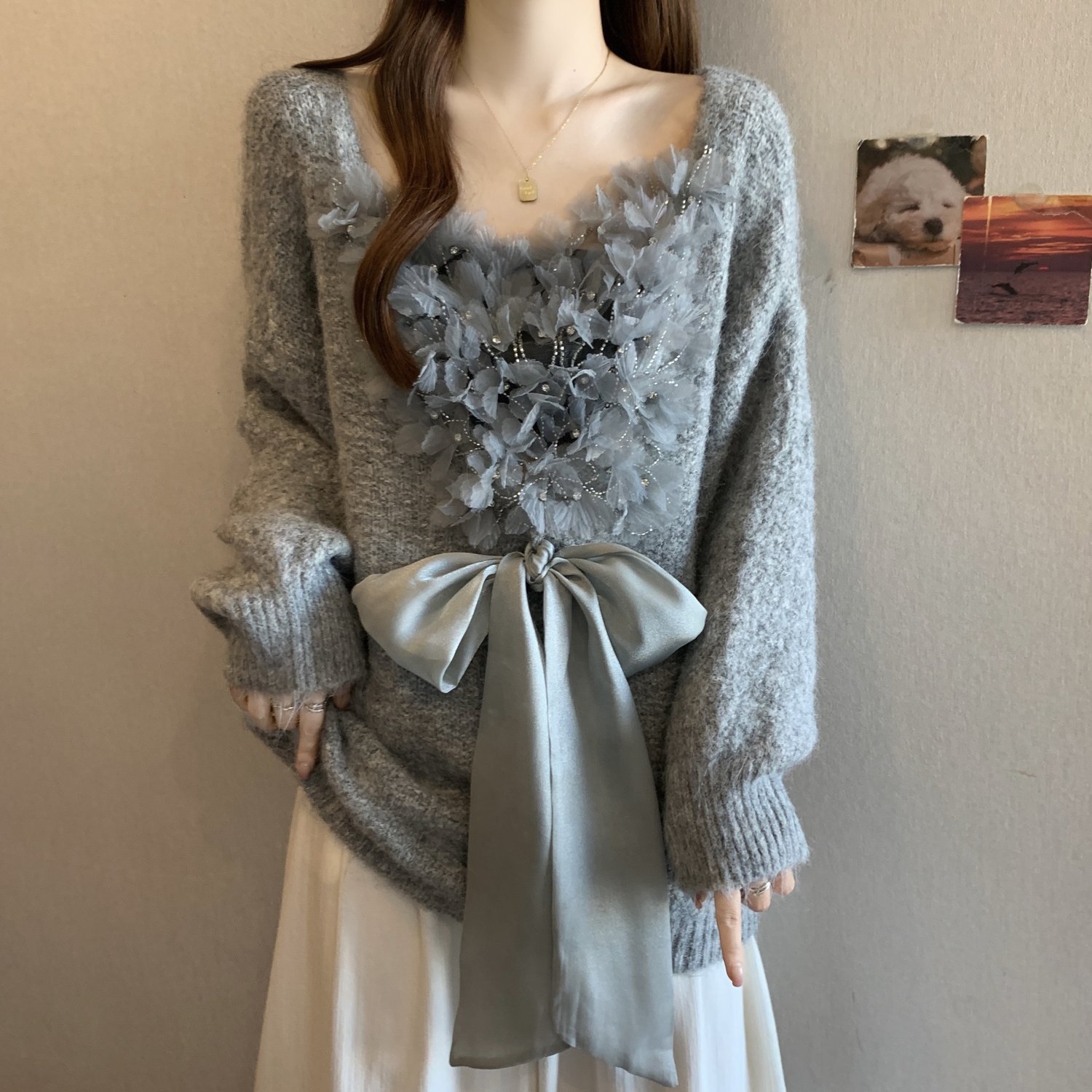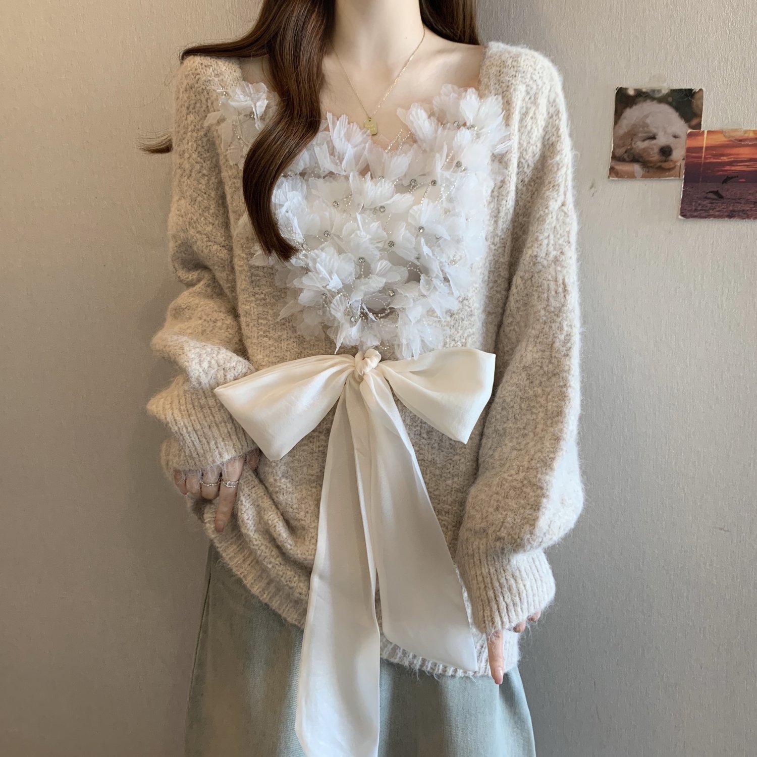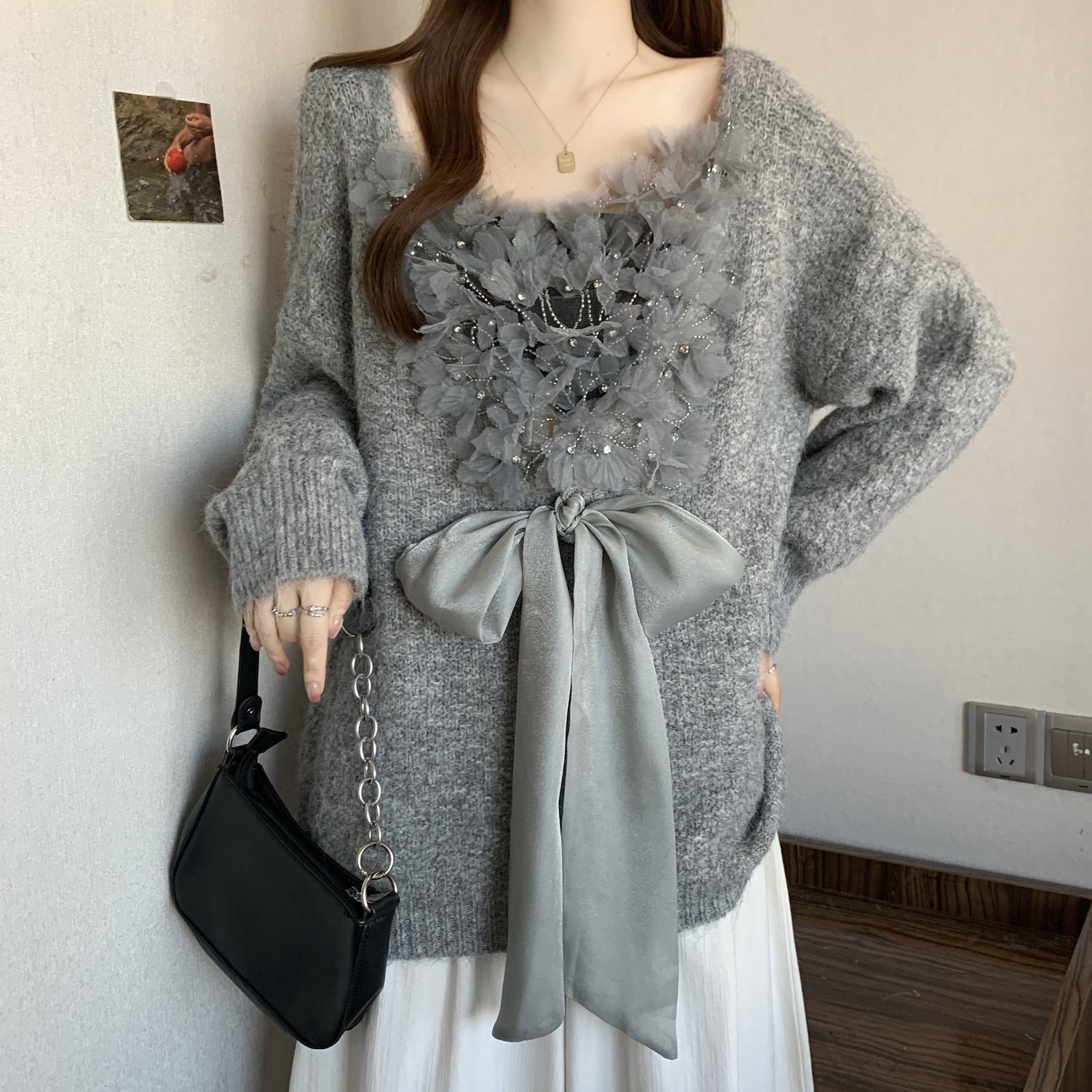 酒紅色洋氣V領正肩毛衣女2025冬新款大碼胖mm立體花朵蝴蝶結上衣
