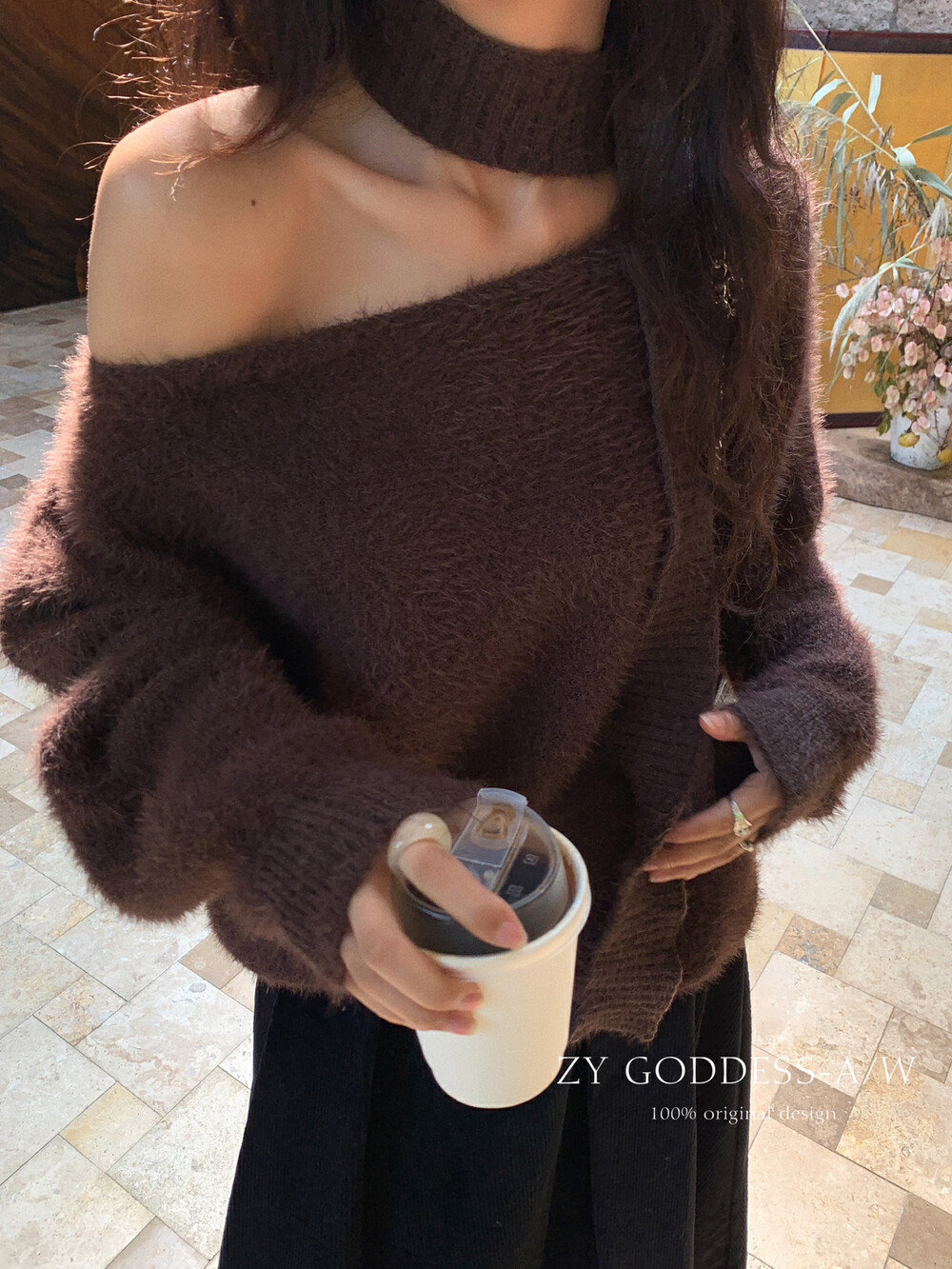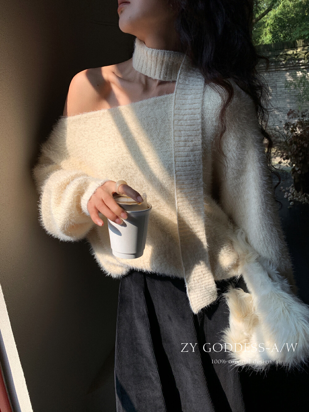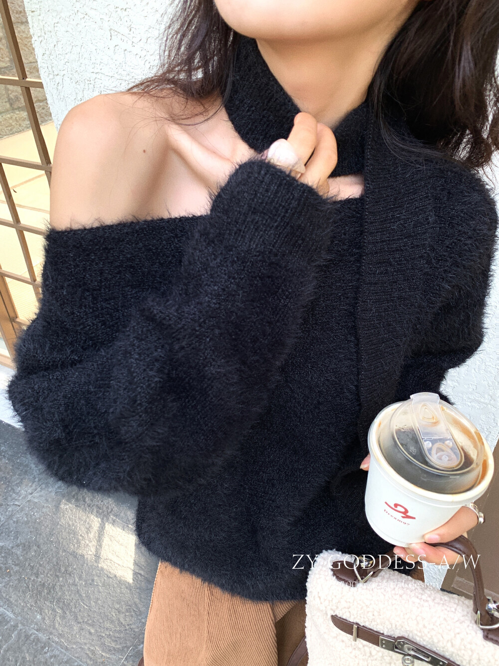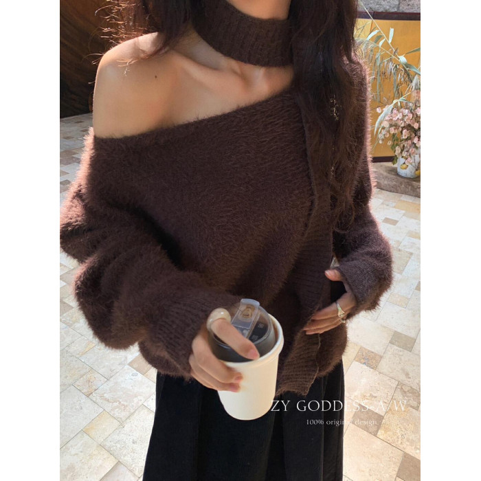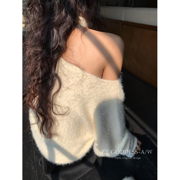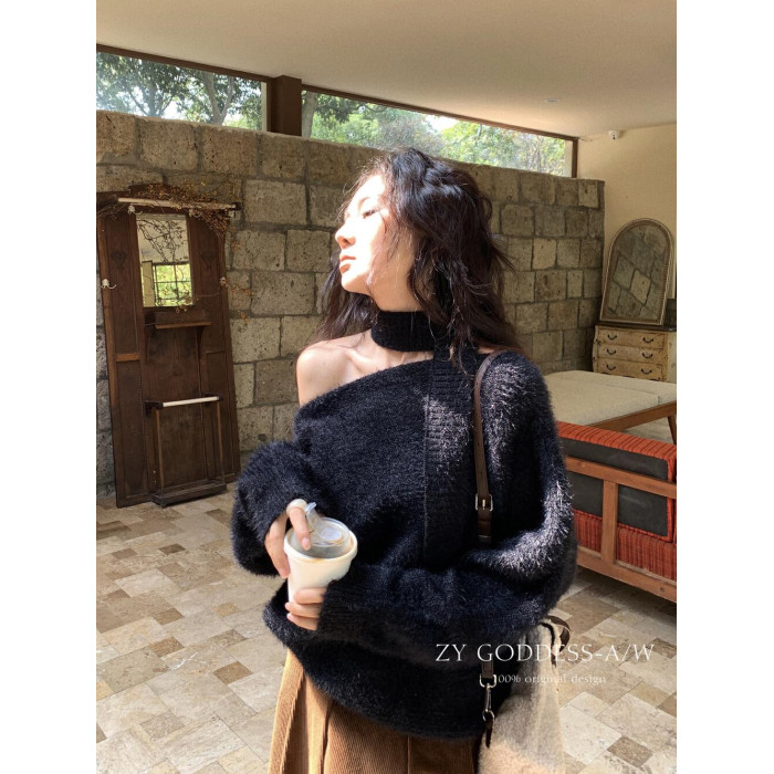 2024秋冬新款韓版設計感懶惰風斜肩毛茸茸毛衣純欲寬松飄帶針織衫