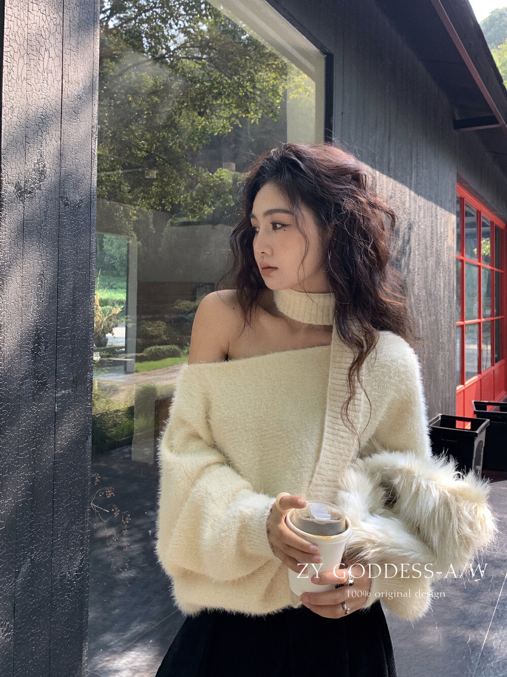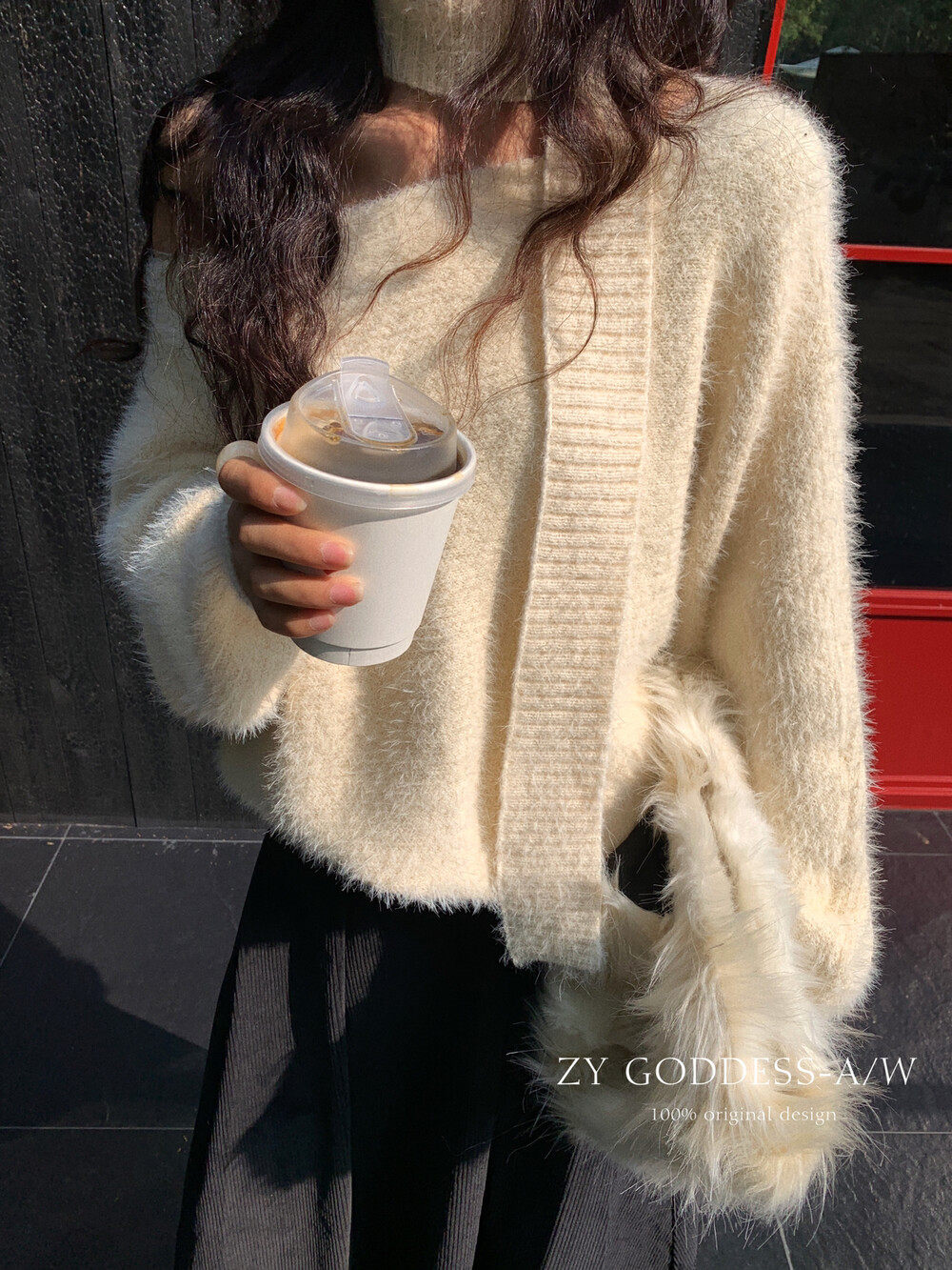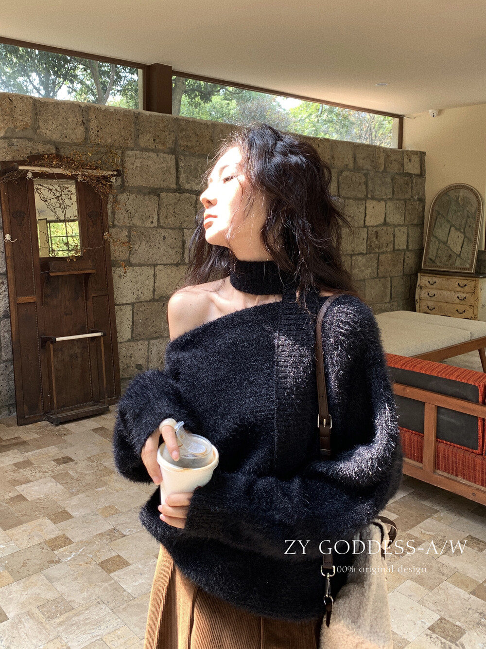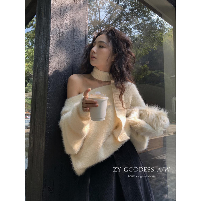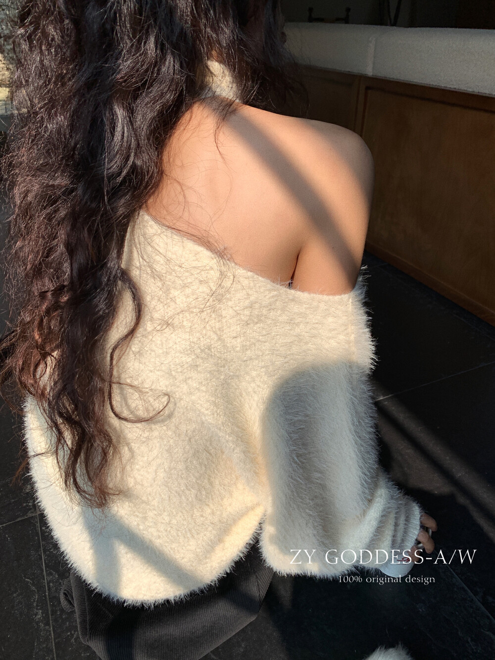 2024秋冬新款韓版設計感懶惰風斜肩毛茸茸毛衣純欲寬松飄帶針織衫