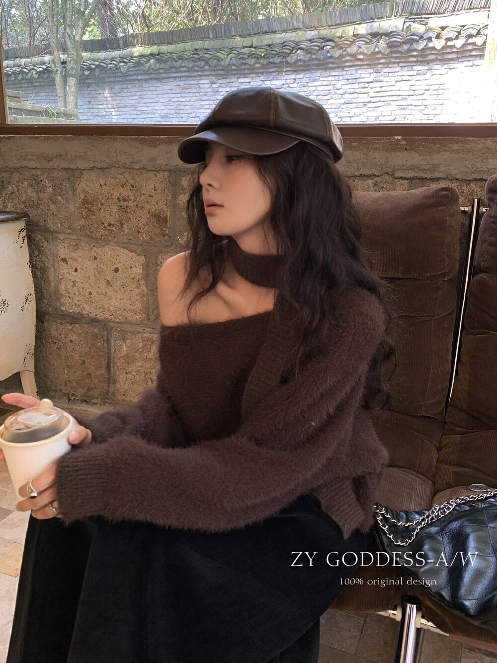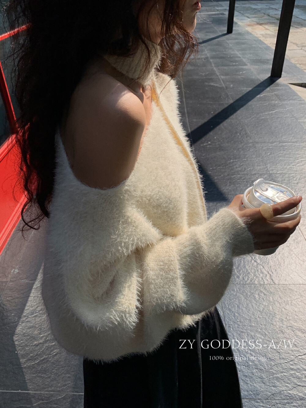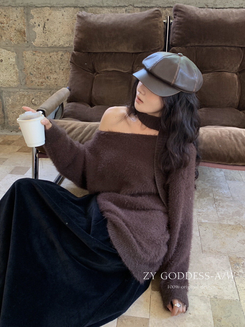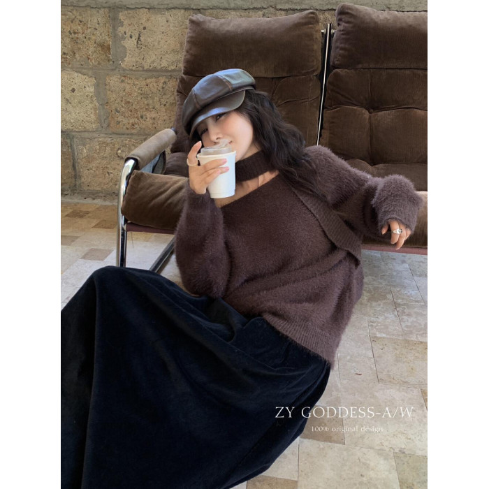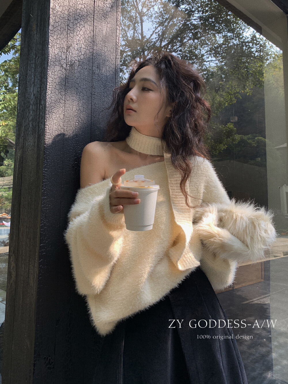 2024秋冬新款韓版設計感懶惰風斜肩毛茸茸毛衣純欲寬松飄帶針織衫