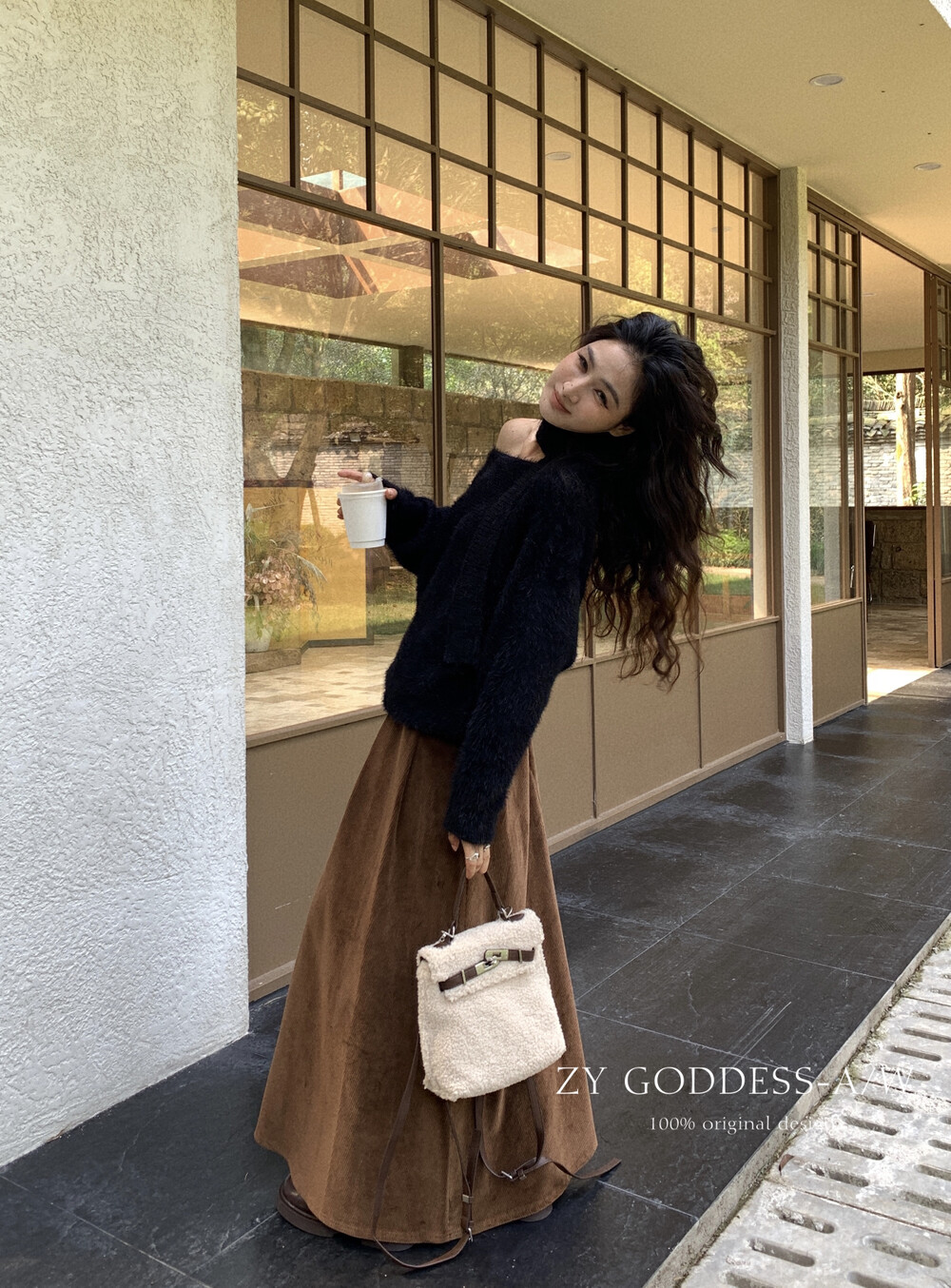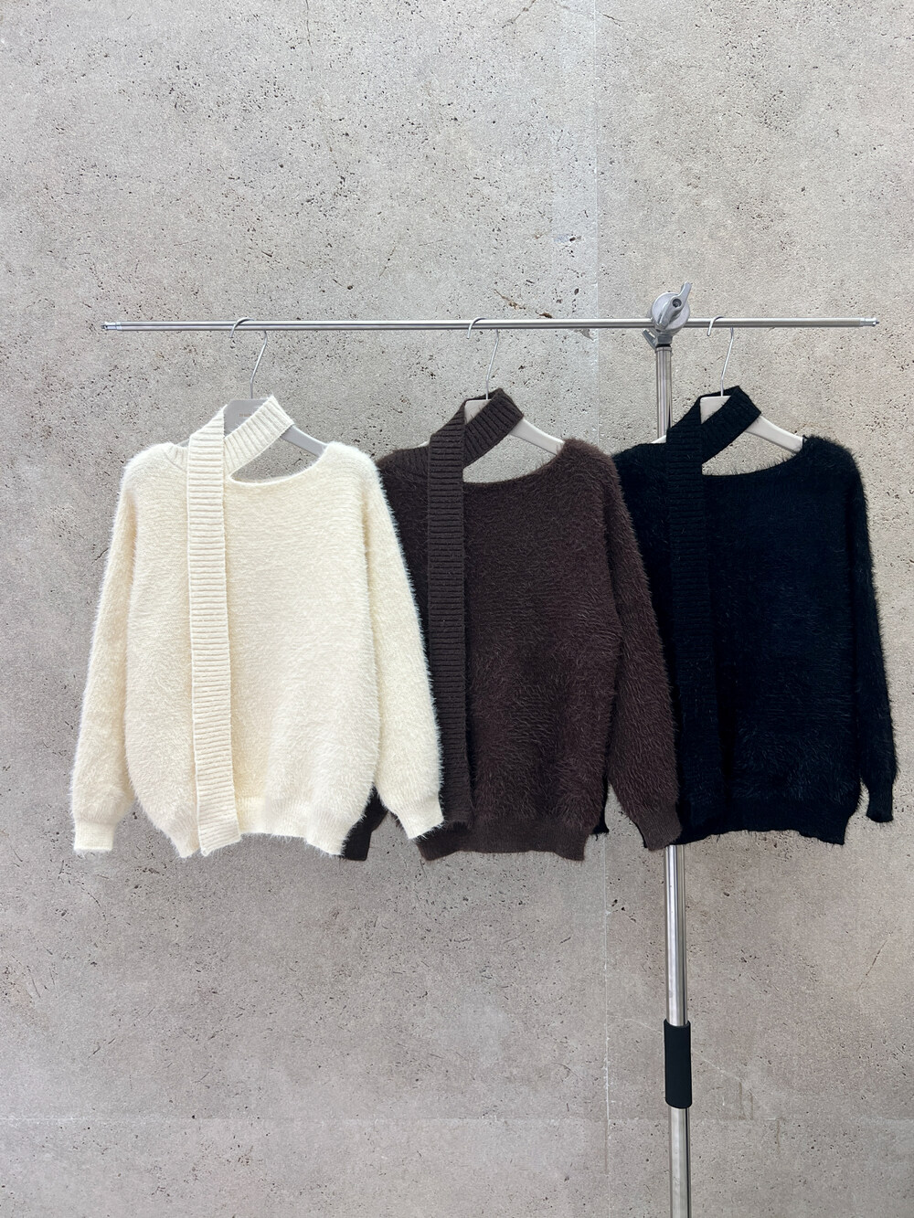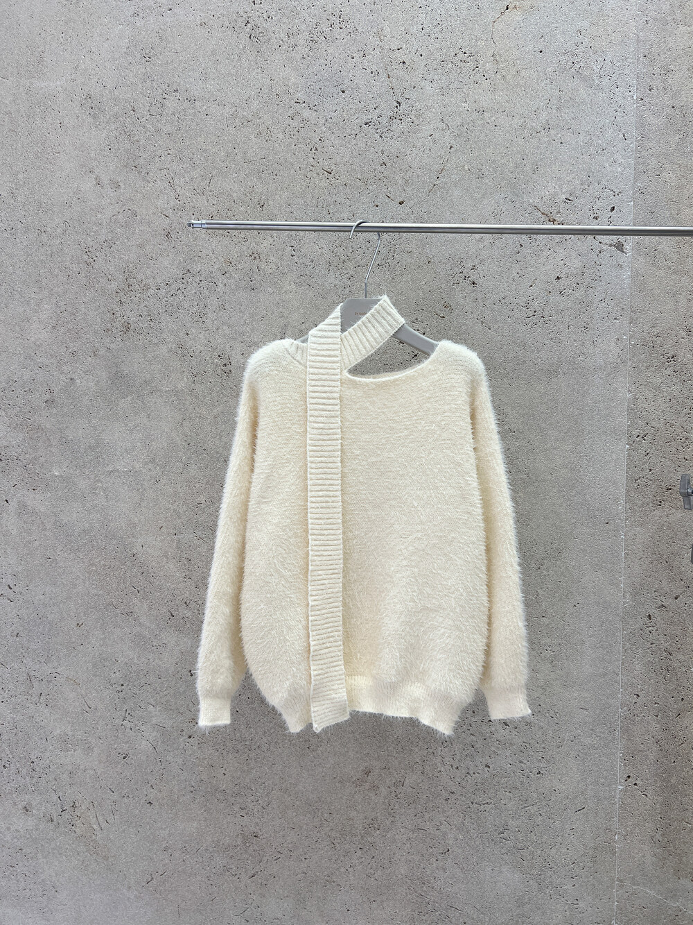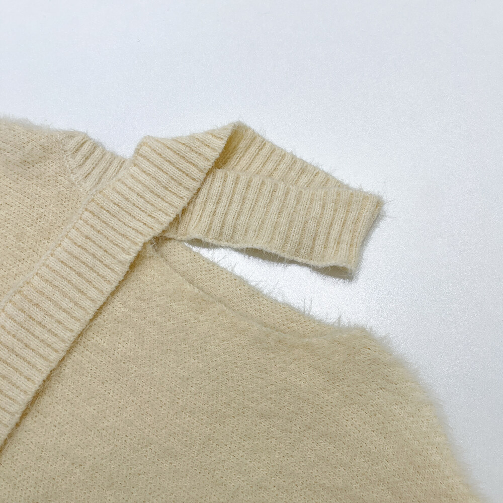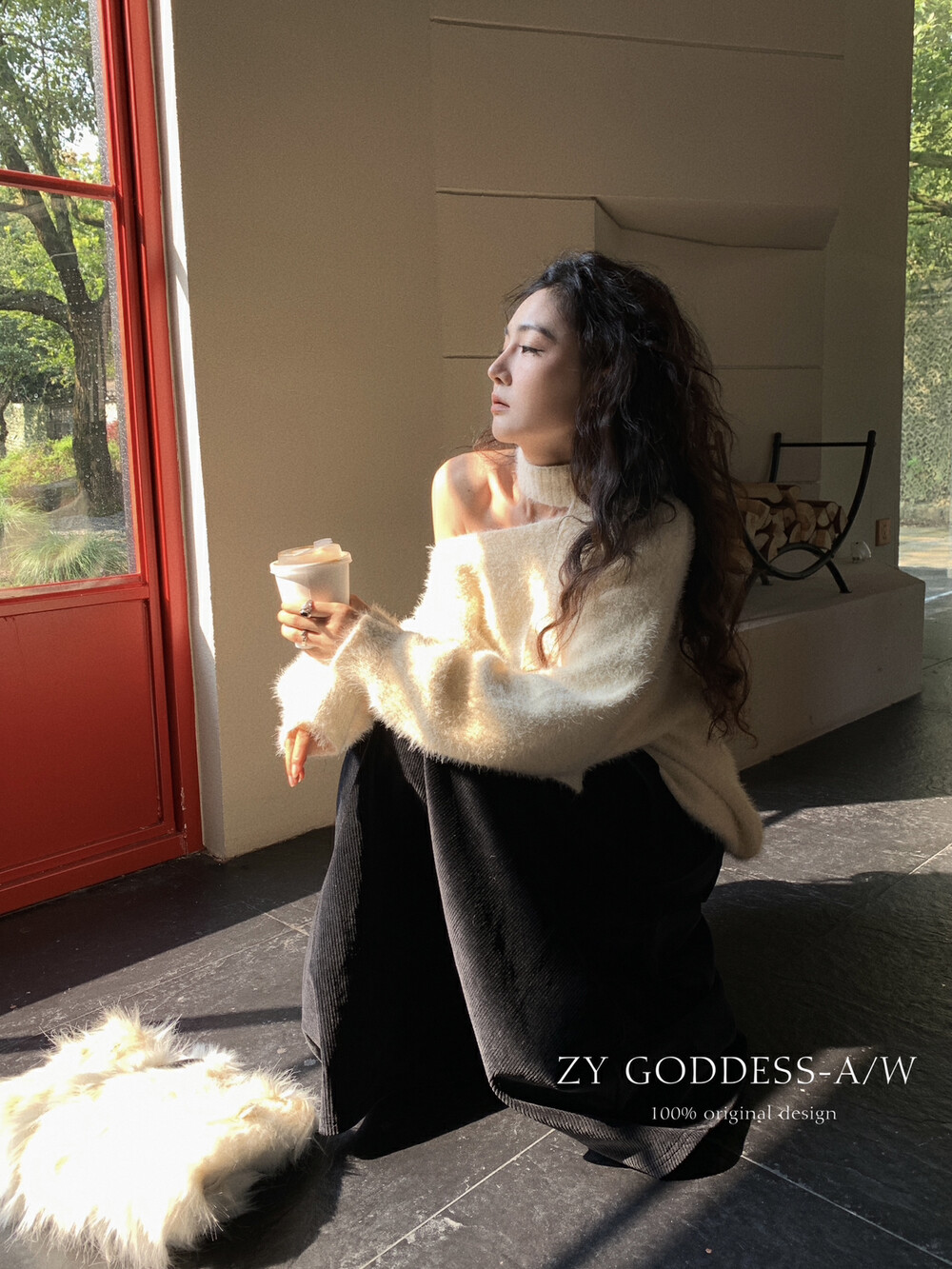 2024秋冬新款韓版設計感懶惰風斜肩毛茸茸毛衣純欲寬松飄帶針織衫