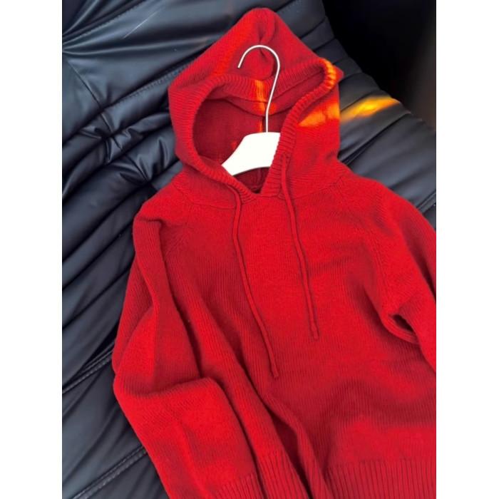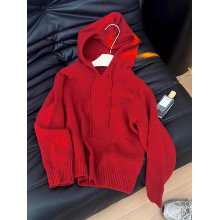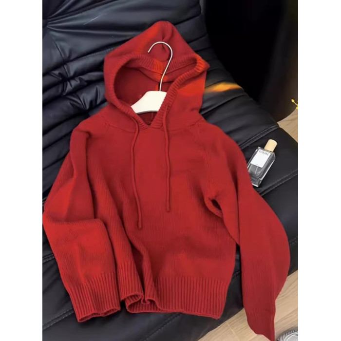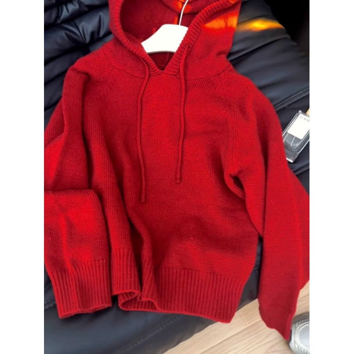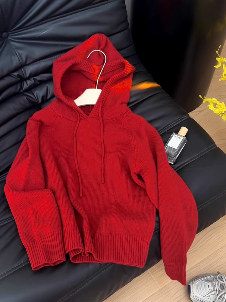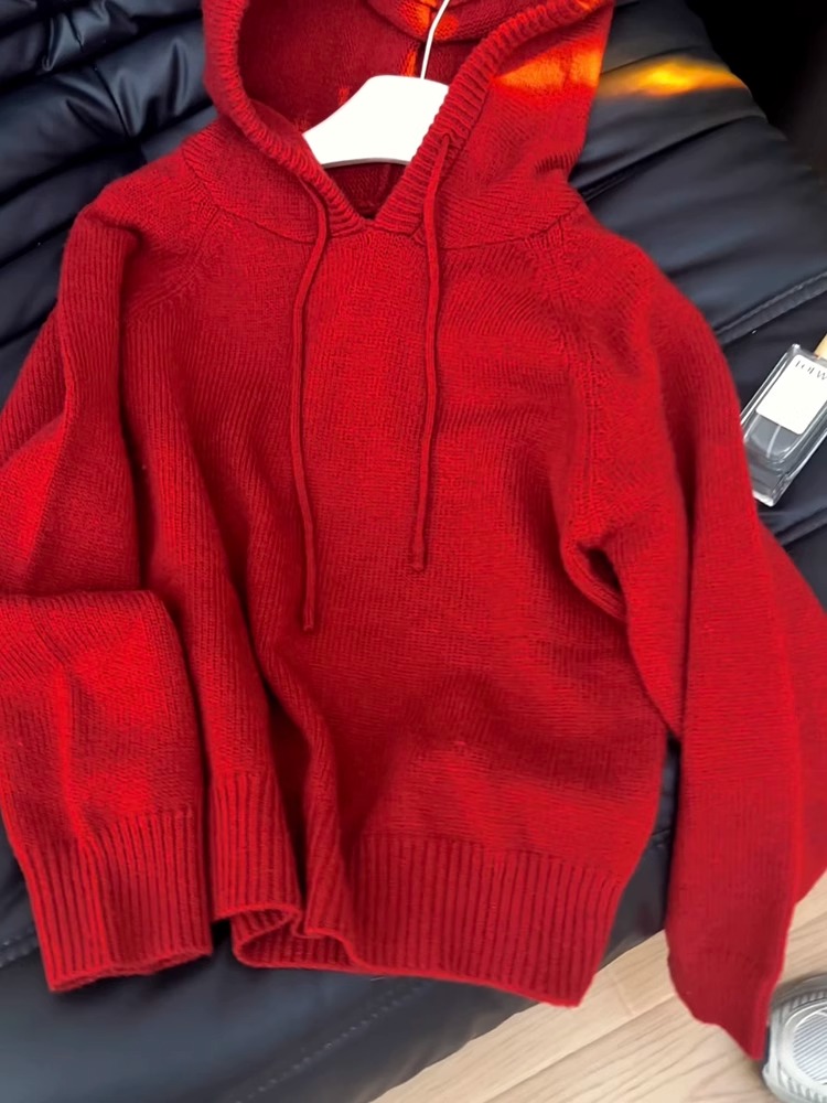 秋冬聖誕穿搭新年紅色連帽套頭毛衣外套女內搭外穿軟糯針織衫上衣