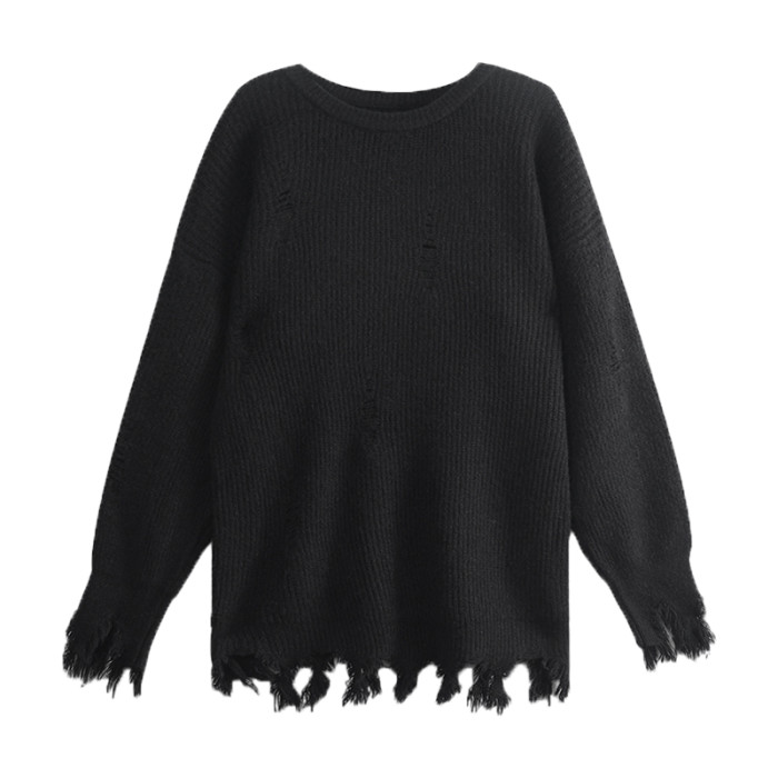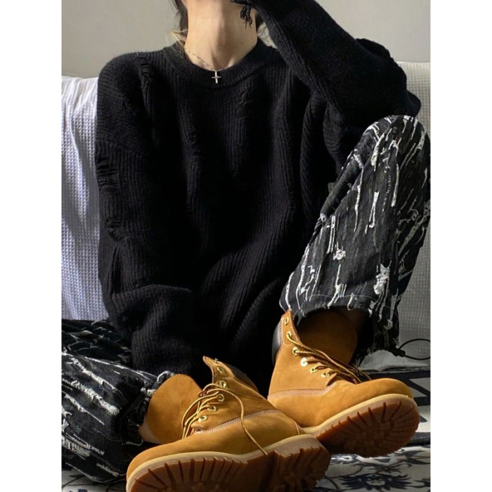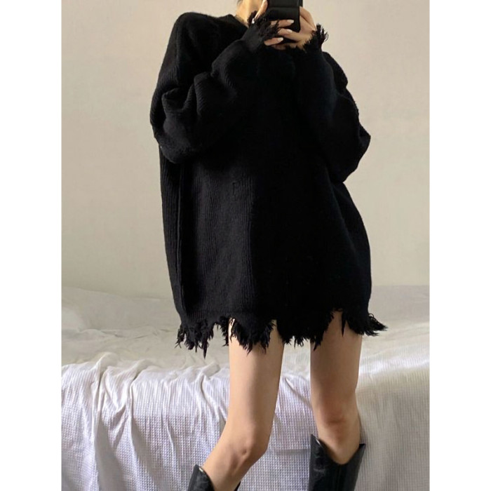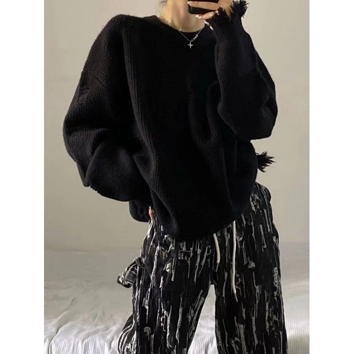 黑色毛衣女早秋裝2025秋冬高級慵懶風設計感小衆韓系破洞針織上衣
