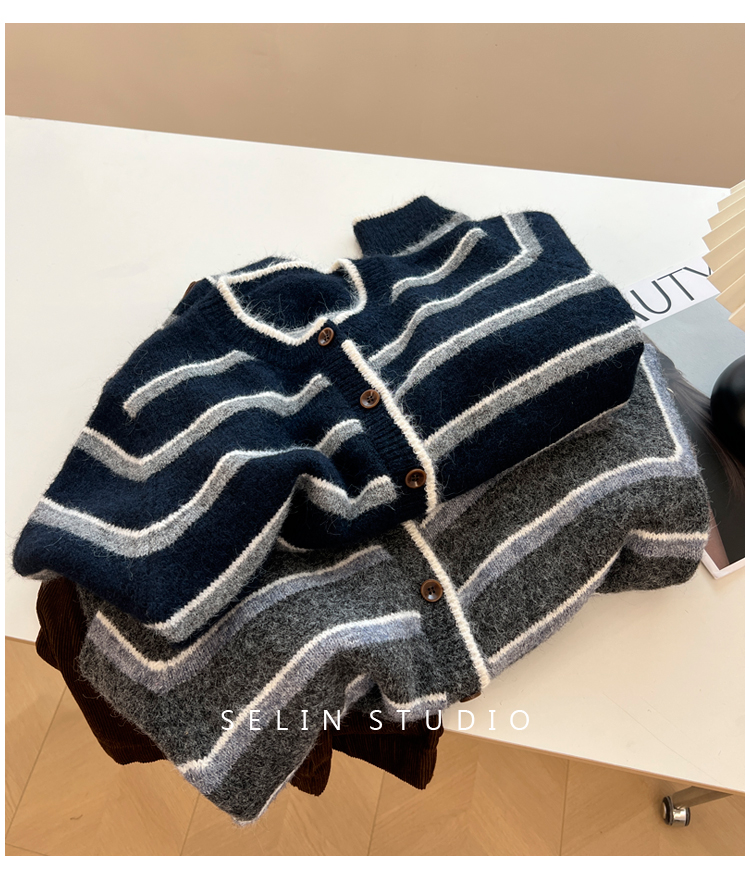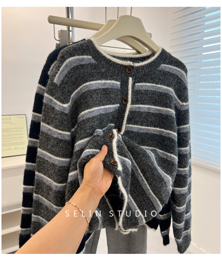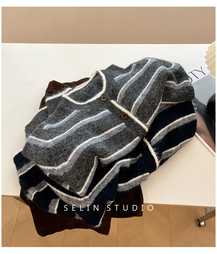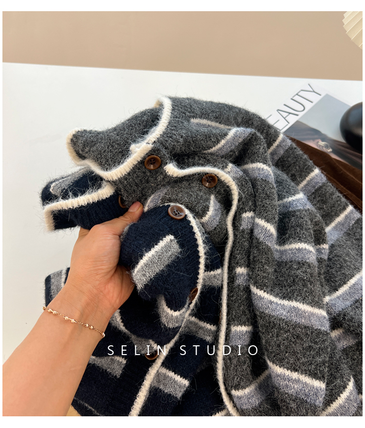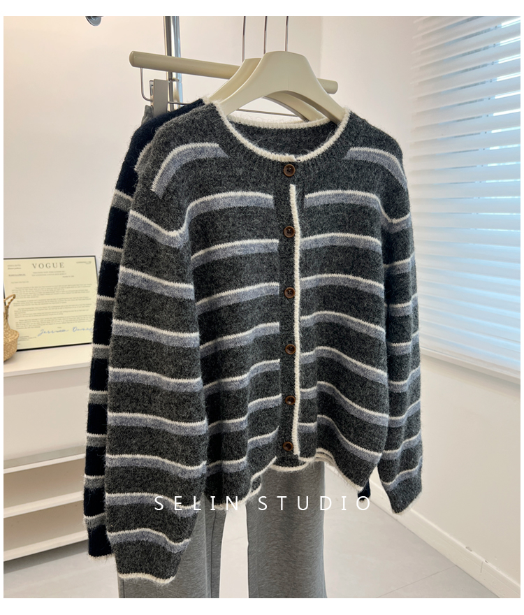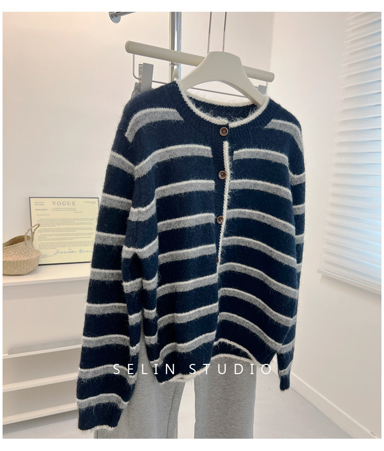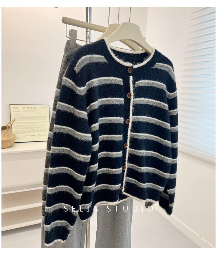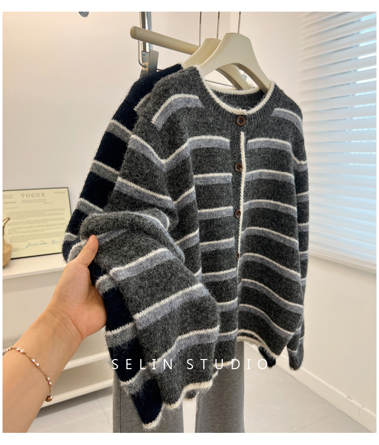 百搭復古條紋撞色圓領紐釦開衫毛衣女寬松慵懶小衆減齡學生針織衫