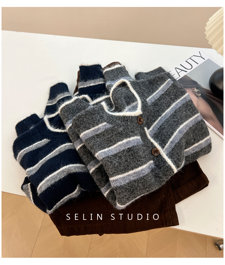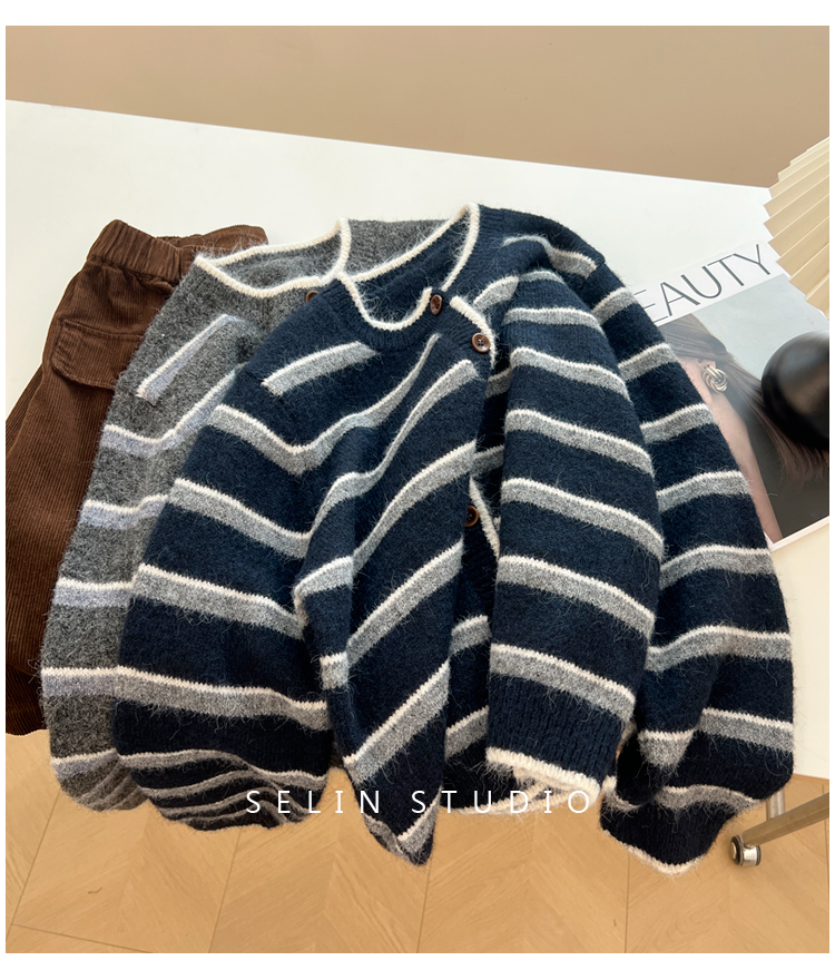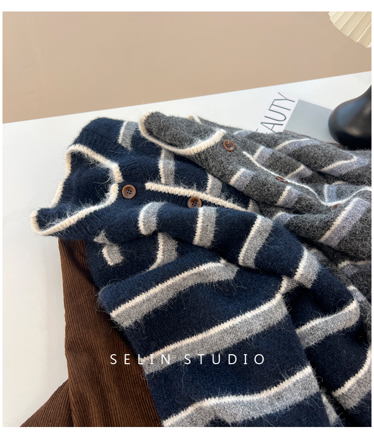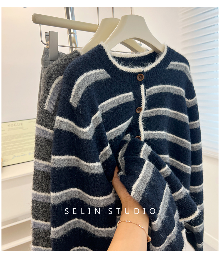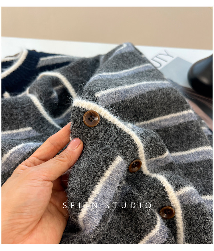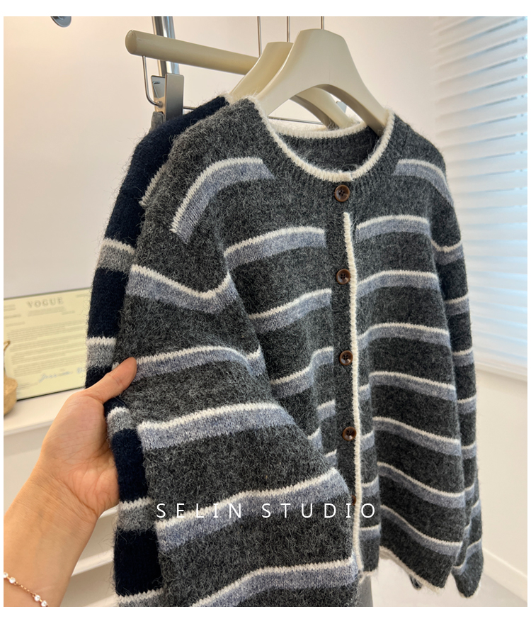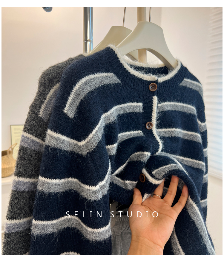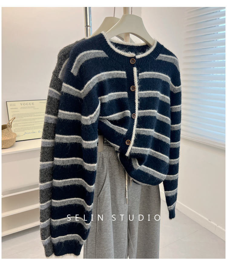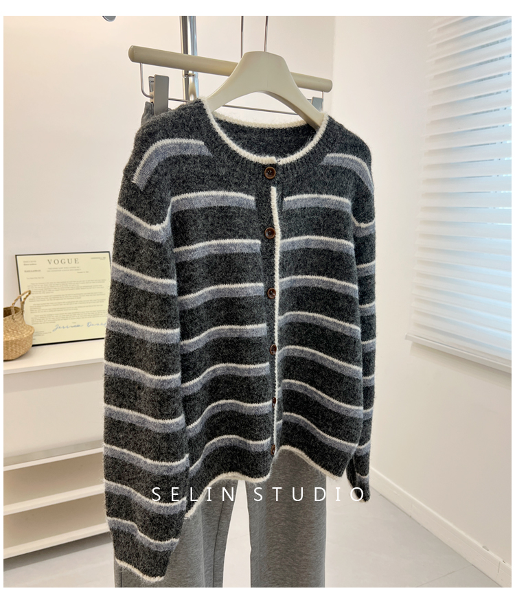 百搭復古條紋撞色圓領紐釦開衫毛衣女寬松慵懶小衆減齡學生針織衫