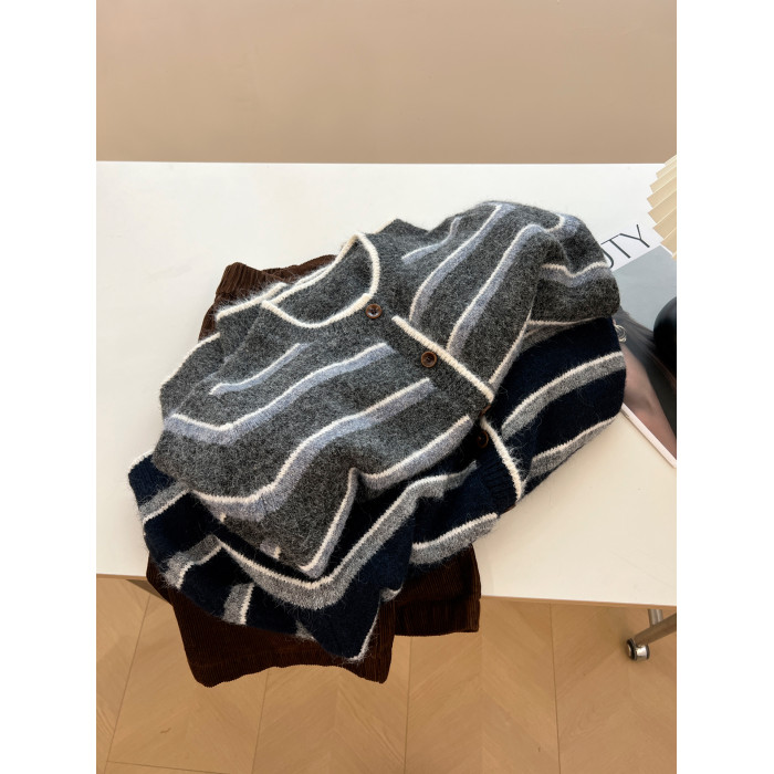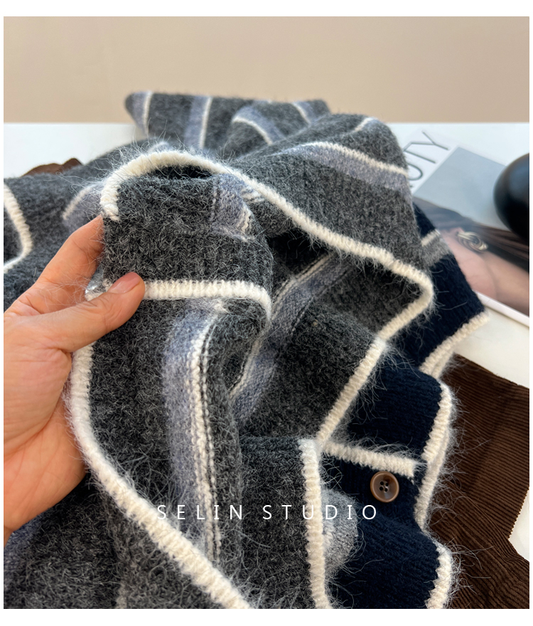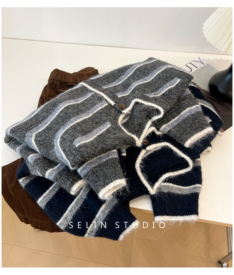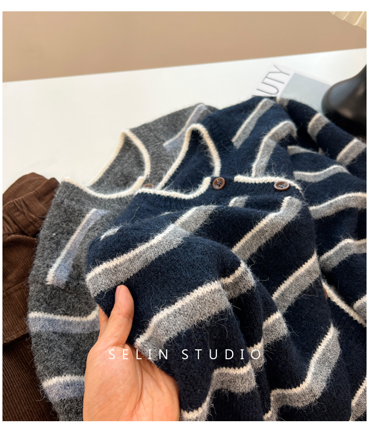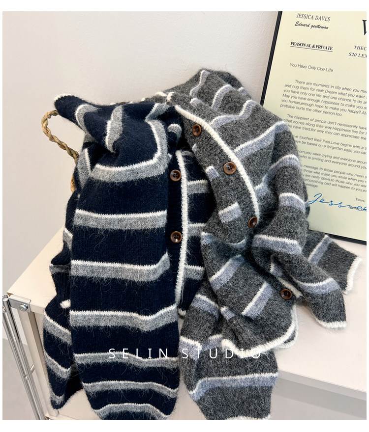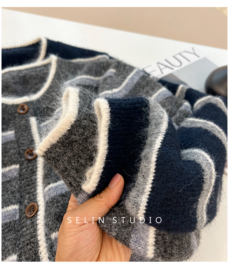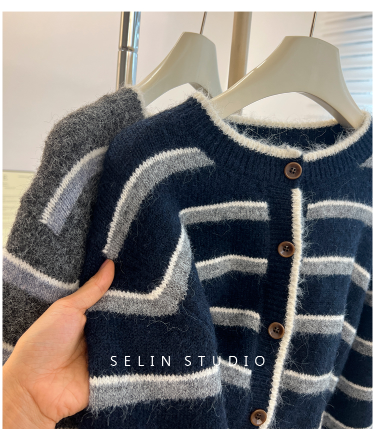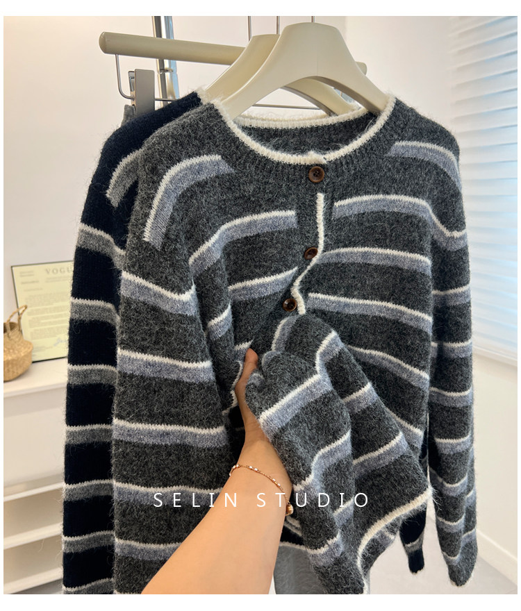 百搭復古條紋撞色圓領紐釦開衫毛衣女寬松慵懶小衆減齡學生針織衫