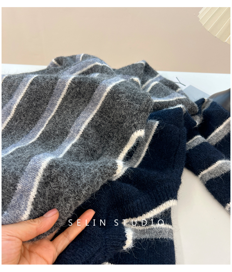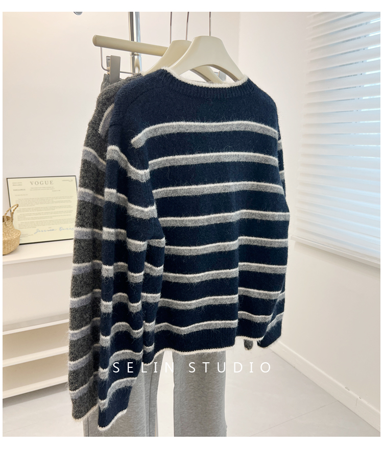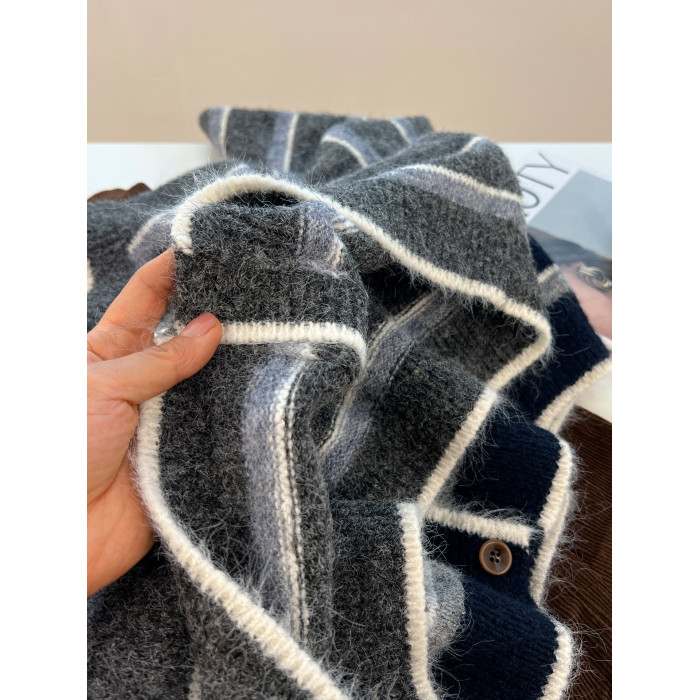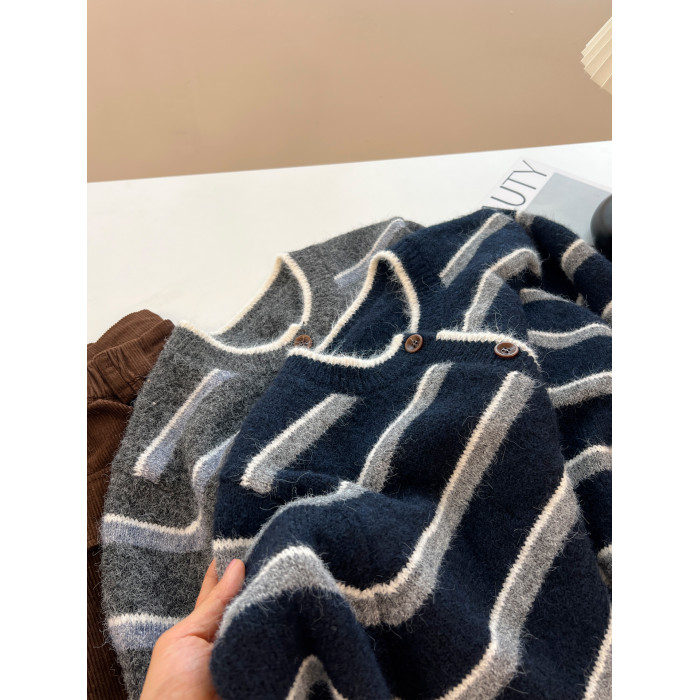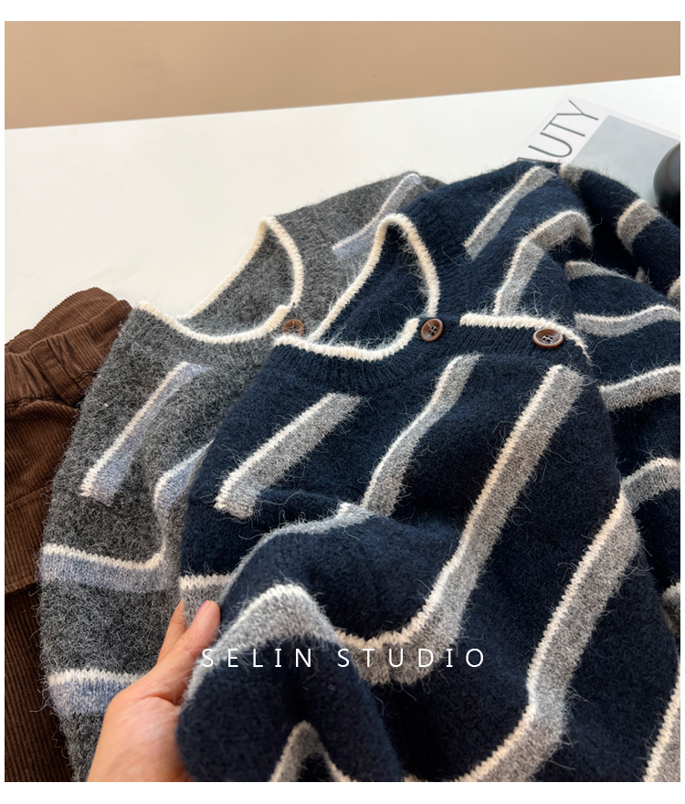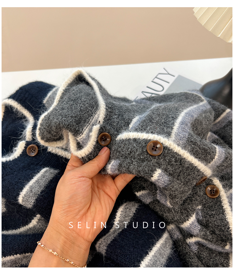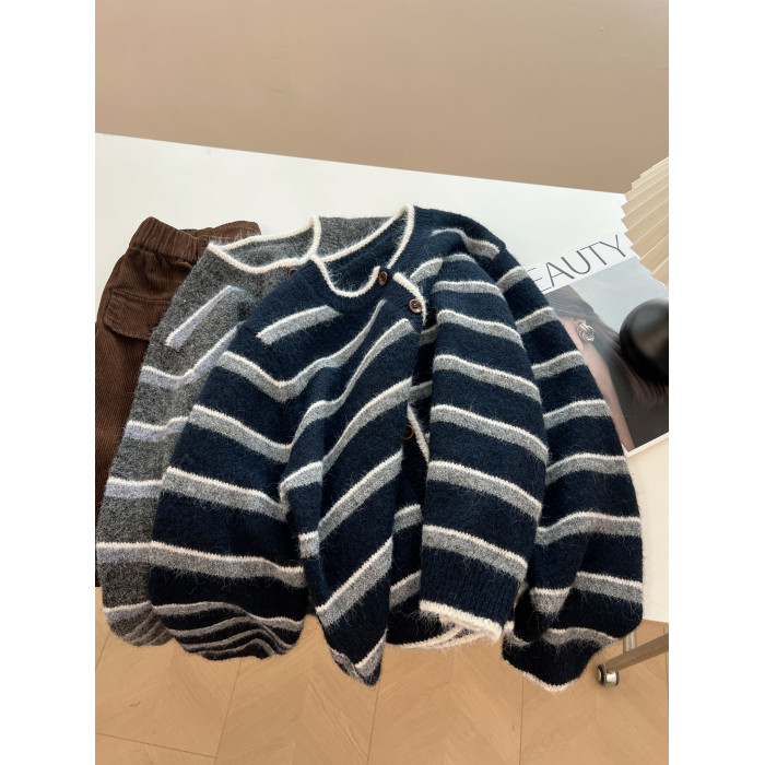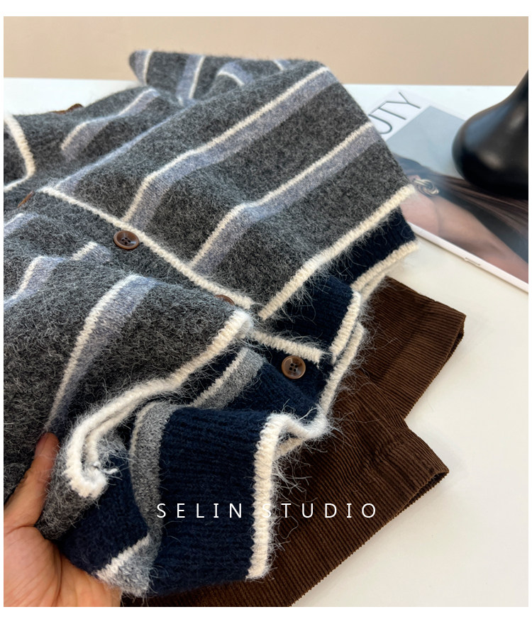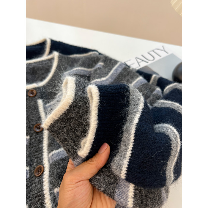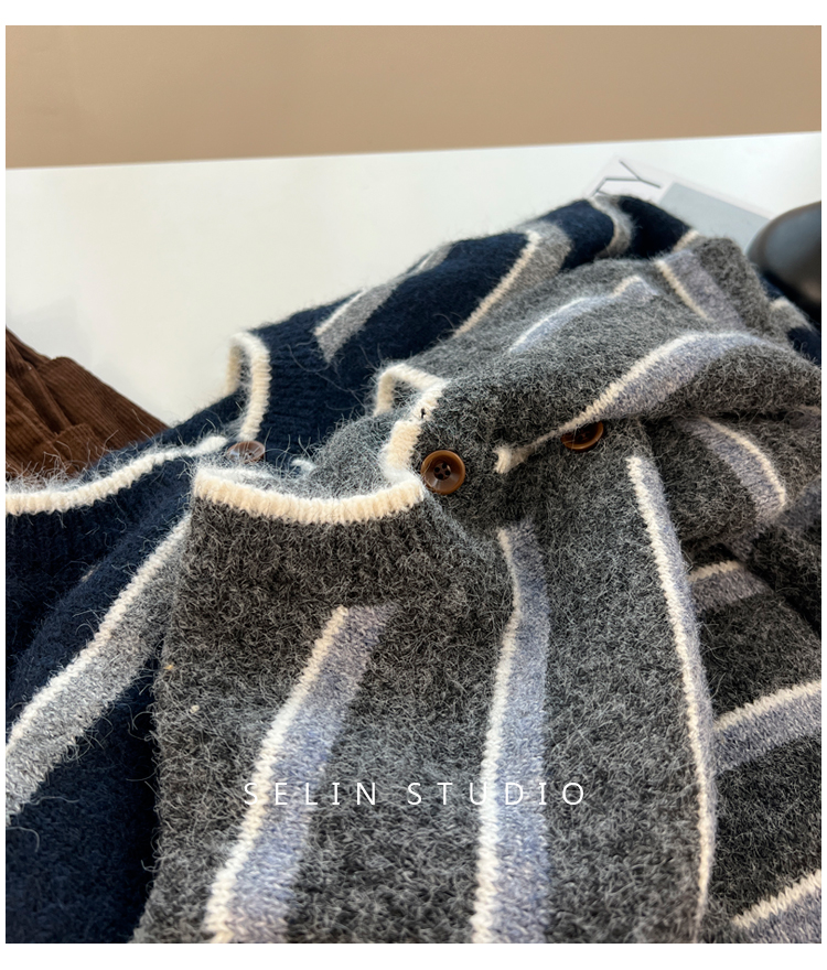 百搭復古條紋撞色圓領紐釦開衫毛衣女寬松慵懶小衆減齡學生針織衫