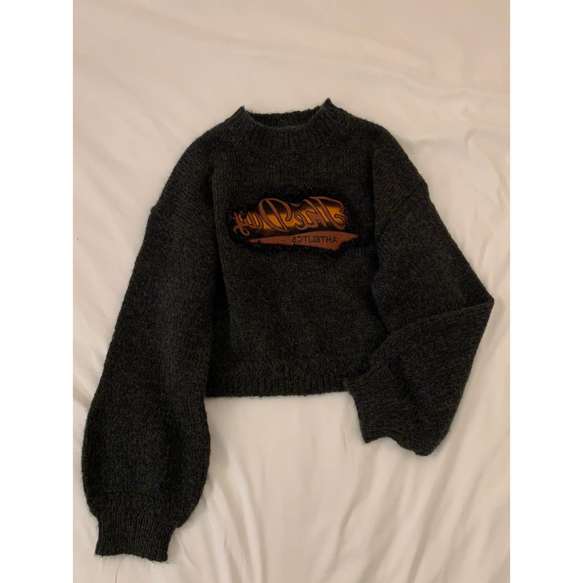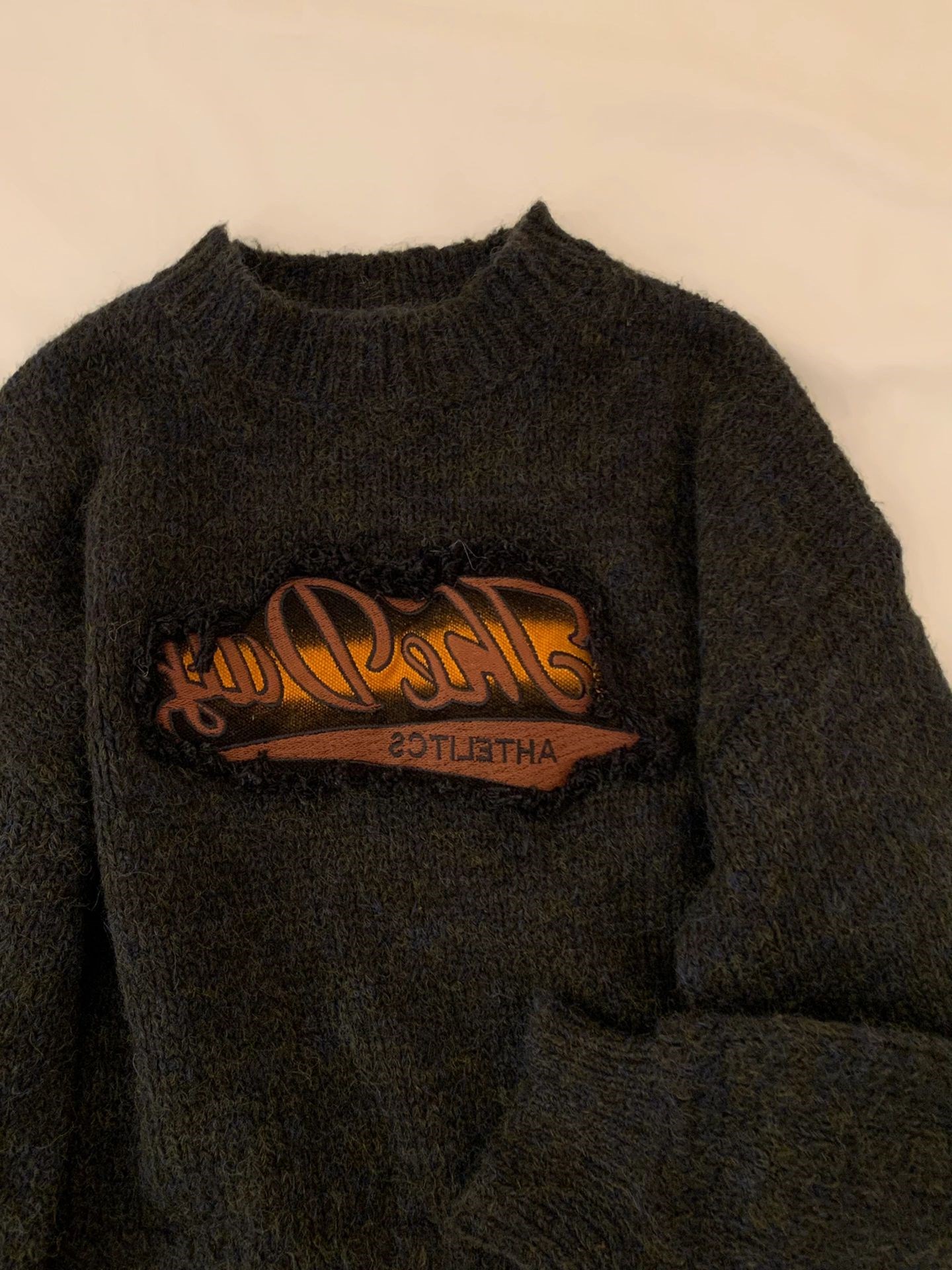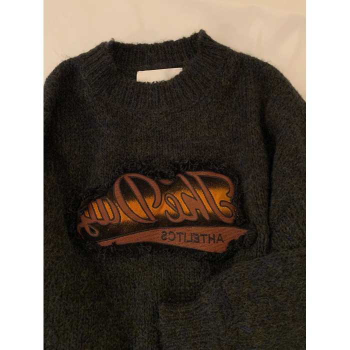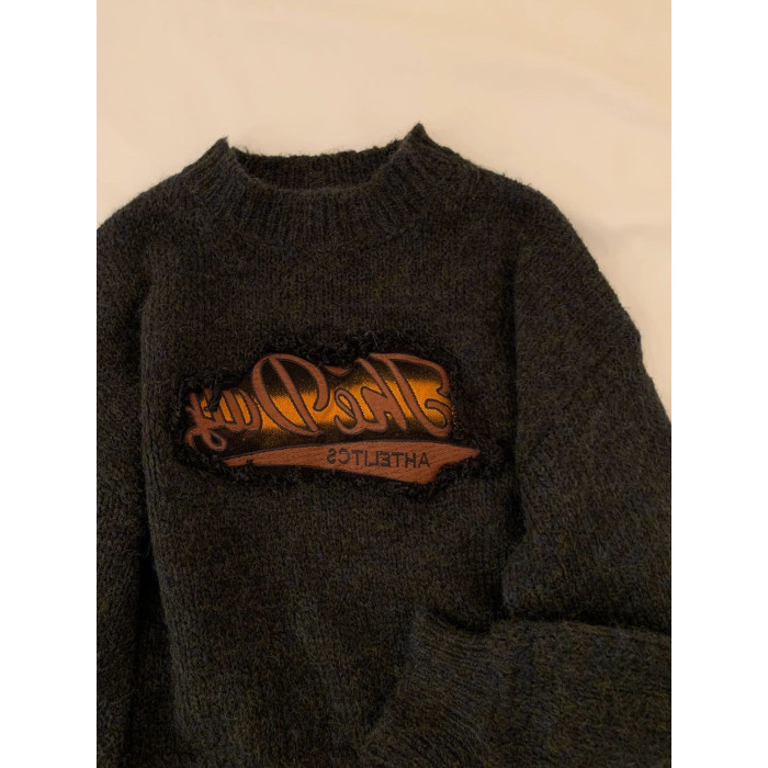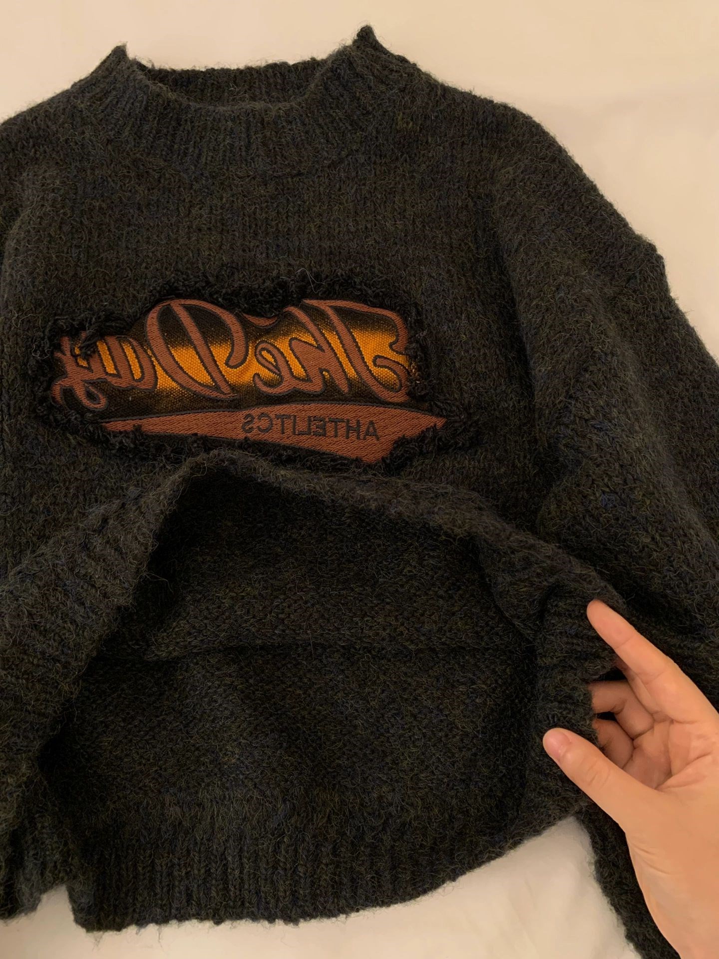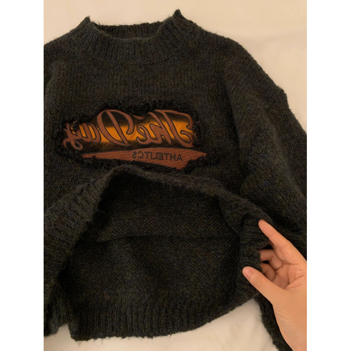 美式復古慵懶風黑色字母浣熊絨毛衣女秋冬軟糯設計感套頭針織上衣