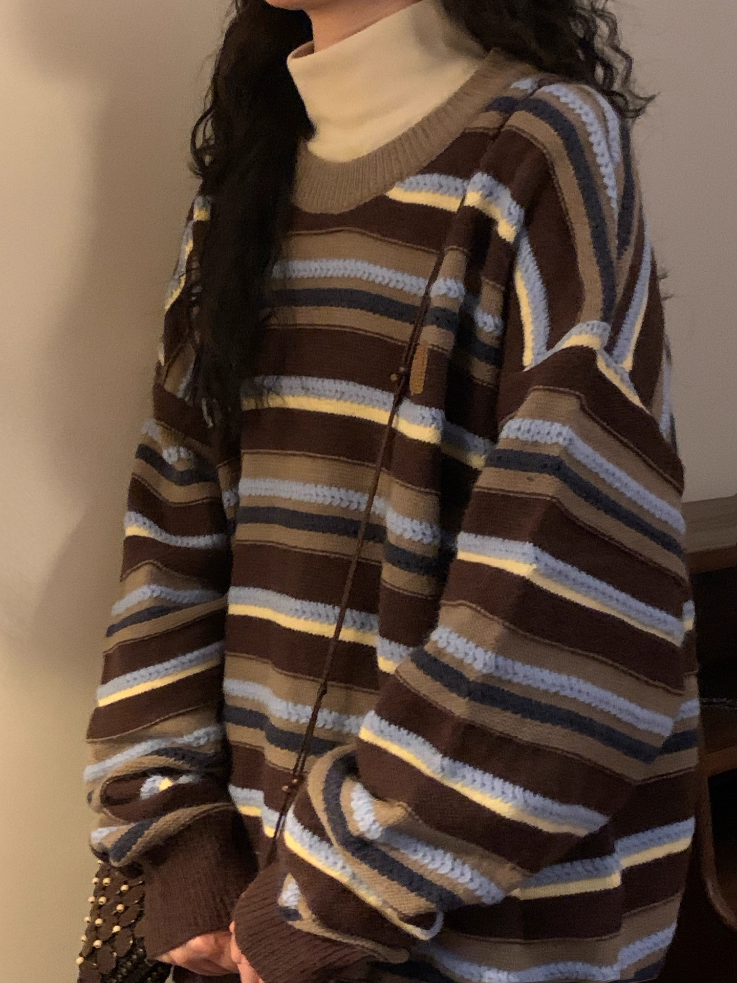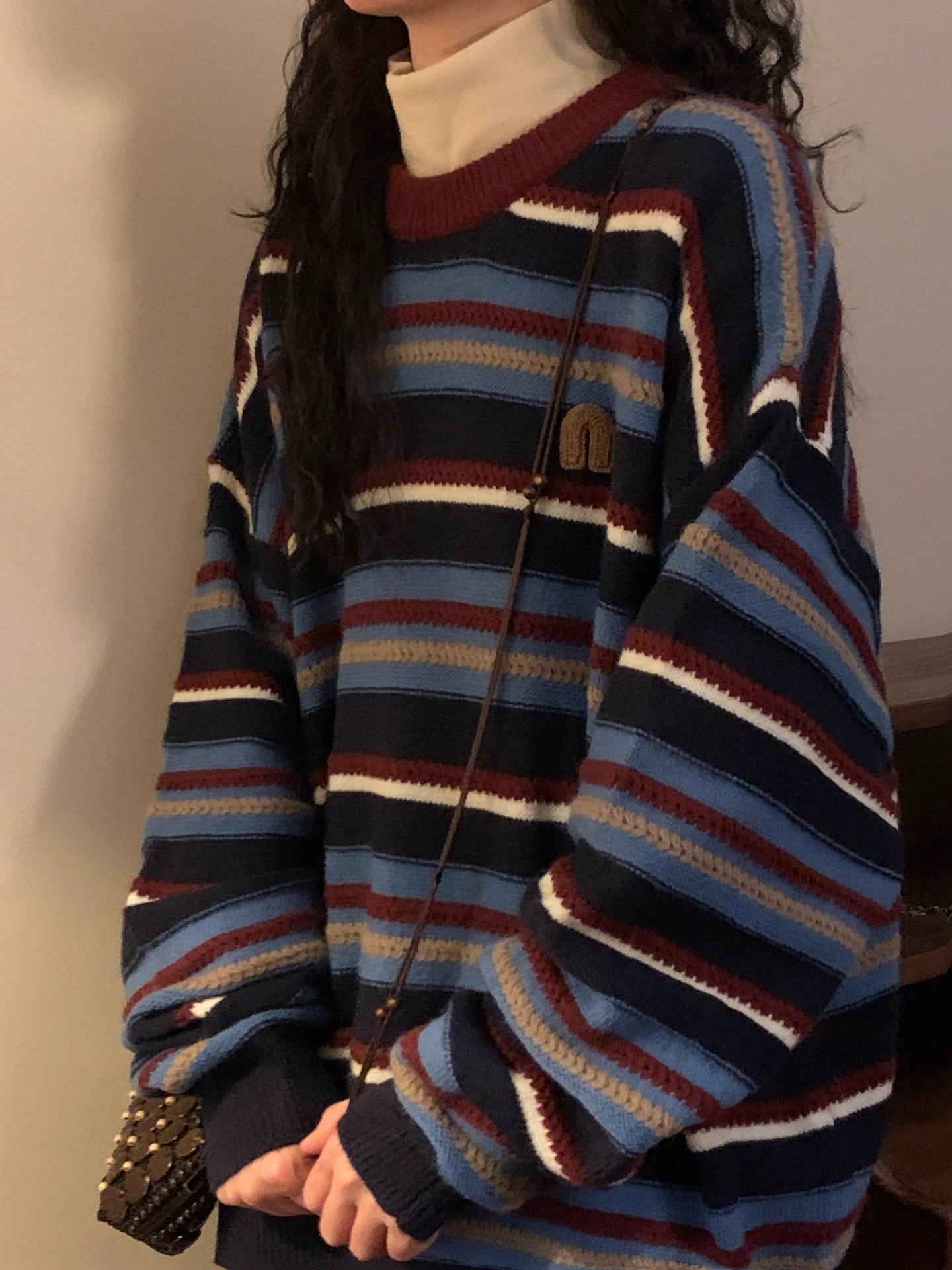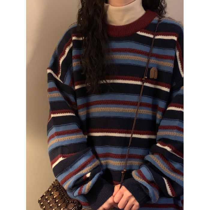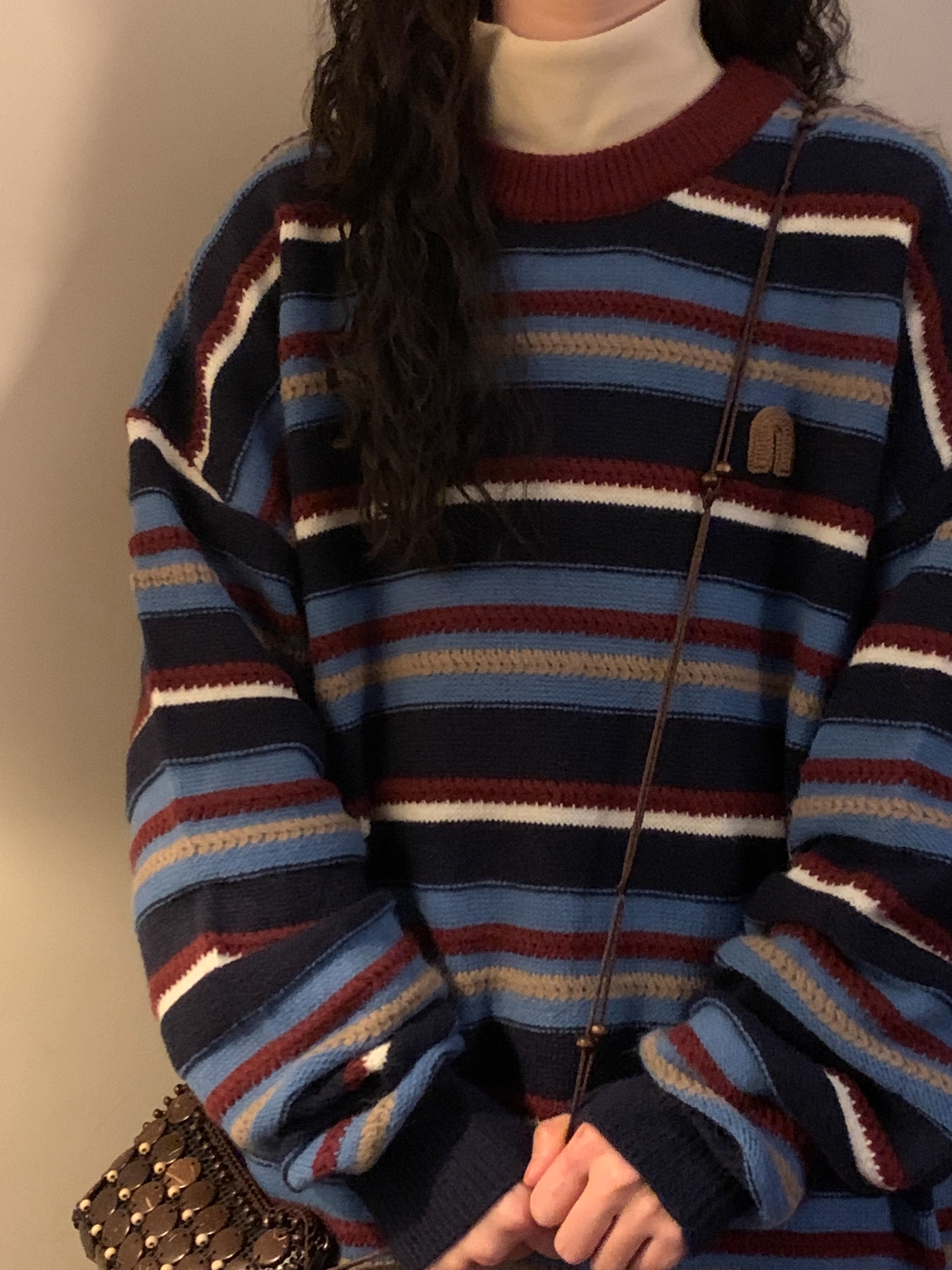 法式復古慵懶風條紋針織上衣秋冬新款大碼寬松百搭圓領套頭毛衣女