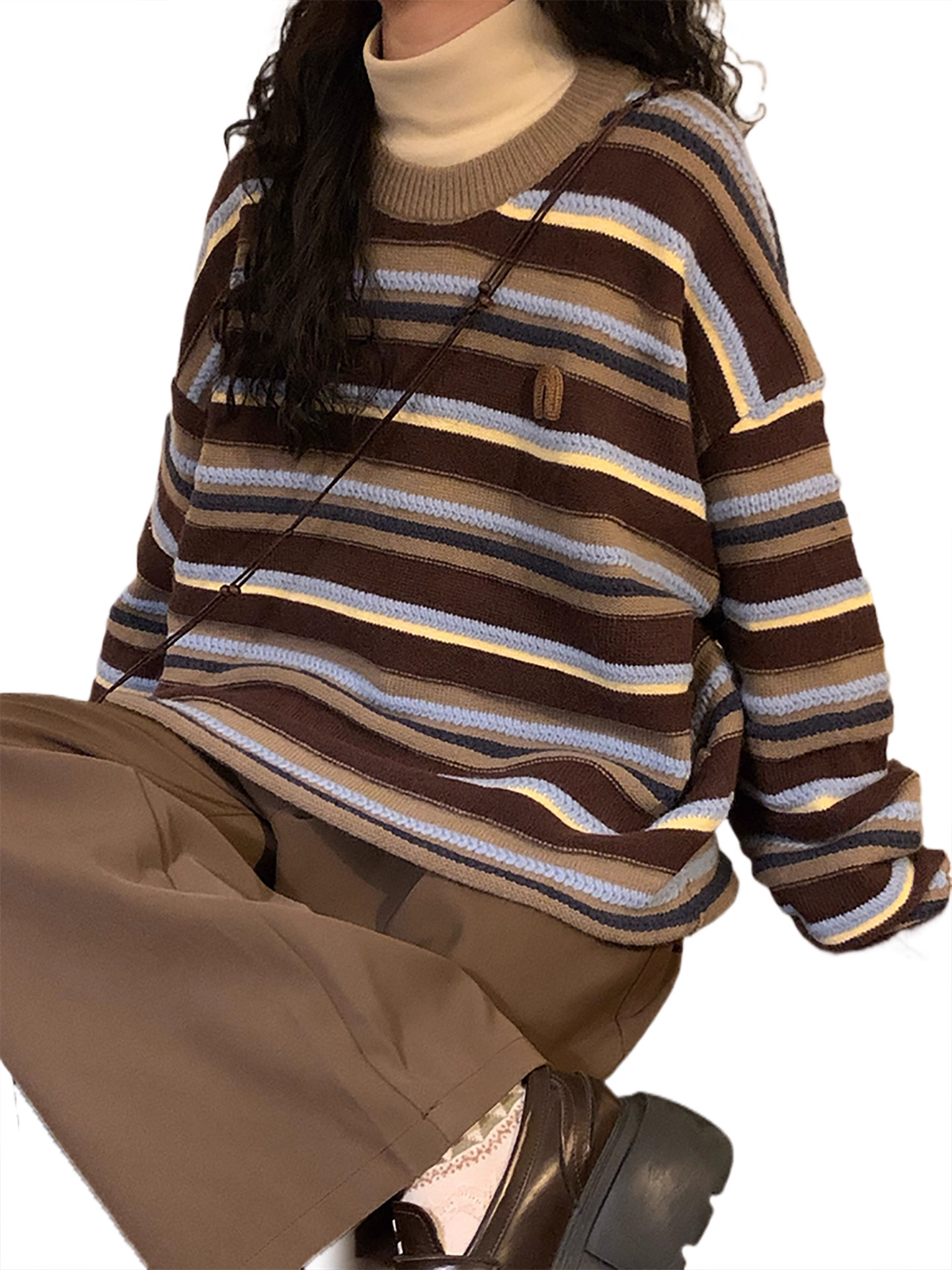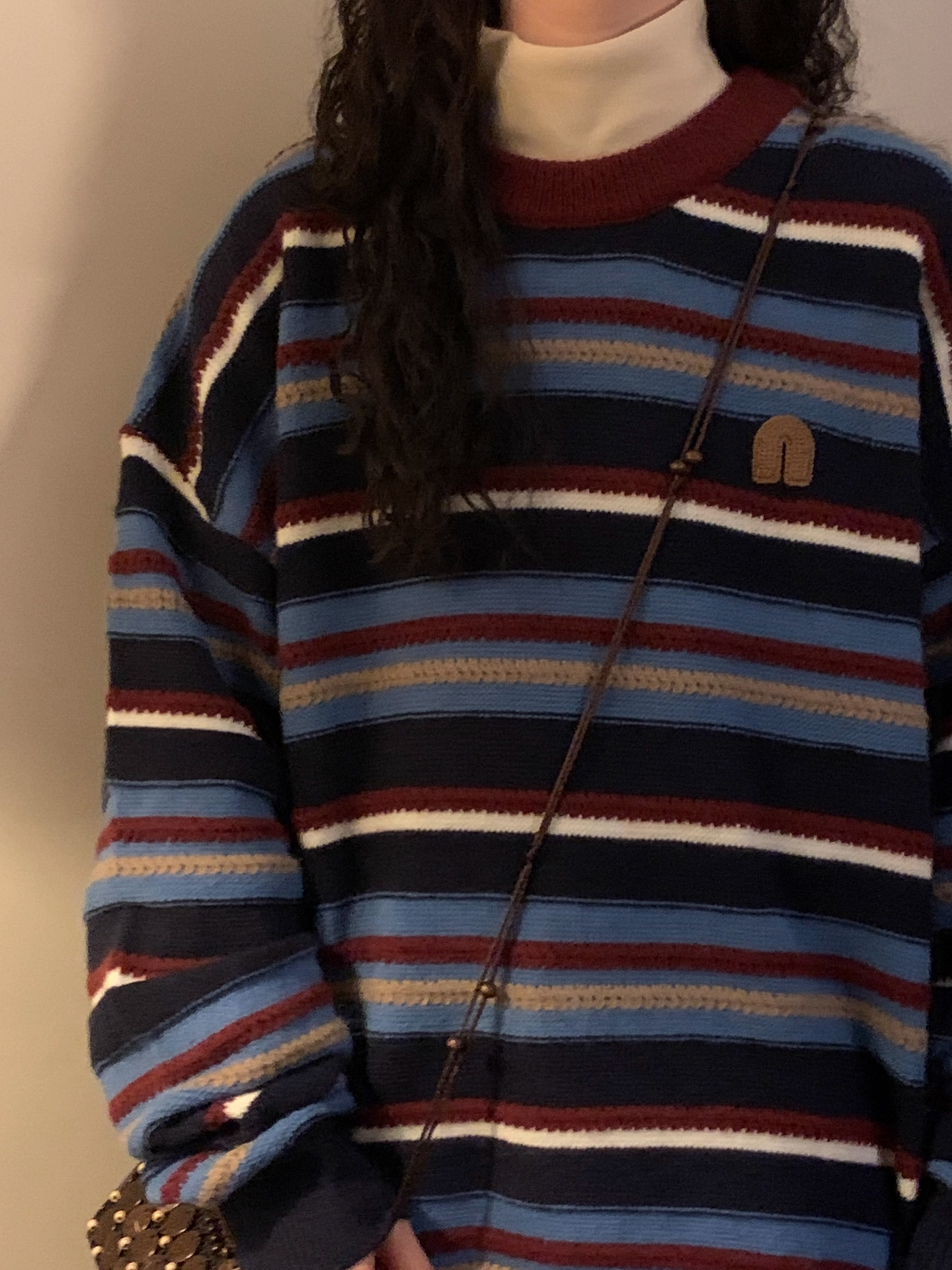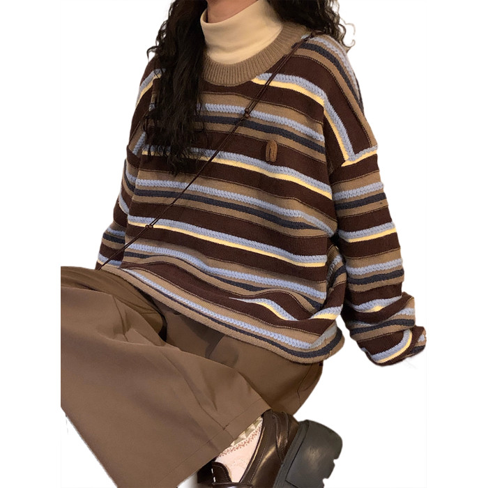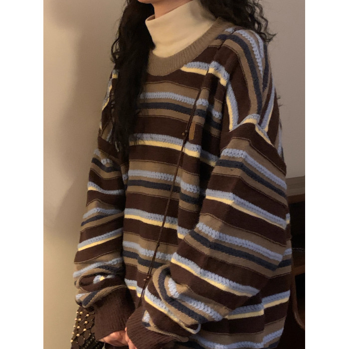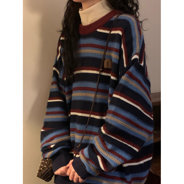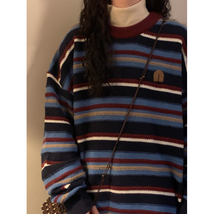 法式復古慵懶風條紋針織上衣秋冬新款大碼寬松百搭圓領套頭毛衣女