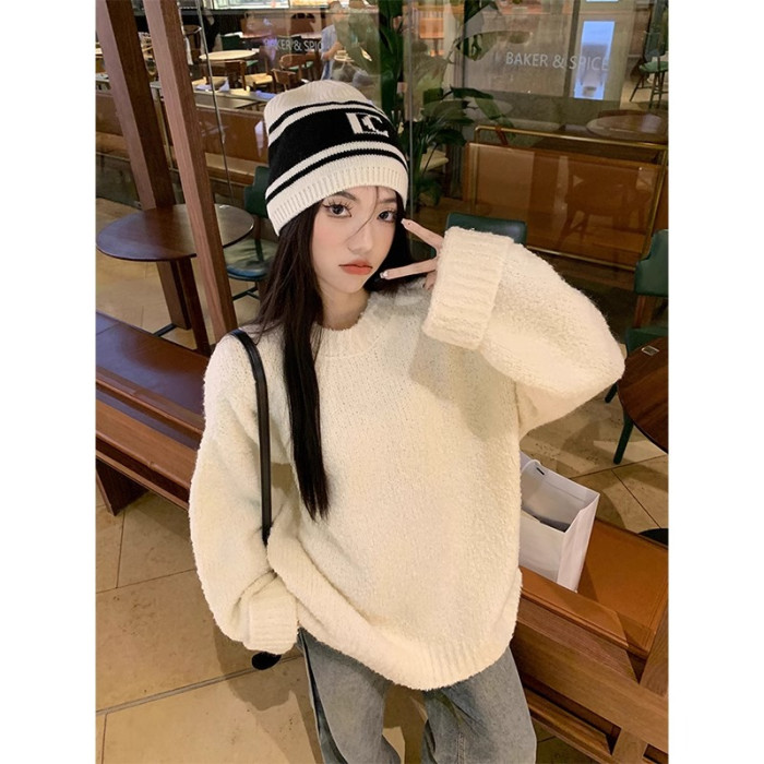 奶fufu黑色毛衣女秋冬寬松慵懶加厚圓領套頭設計感軟糯針織上衣