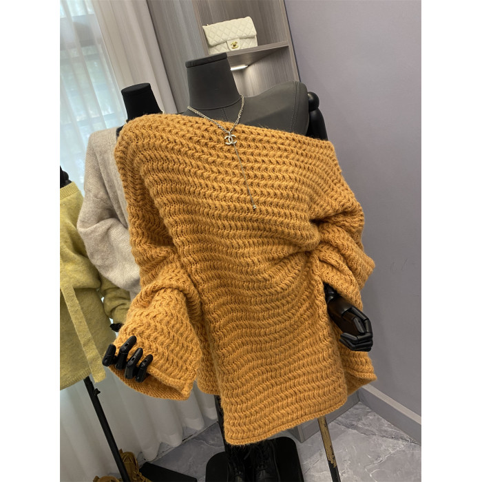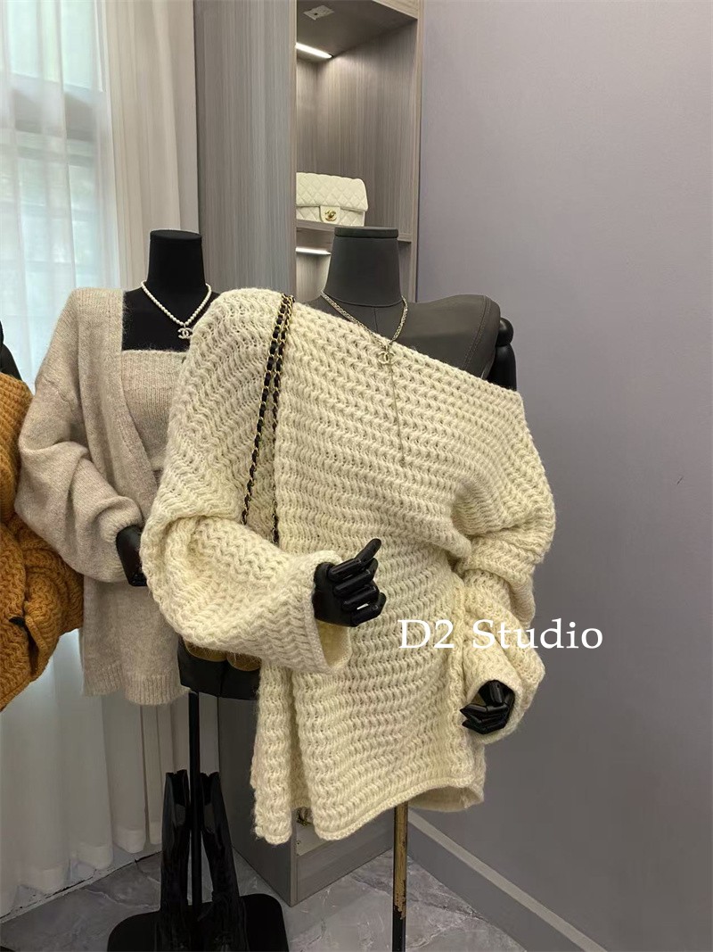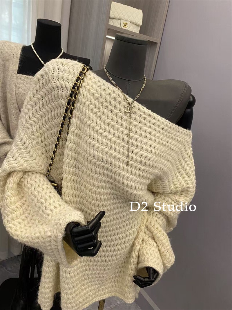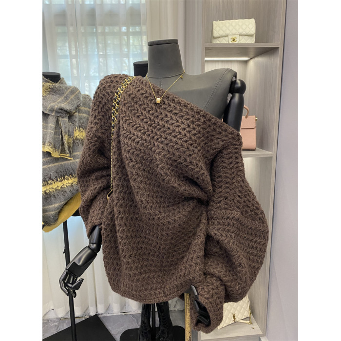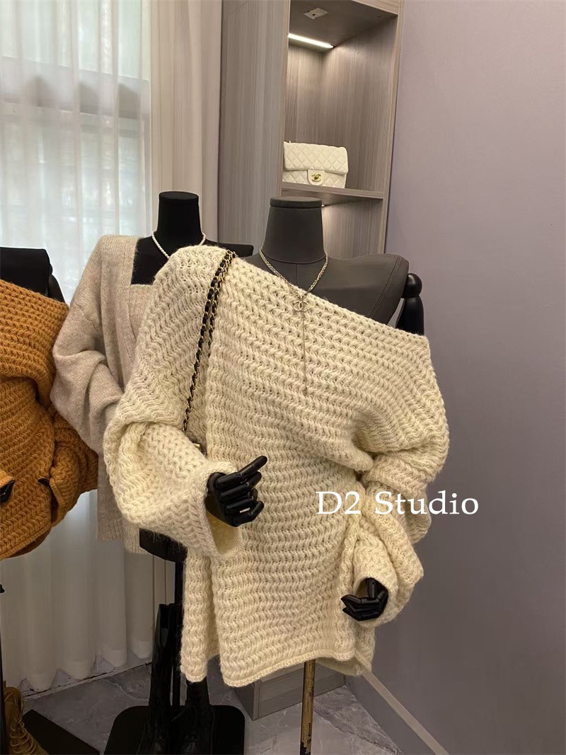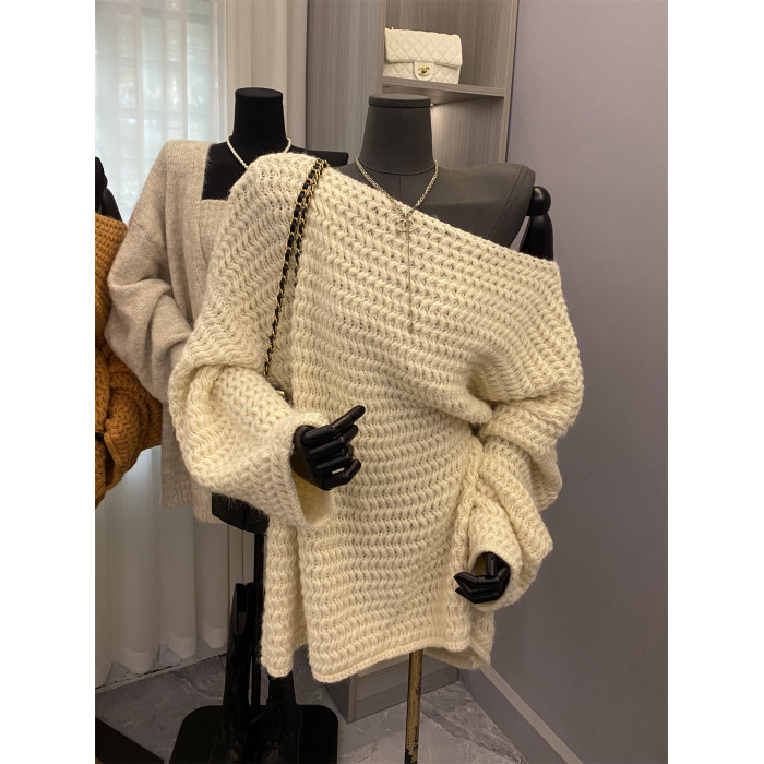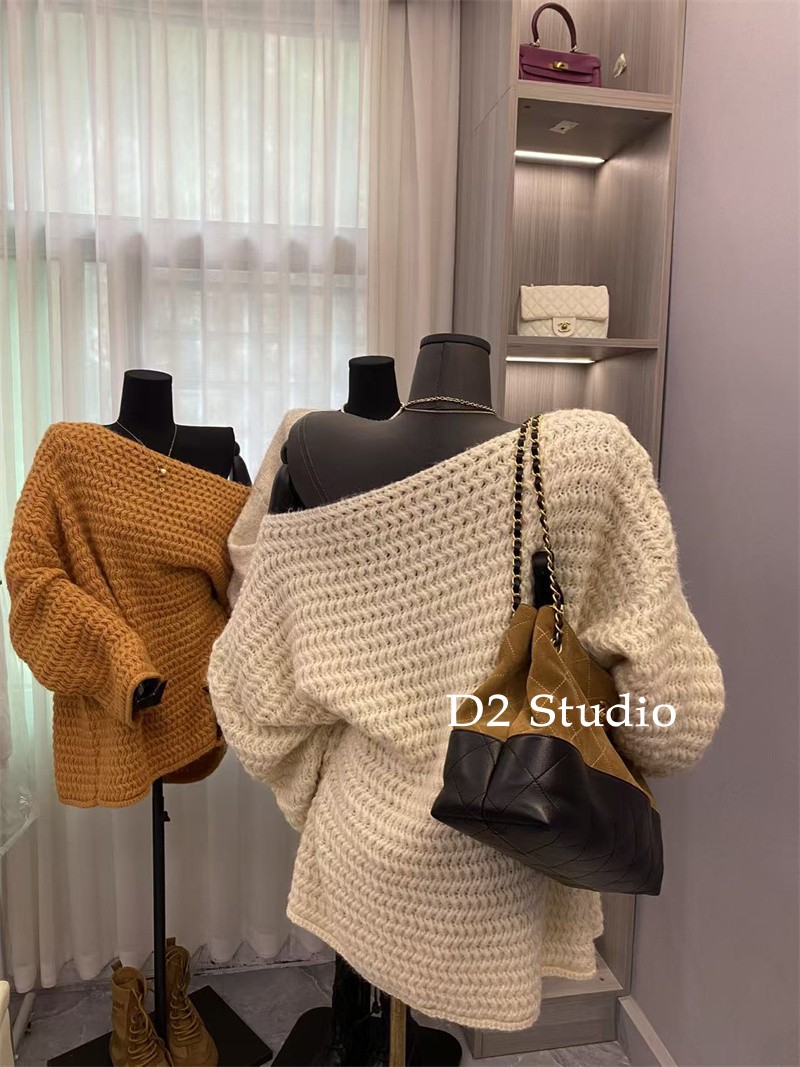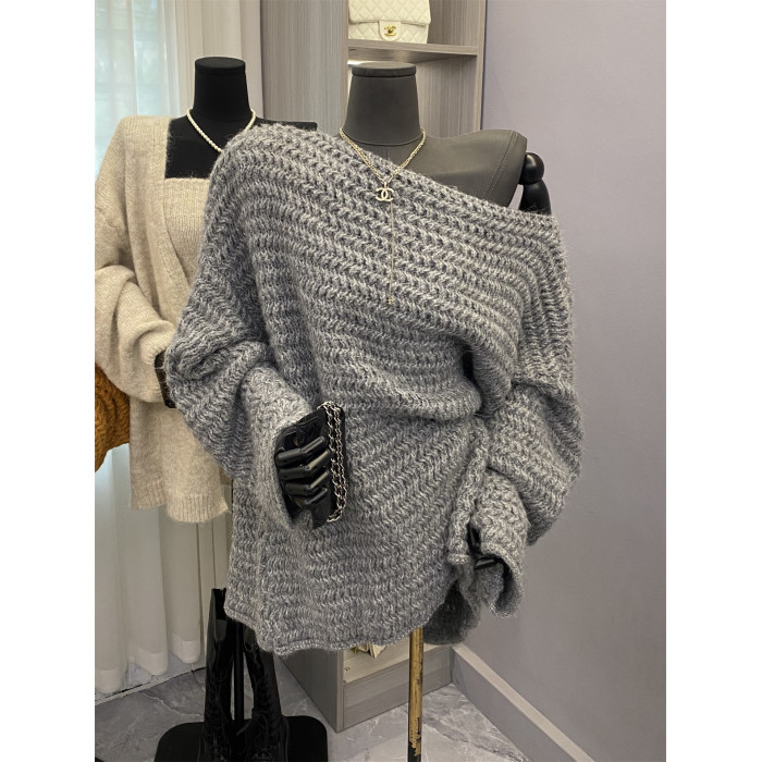 韓版慵懶風氣質斜肩長袖毛衣女秋季新款寬松顯瘦純色針織衫上衣潮