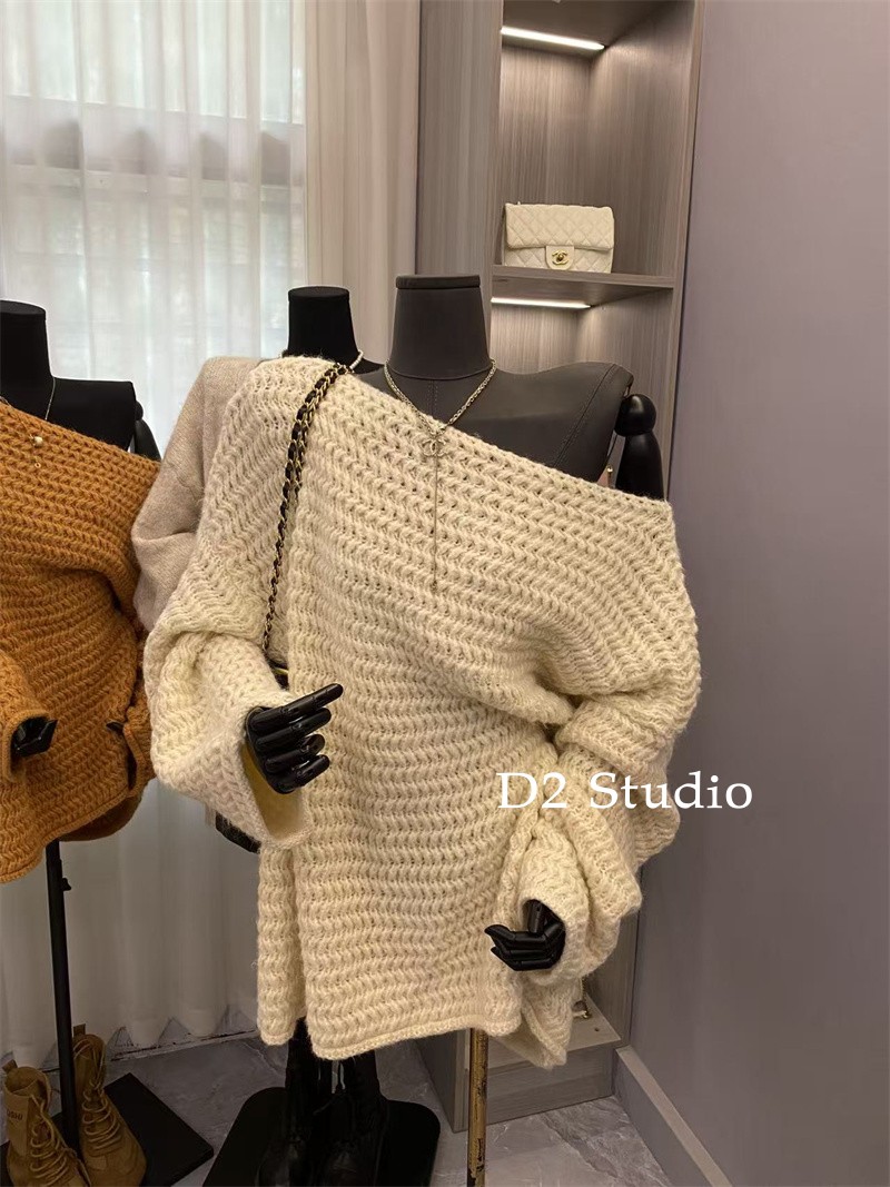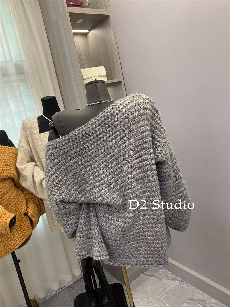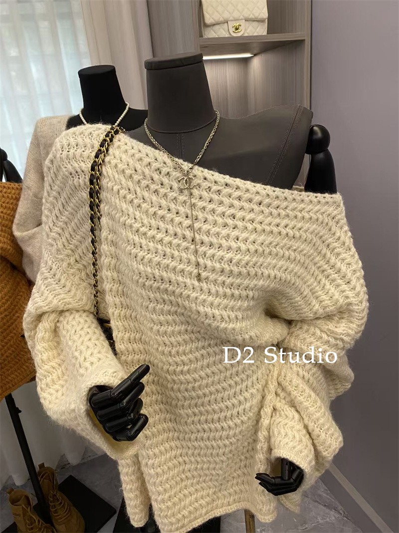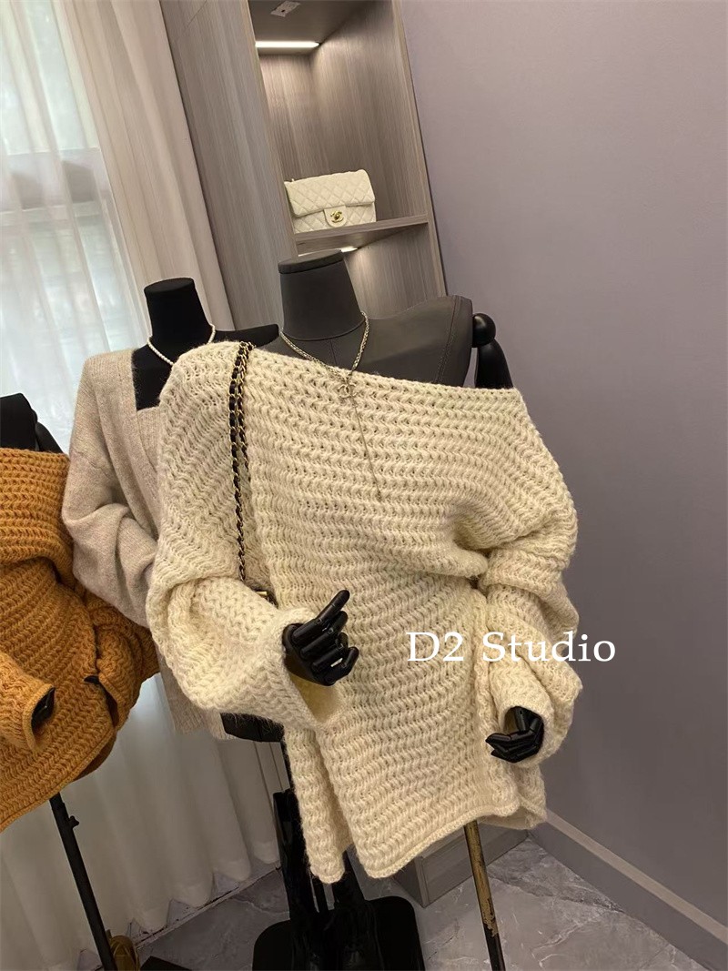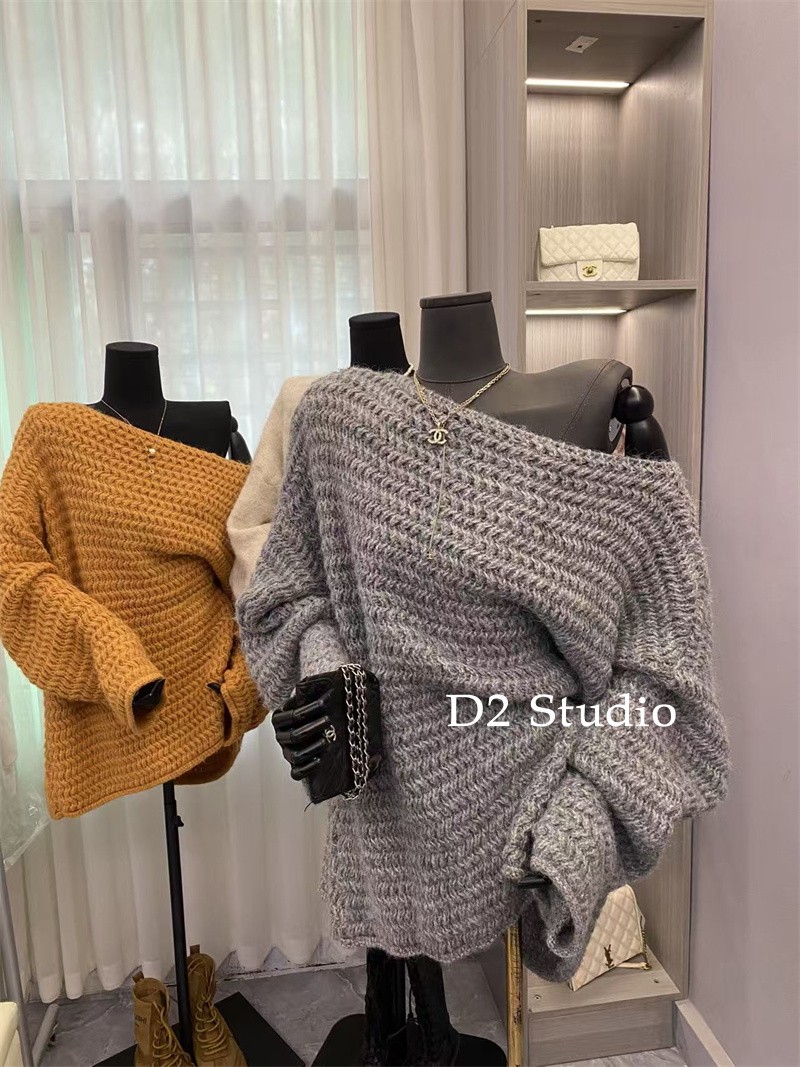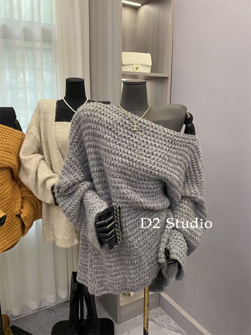 韓版慵懶風氣質斜肩長袖毛衣女秋季新款寬松顯瘦純色針織衫上衣潮