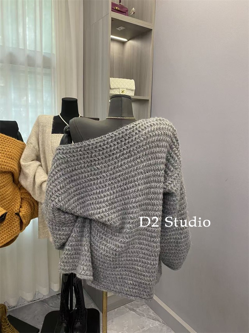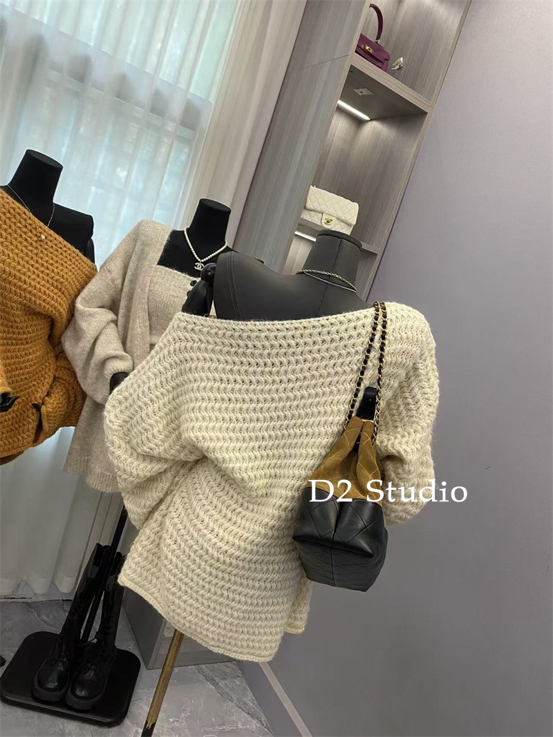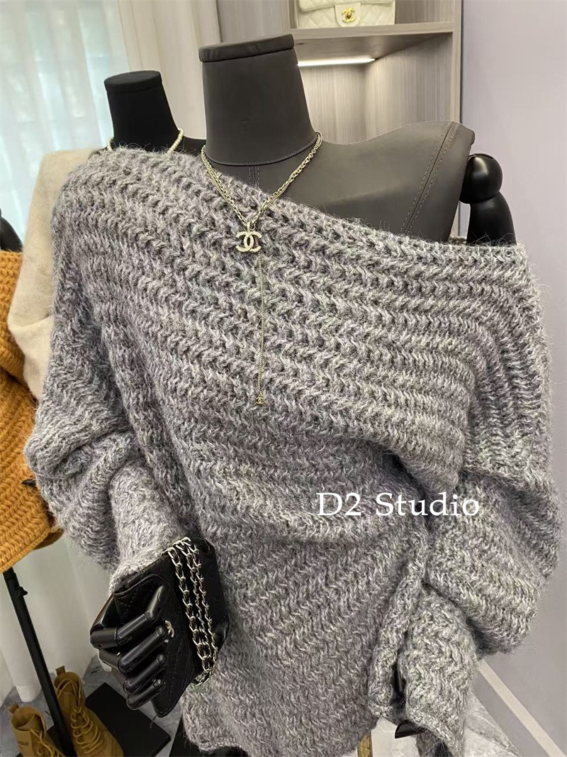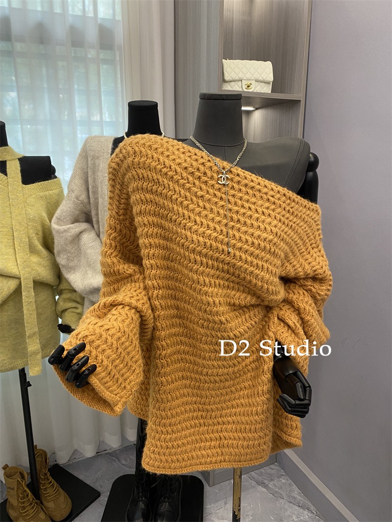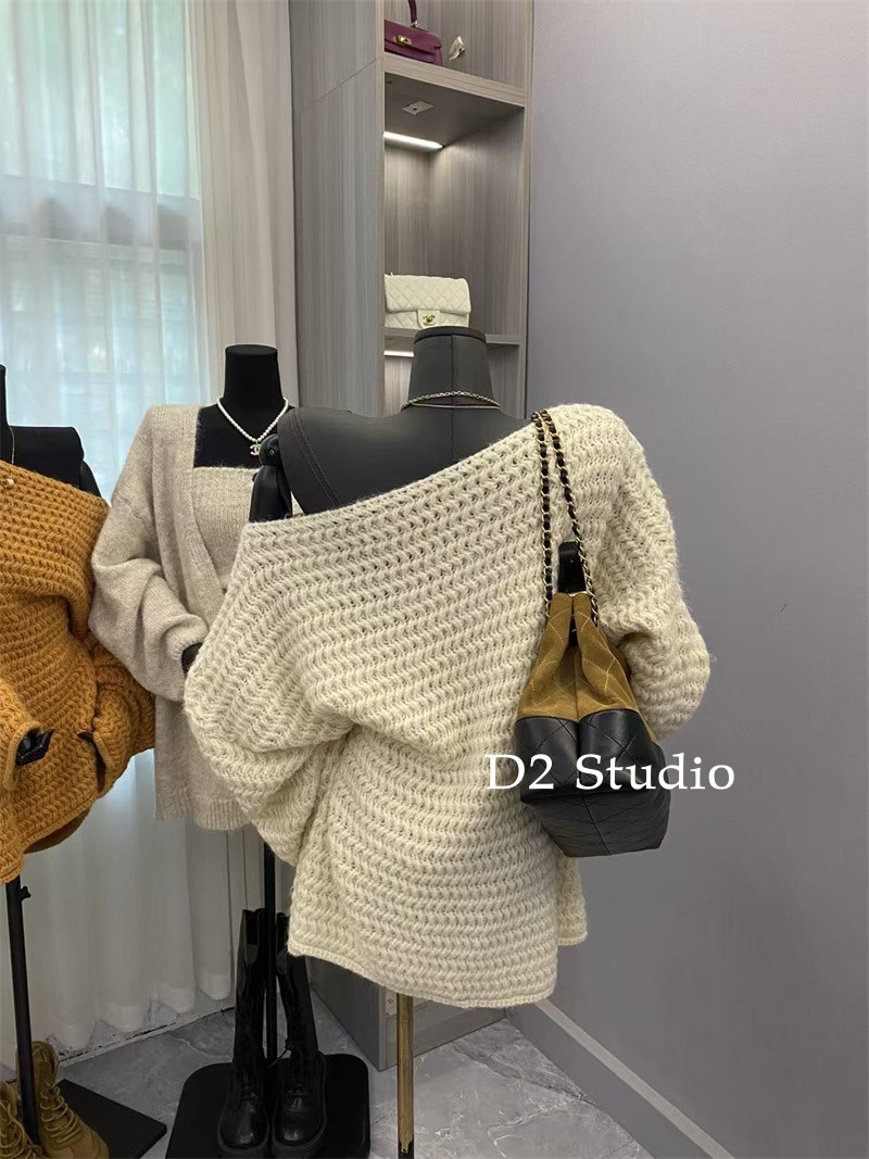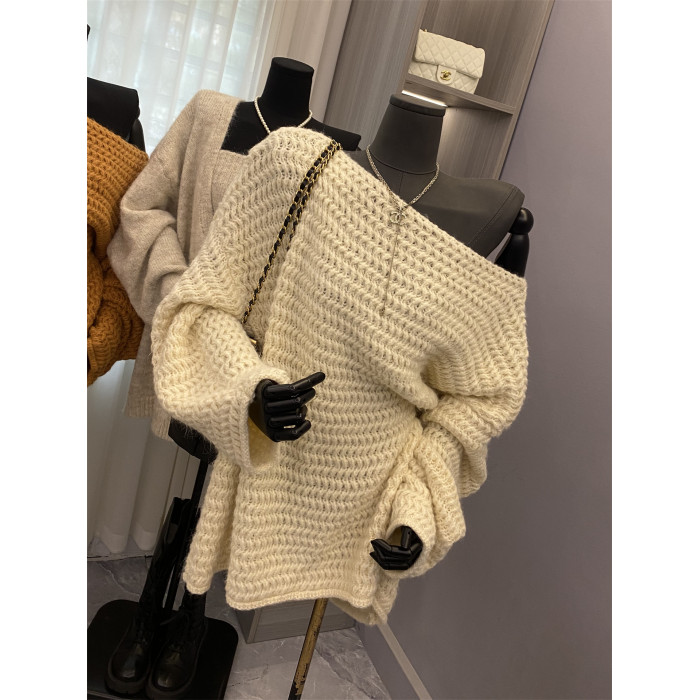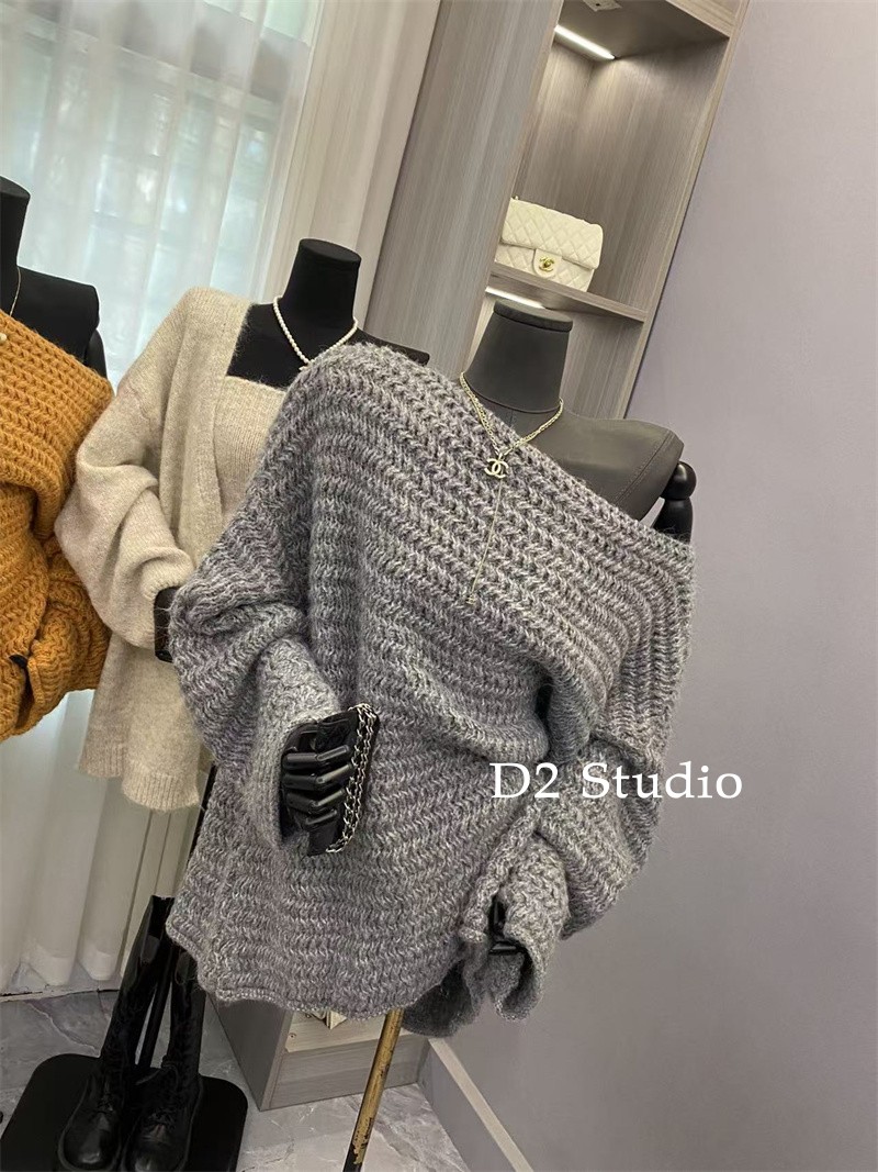 韓版慵懶風氣質斜肩長袖毛衣女秋季新款寬松顯瘦純色針織衫上衣潮