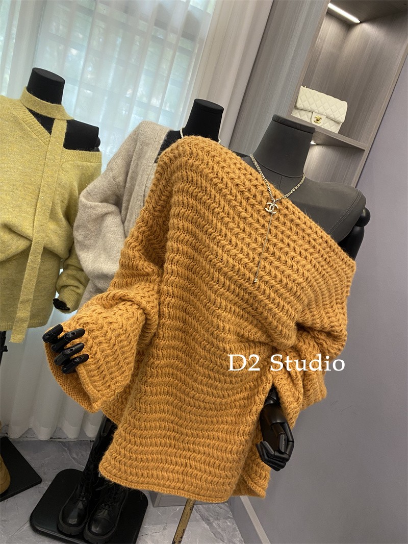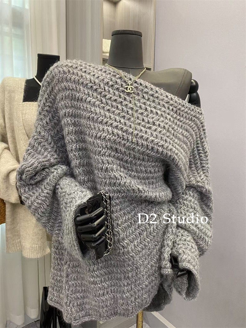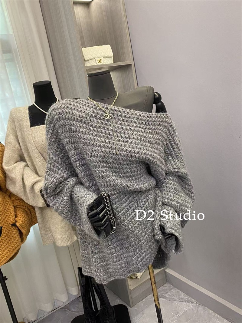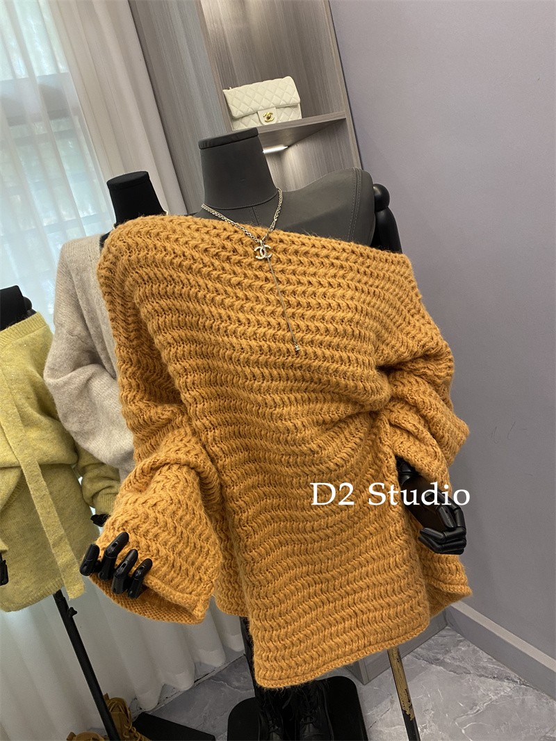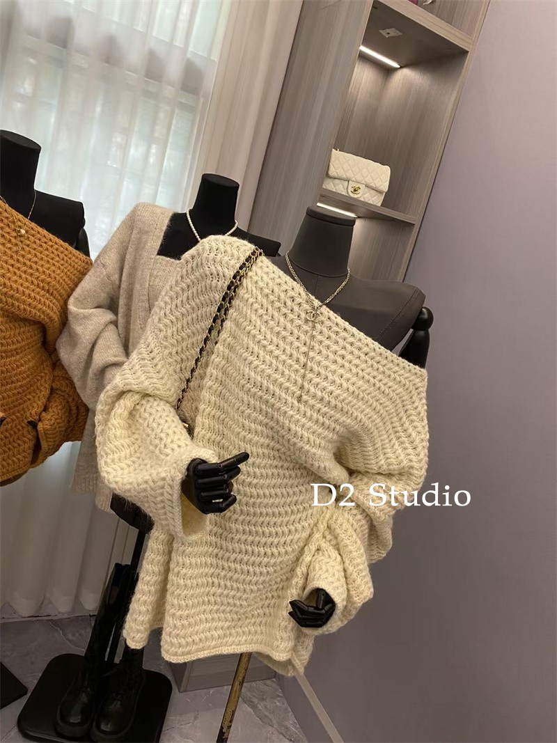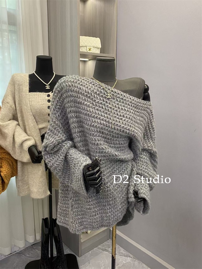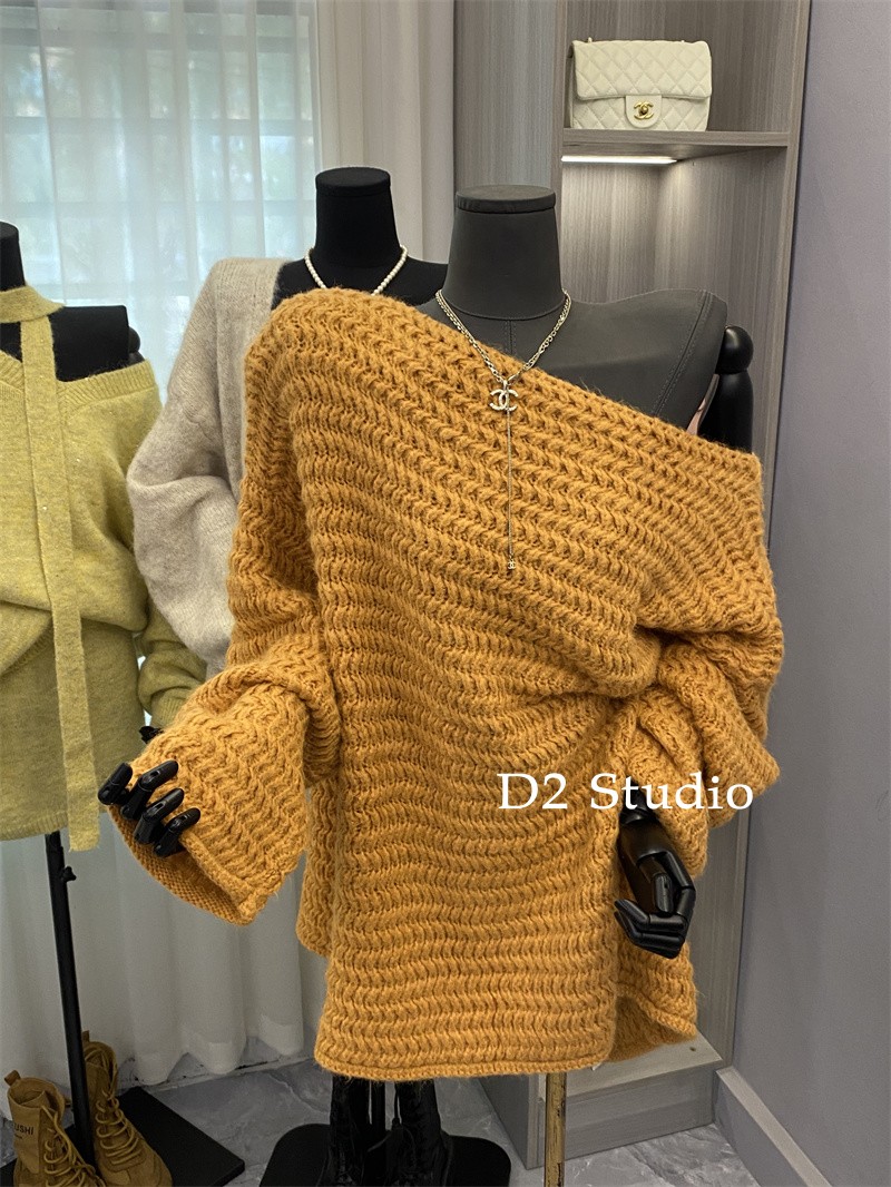 韓版慵懶風氣質斜肩長袖毛衣女秋季新款寬松顯瘦純色針織衫上衣潮