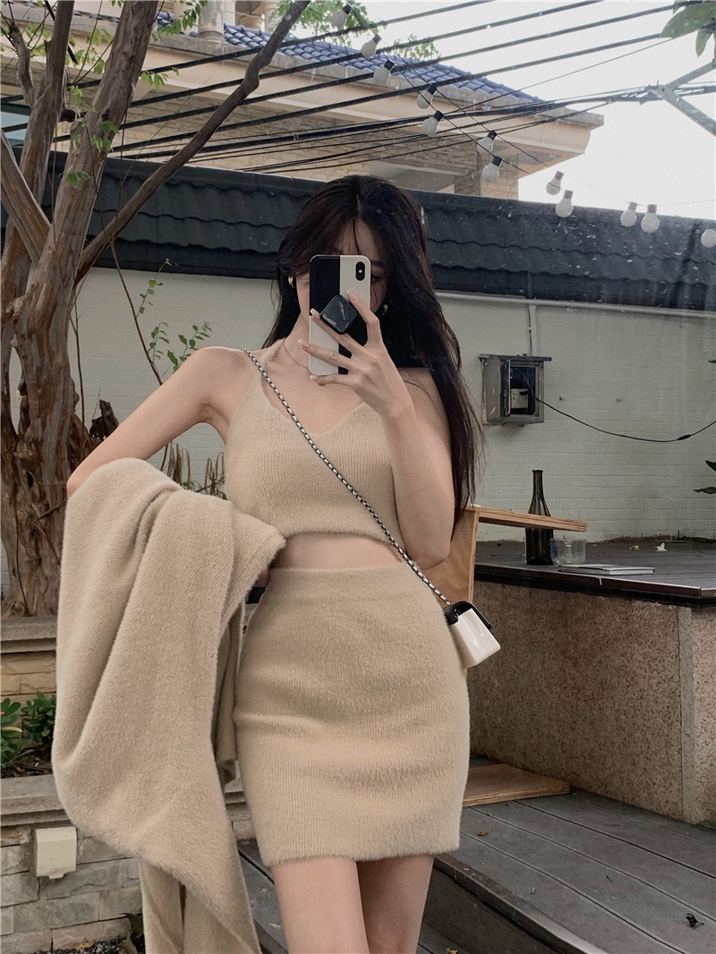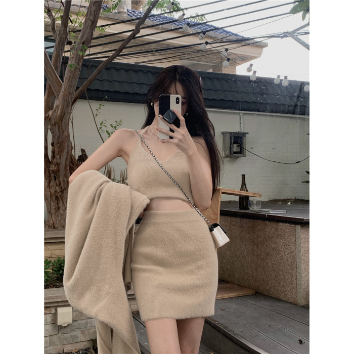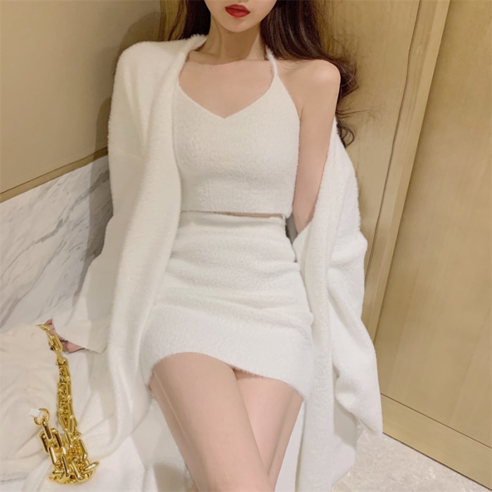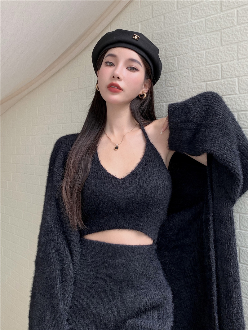 辣妹性感三件套裝吊帶上衣半身短裙冬仿水貂絨中長款開衫毛衣外套