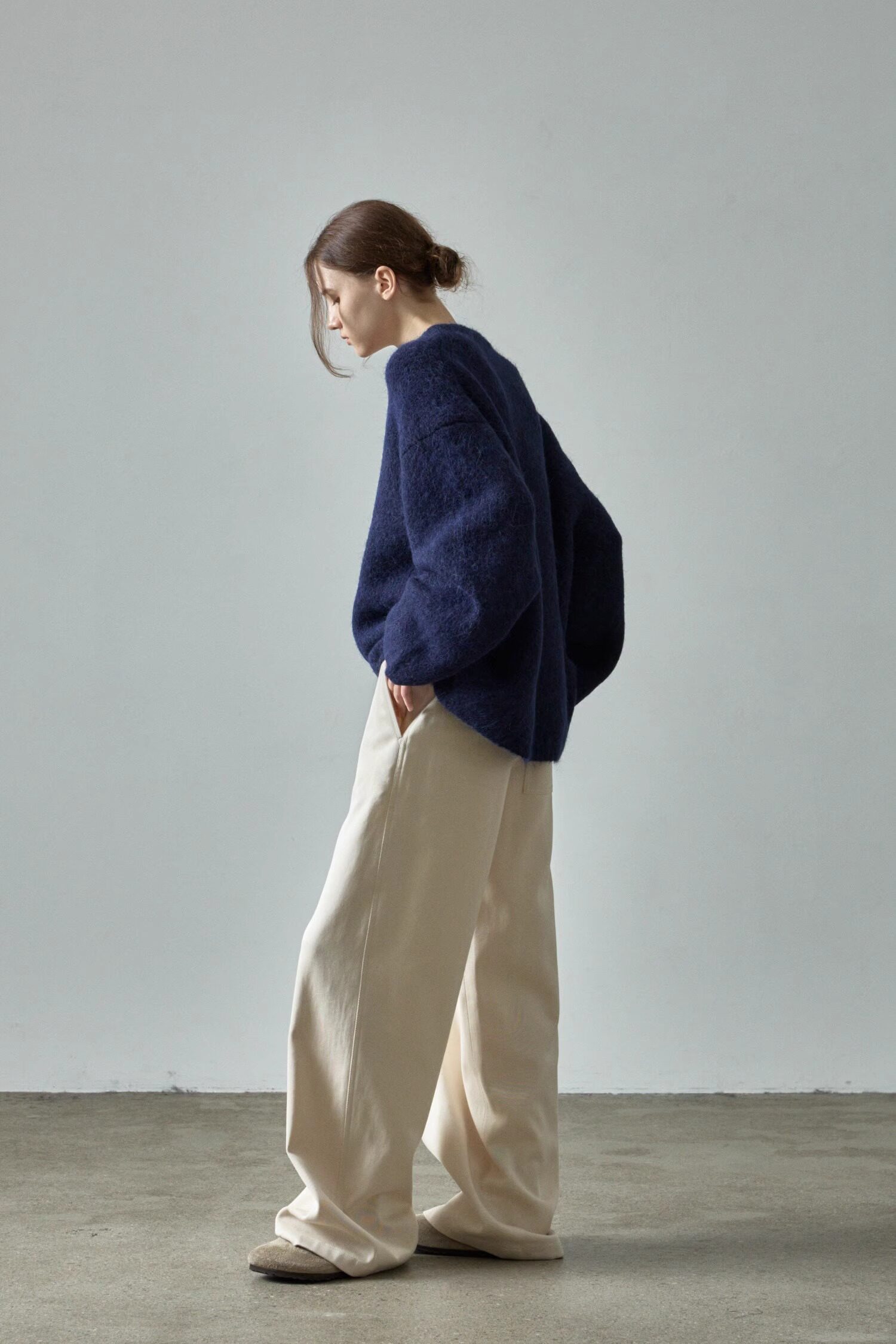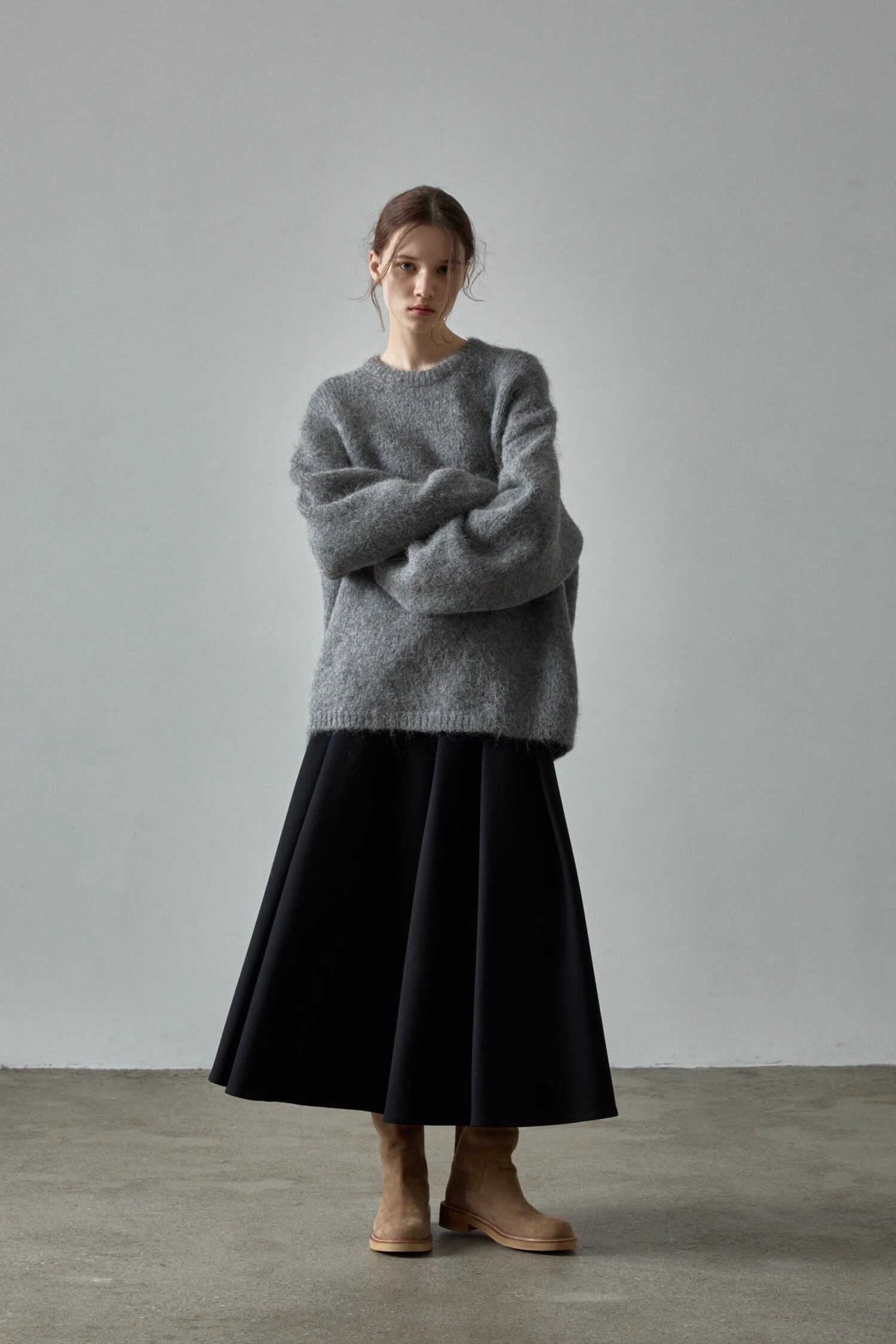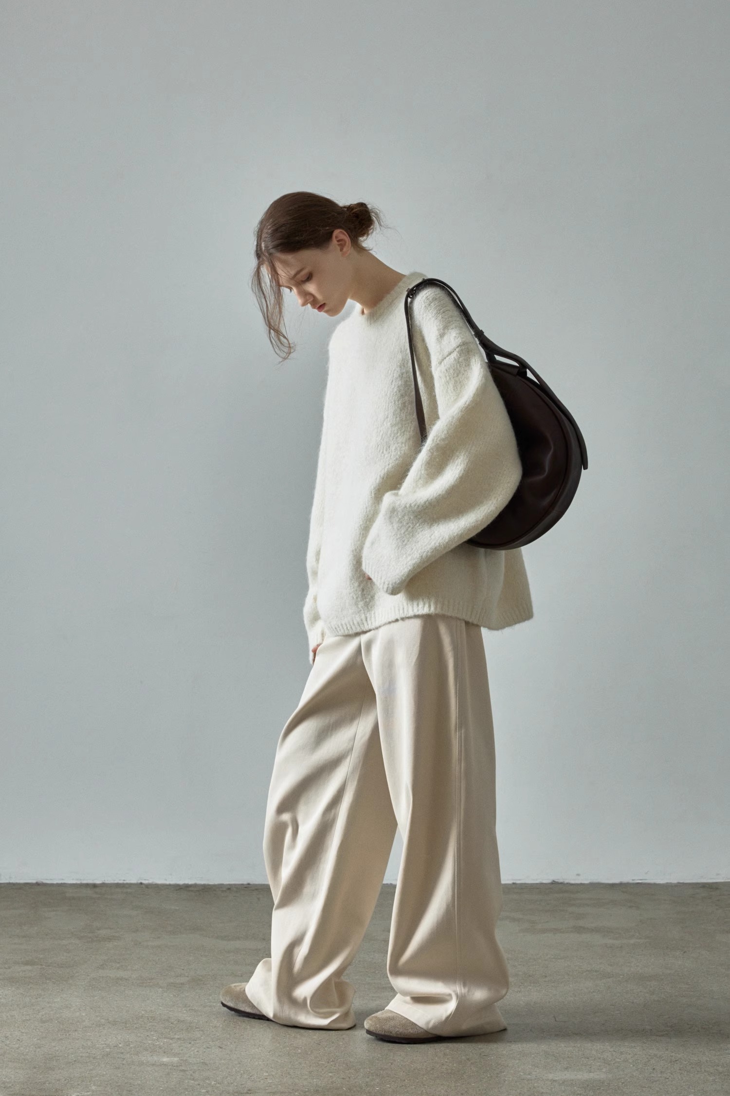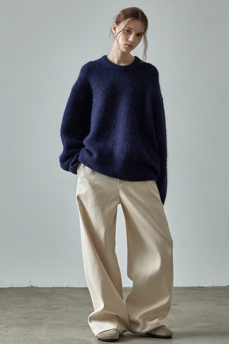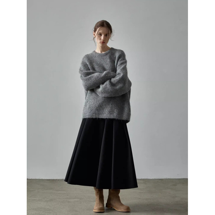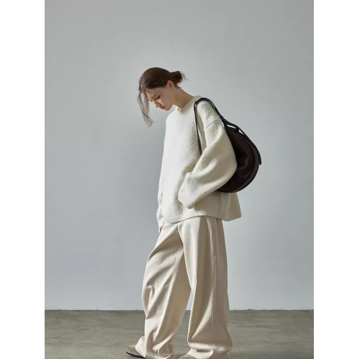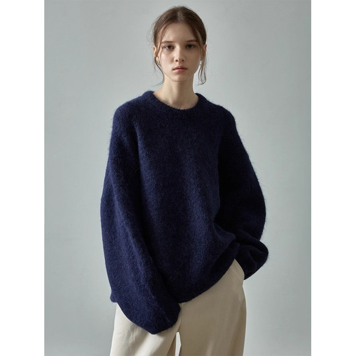 2025秋冬新款加厚仿羊駝絨圓領毛衣女落肩廓形慵懶風針織衫上衣
