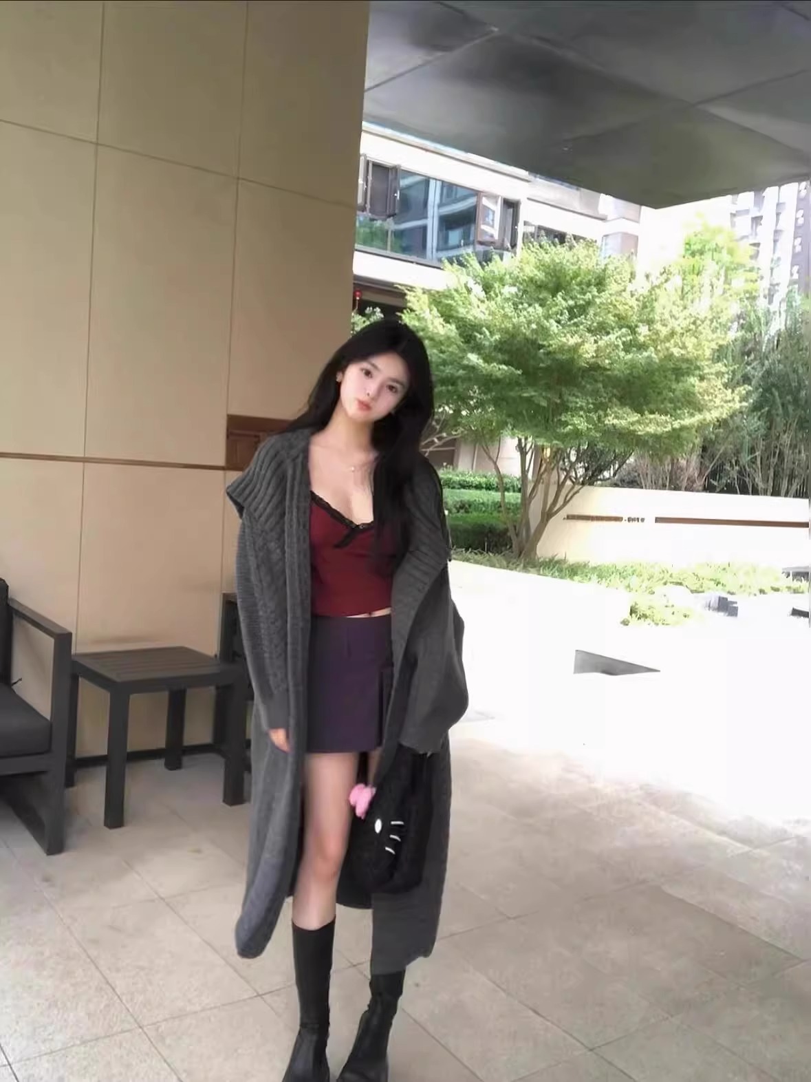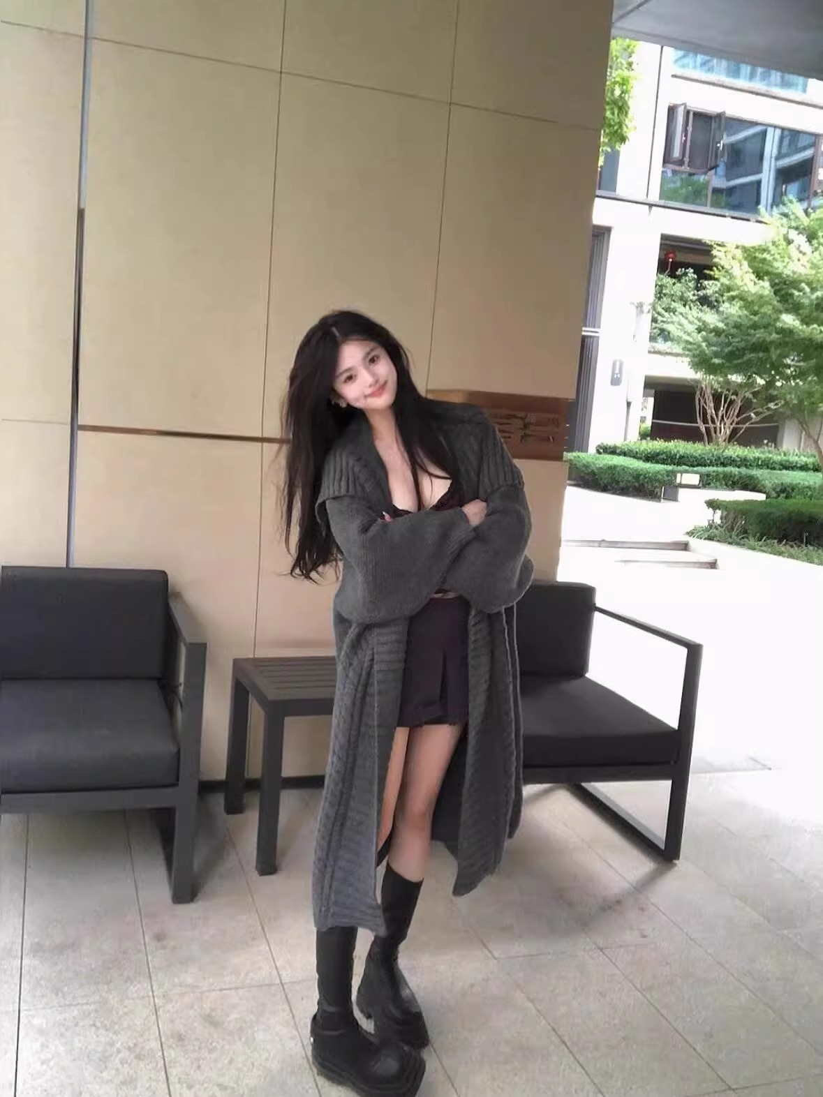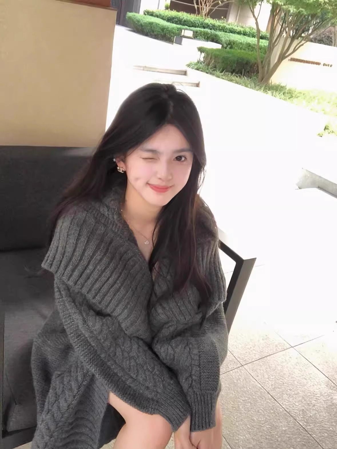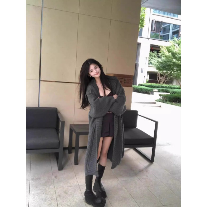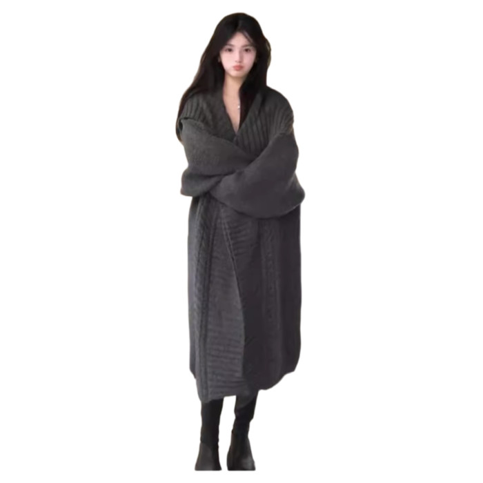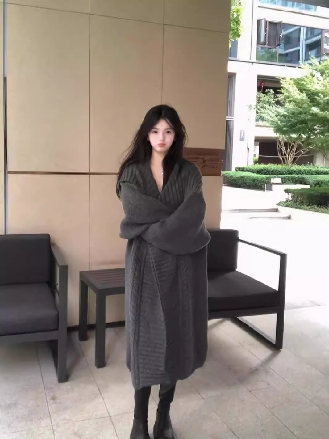 秋冬新款大翻領灰色鬭篷大衣女高級感慵懶風長款披肩毛衣開衫外套
