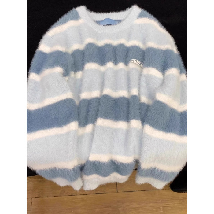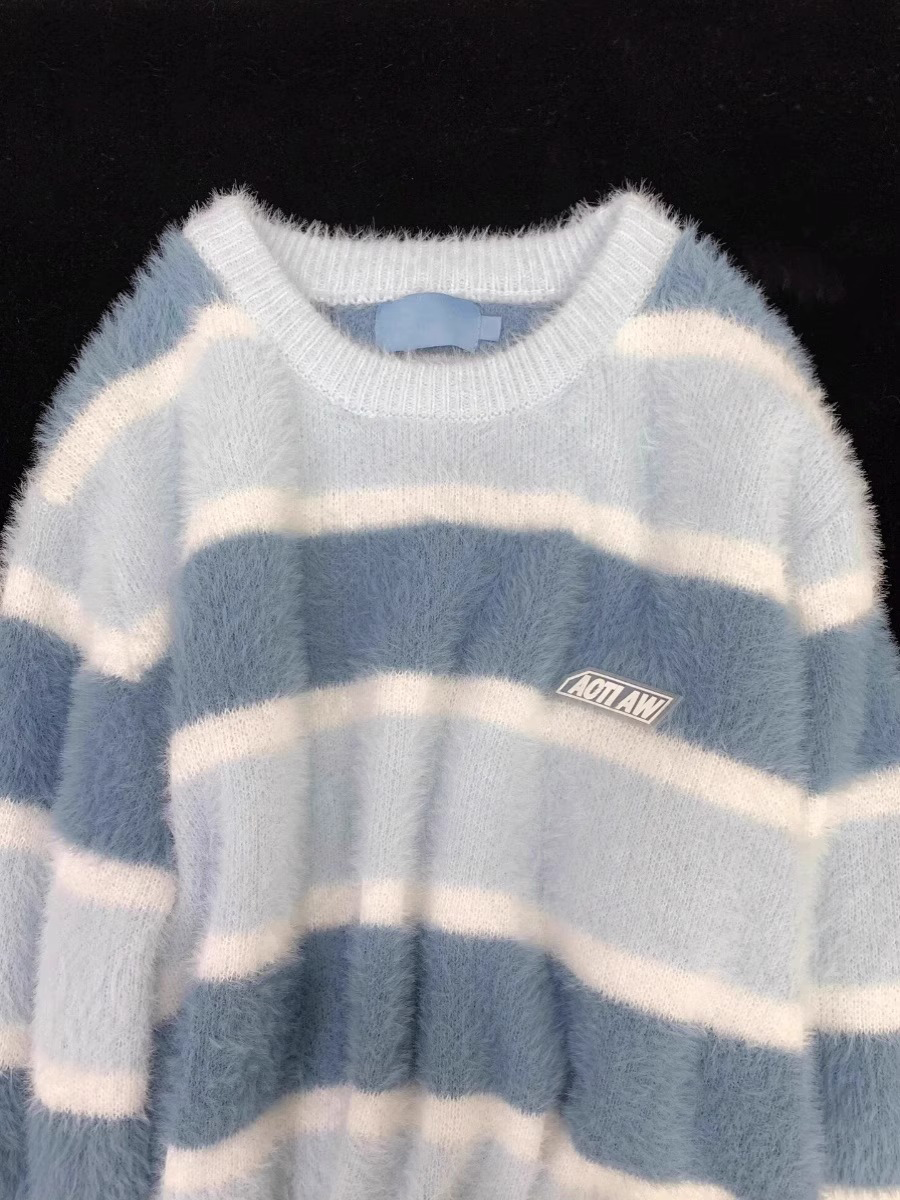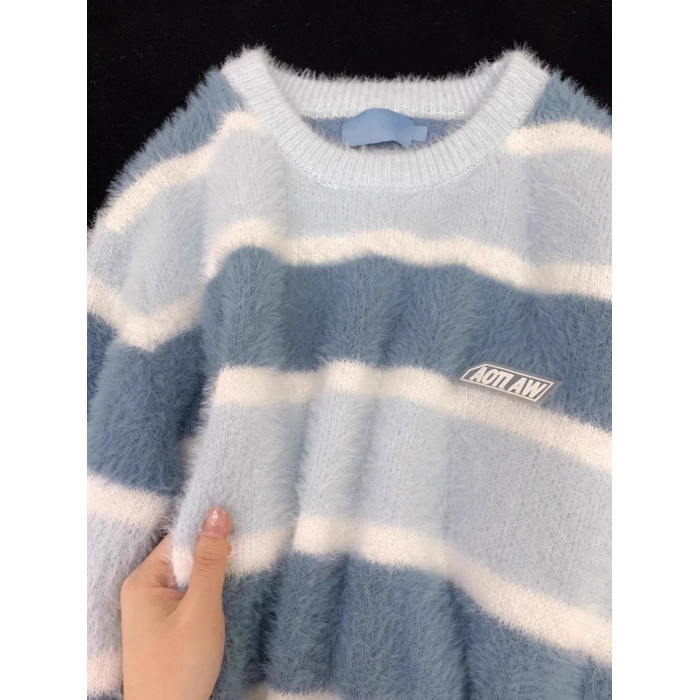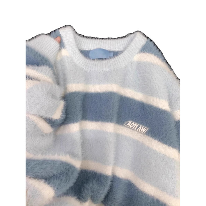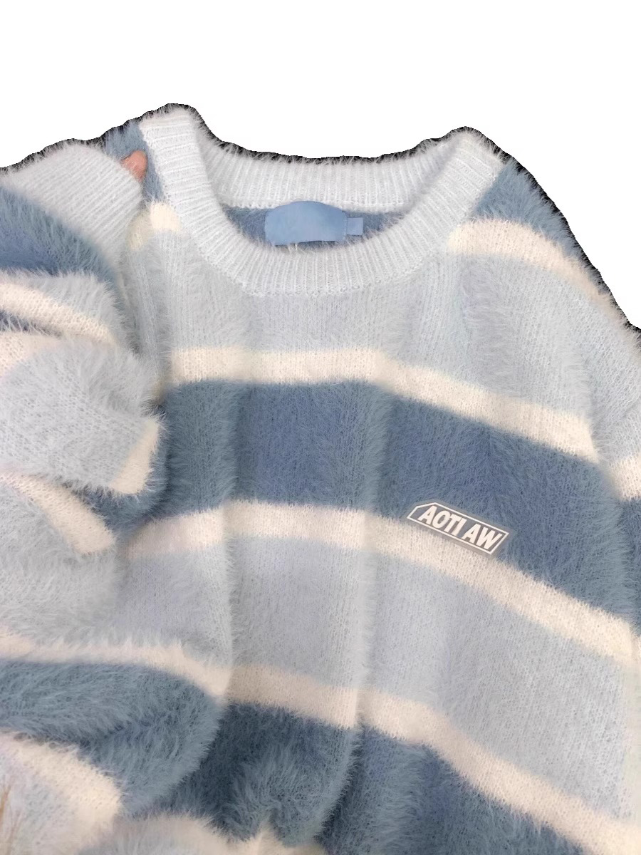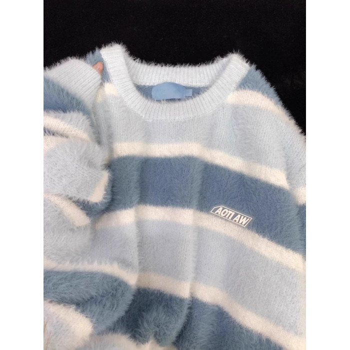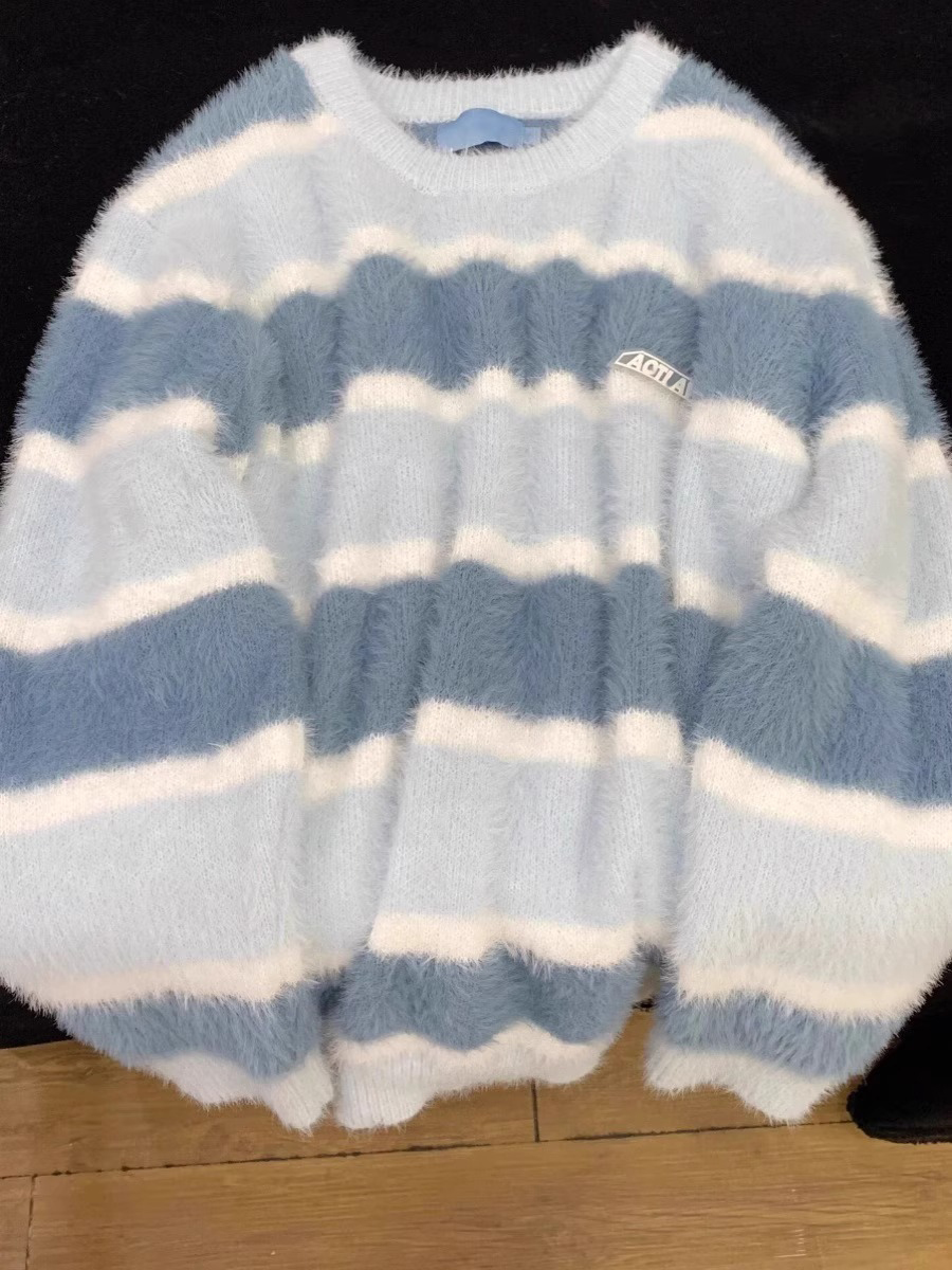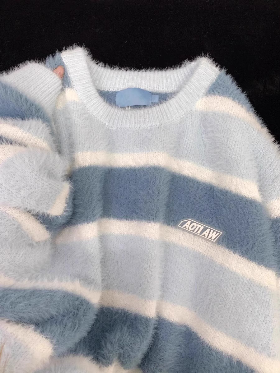 日系奶fufu藍色軟糯條紋馬海毛衣女秋冬寬松慵懶學院風針織衫上衣