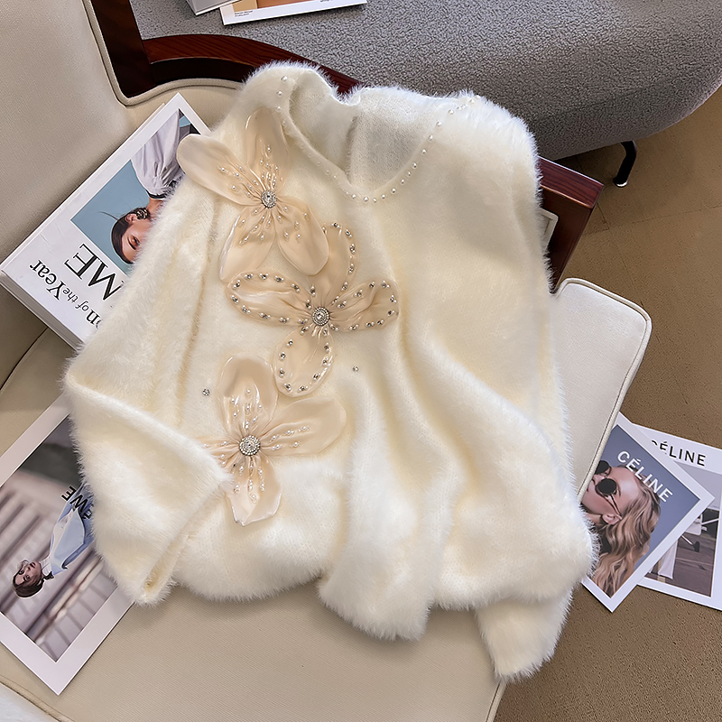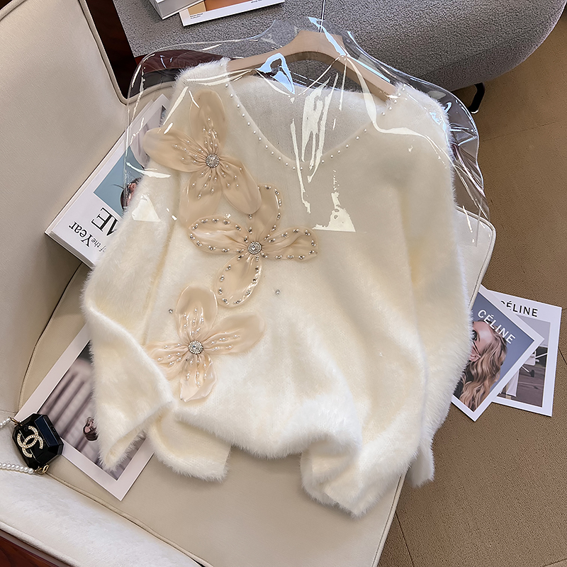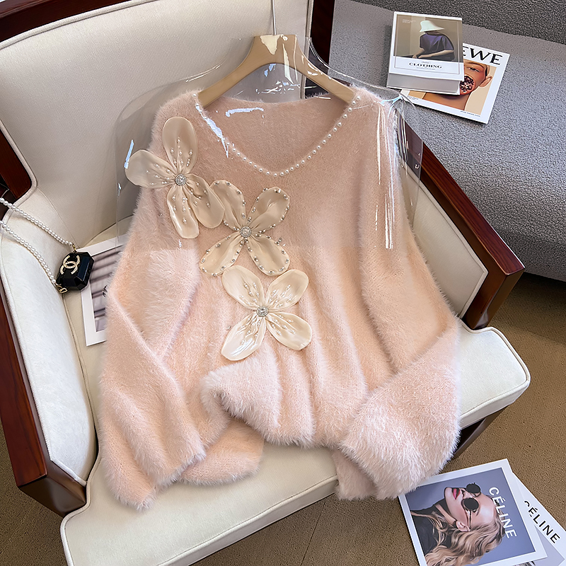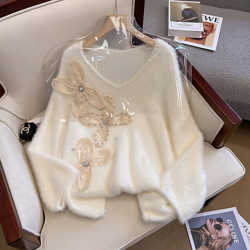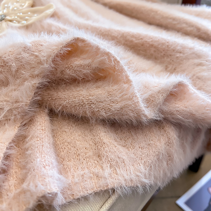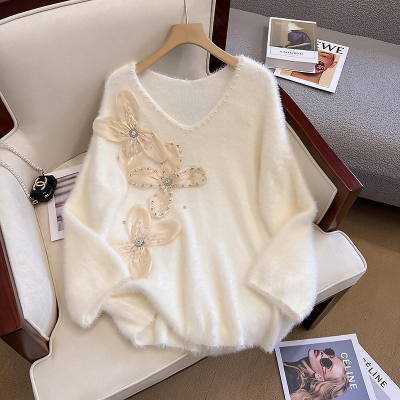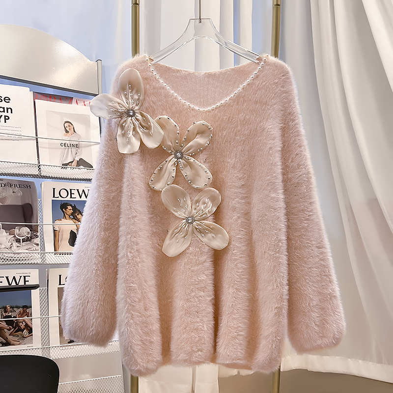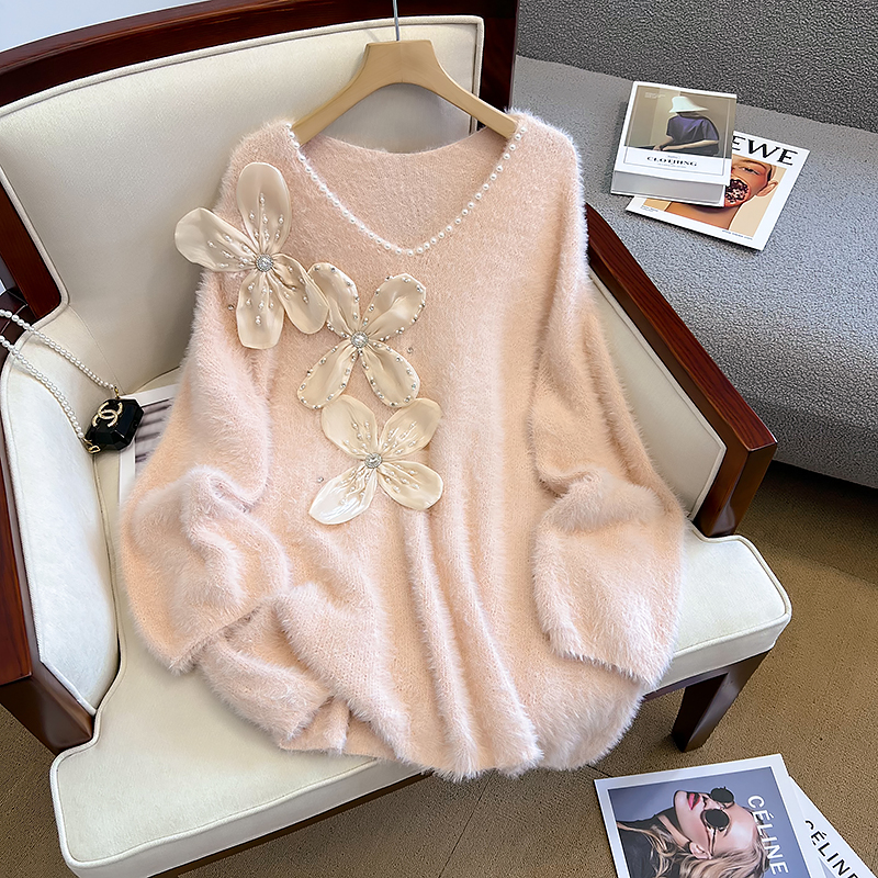 大碼女秋冬季新款高級感水貂絨v領毛衣胖mm顯瘦加厚打底內搭上衣