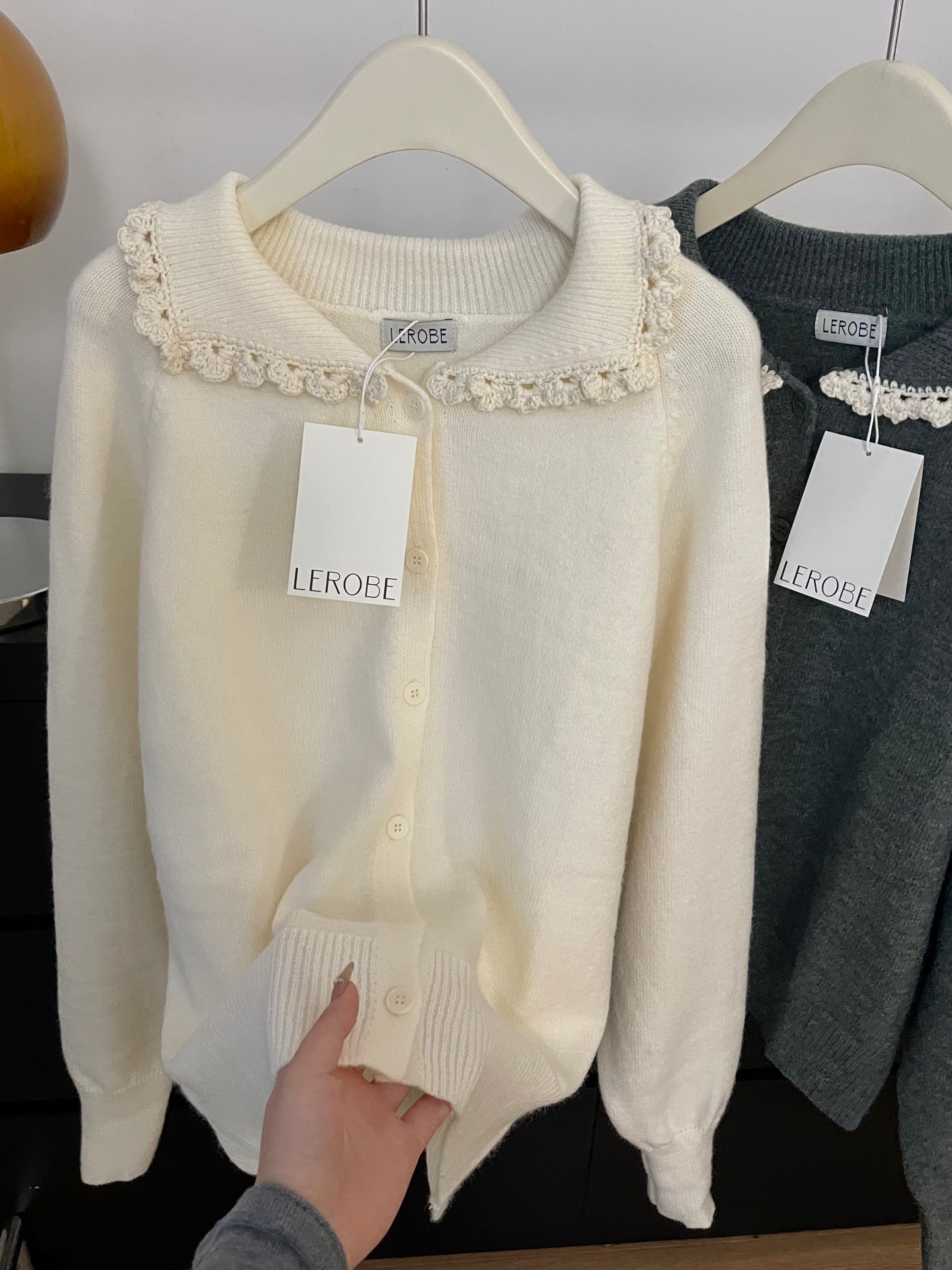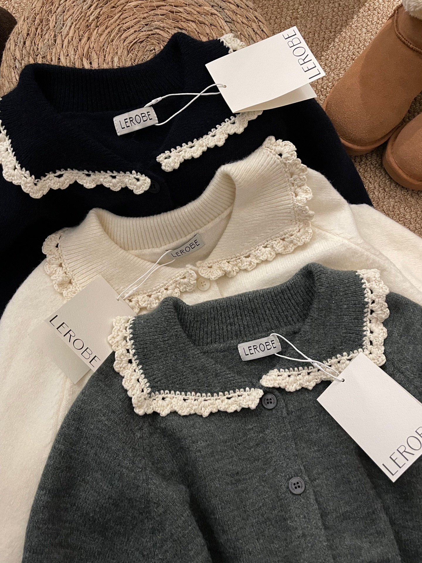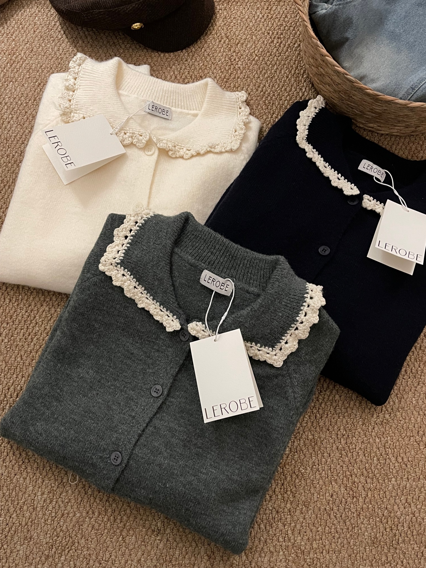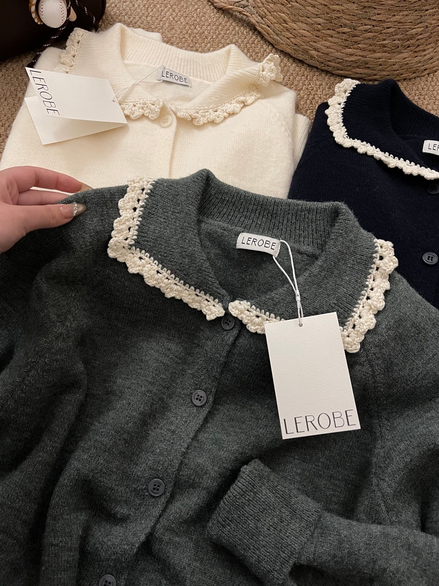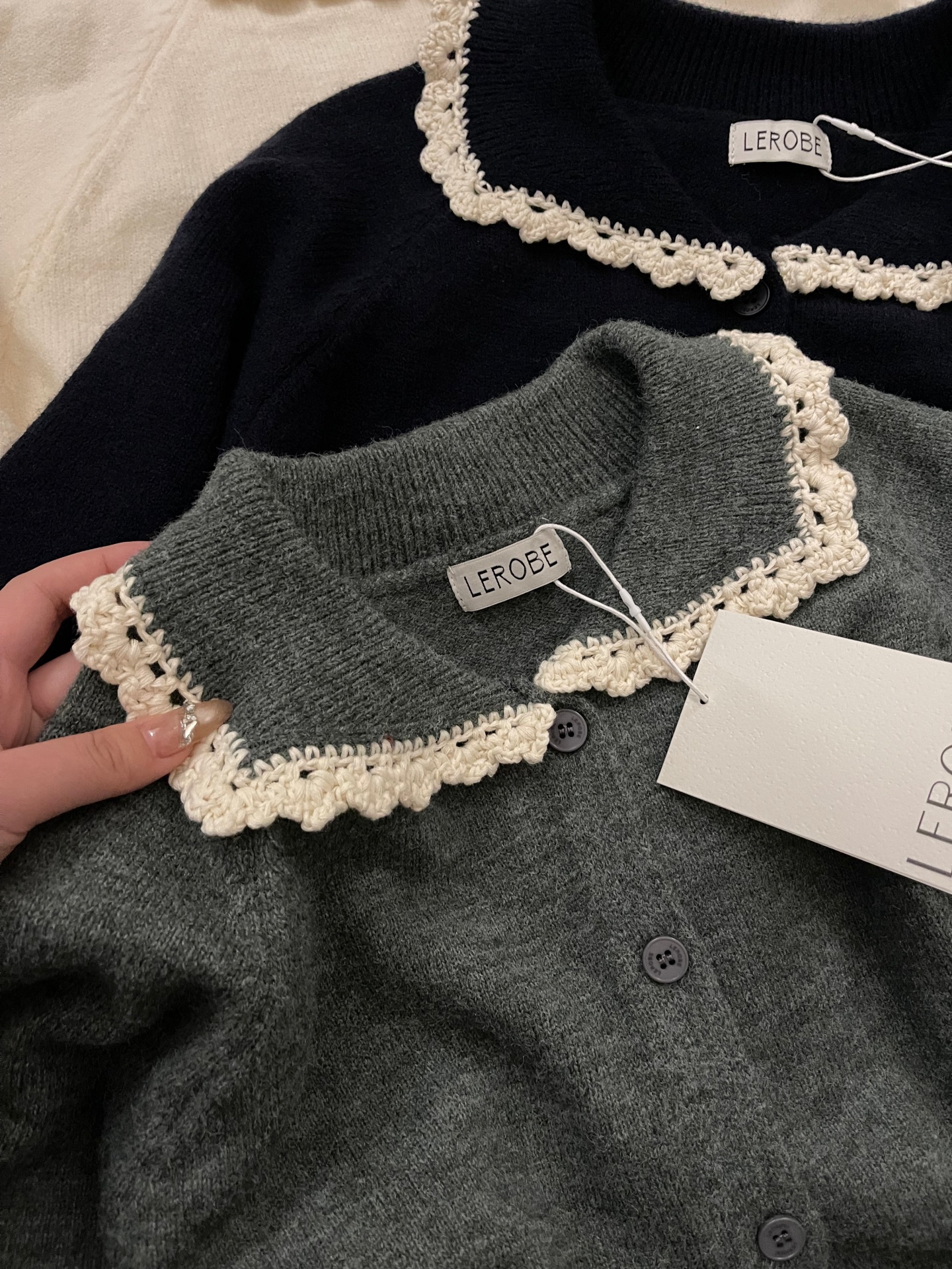 10%羊毛 韓代@lero*e 手工鉤花甜美花邊翻領軟糯針織毛衣開衫外套
