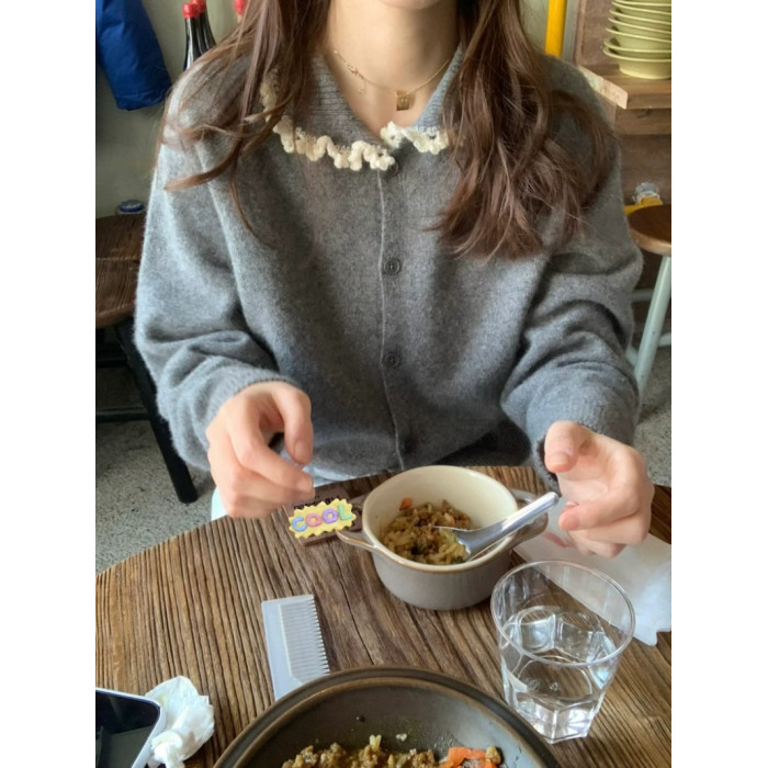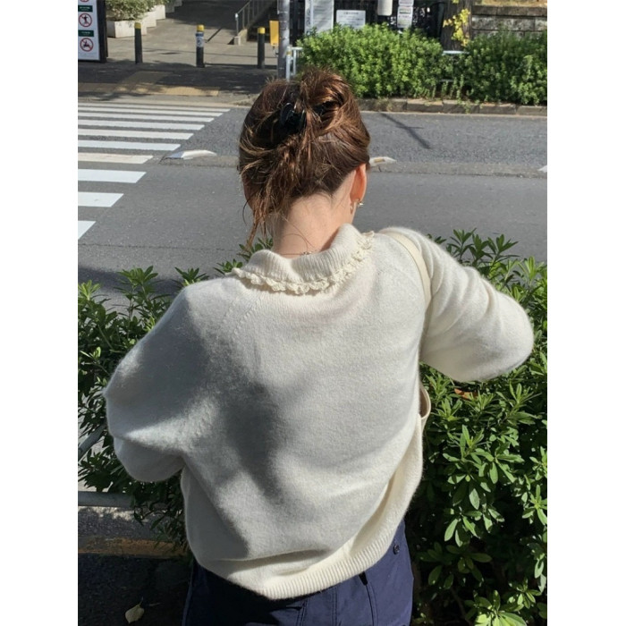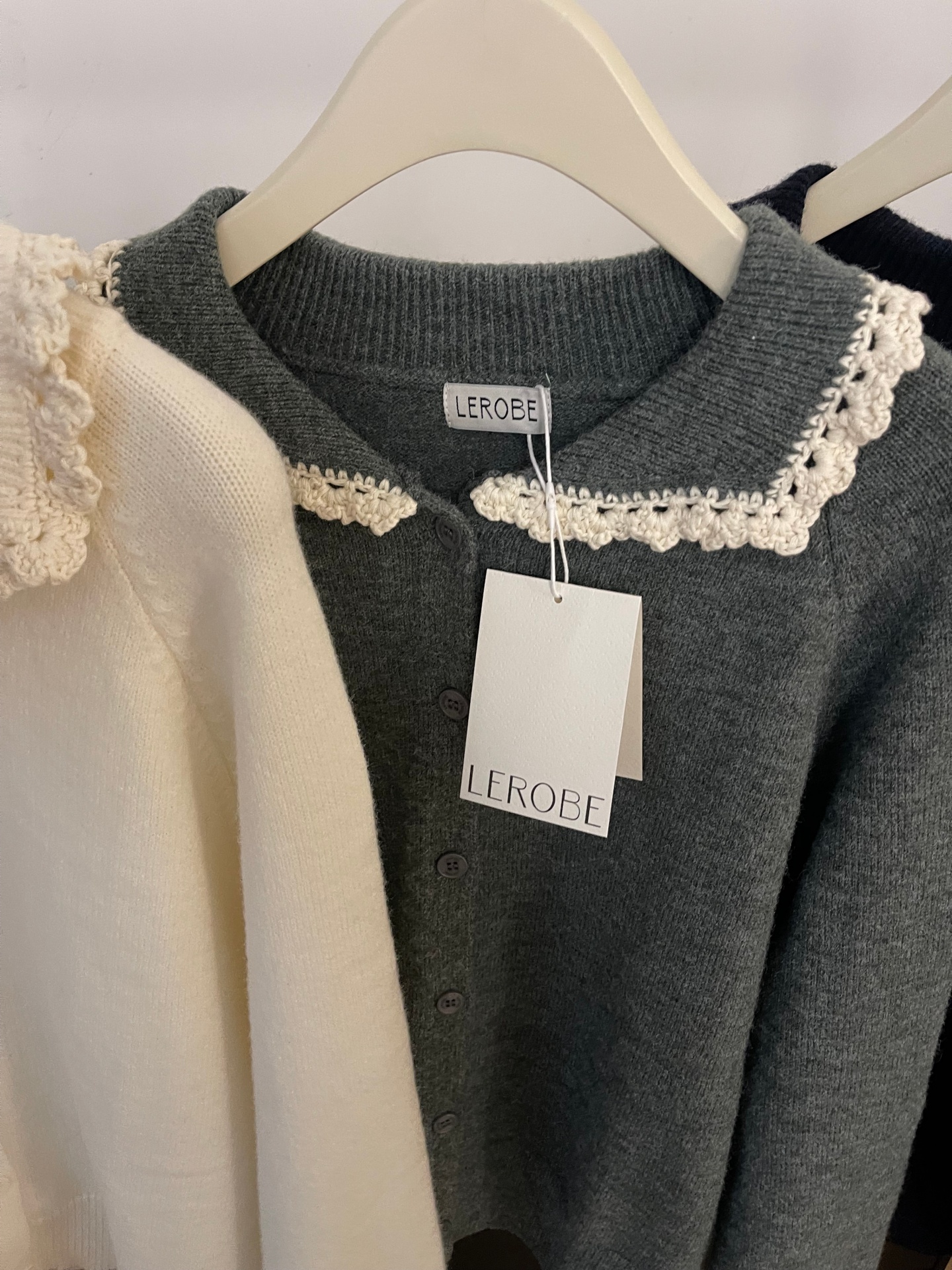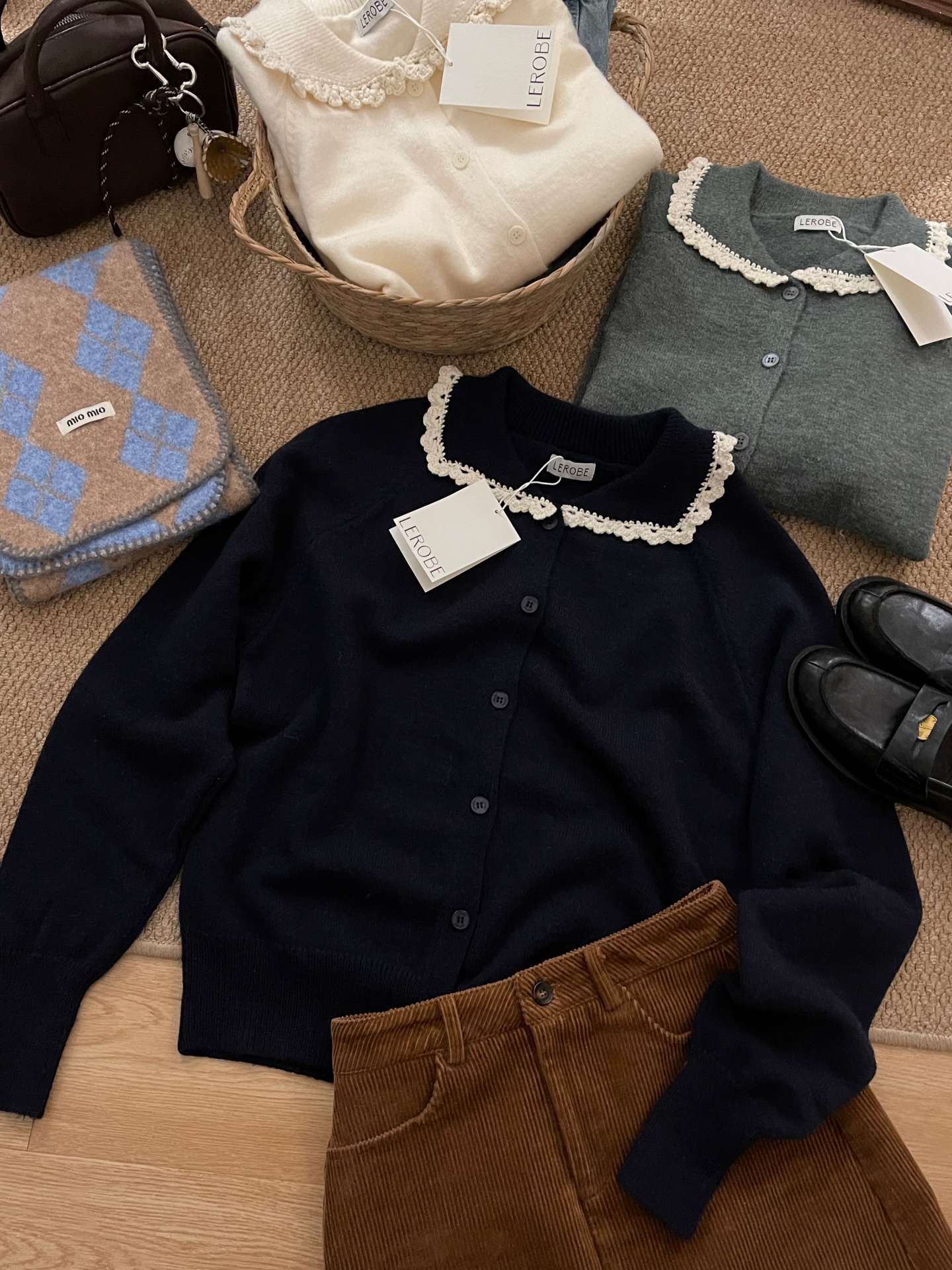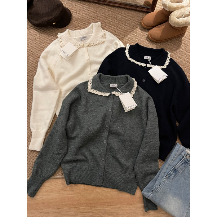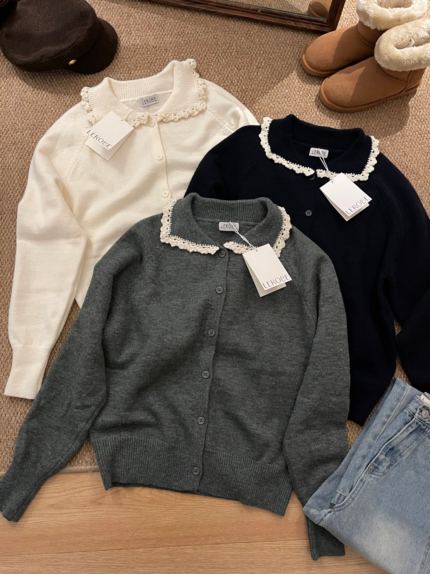 10%羊毛 韓代@lero*e 手工鉤花甜美花邊翻領軟糯針織毛衣開衫外套