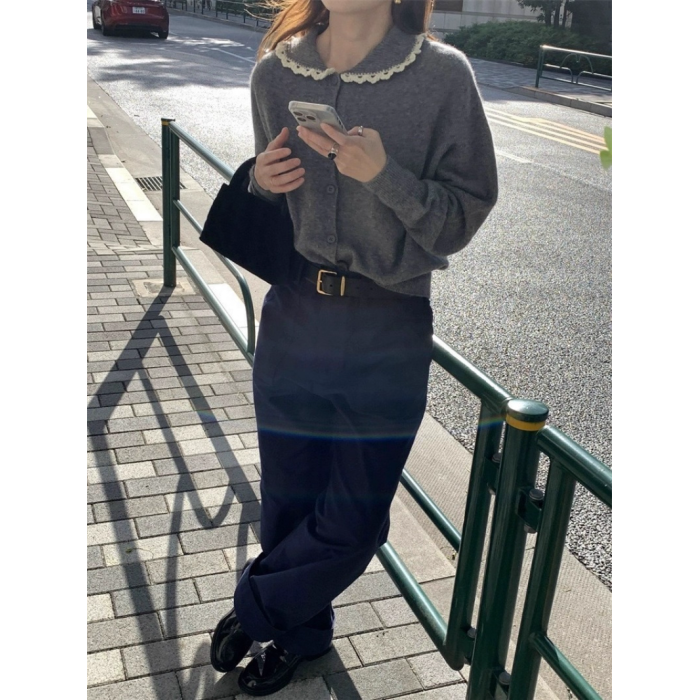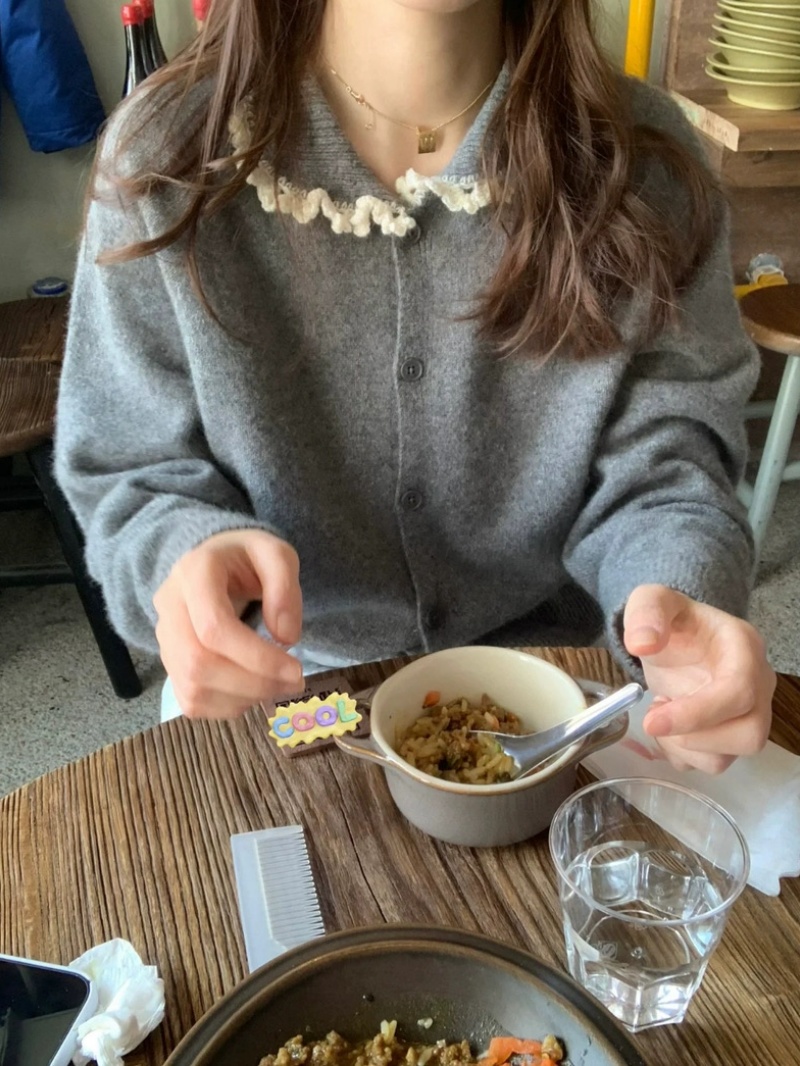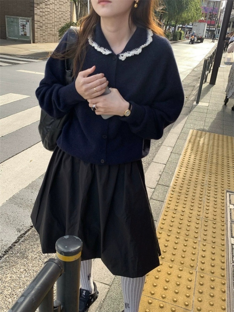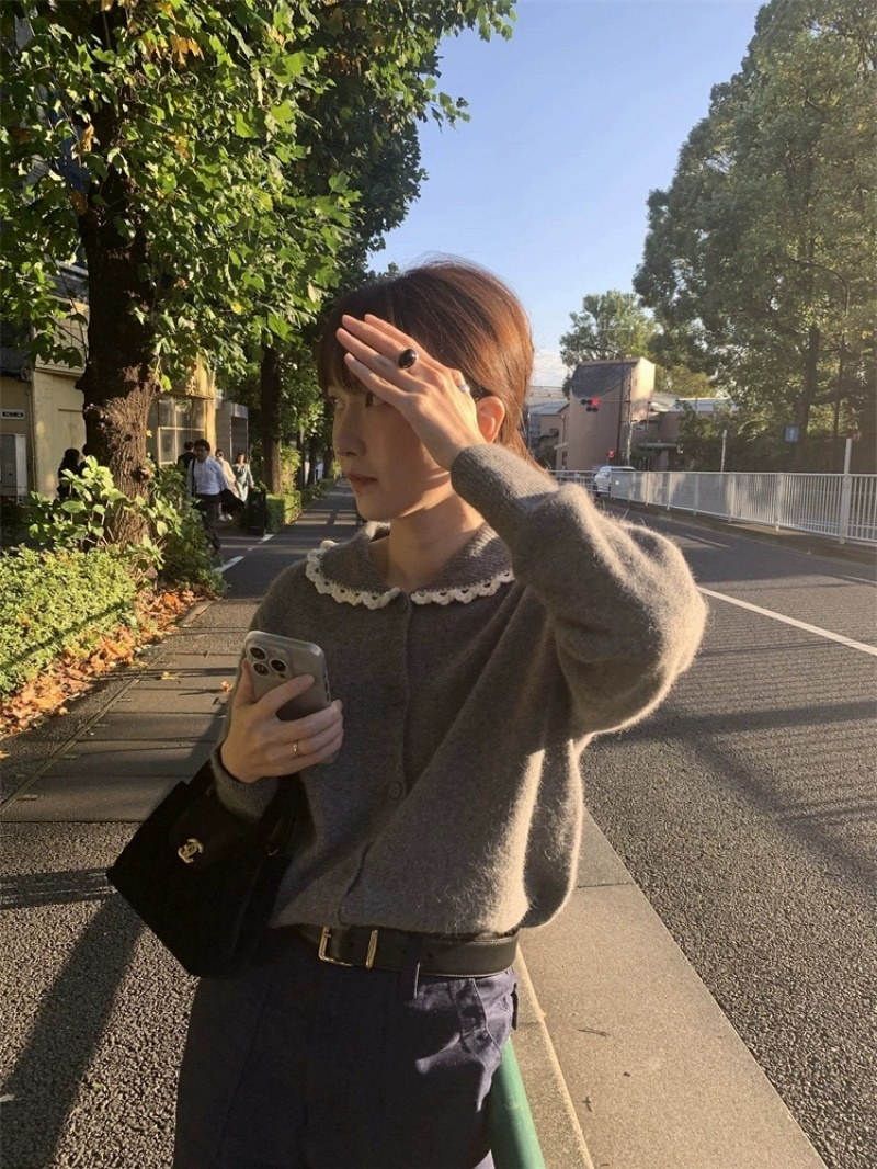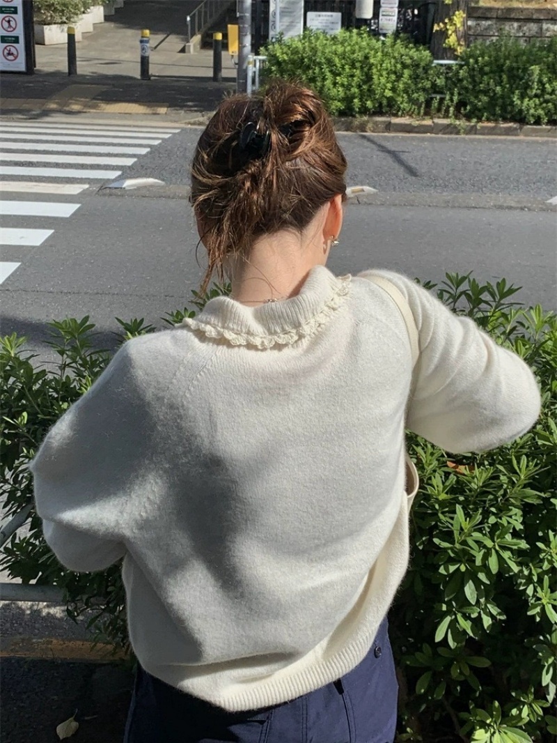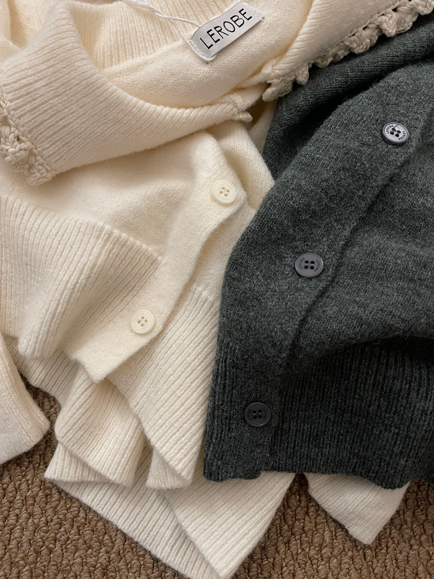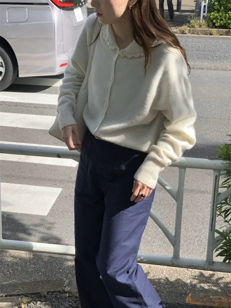 10%羊毛 韓代@lero*e 手工鉤花甜美花邊翻領軟糯針織毛衣開衫外套