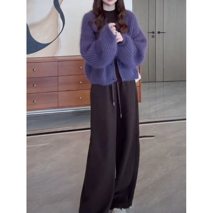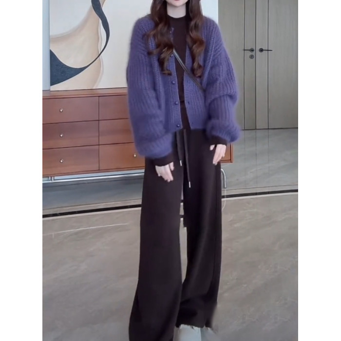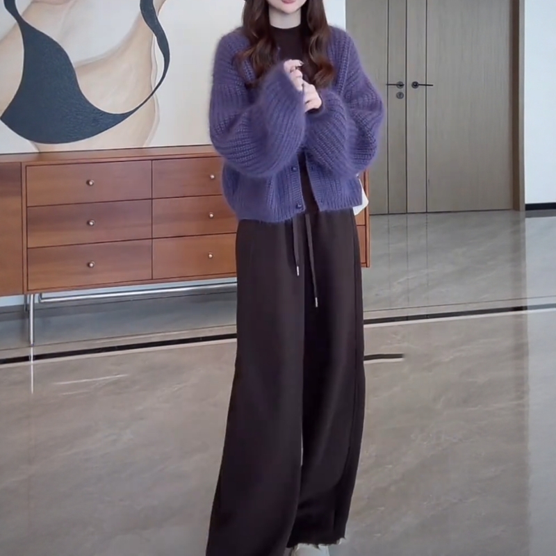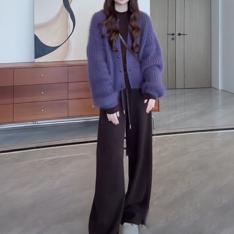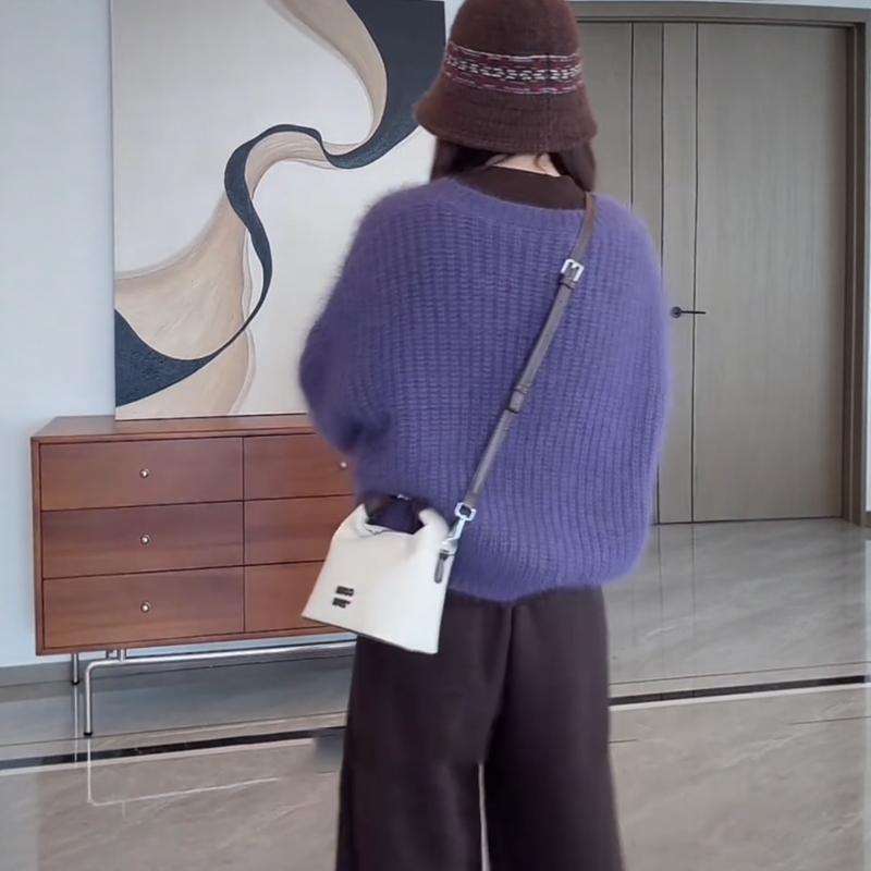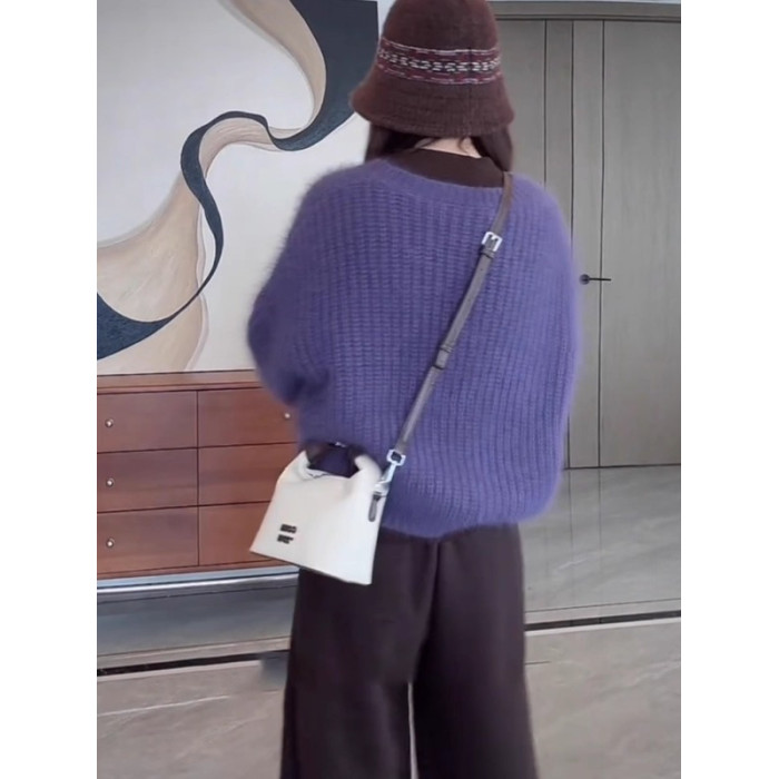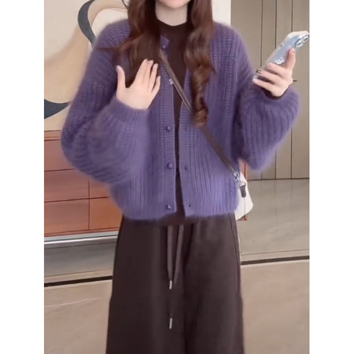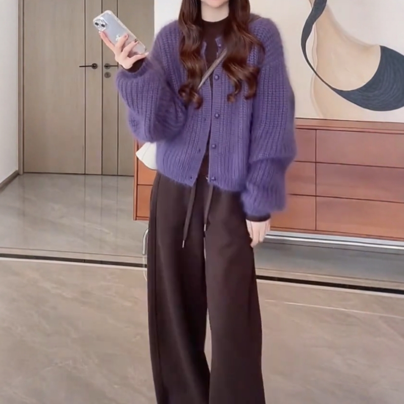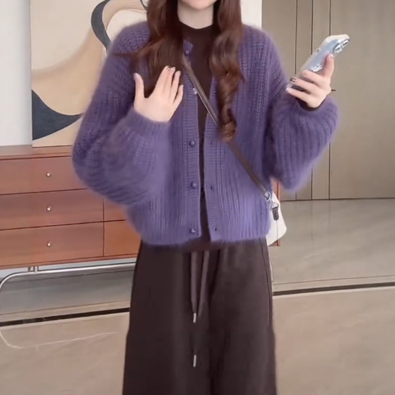 紫色軟糯毛衣外套女秋季大碼胖MM慵懶風寬松針織開衫獨特漂亮上衣