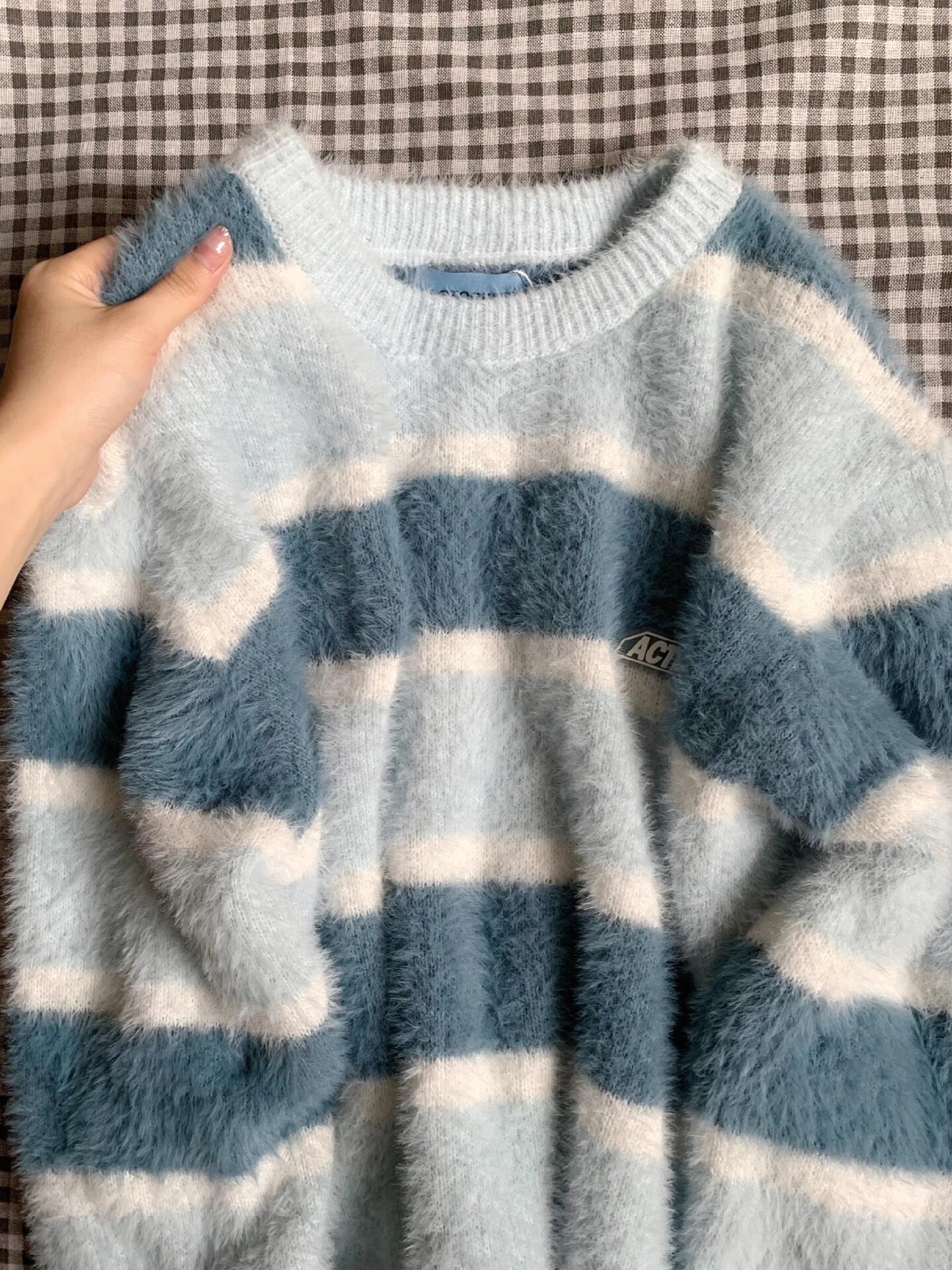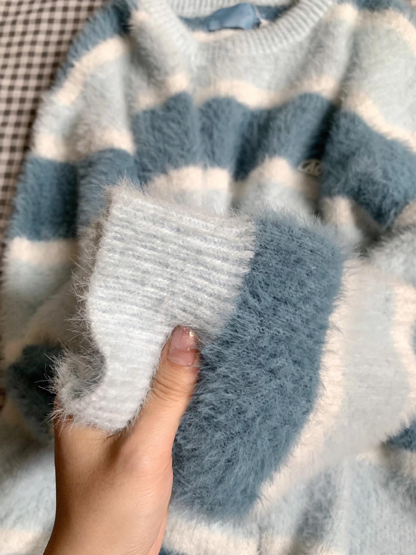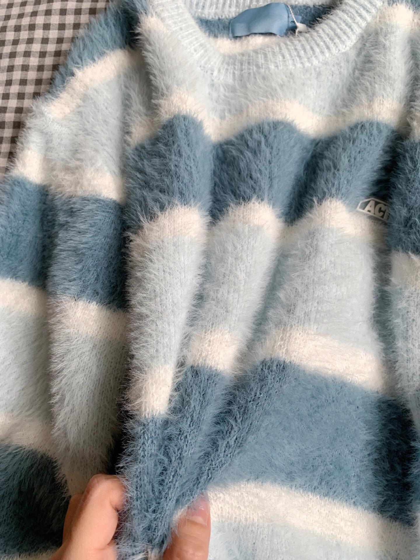 日系學院風撞色條紋馬海毛毛衣女溫柔風小衆軟糯系減齡針織衫上衣