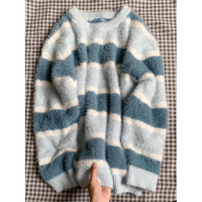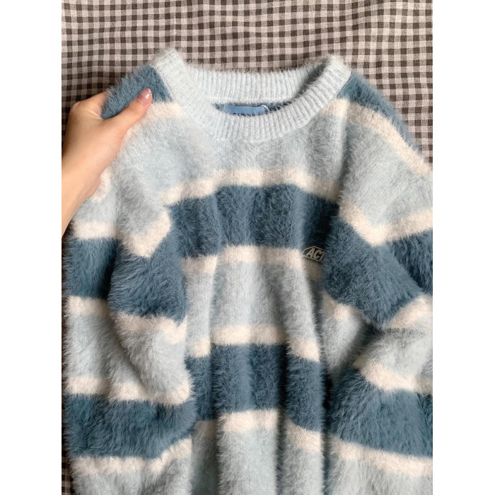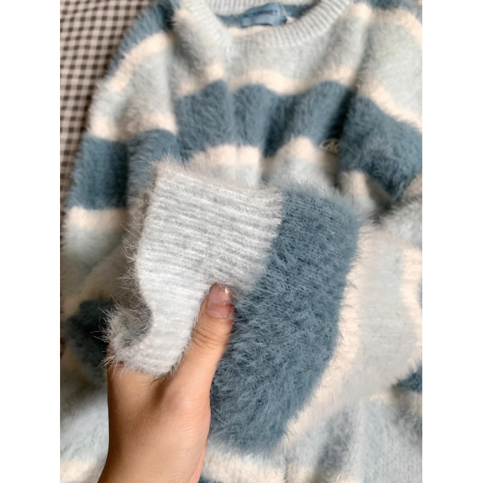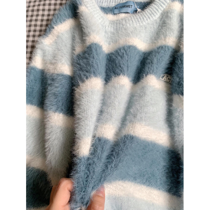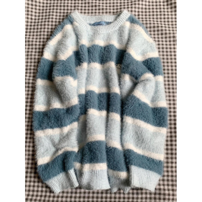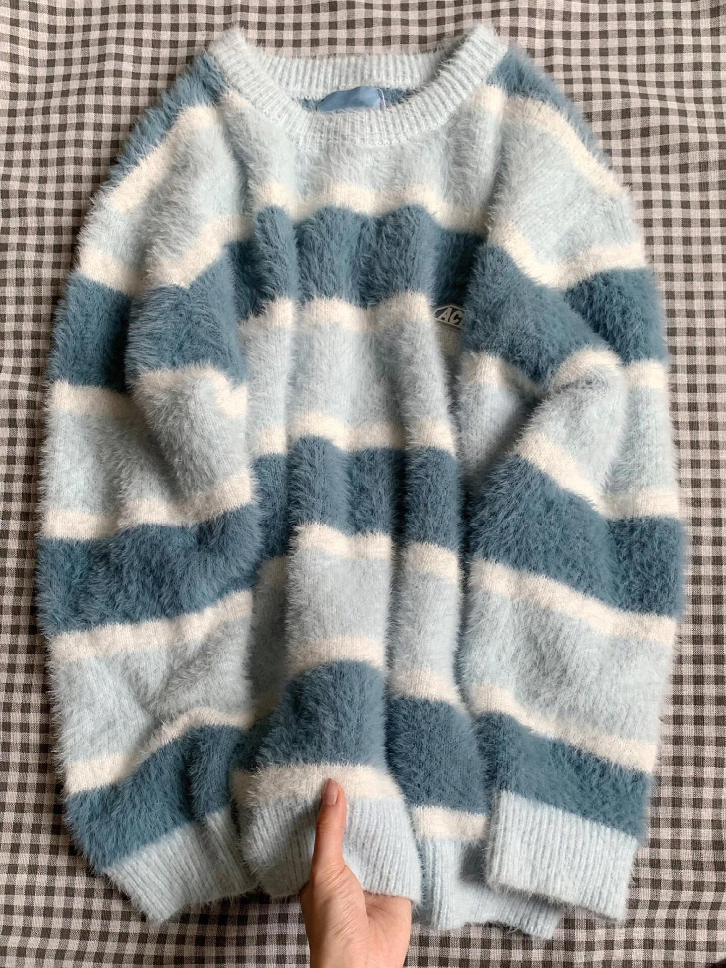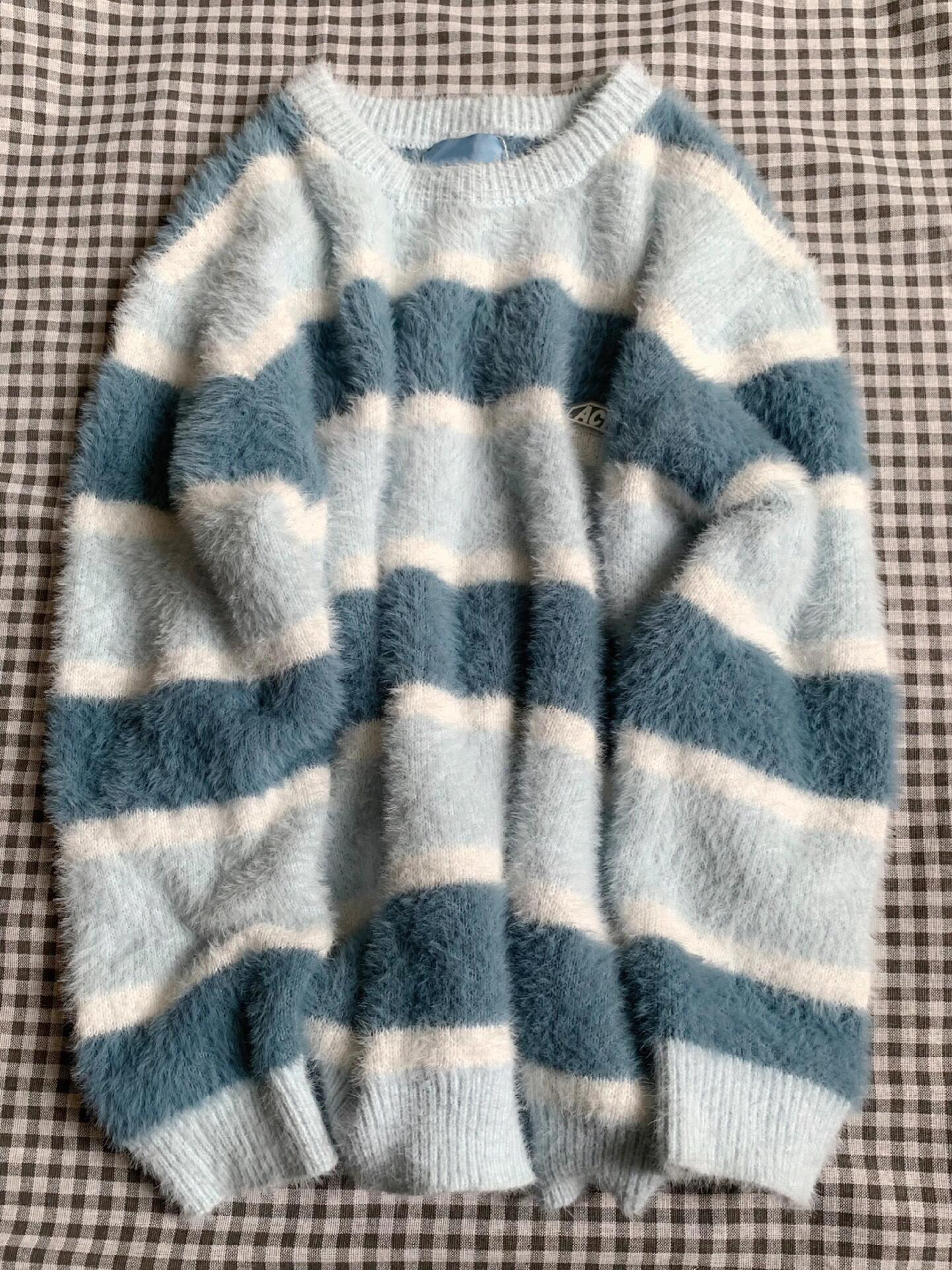 日系學院風撞色條紋馬海毛毛衣女溫柔風小衆軟糯系減齡針織衫上衣