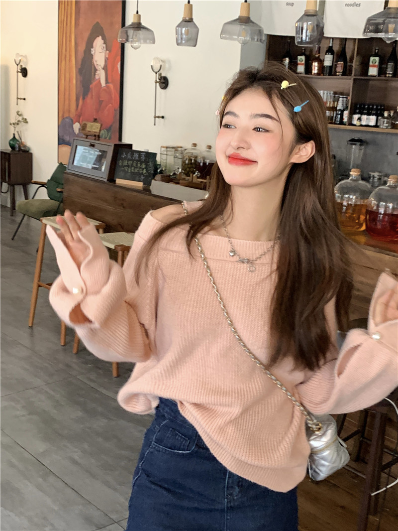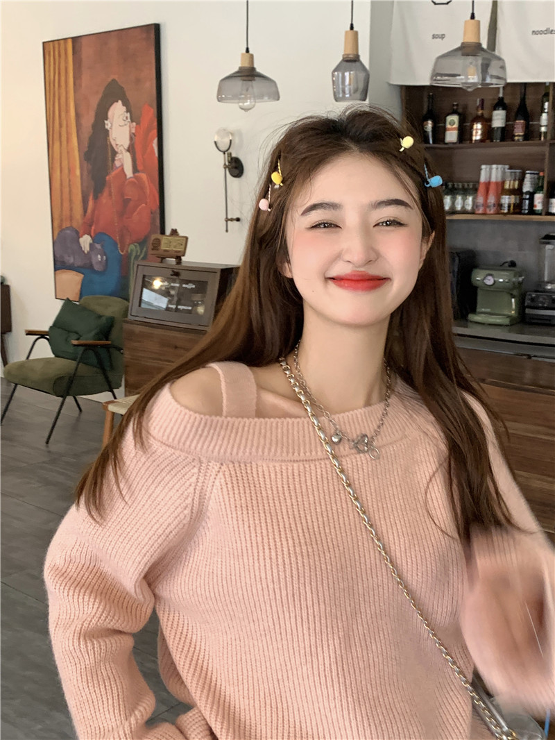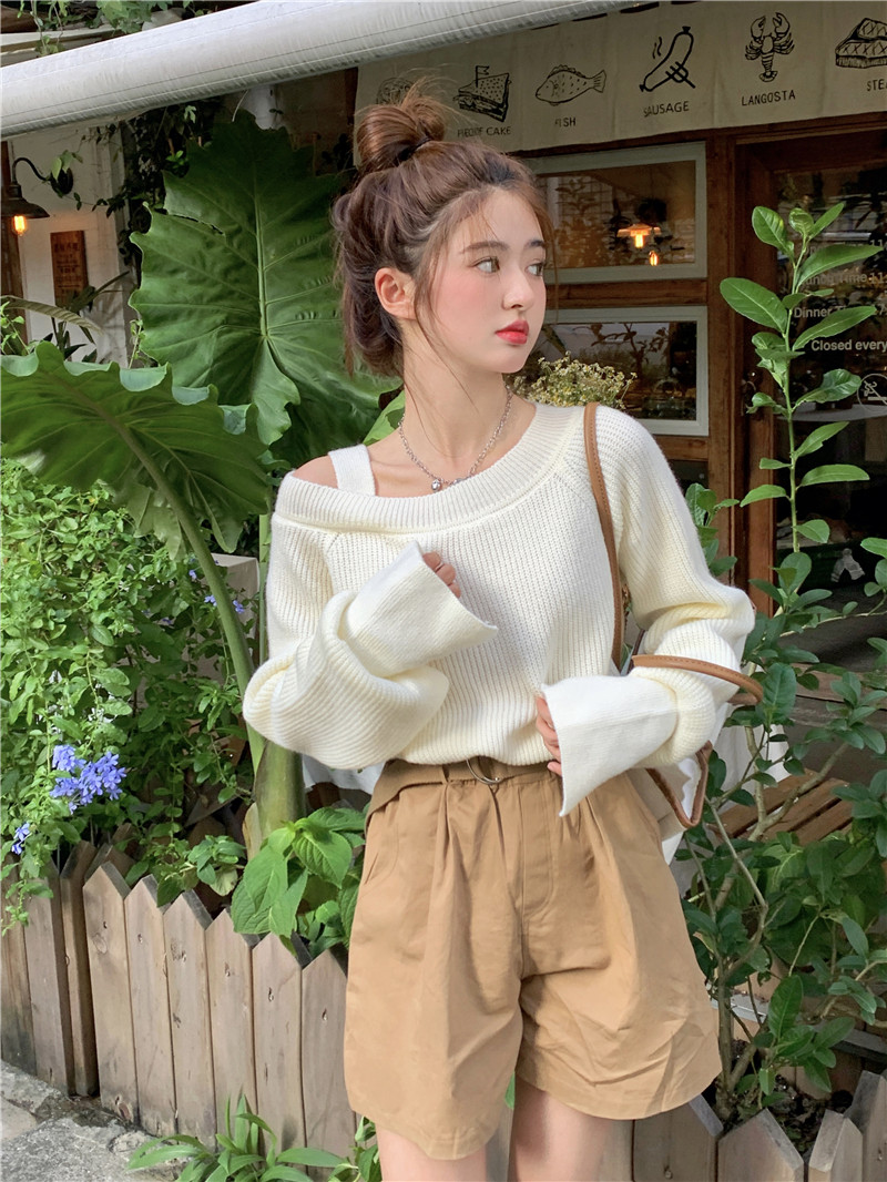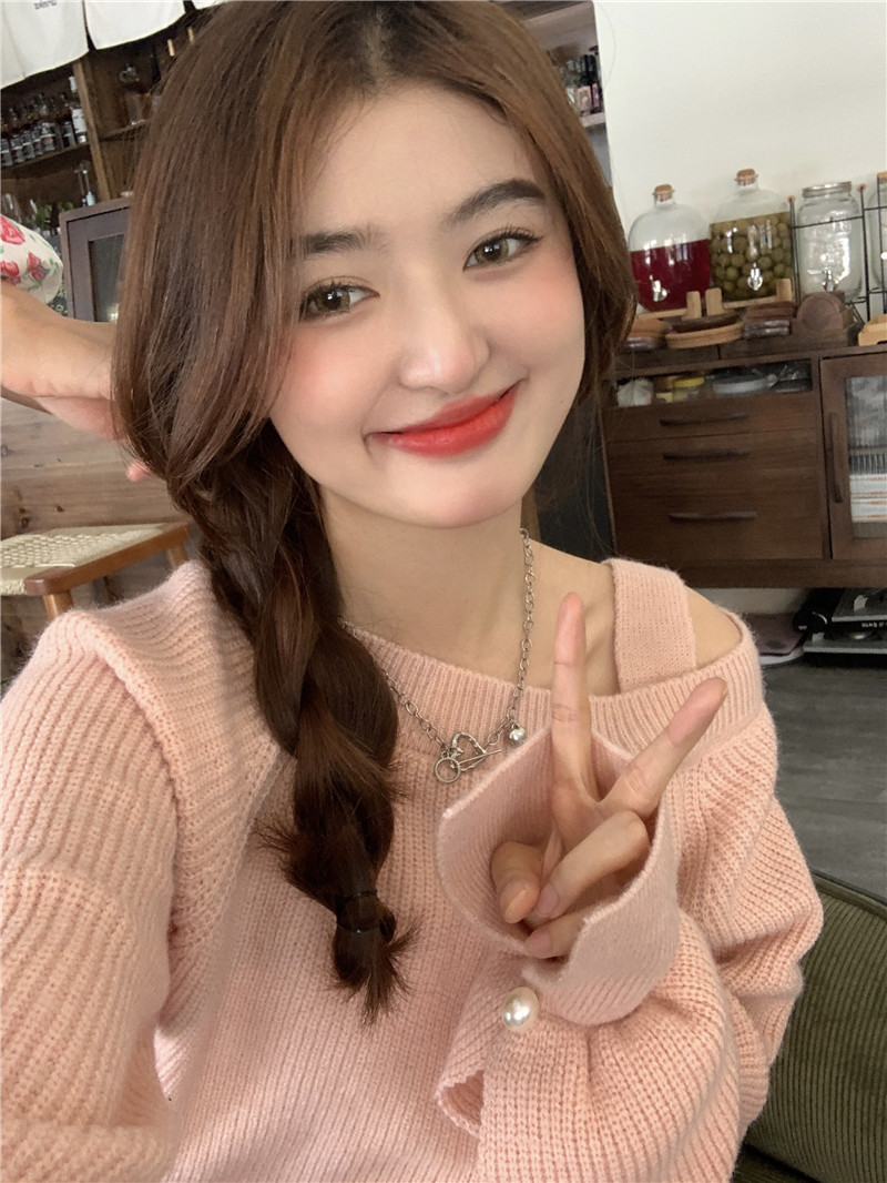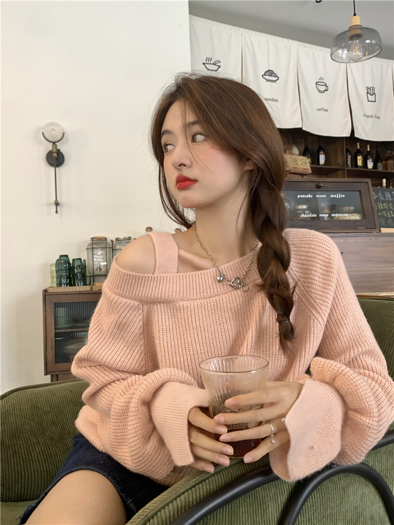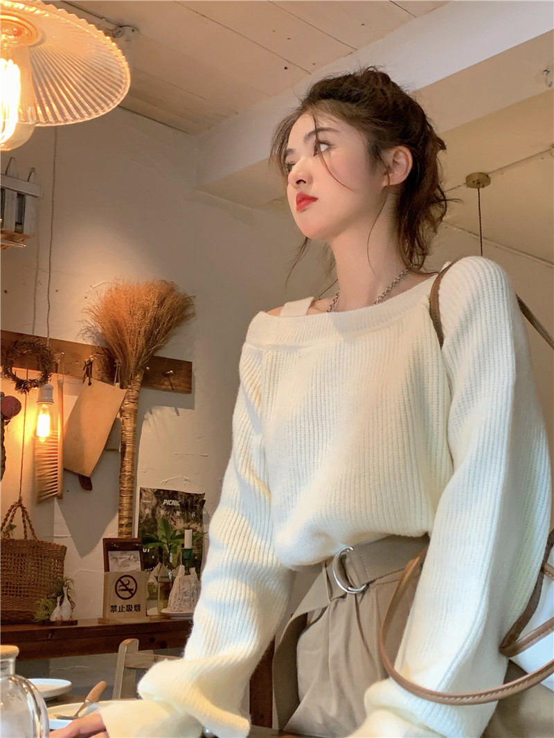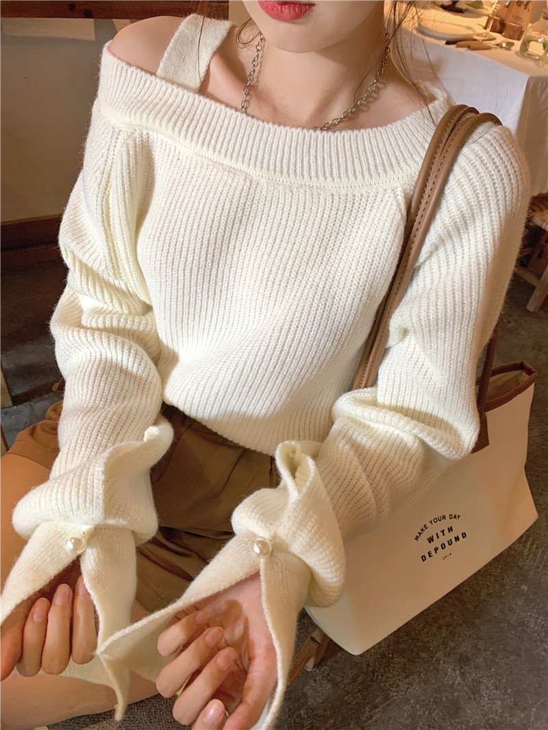 小心機露肩軟糯針織衫毛衣女早秋季設計感小衆法式溫柔風寬松上衣