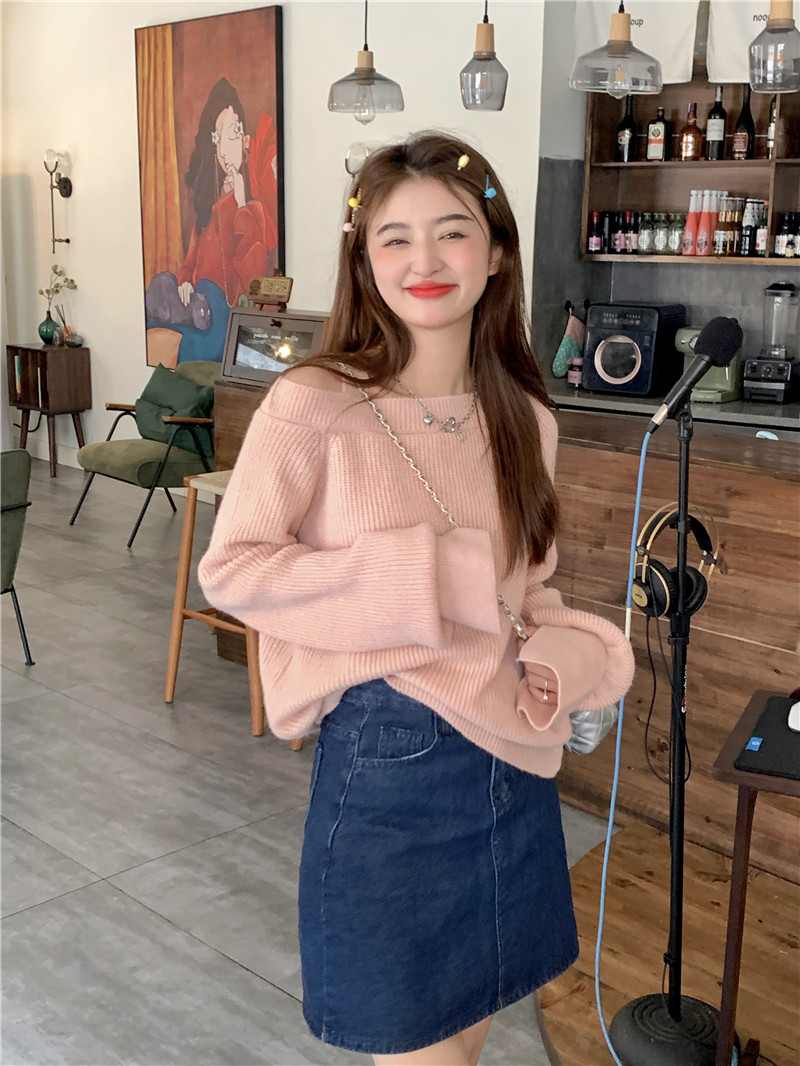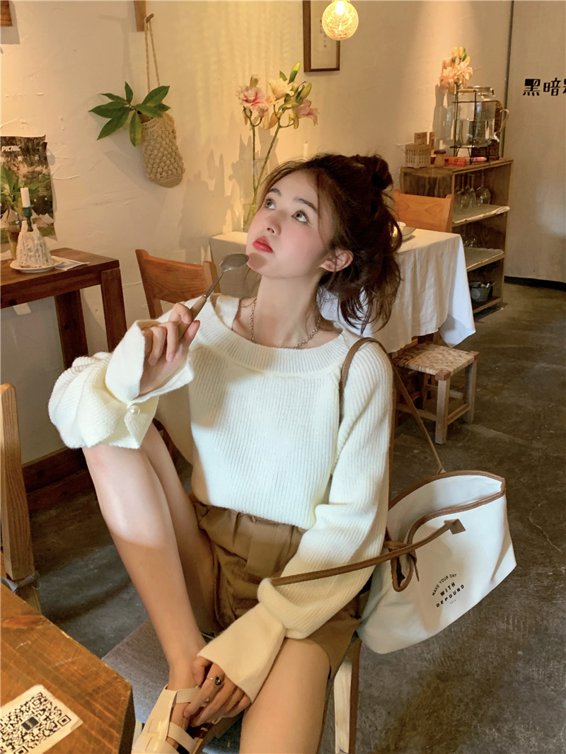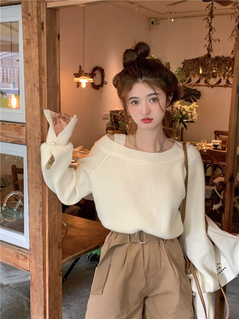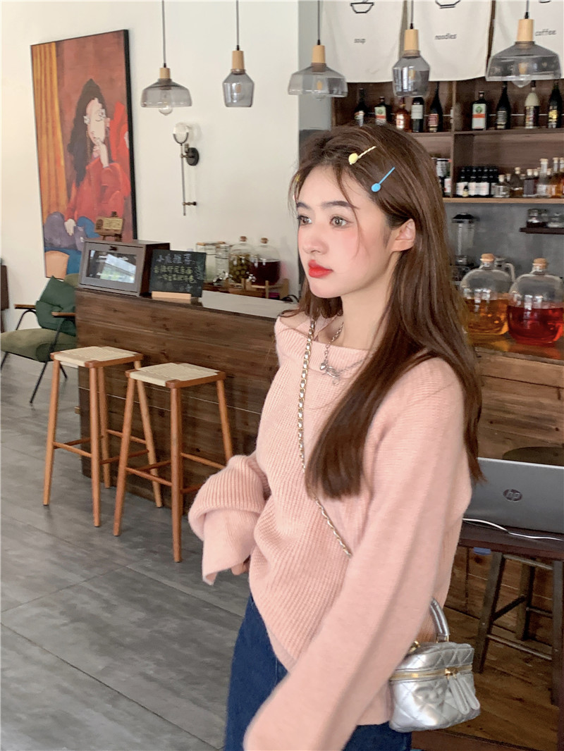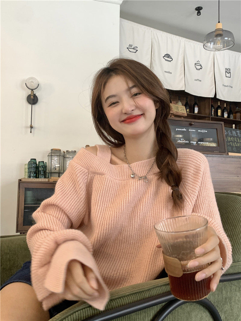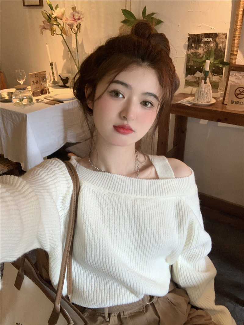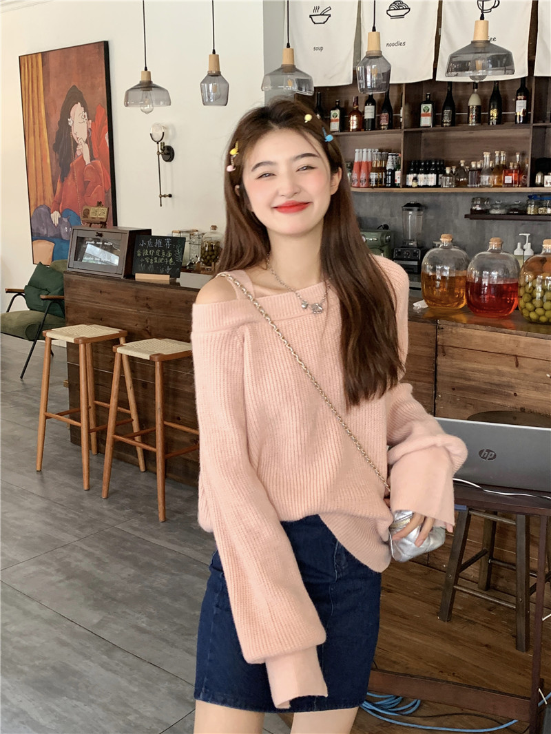 小心機露肩軟糯針織衫毛衣女早秋季設計感小衆法式溫柔風寬松上衣