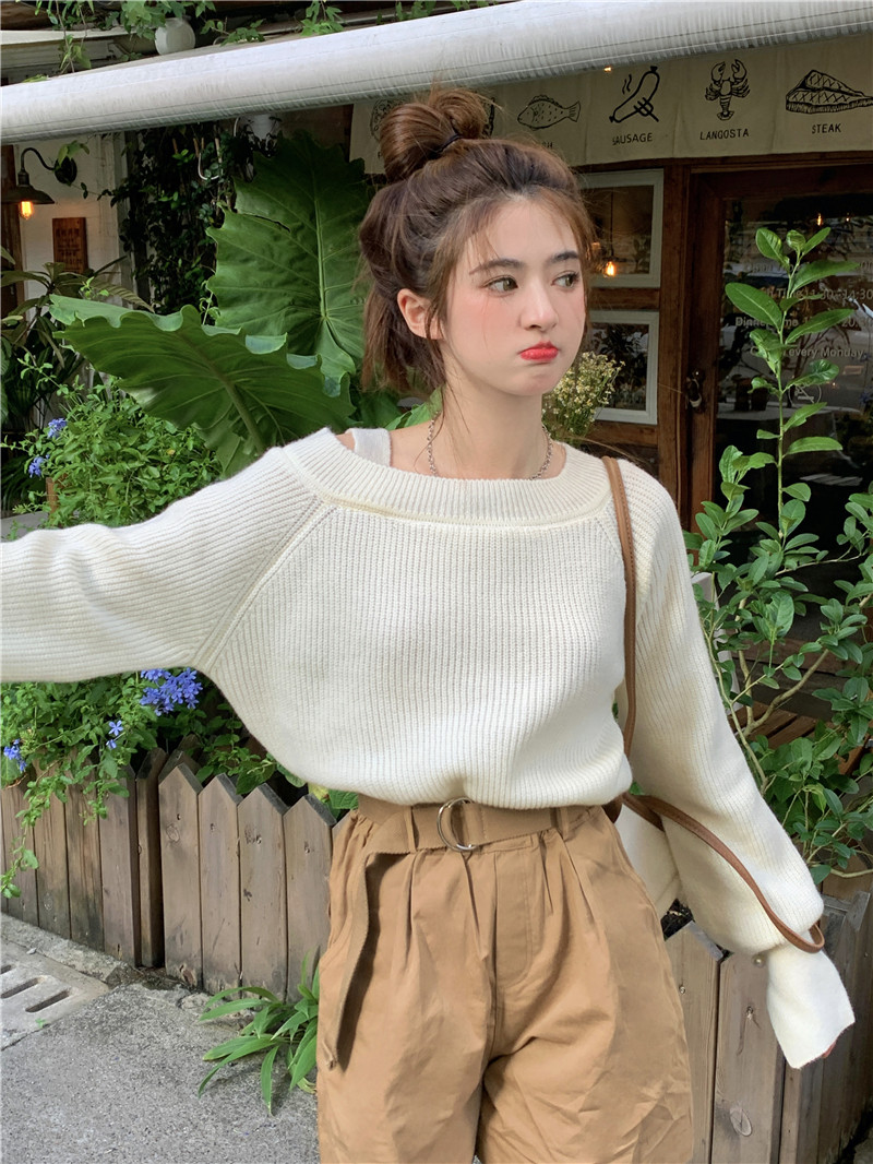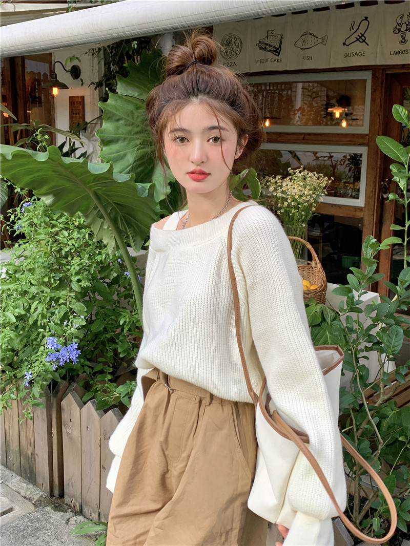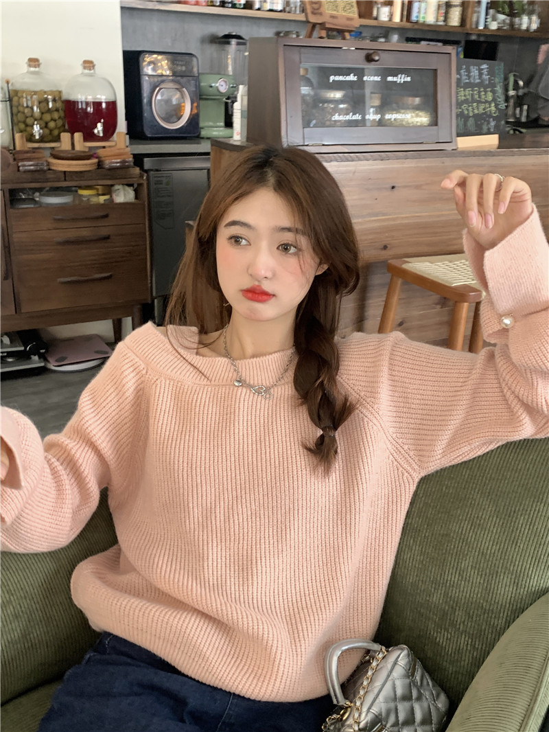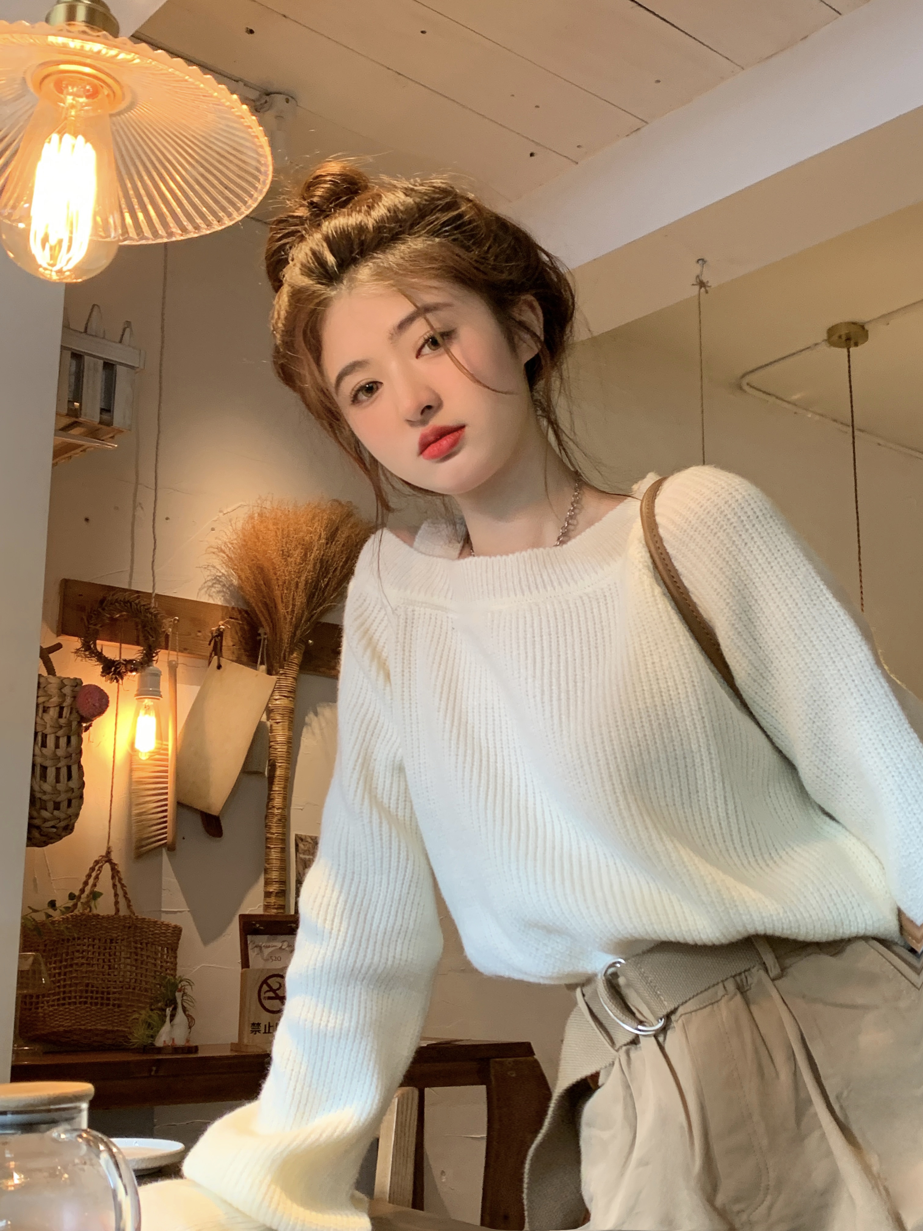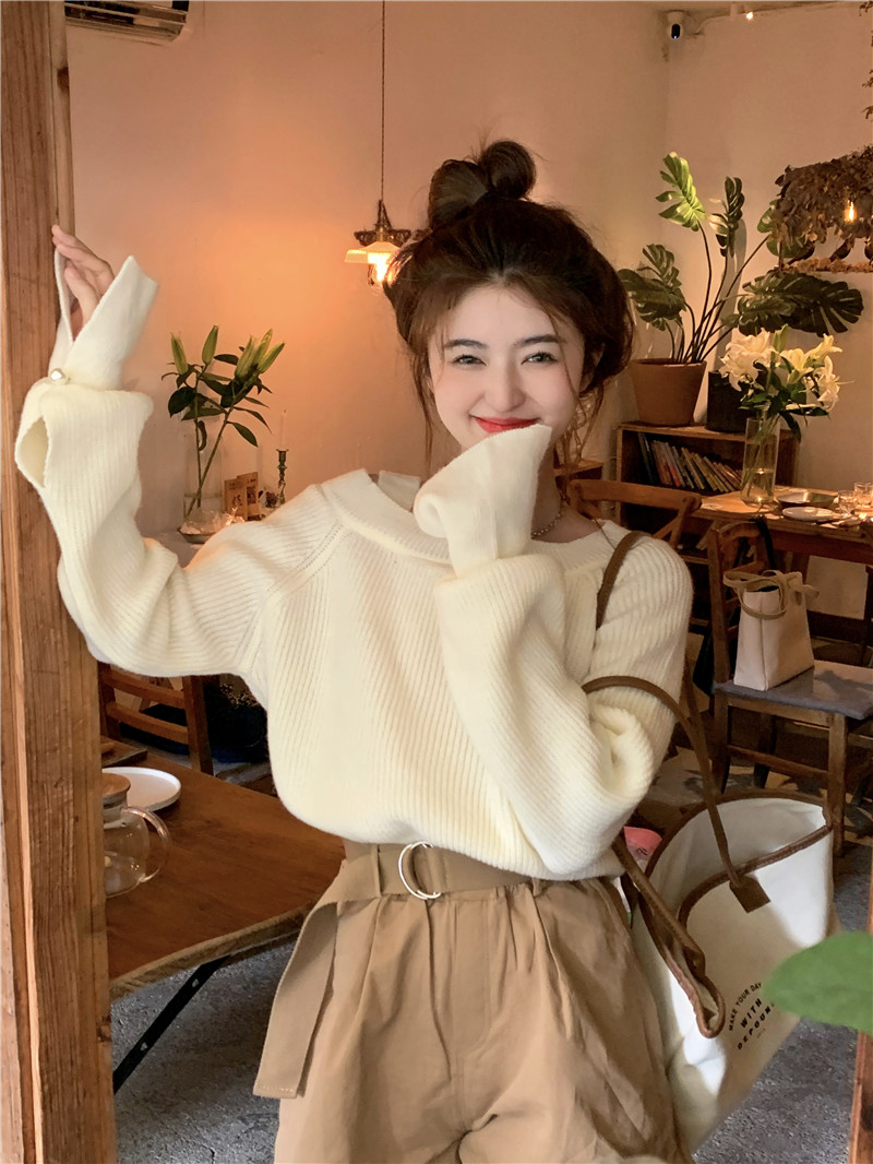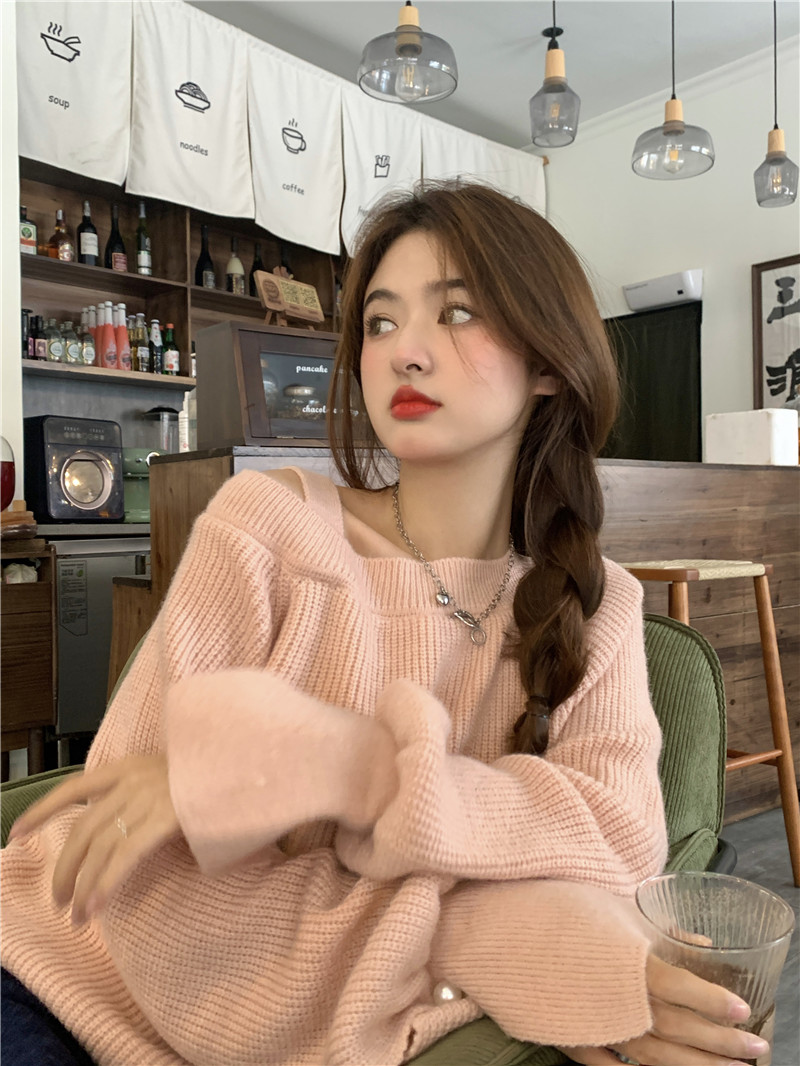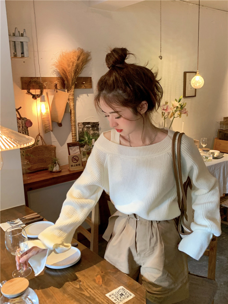 小心機露肩軟糯針織衫毛衣女早秋季設計感小衆法式溫柔風寬松上衣