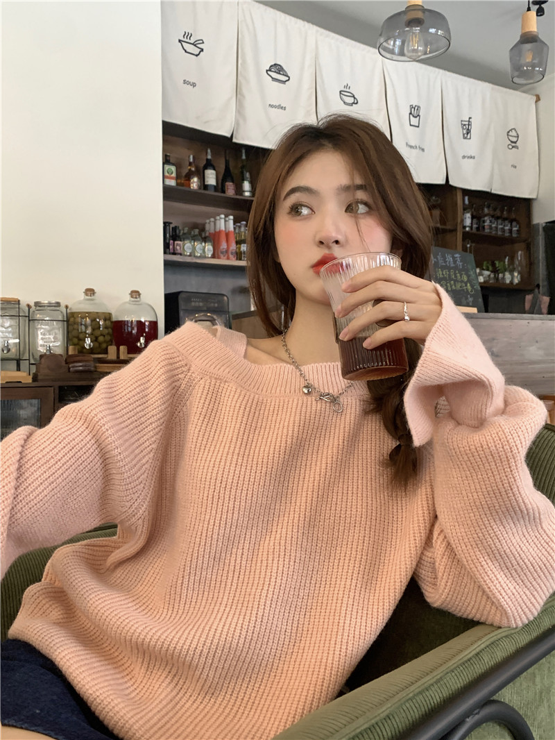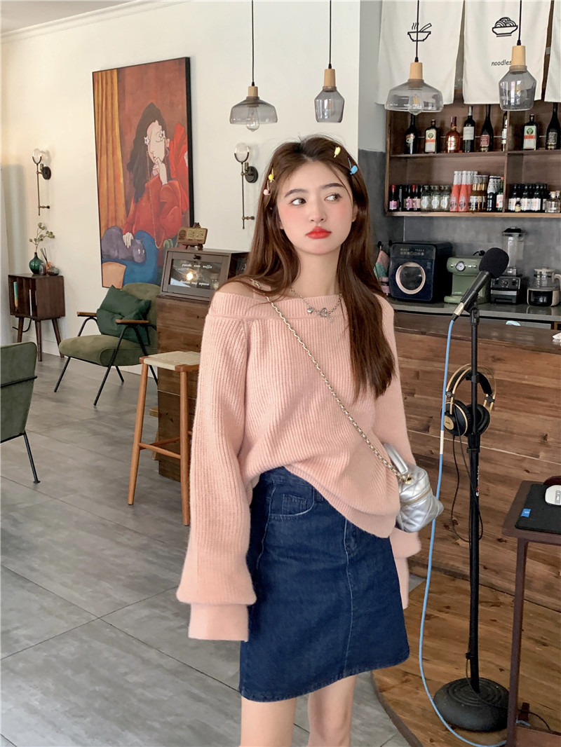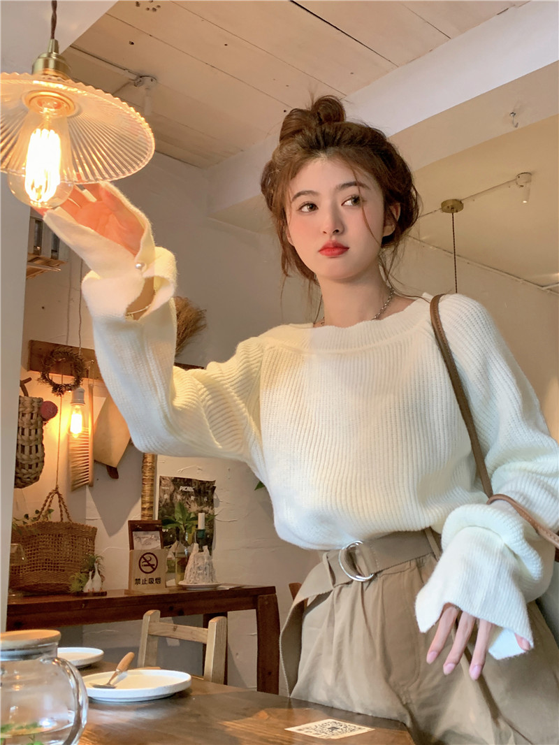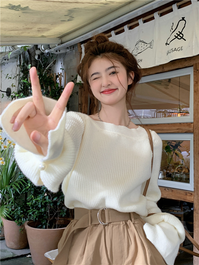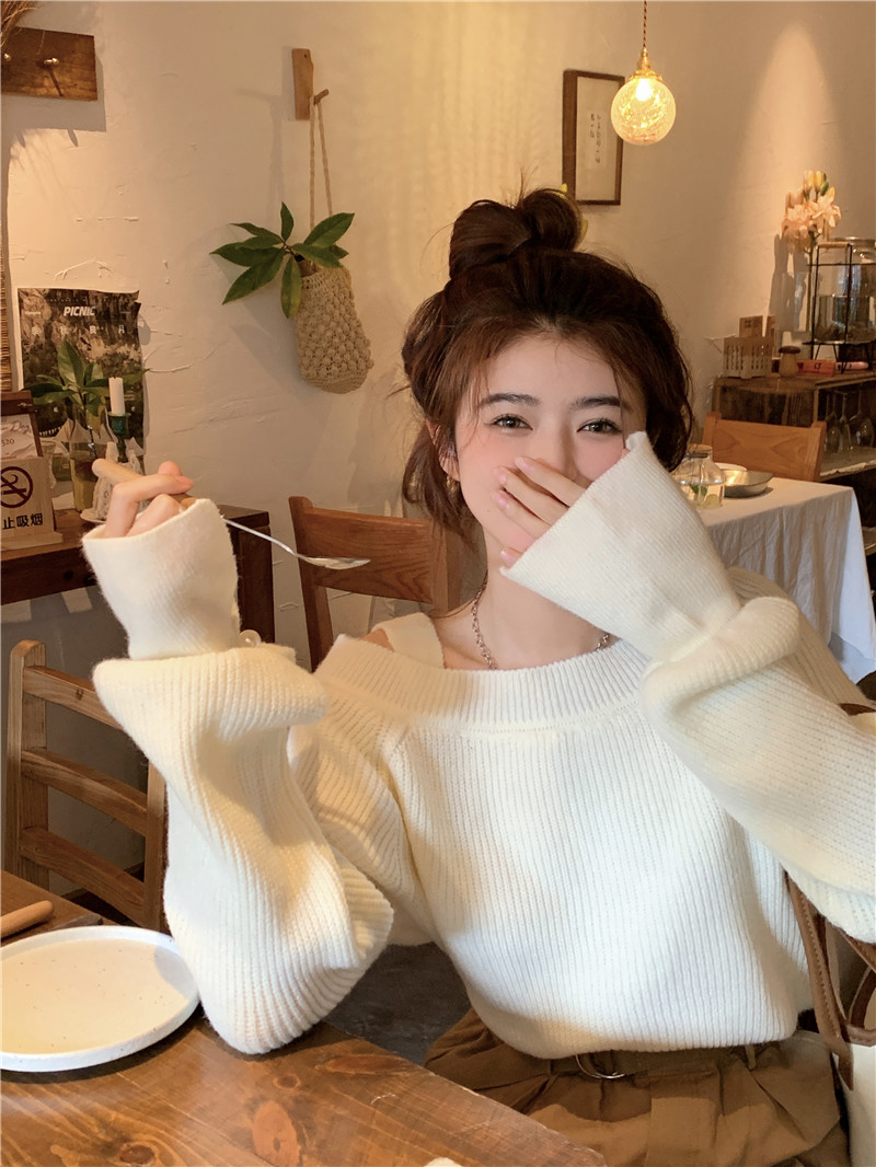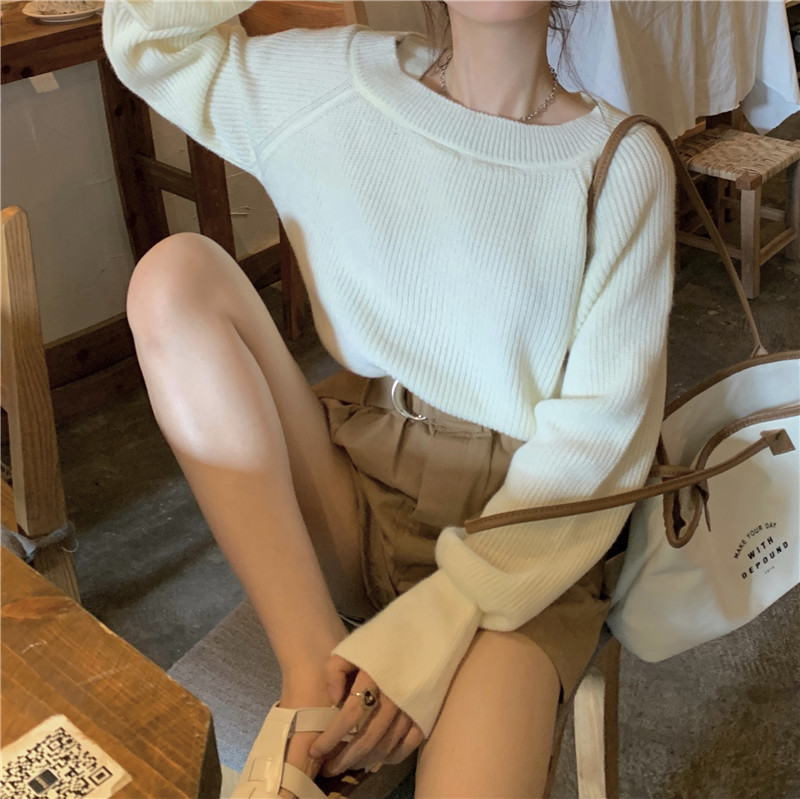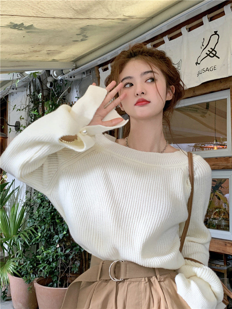 小心機露肩軟糯針織衫毛衣女早秋季設計感小衆法式溫柔風寬松上衣