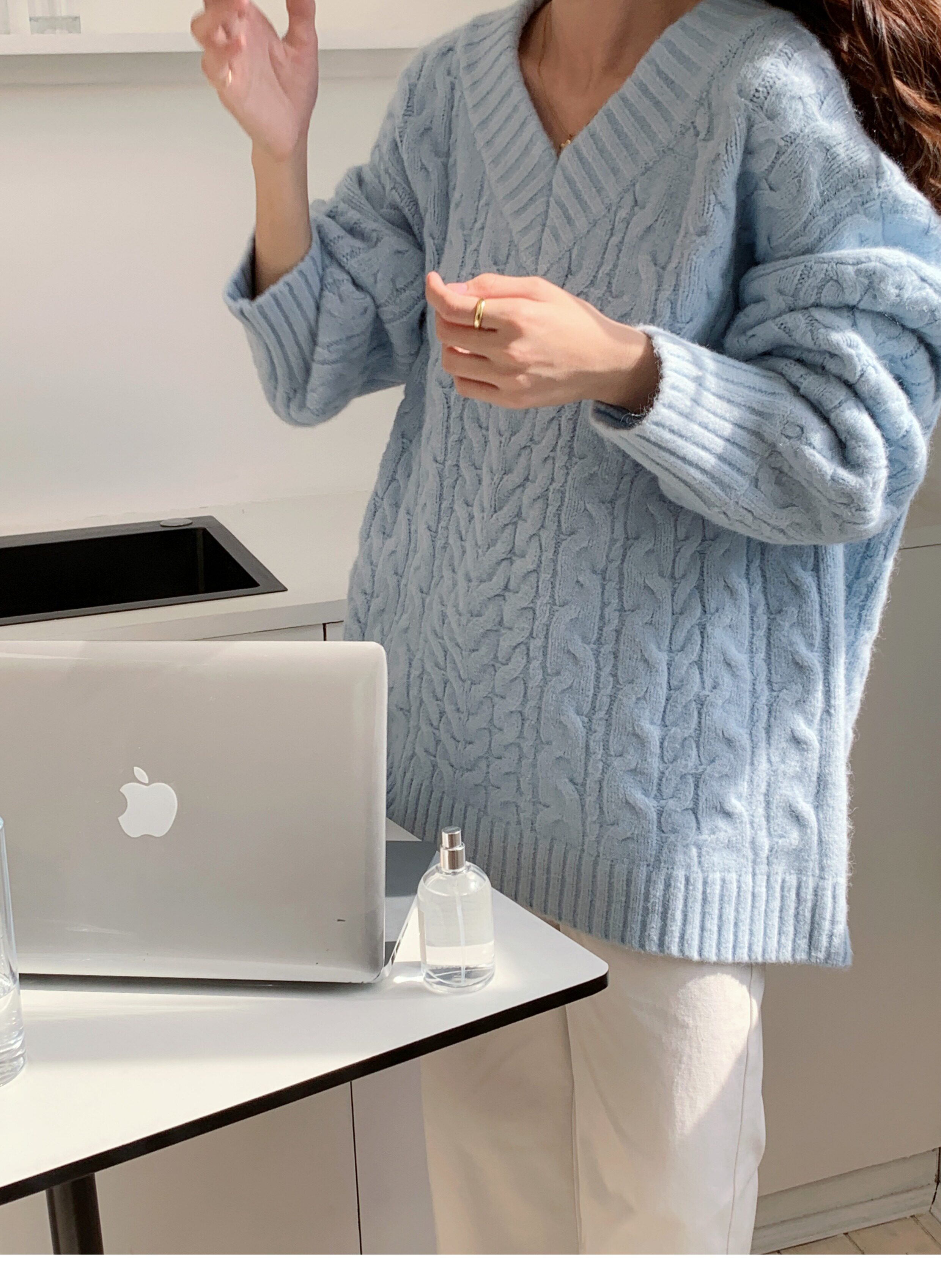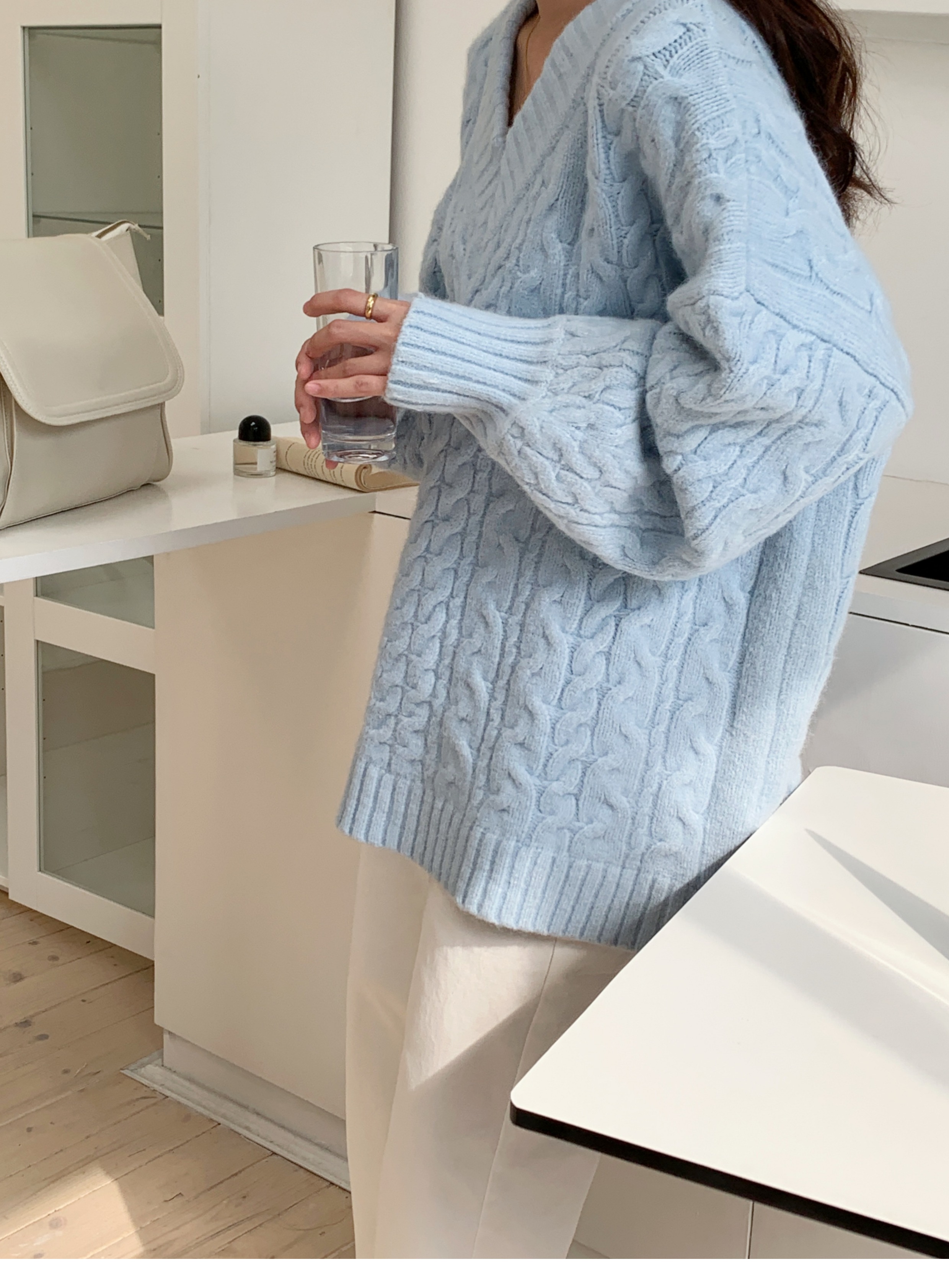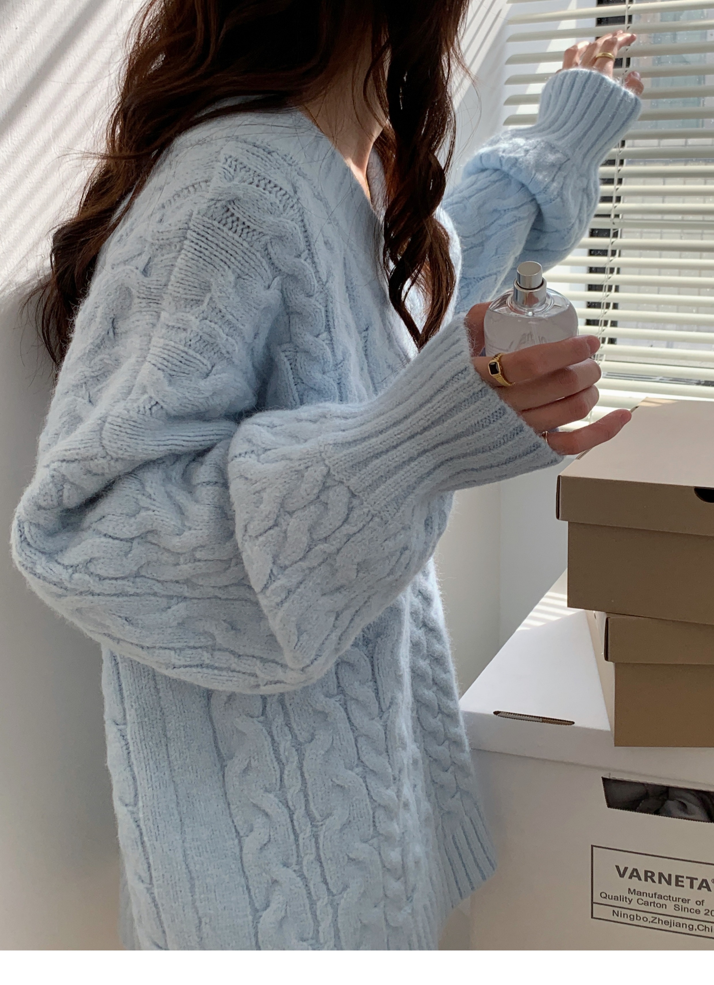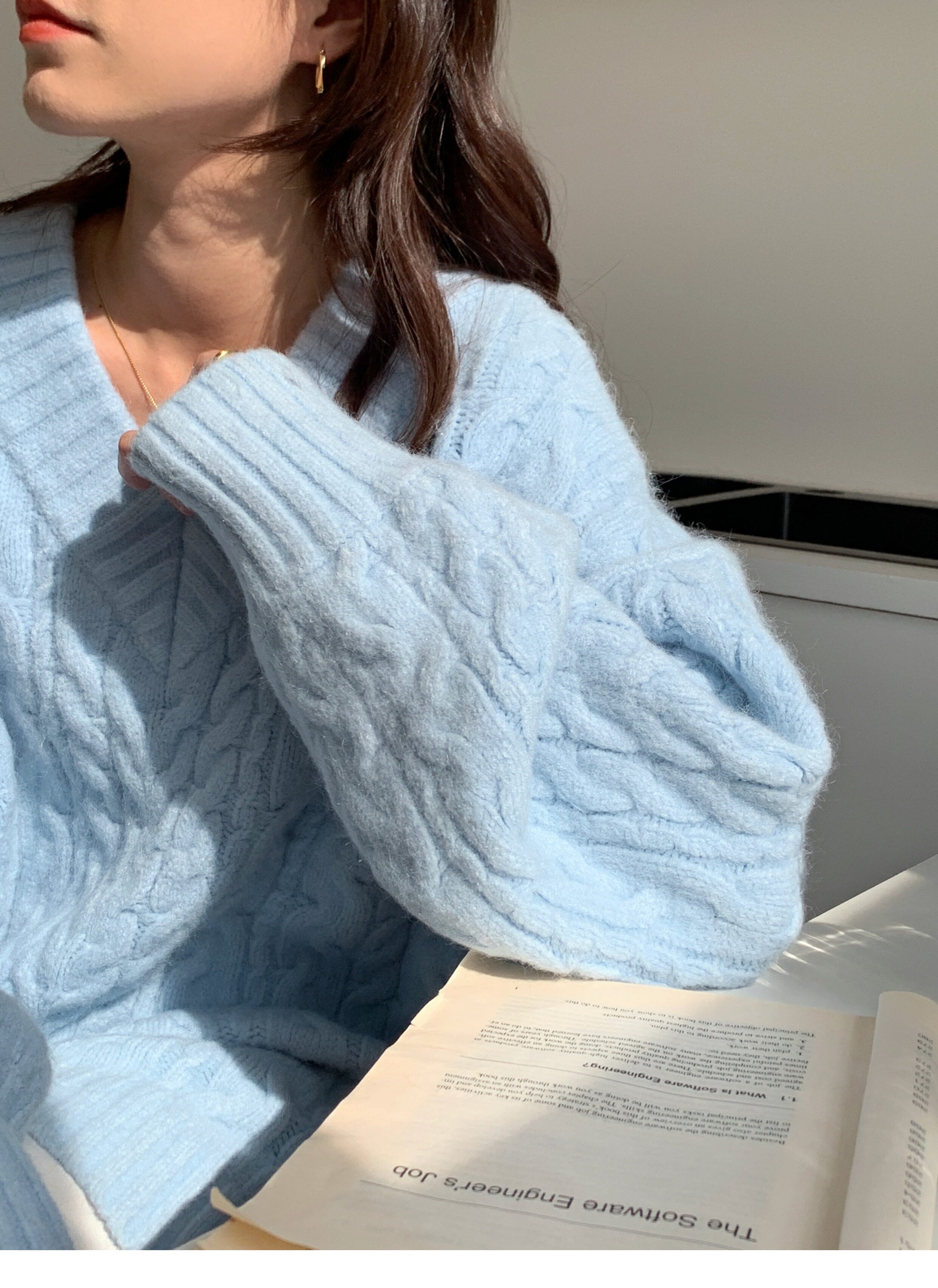藍色奶系V領麻花套頭毛衣女2024秋冬新款韓系穿搭慵懶寬松上衣厚