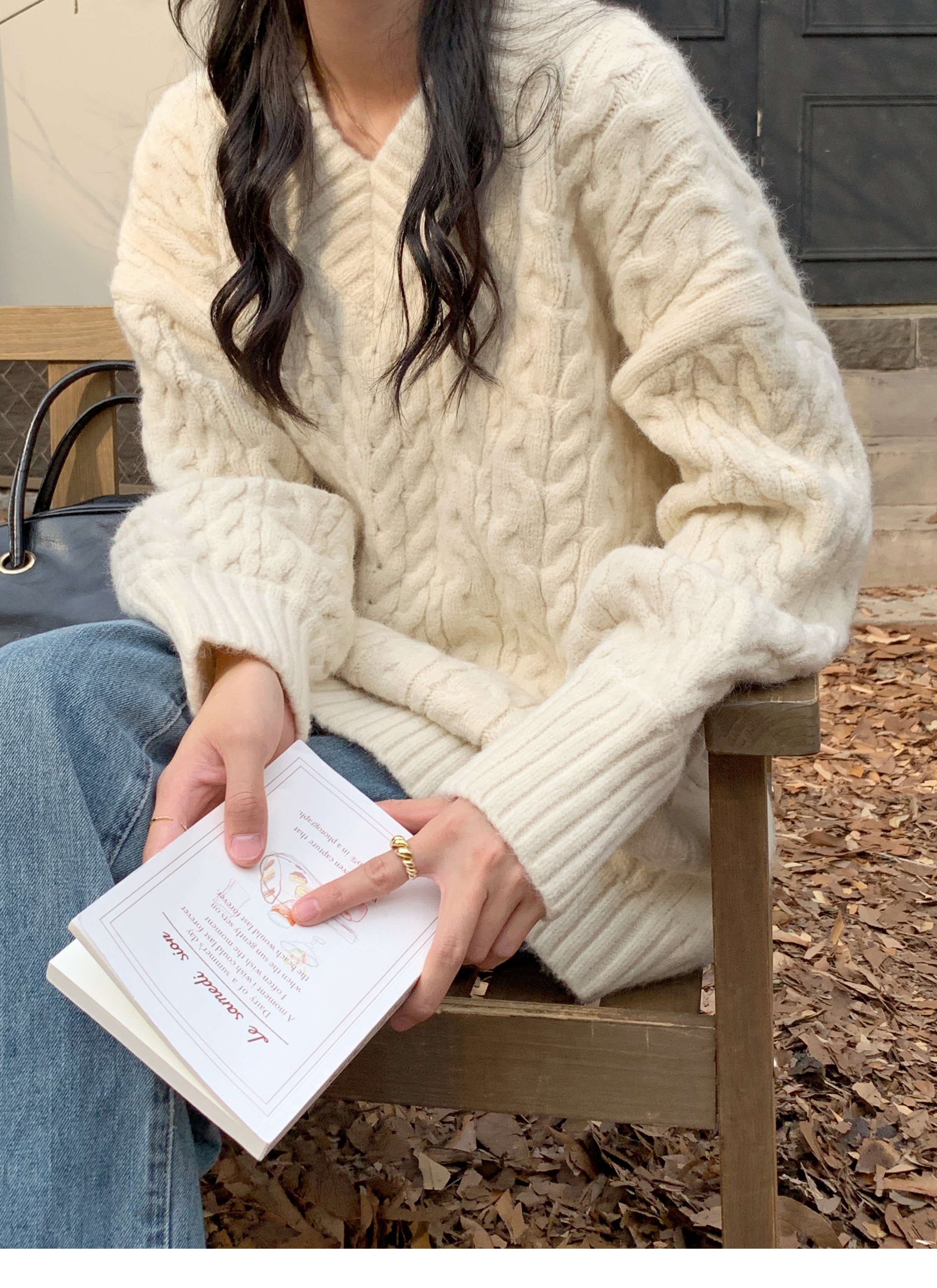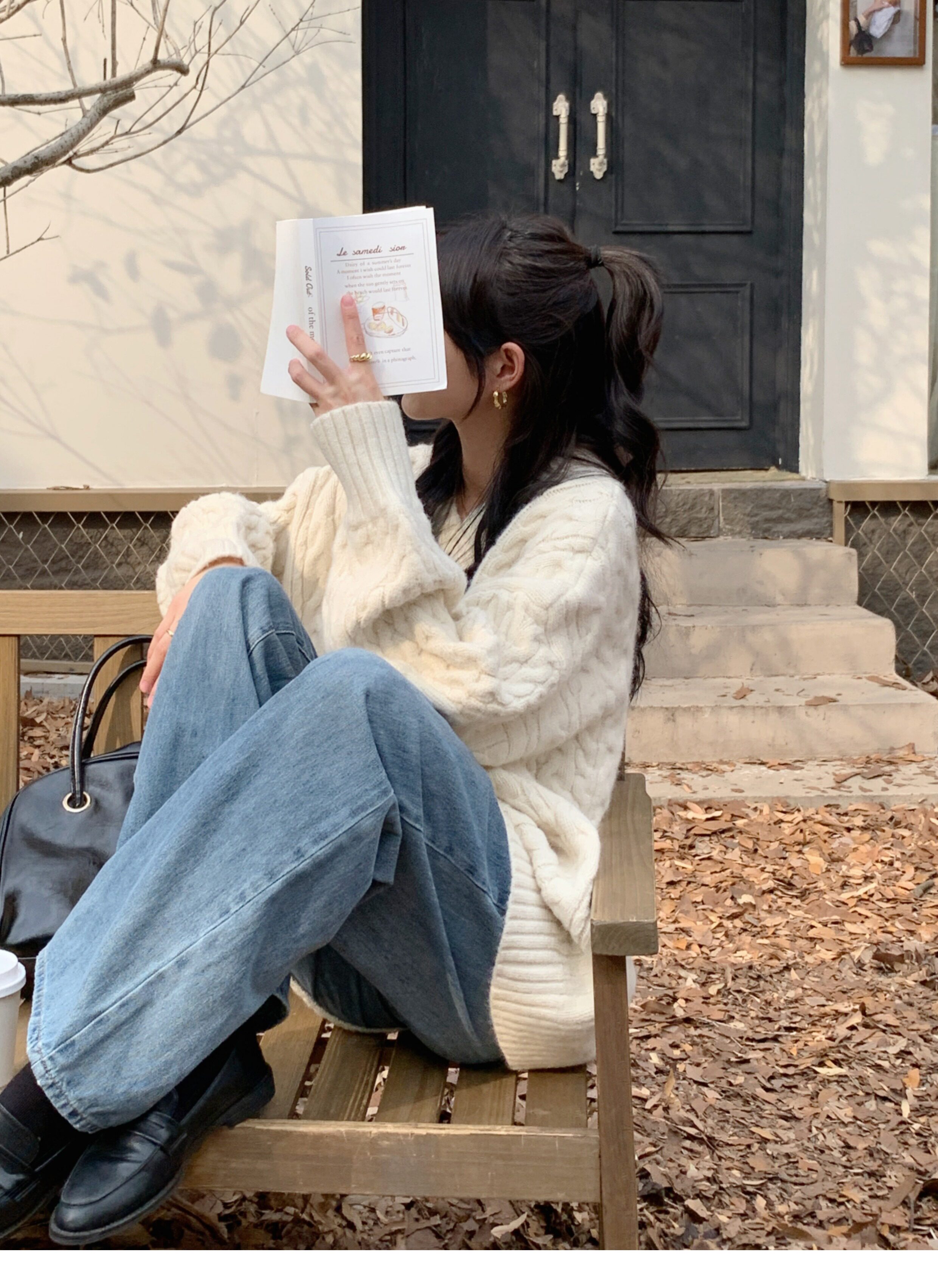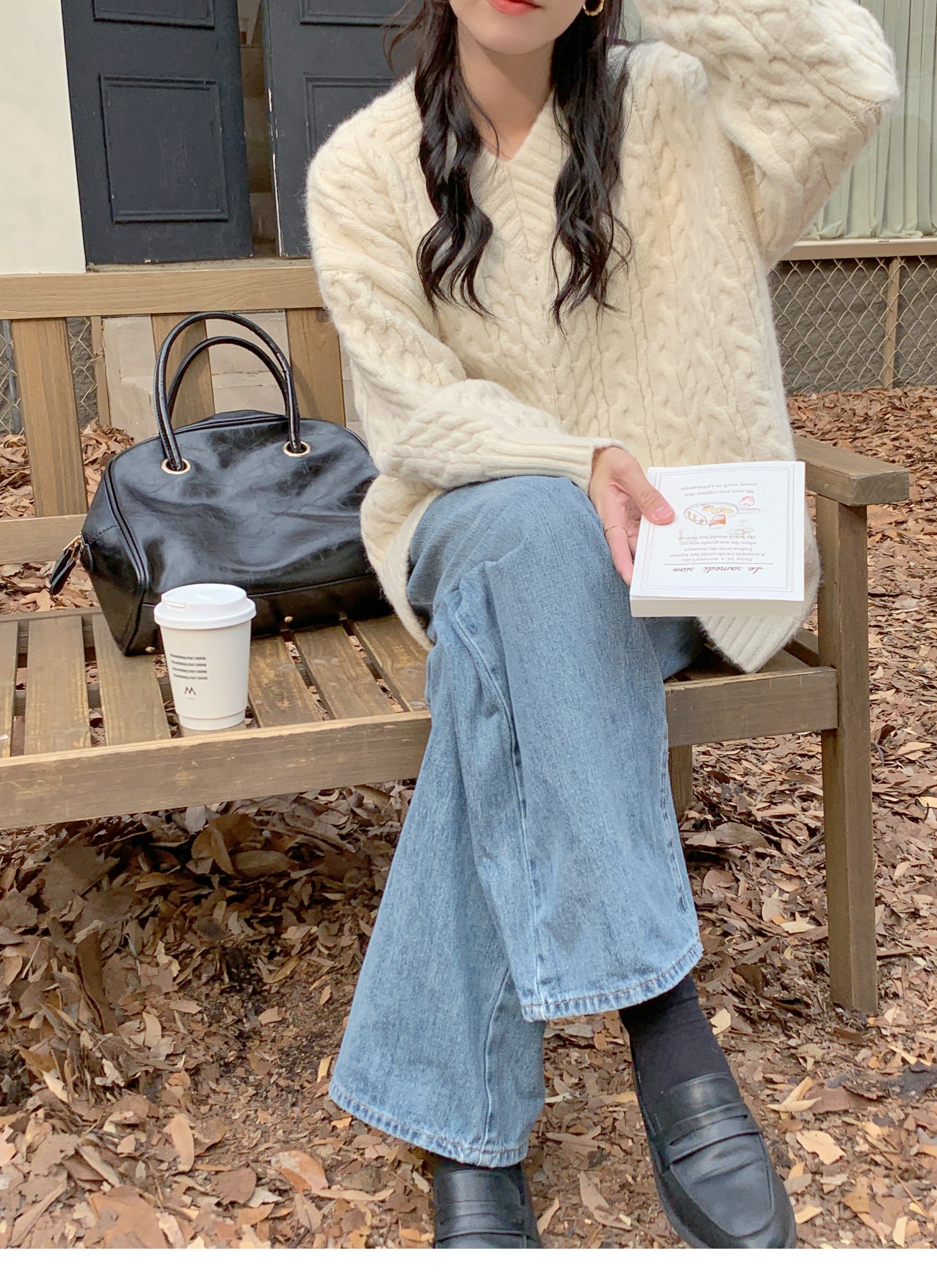 藍色奶系V領麻花套頭毛衣女2024秋冬新款韓系穿搭慵懶寬松上衣厚