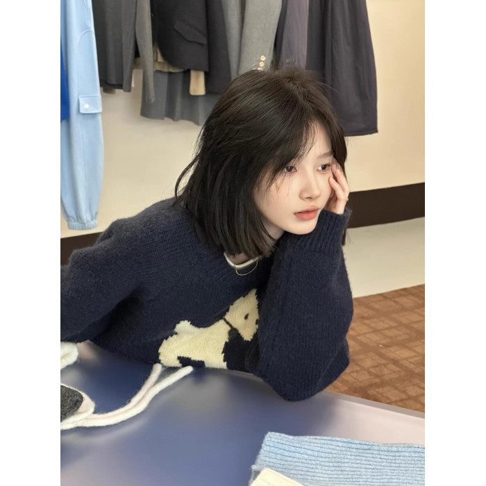 藏青色可愛卡通毛衣女春秋冬寬松慵懶風軟糯溫柔休閒百搭針織衫潮