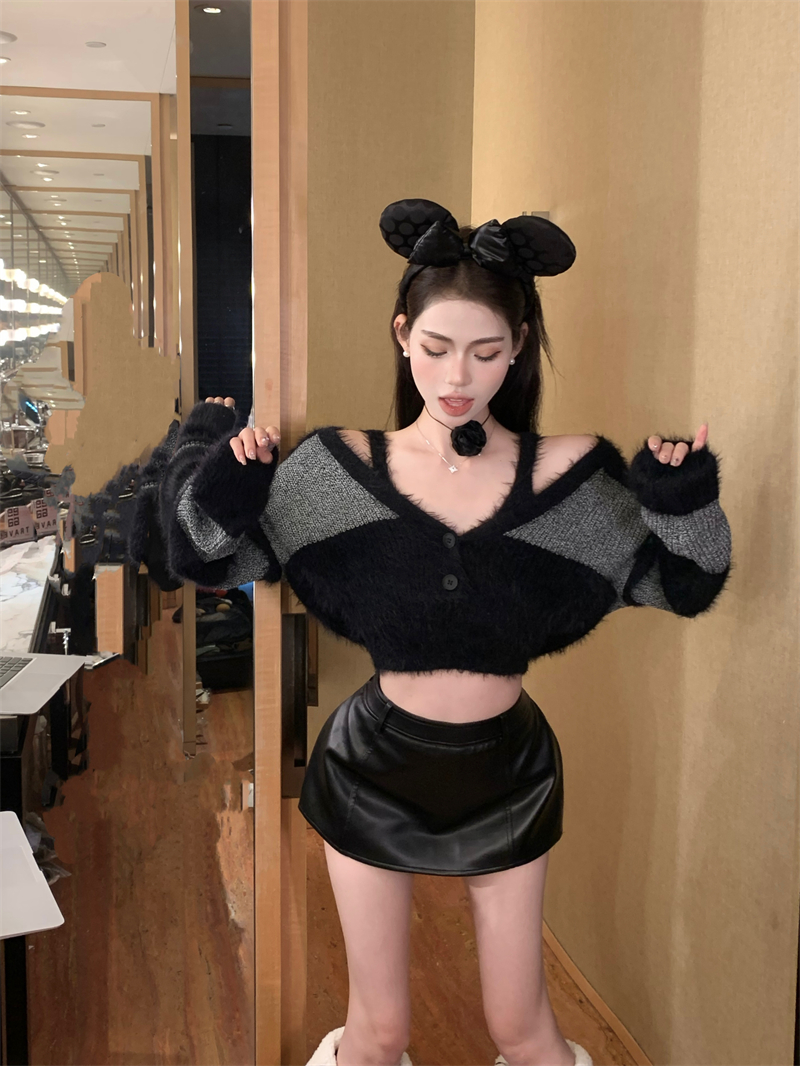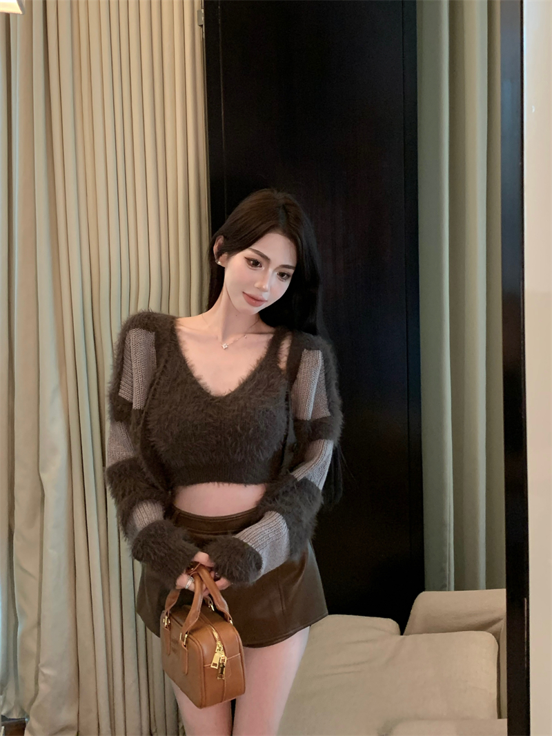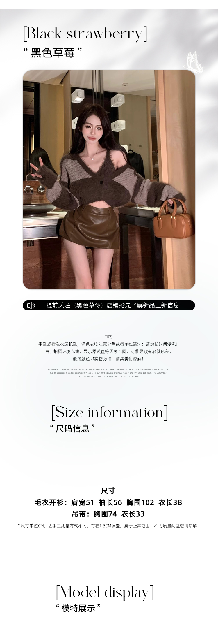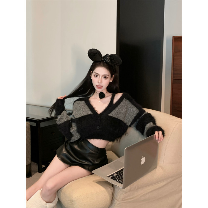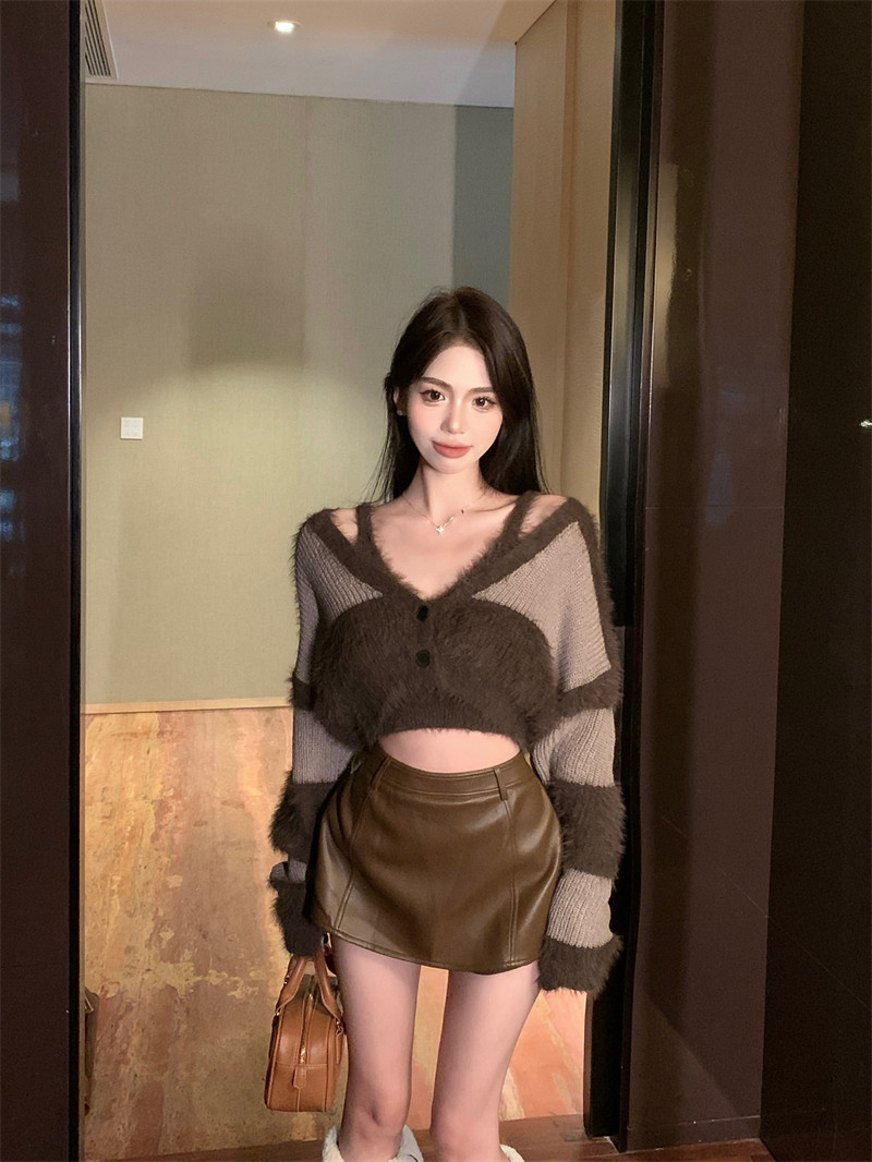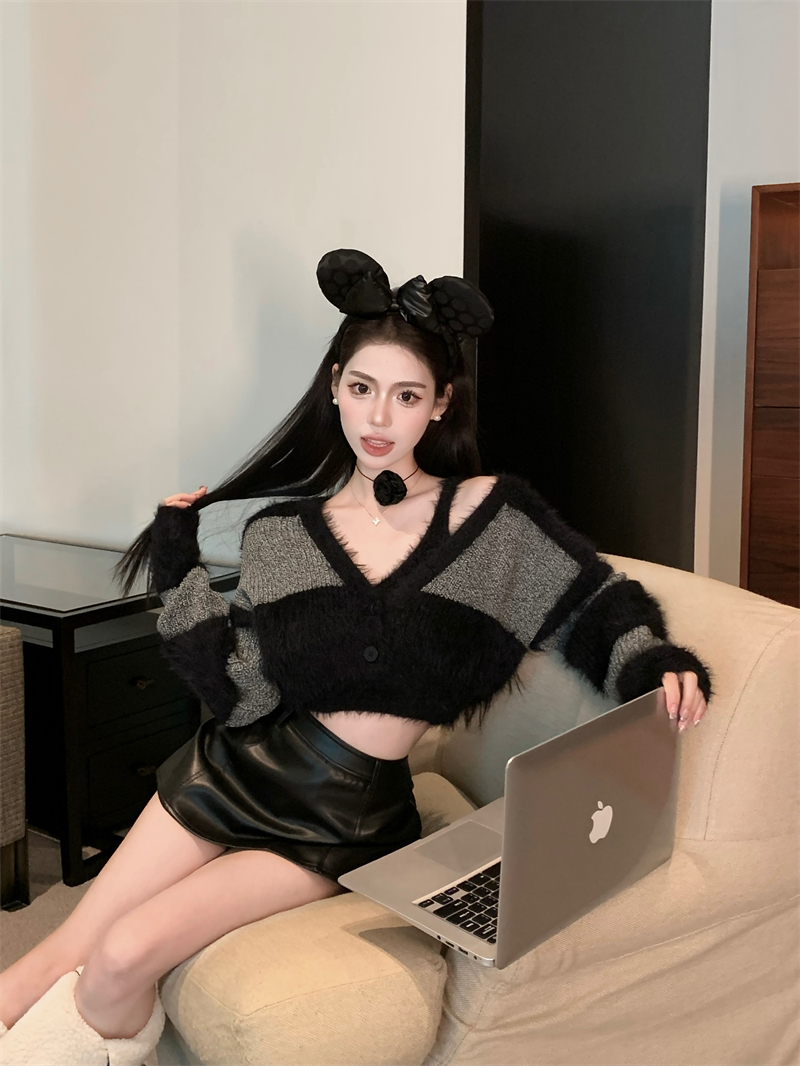 復古撞色條紋v領毛衣外套女裝秋季拼接馬海毛針織開衫美拉德上衣