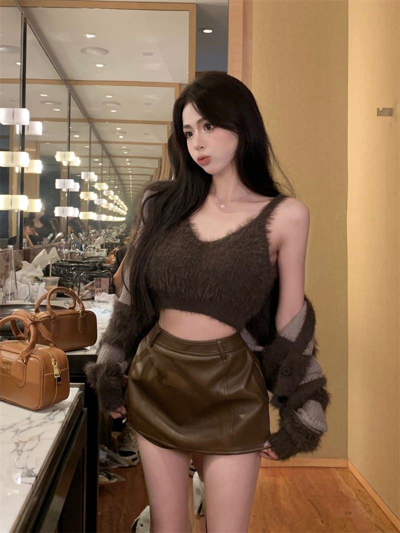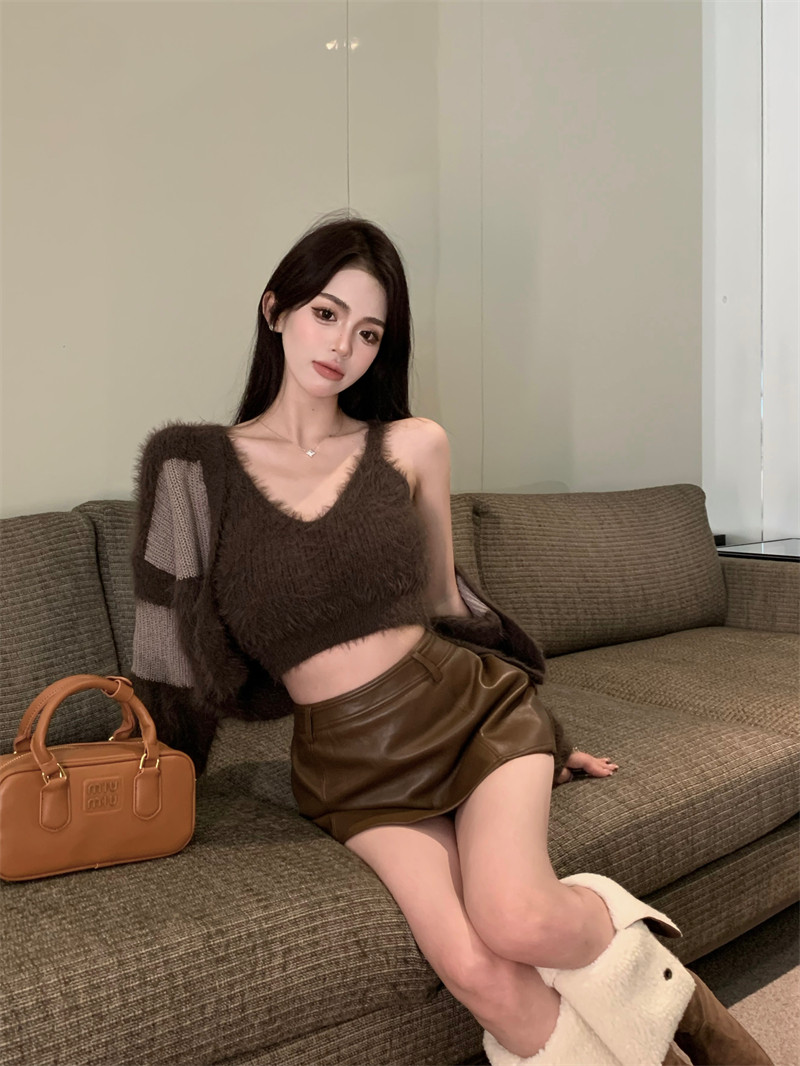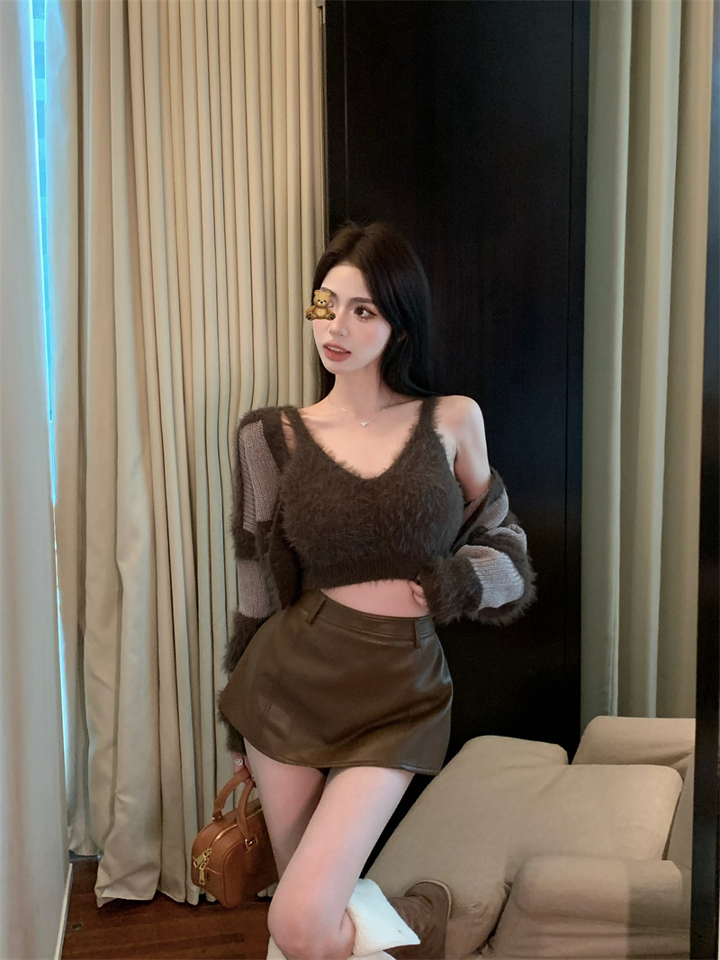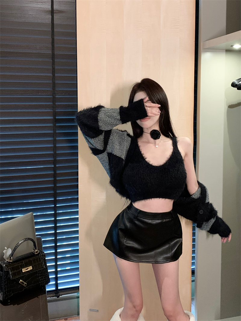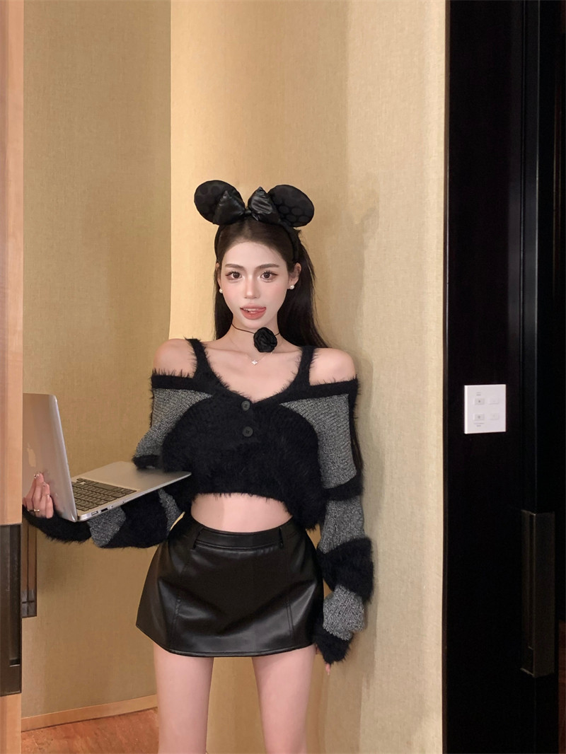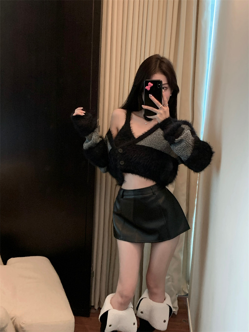 復古撞色條紋v領毛衣外套女裝秋季拼接馬海毛針織開衫美拉德上衣