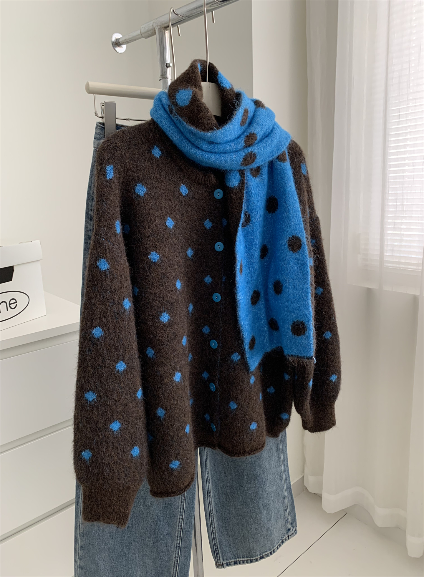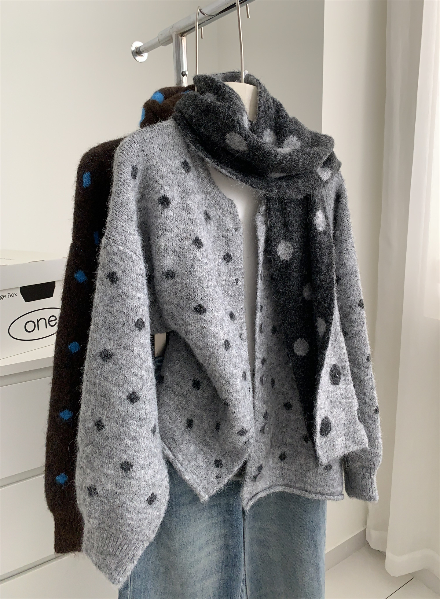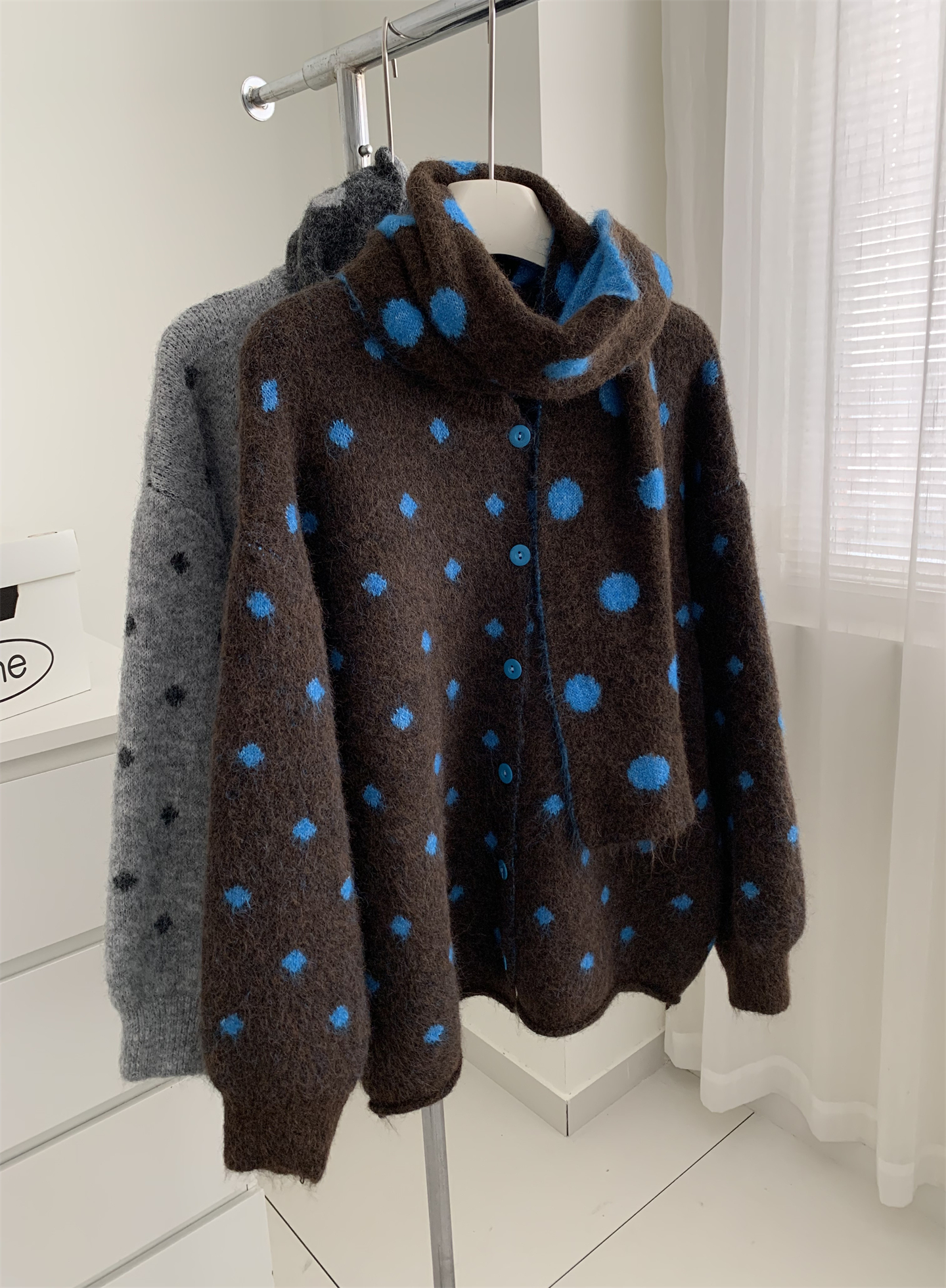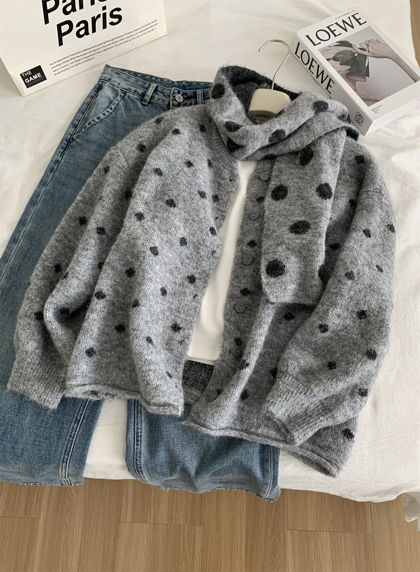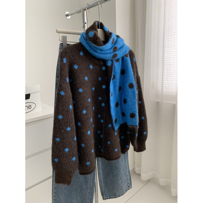 慵懶復古撞色波點圓領羊毛針織開衫女25秋冬保暖帶圍巾拉毛衣外套