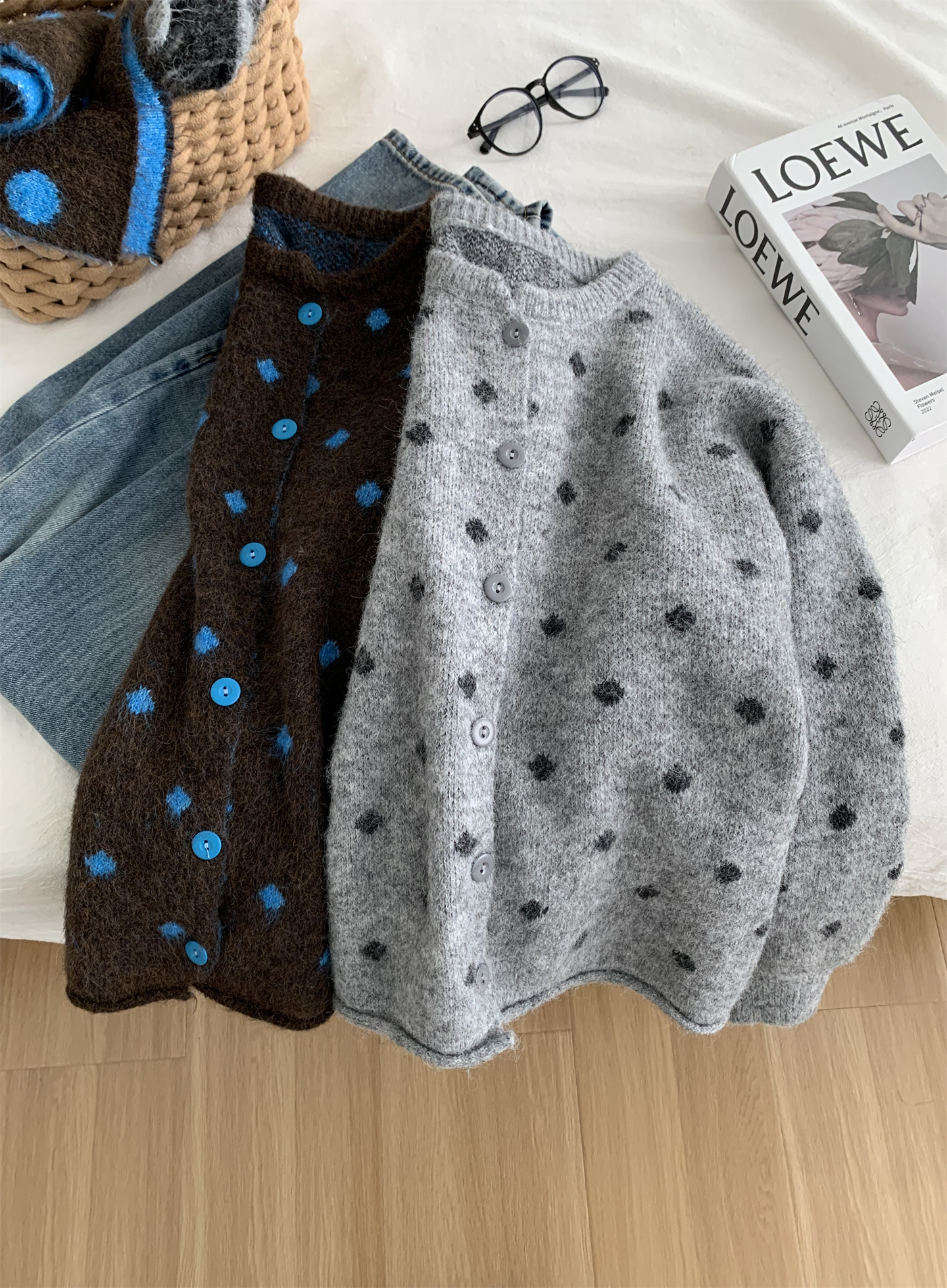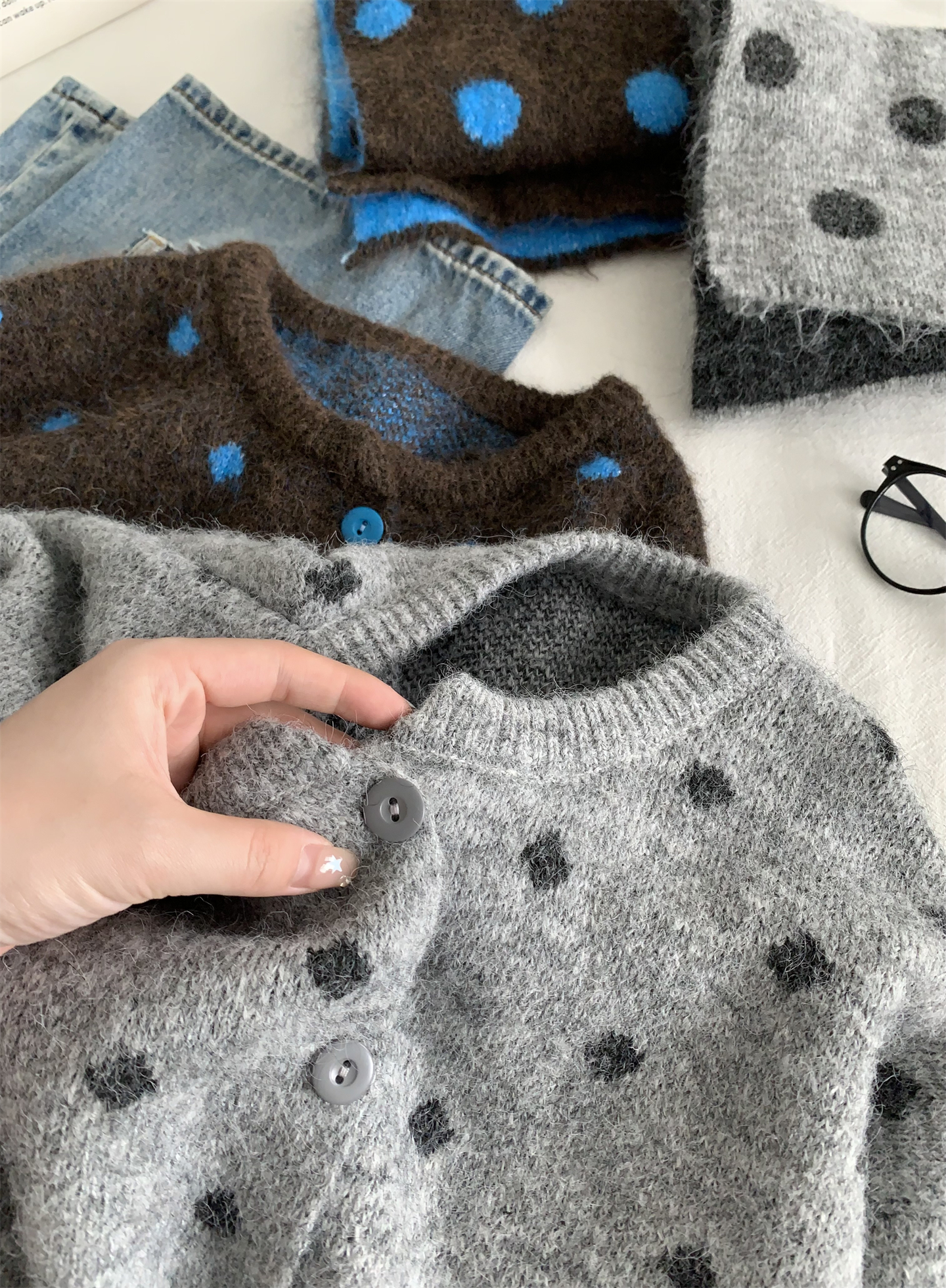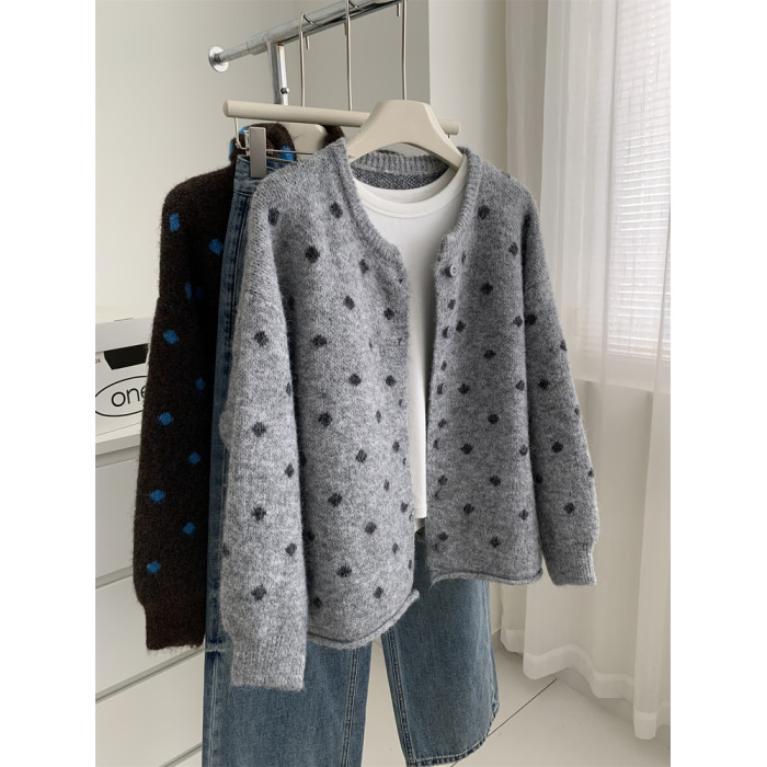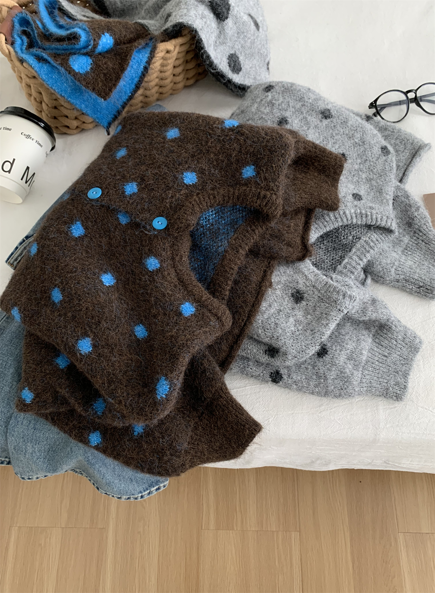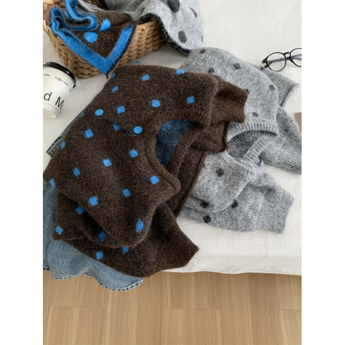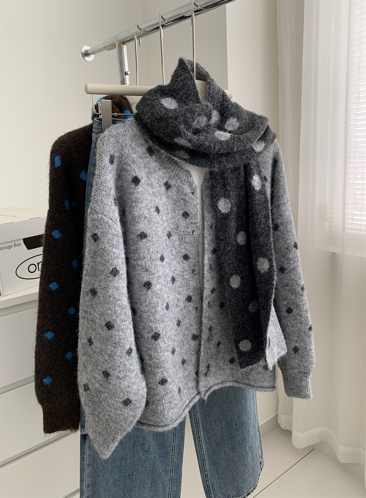 慵懶復古撞色波點圓領羊毛針織開衫女25秋冬保暖帶圍巾拉毛衣外套