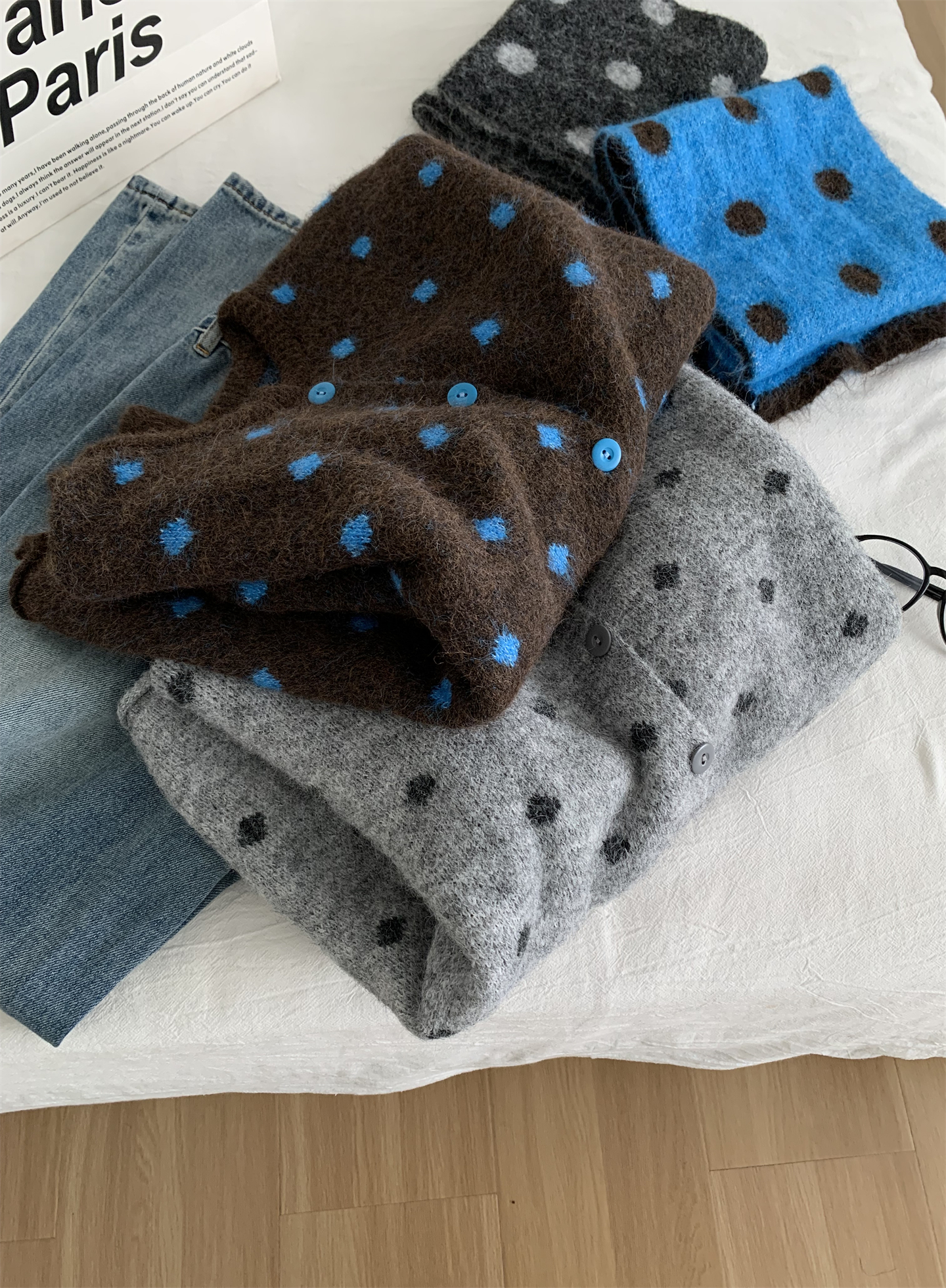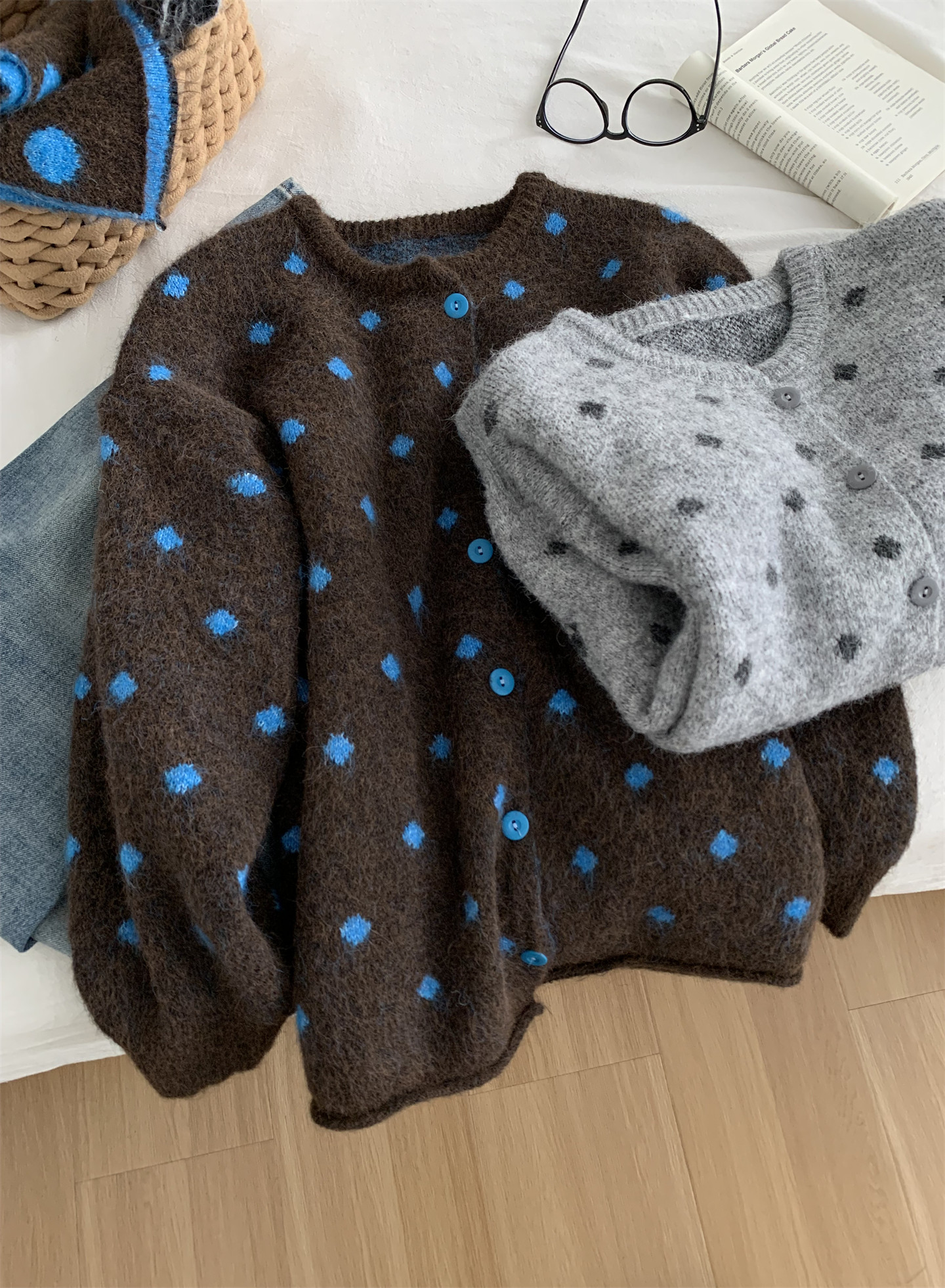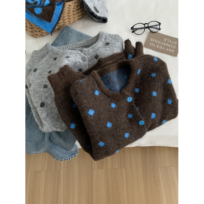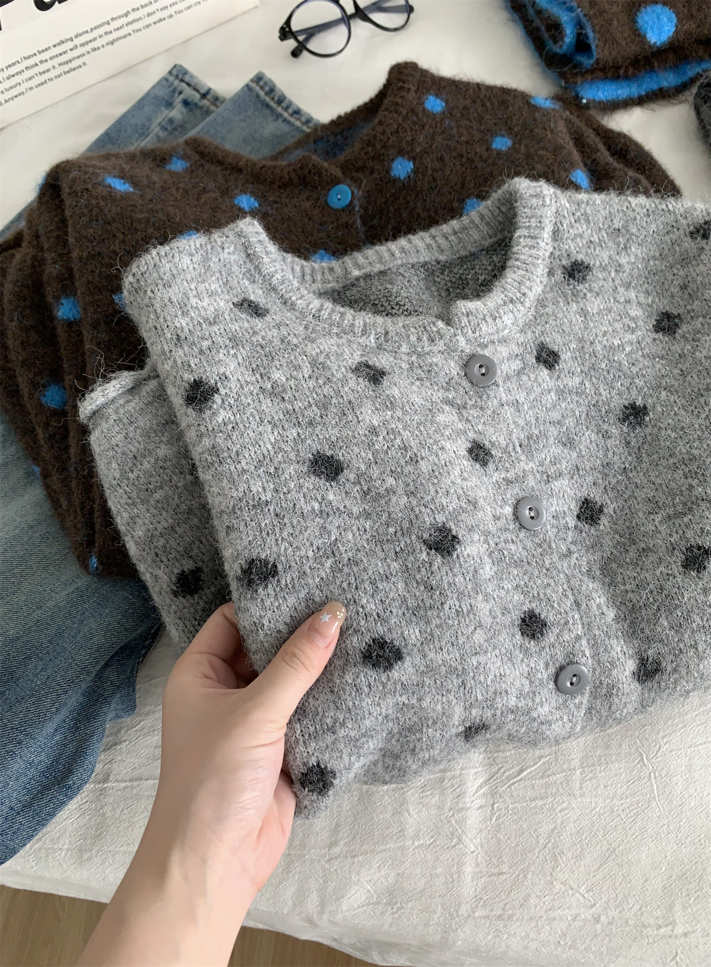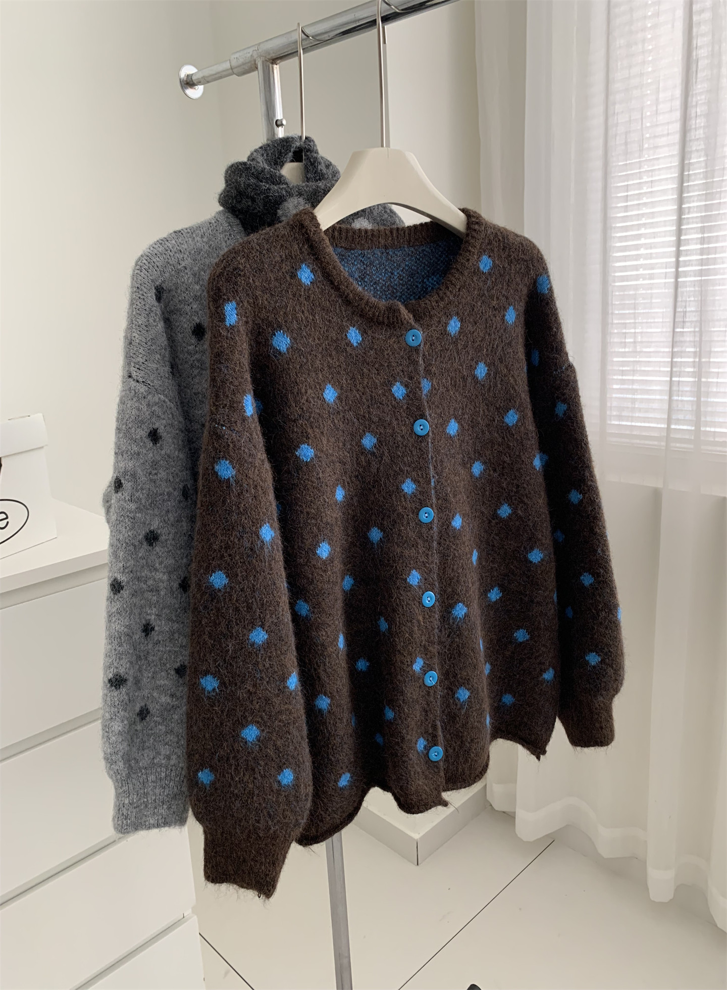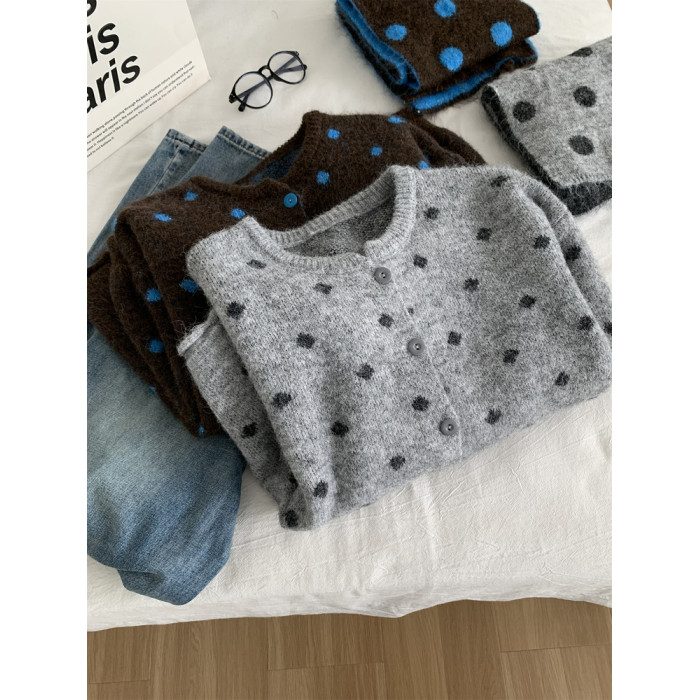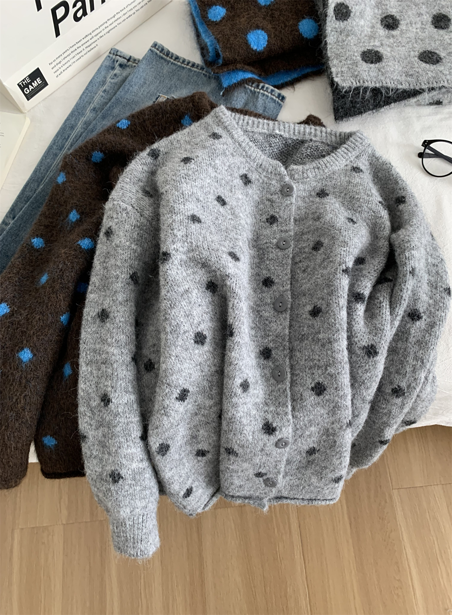 慵懶復古撞色波點圓領羊毛針織開衫女25秋冬保暖帶圍巾拉毛衣外套