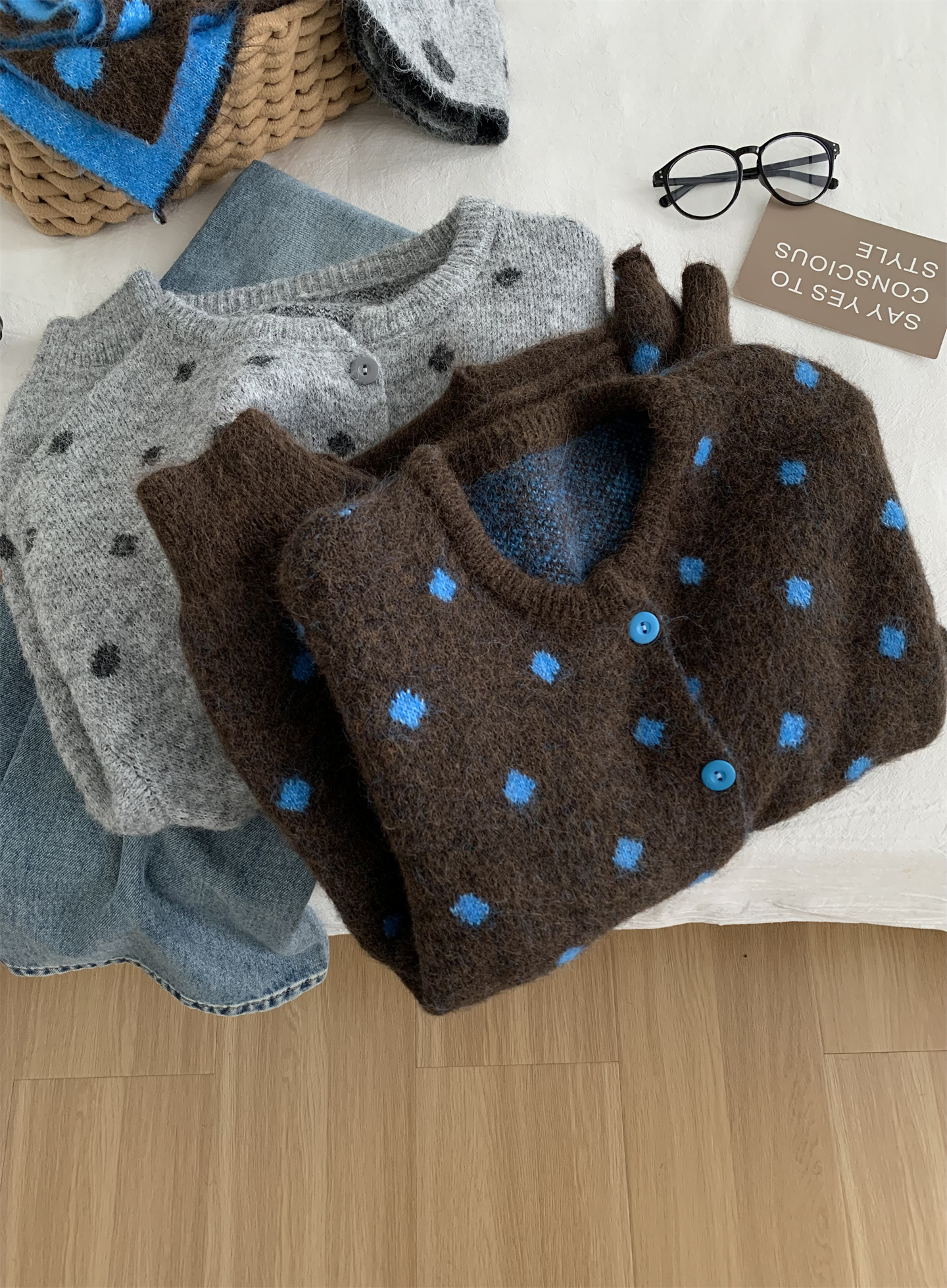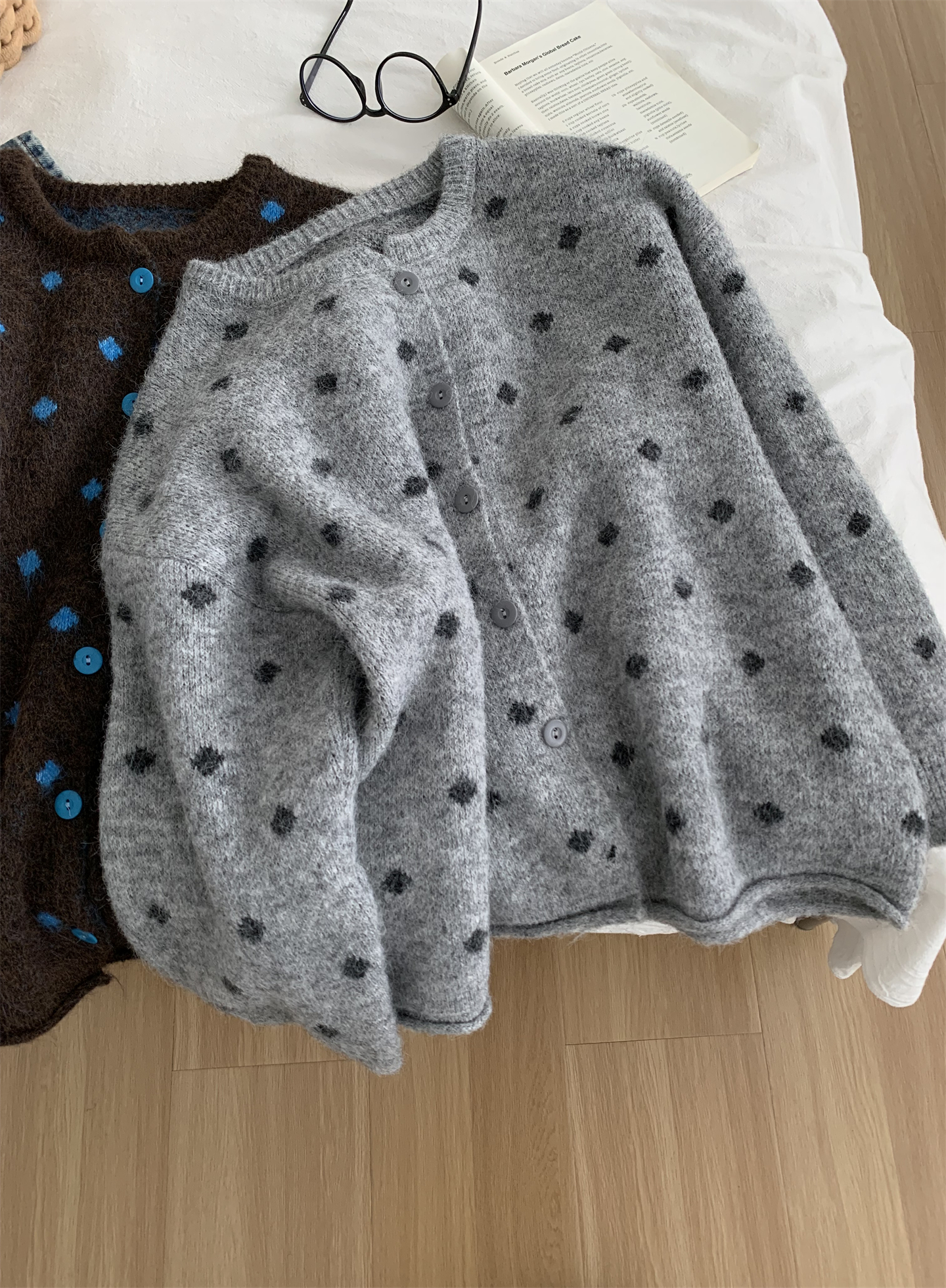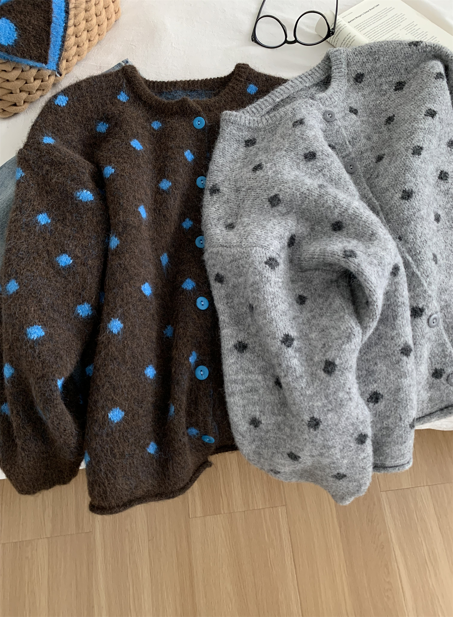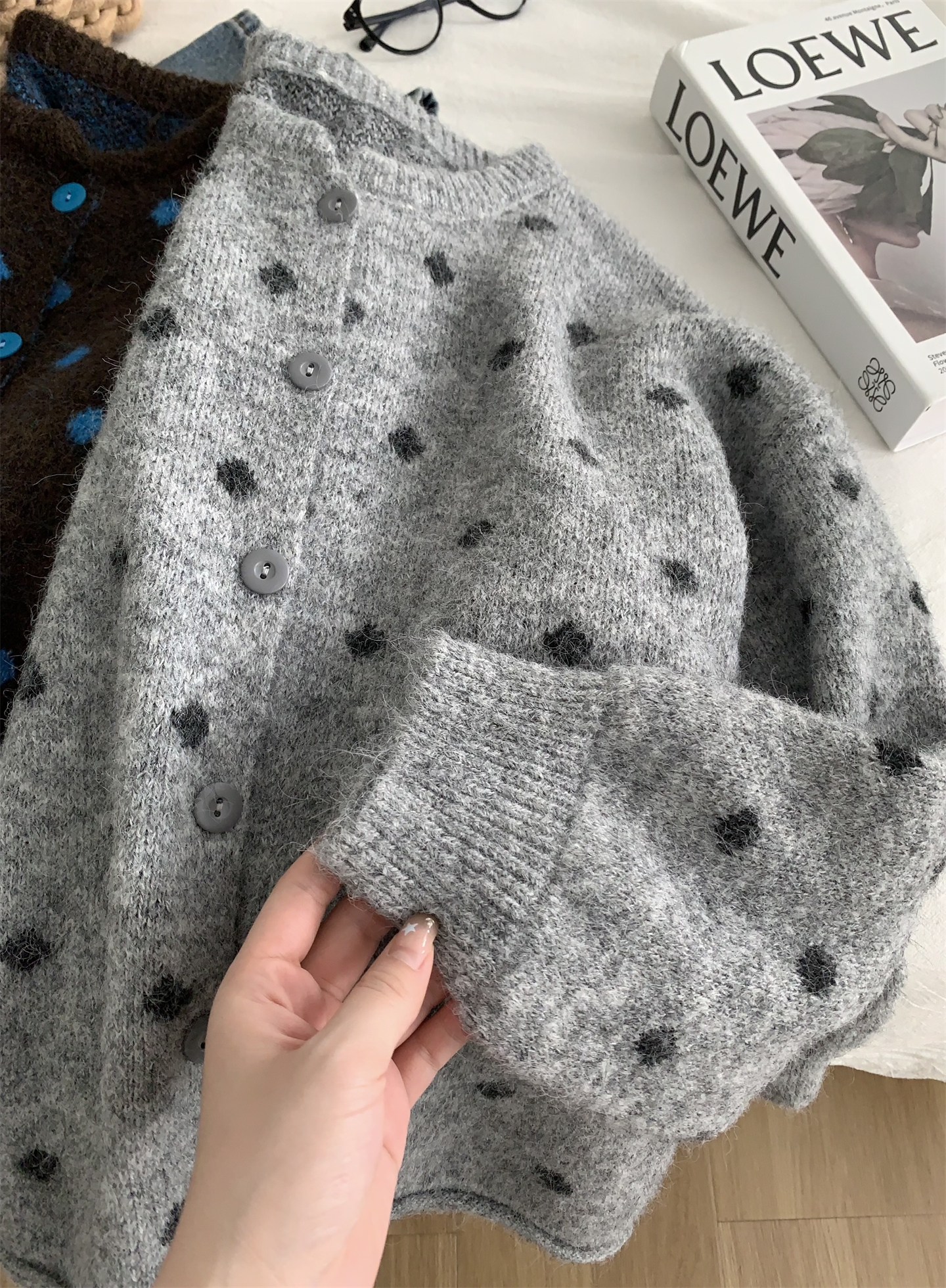 慵懶復古撞色波點圓領羊毛針織開衫女25秋冬保暖帶圍巾拉毛衣外套