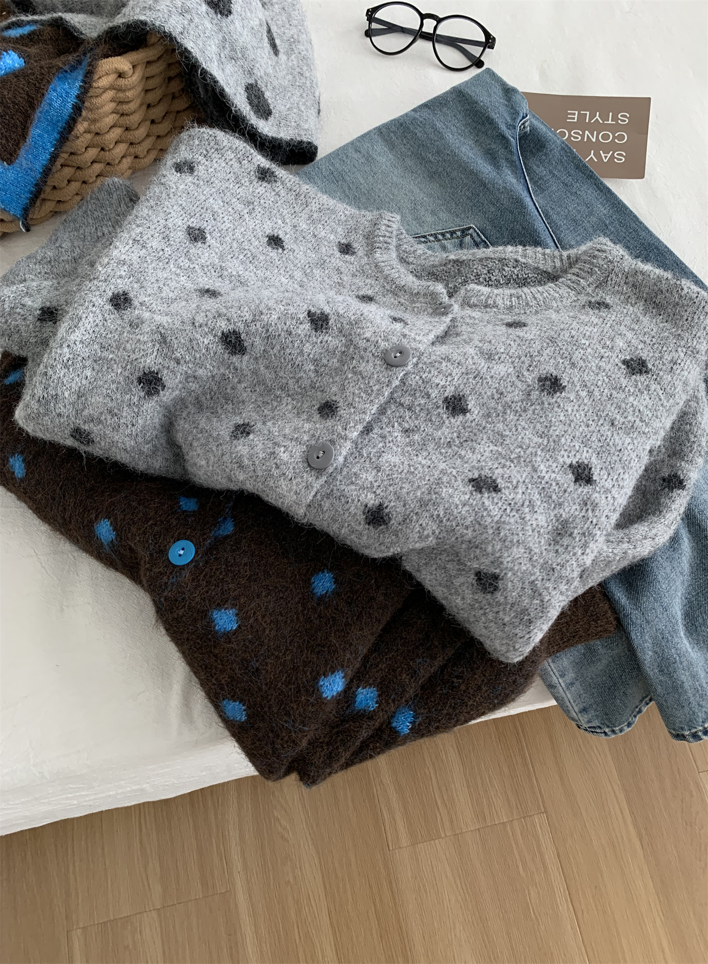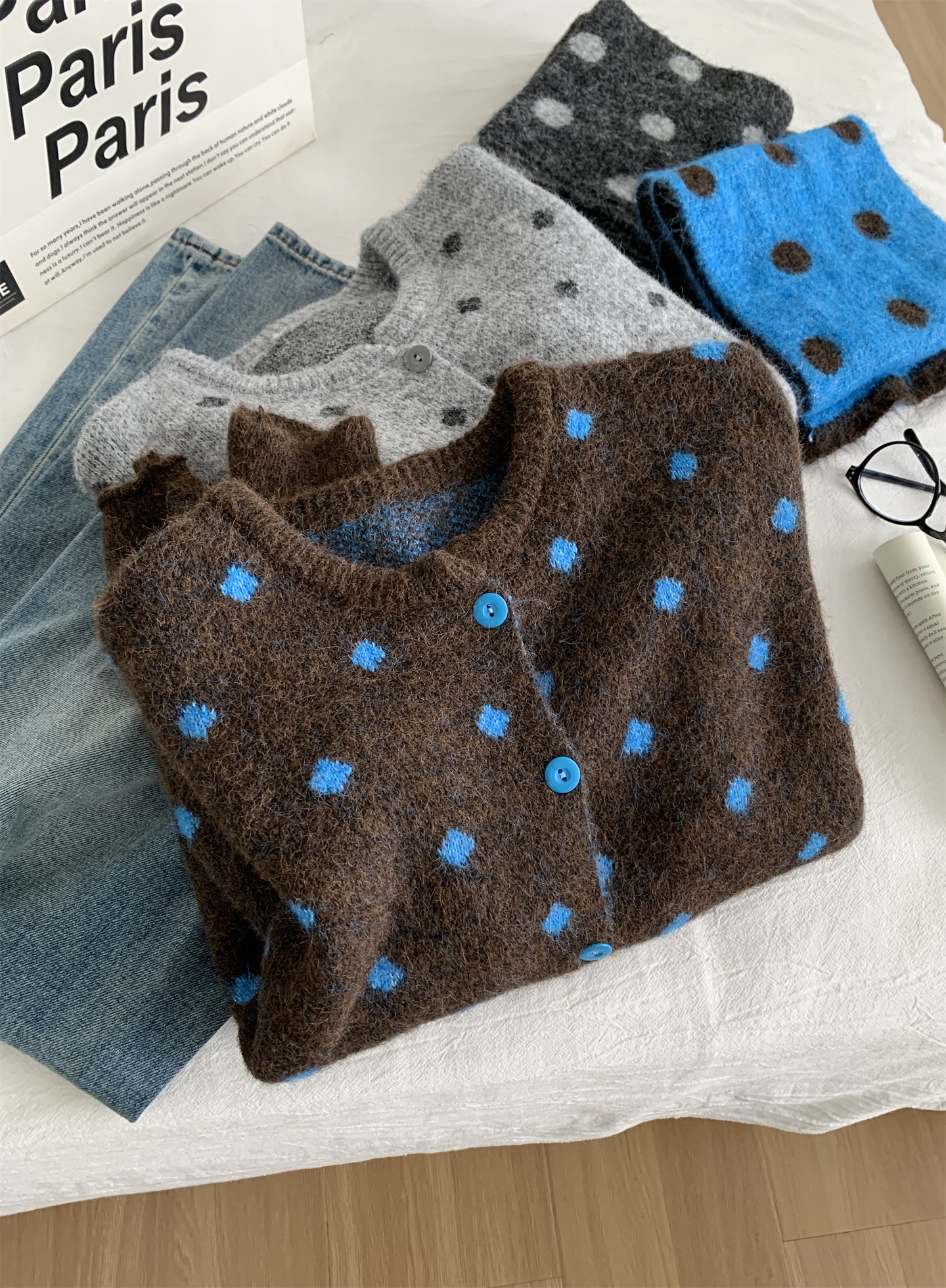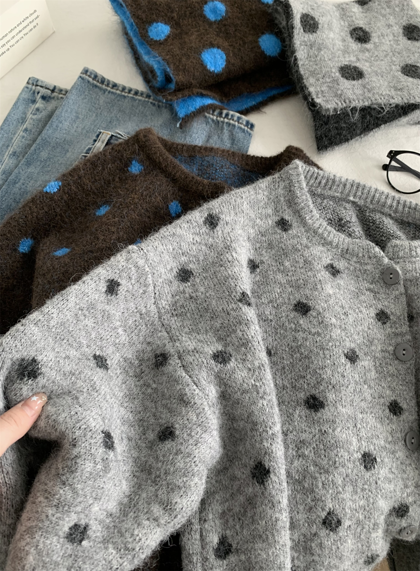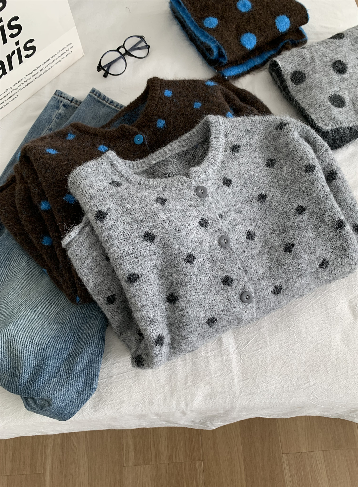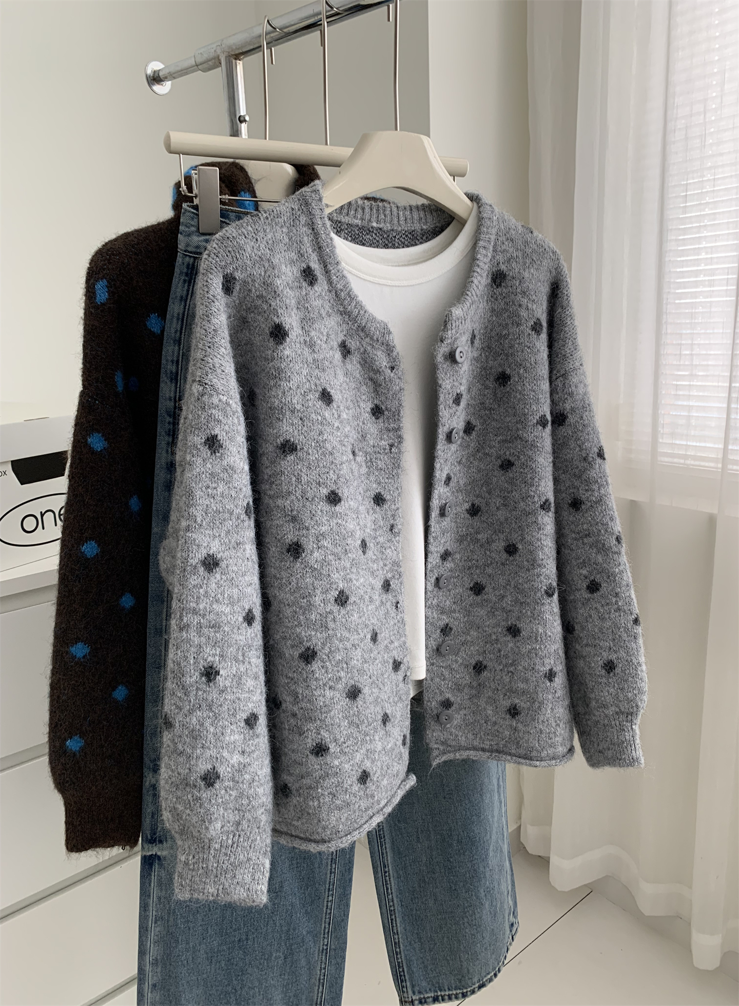 慵懶復古撞色波點圓領羊毛針織開衫女25秋冬保暖帶圍巾拉毛衣外套