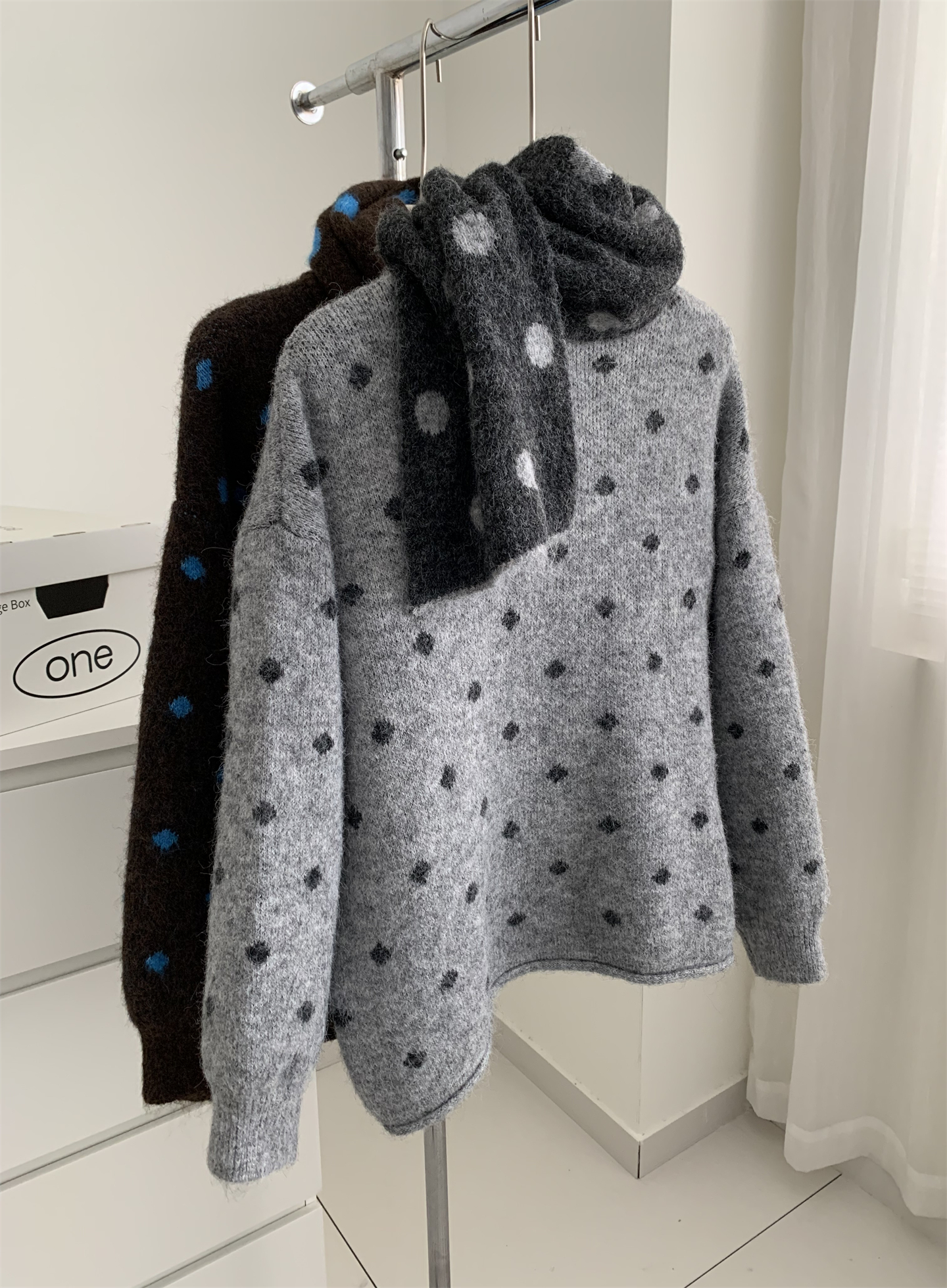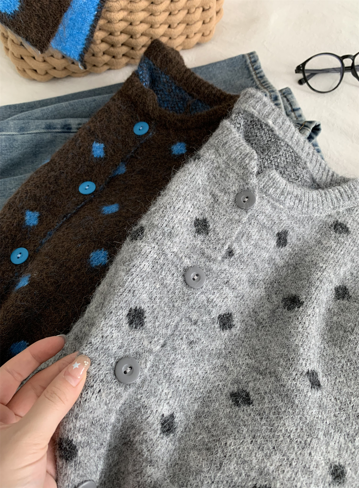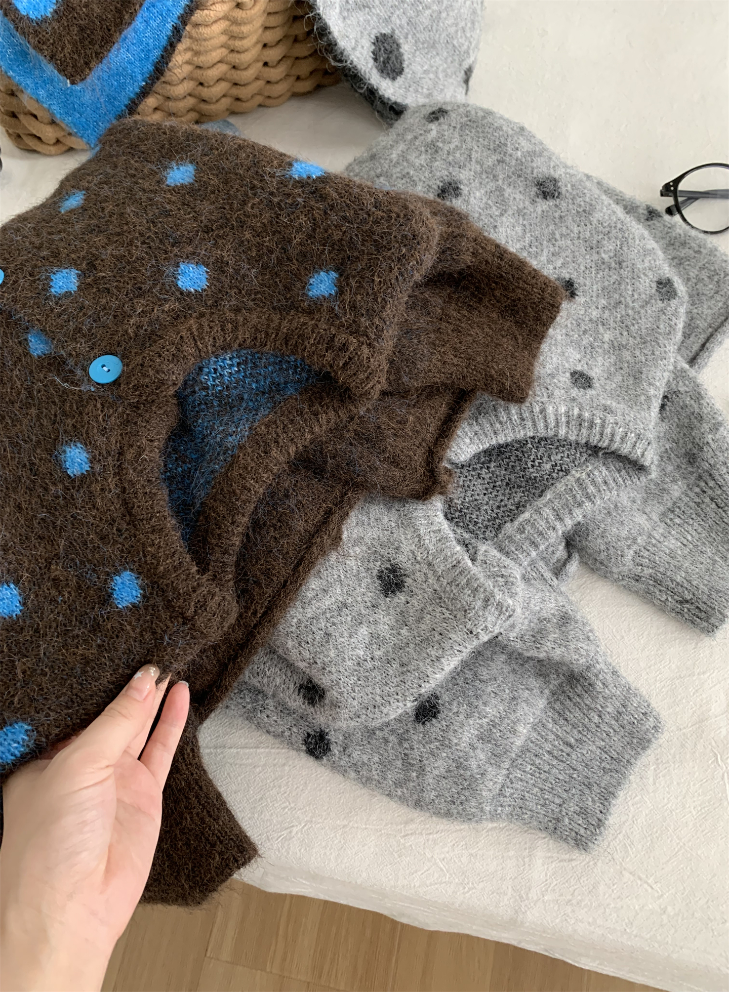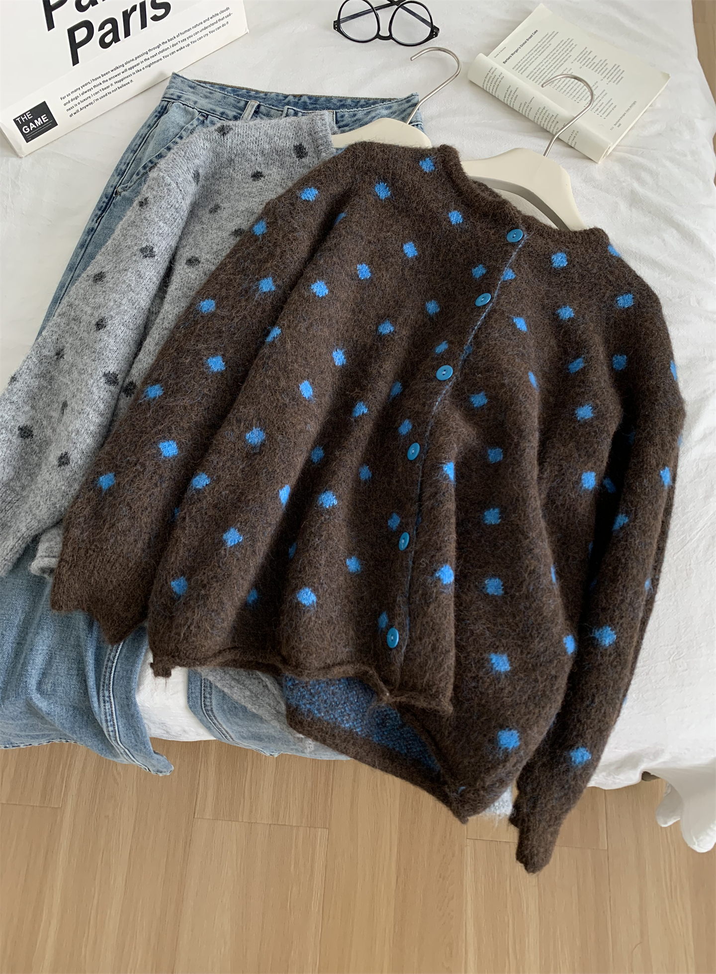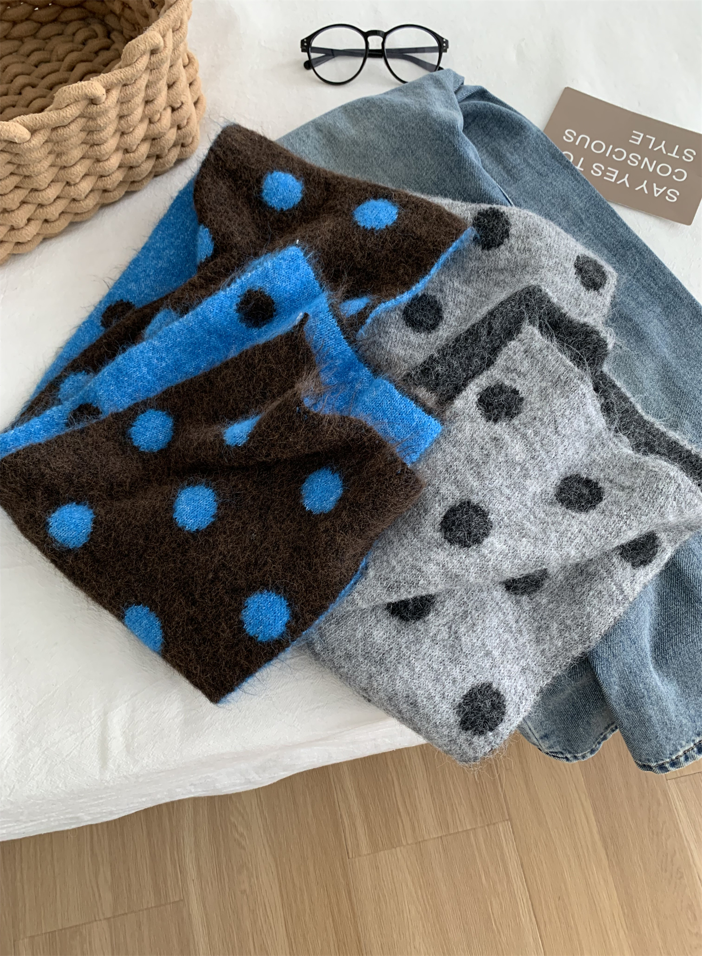 慵懶復古撞色波點圓領羊毛針織開衫女25秋冬保暖帶圍巾拉毛衣外套