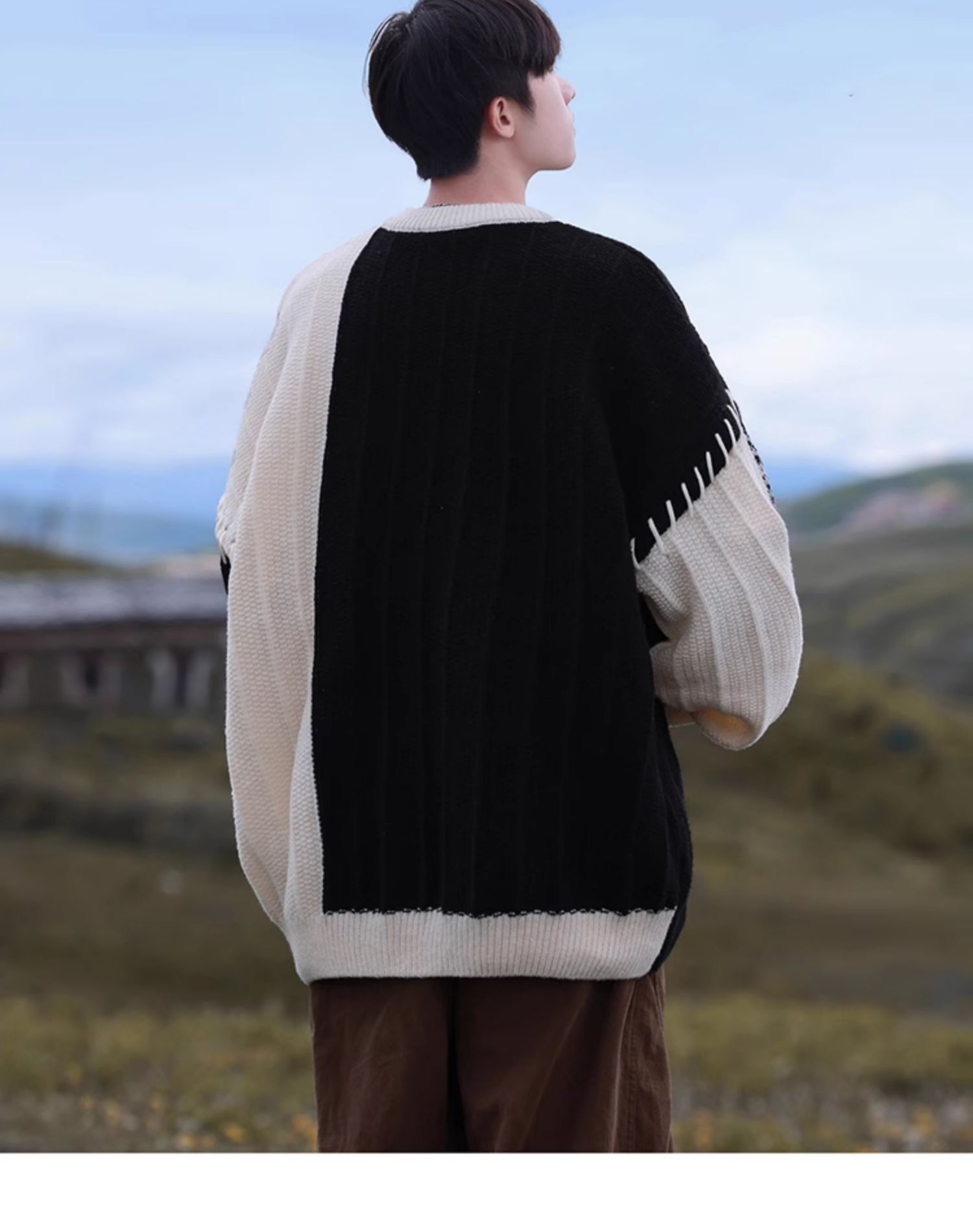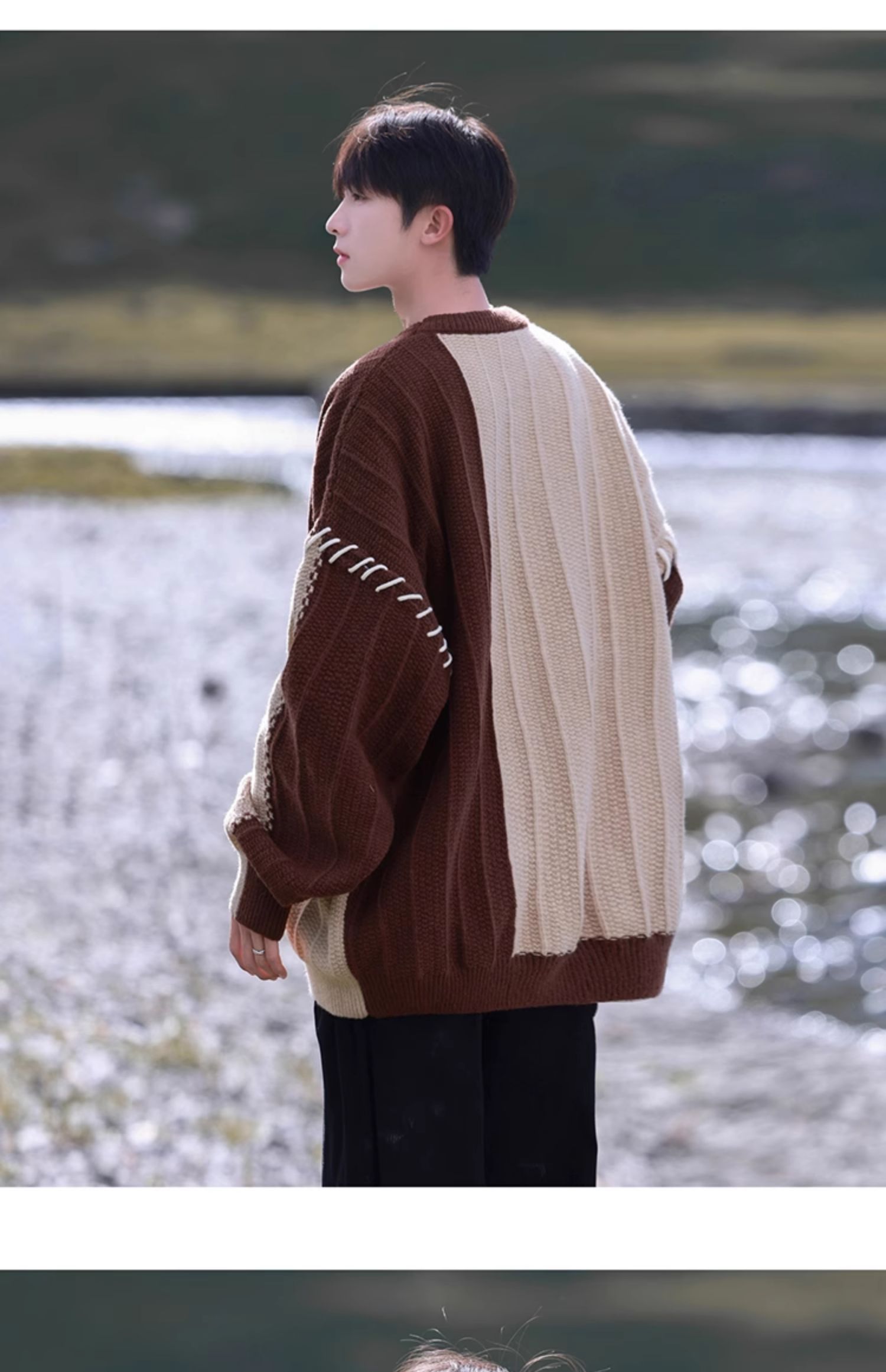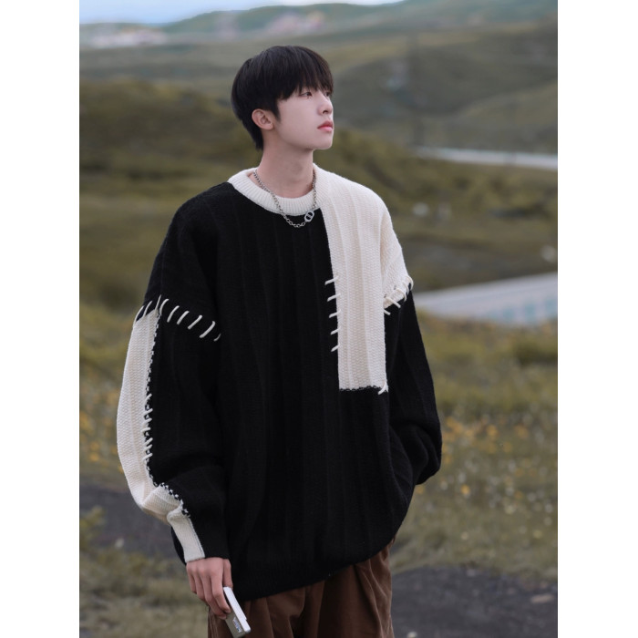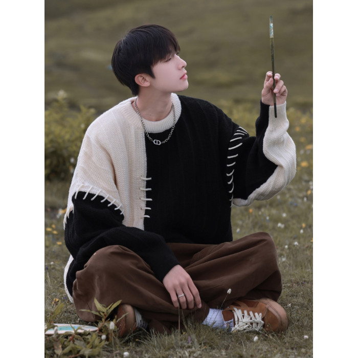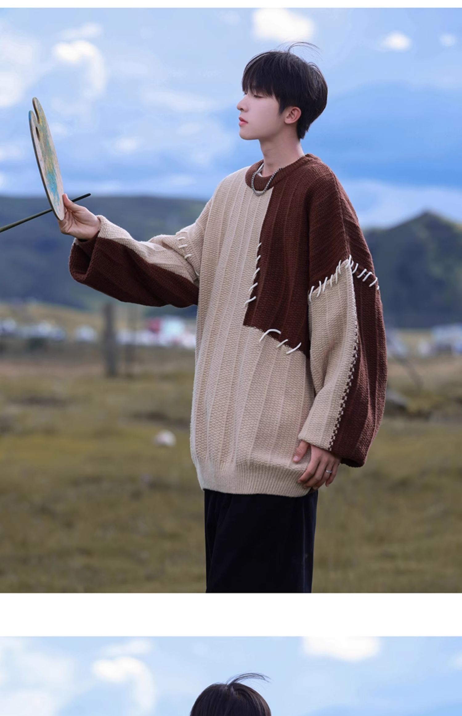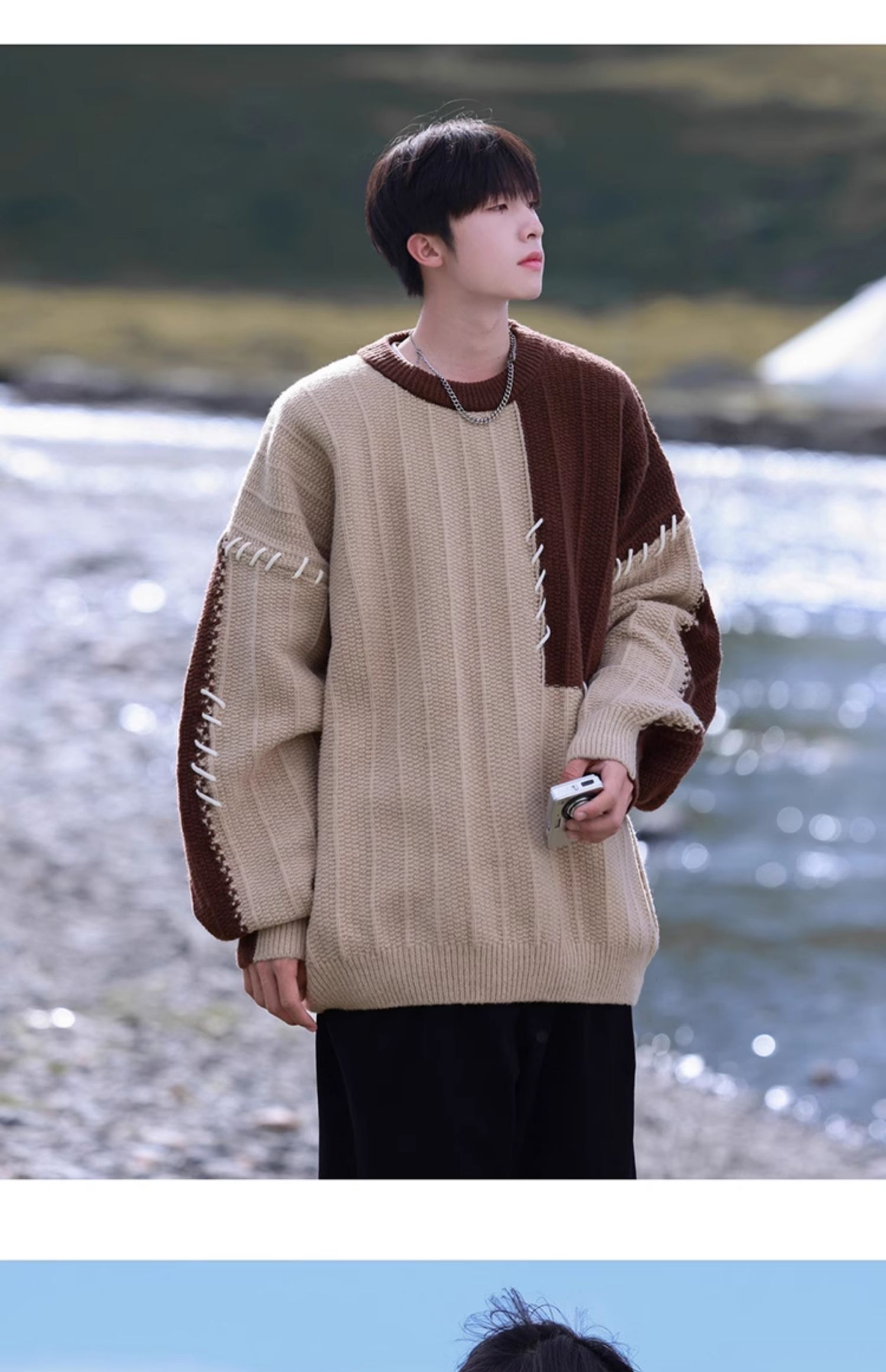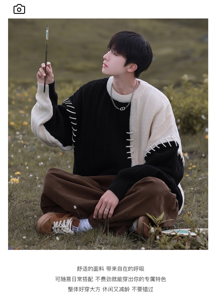 拼接撞色毛衣男生秋冬季潮牌寬松休閒慵懶風設計感小衆套頭針織衫